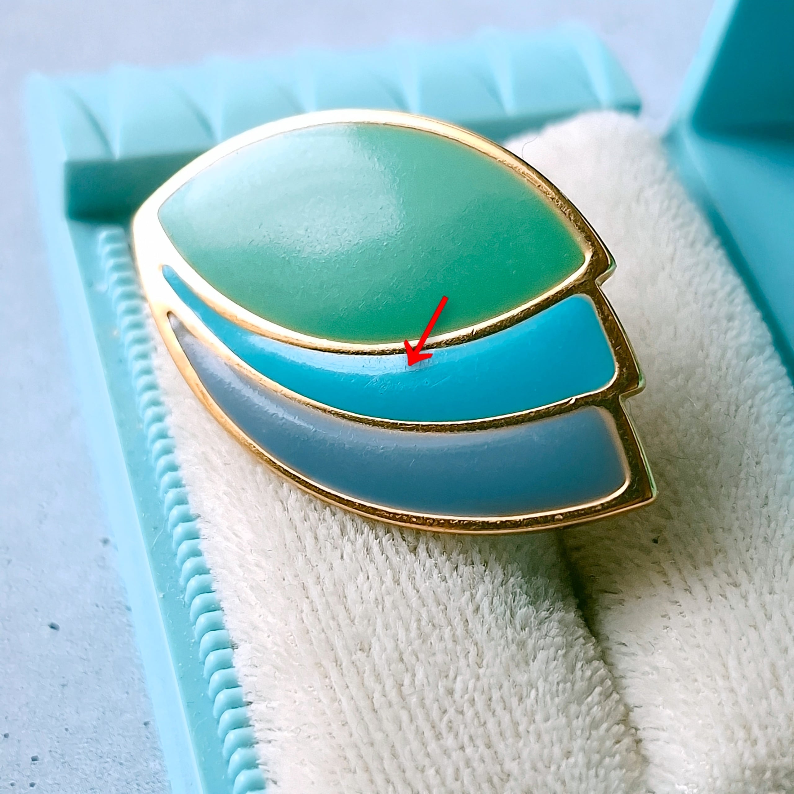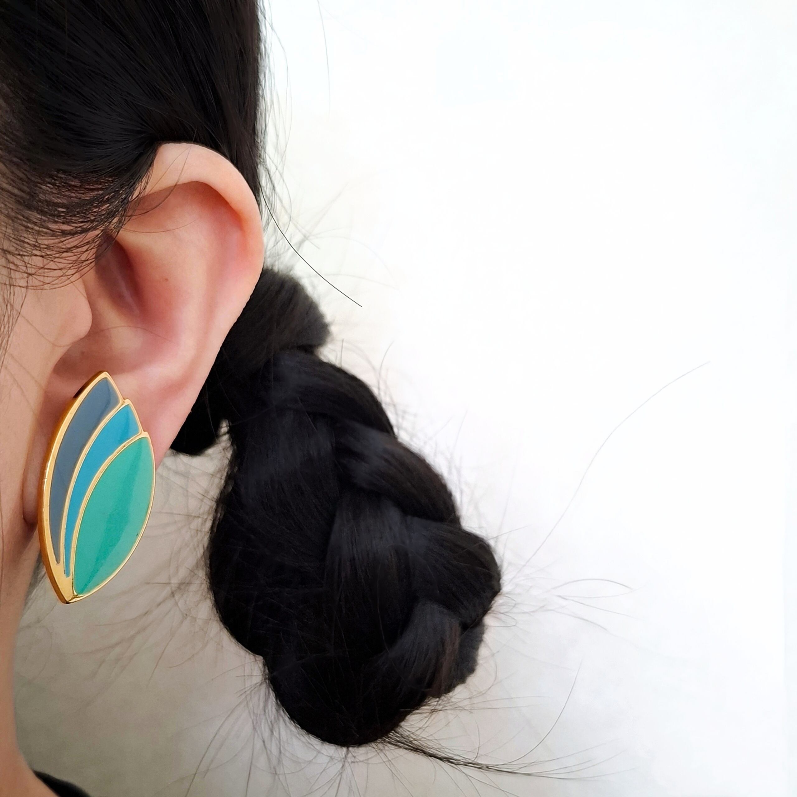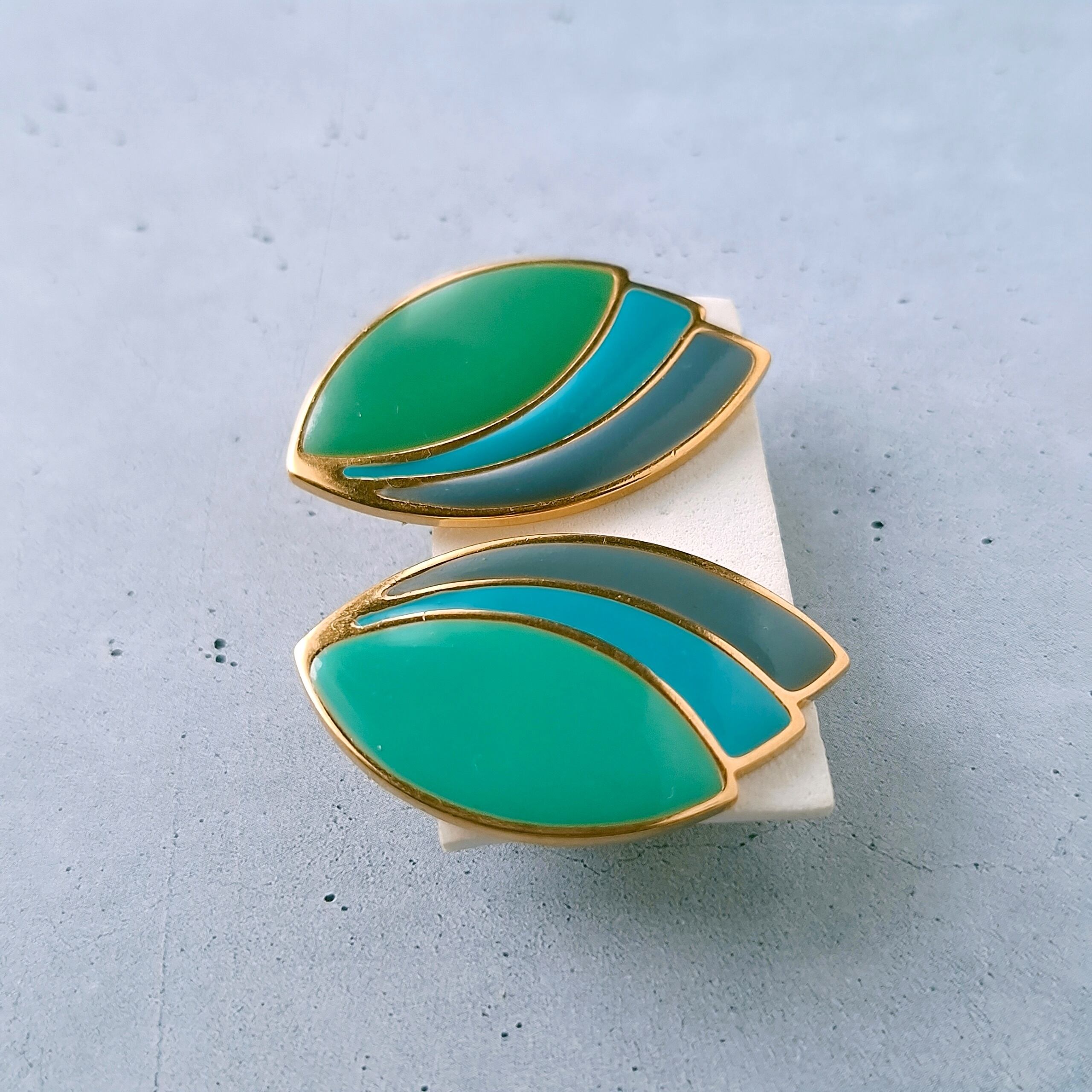 1886年アメリカのニューヨークにて小さな香水会社を創業、1971年に本格的にコスチュームジュエリーの製作を開始したAvon(エイボン)の1987年に販売された“paradise colors”のグリーン、ライトブルー、ダークブルーのエナメルで色付けされた3枚の蝶の羽根が重なったデザインのヴィンテージイヤリングです。