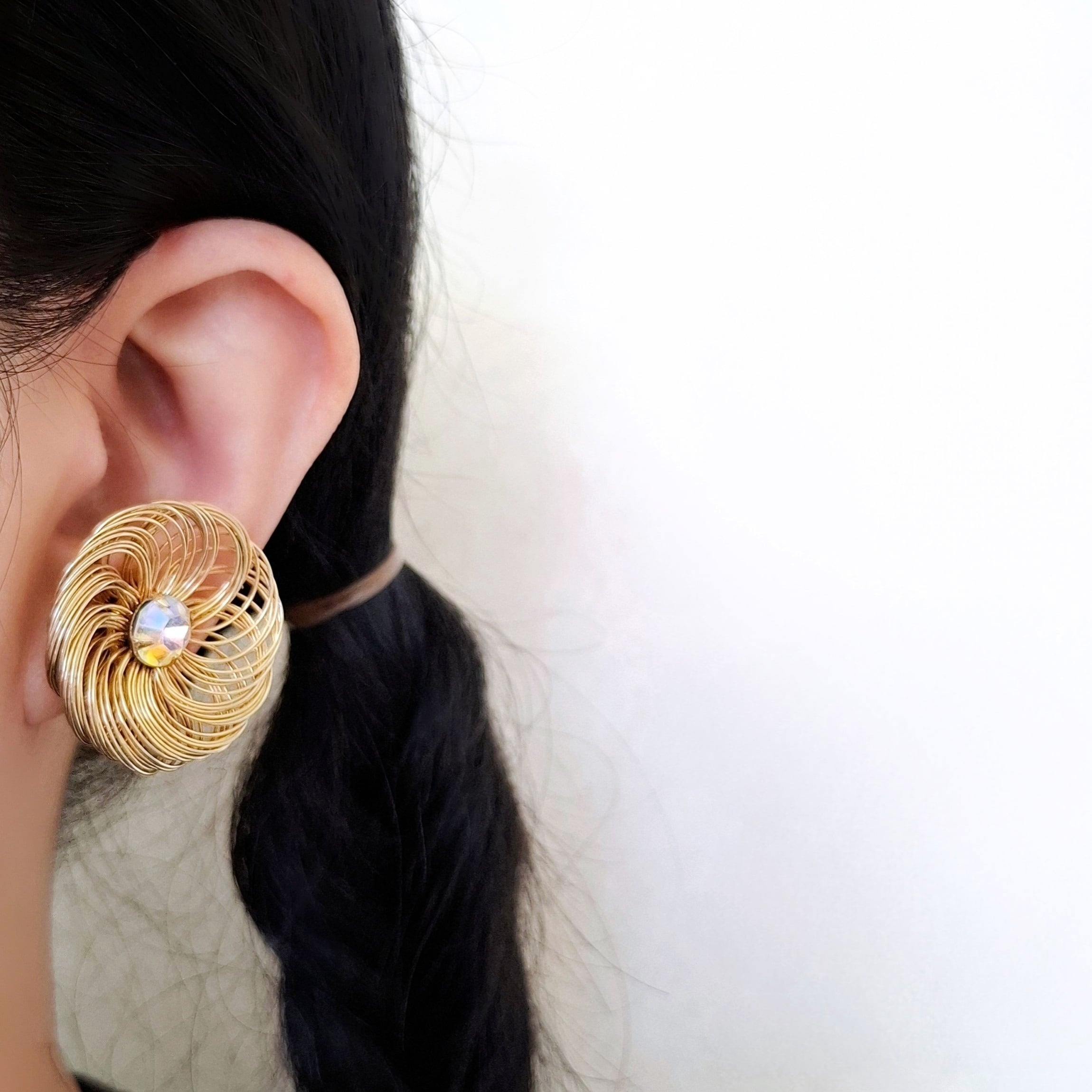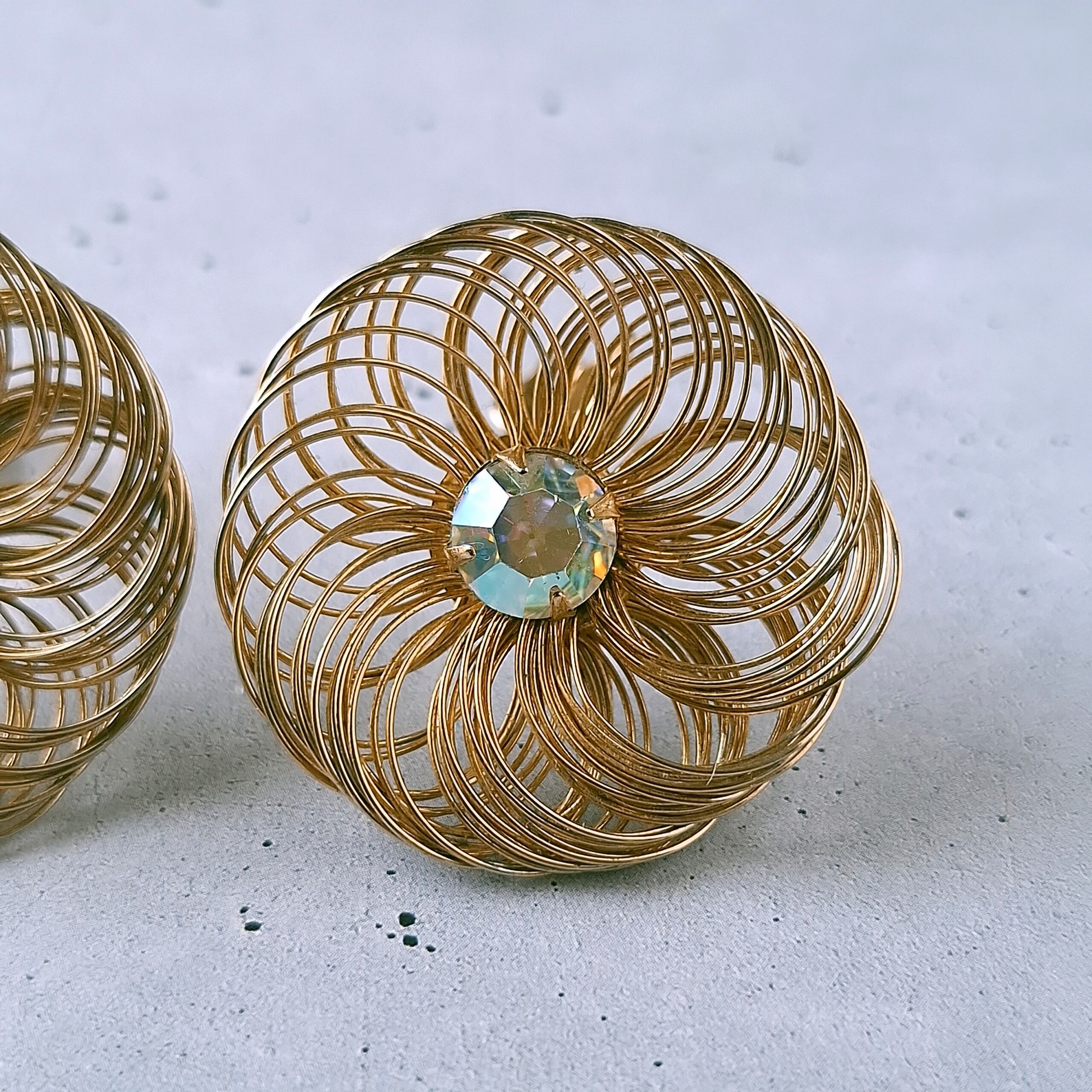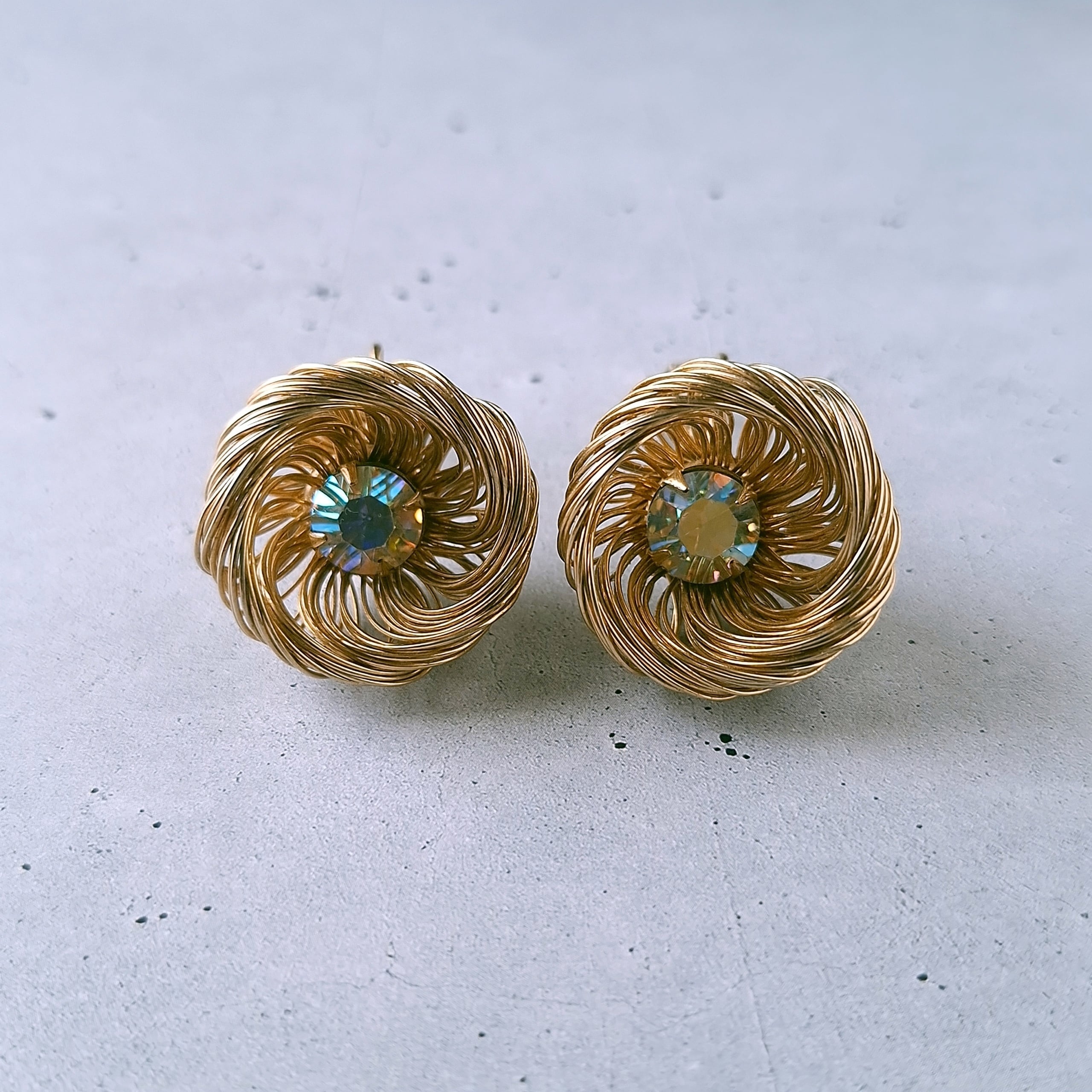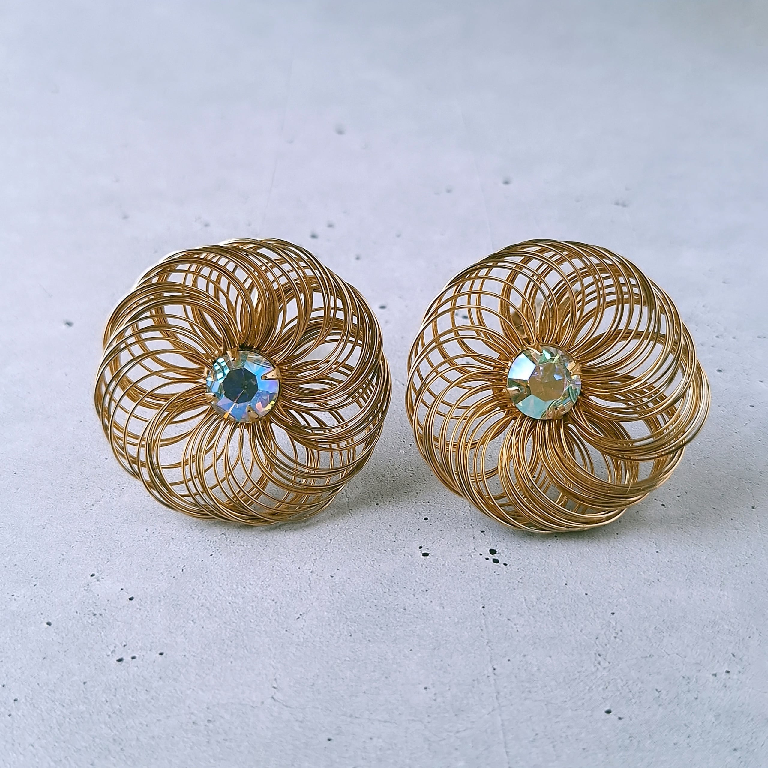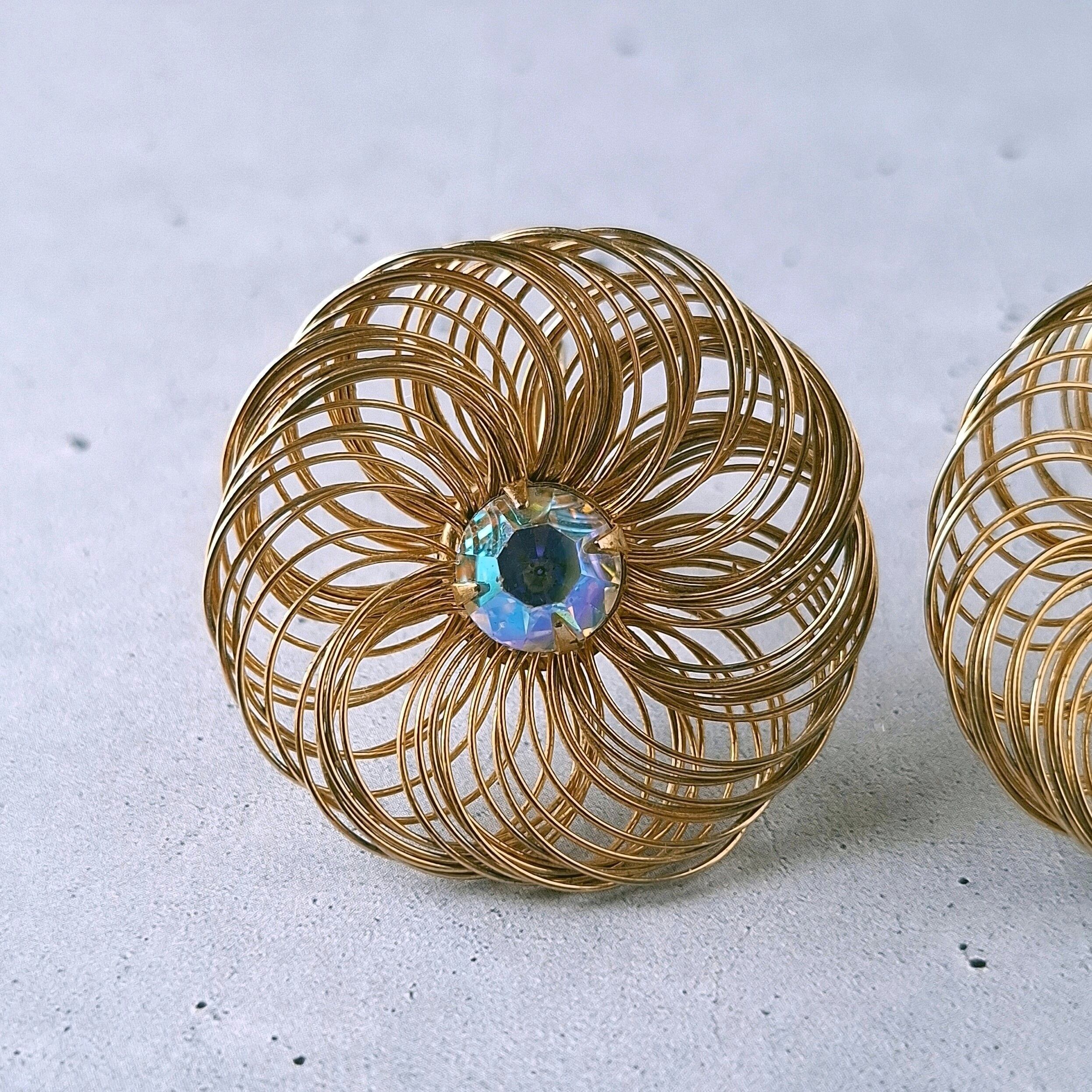 1949年にニューヨークで創業したSarah Coventry(サラコベントリー)の1960年に販売された”Bud 'n Bloom“のワイヤーの花びらを拡縮して大きさを変えられる中央にオーロララインストーンがあしらわれたフラワーのヴィンテージイヤリングです。