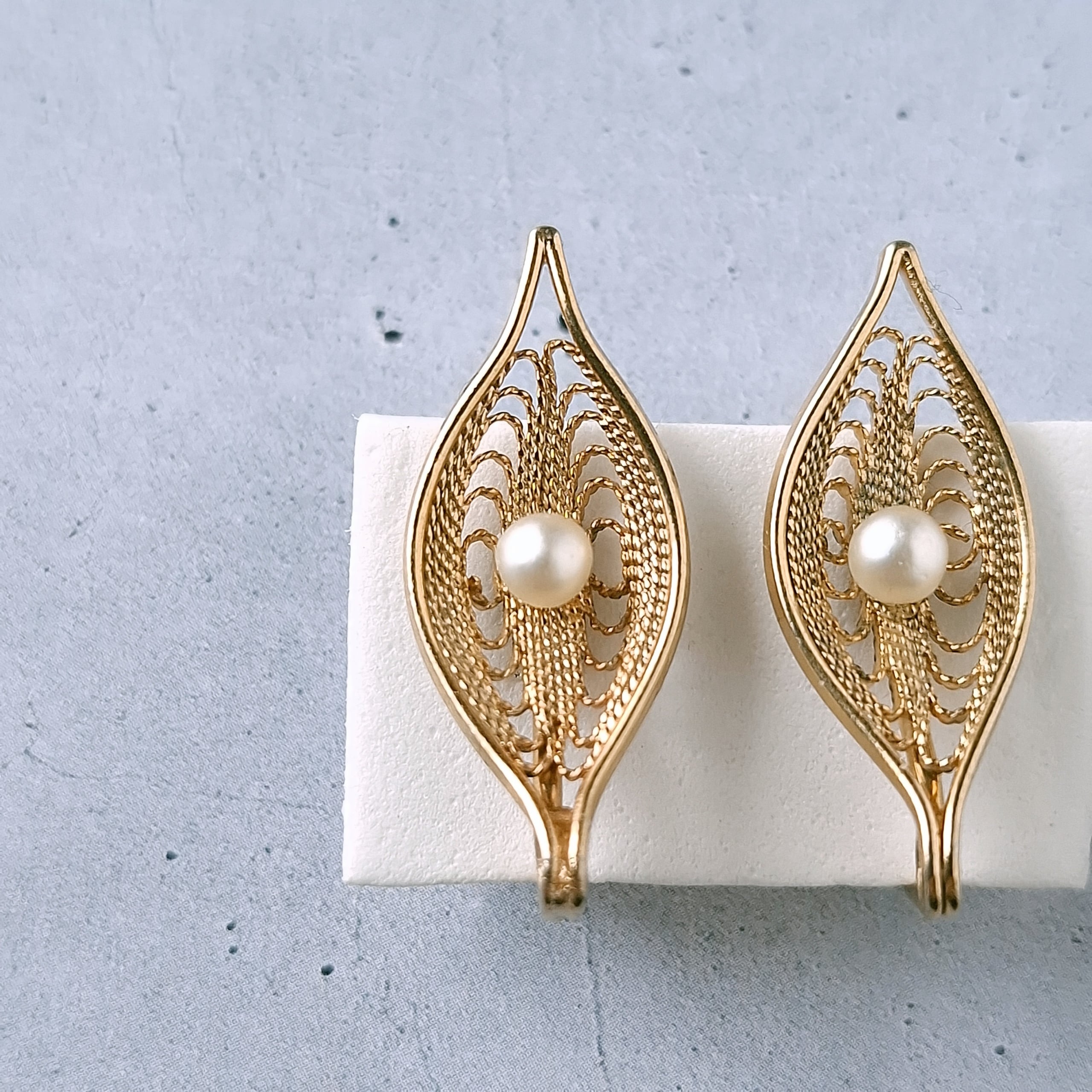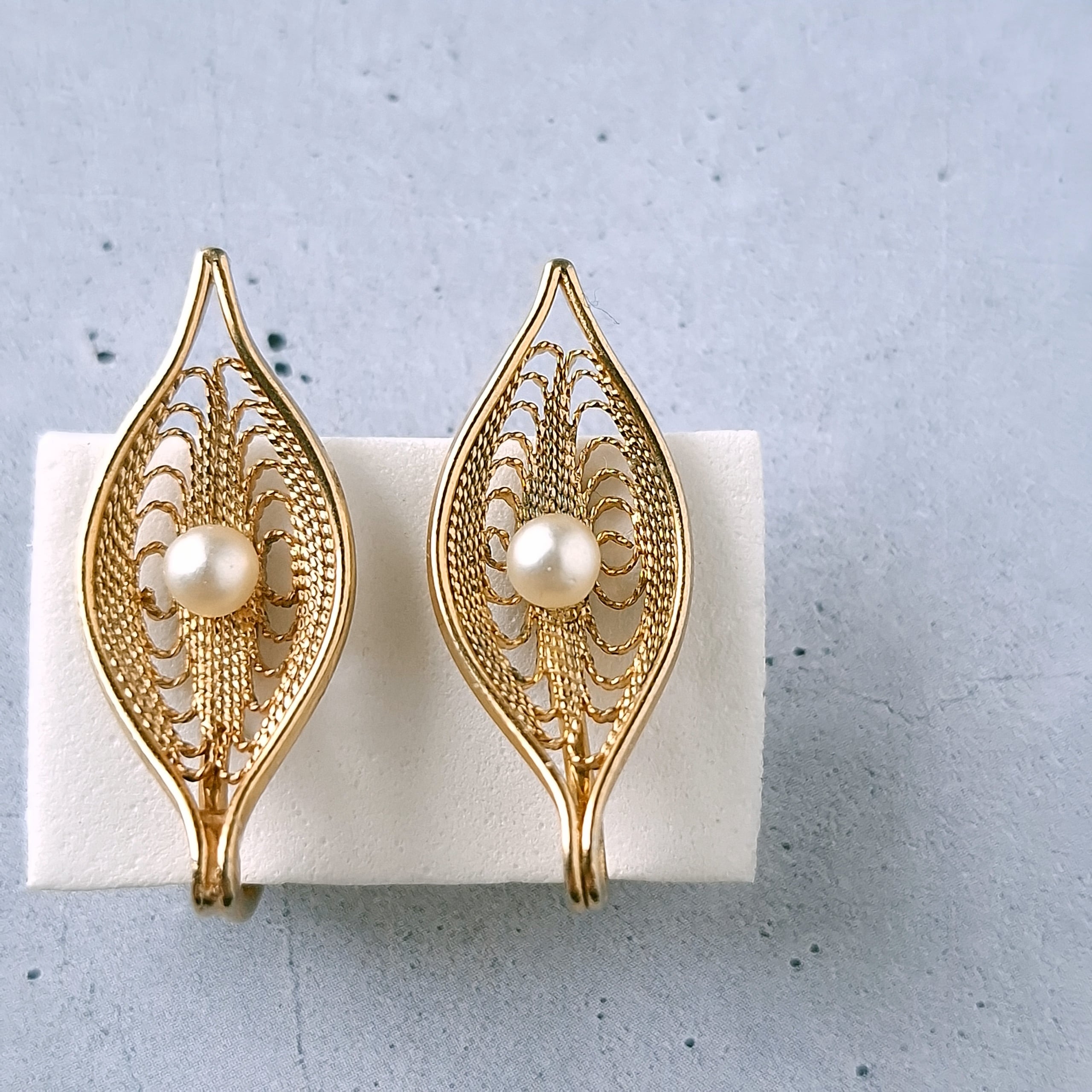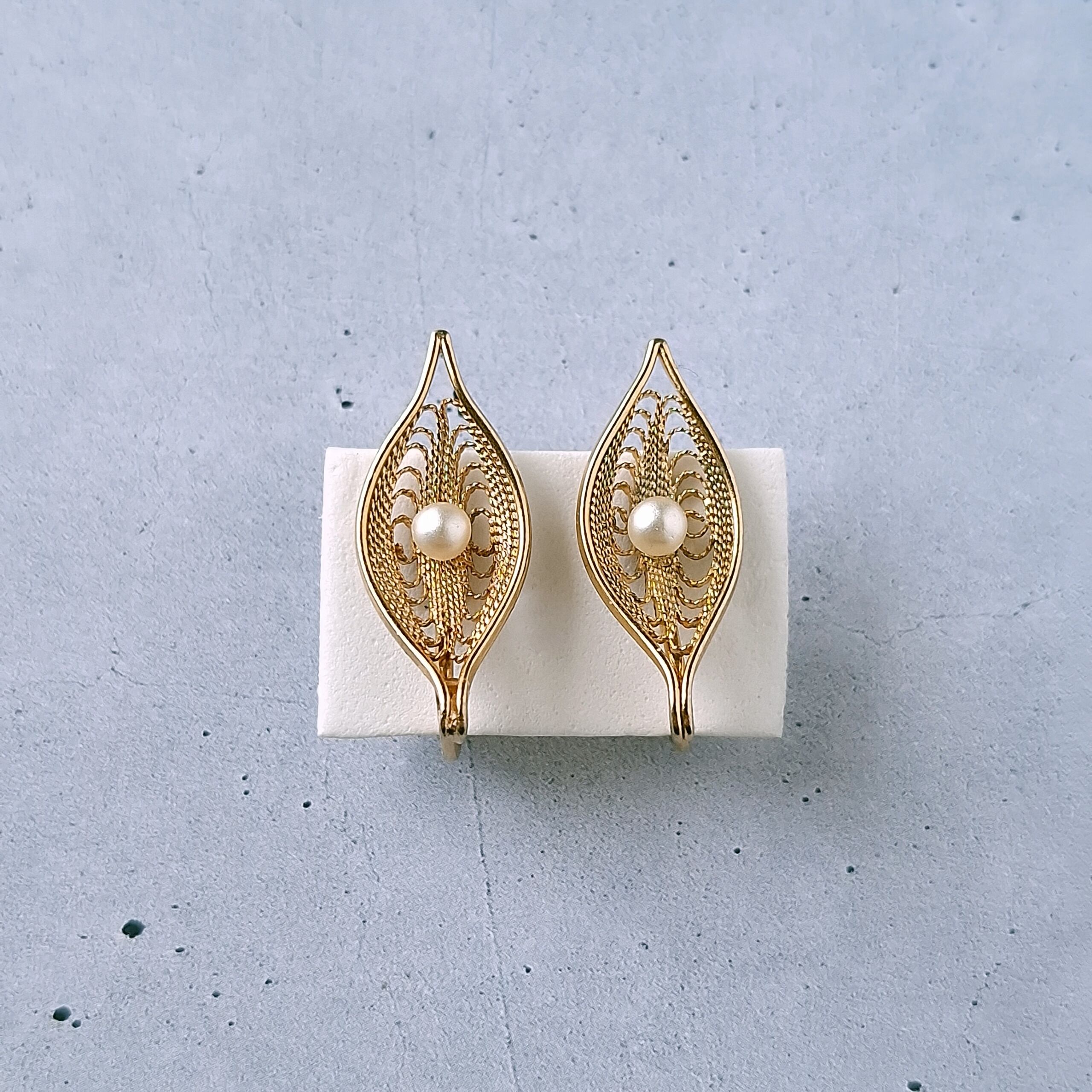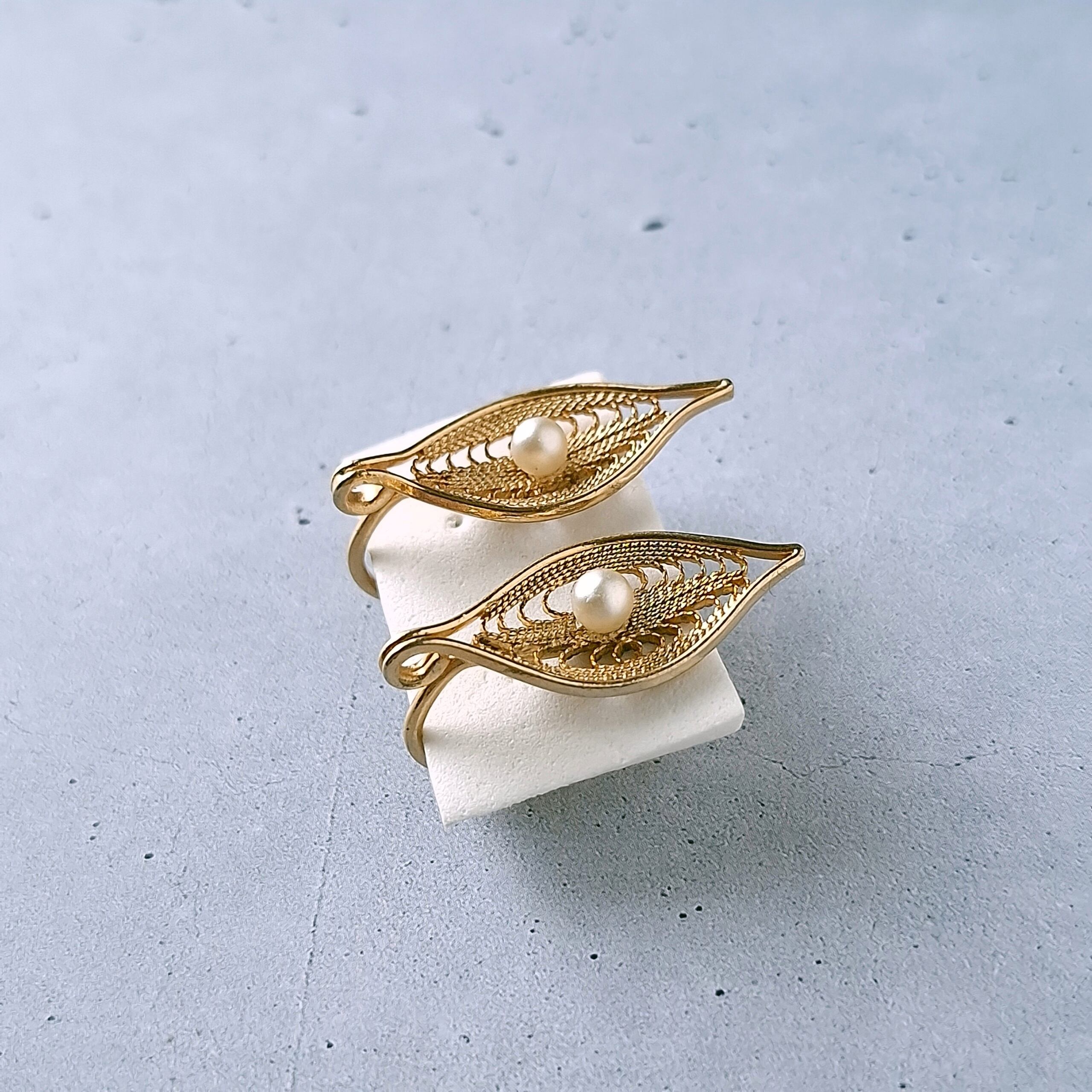 1949年にニューヨークで創業したSarah Coventry(サラコベントリー)の1966年に販売された”Serene“の中央にフェイクパールが1粒あしらわれたフィリグリーリーフのヴィンテージイヤリングです。