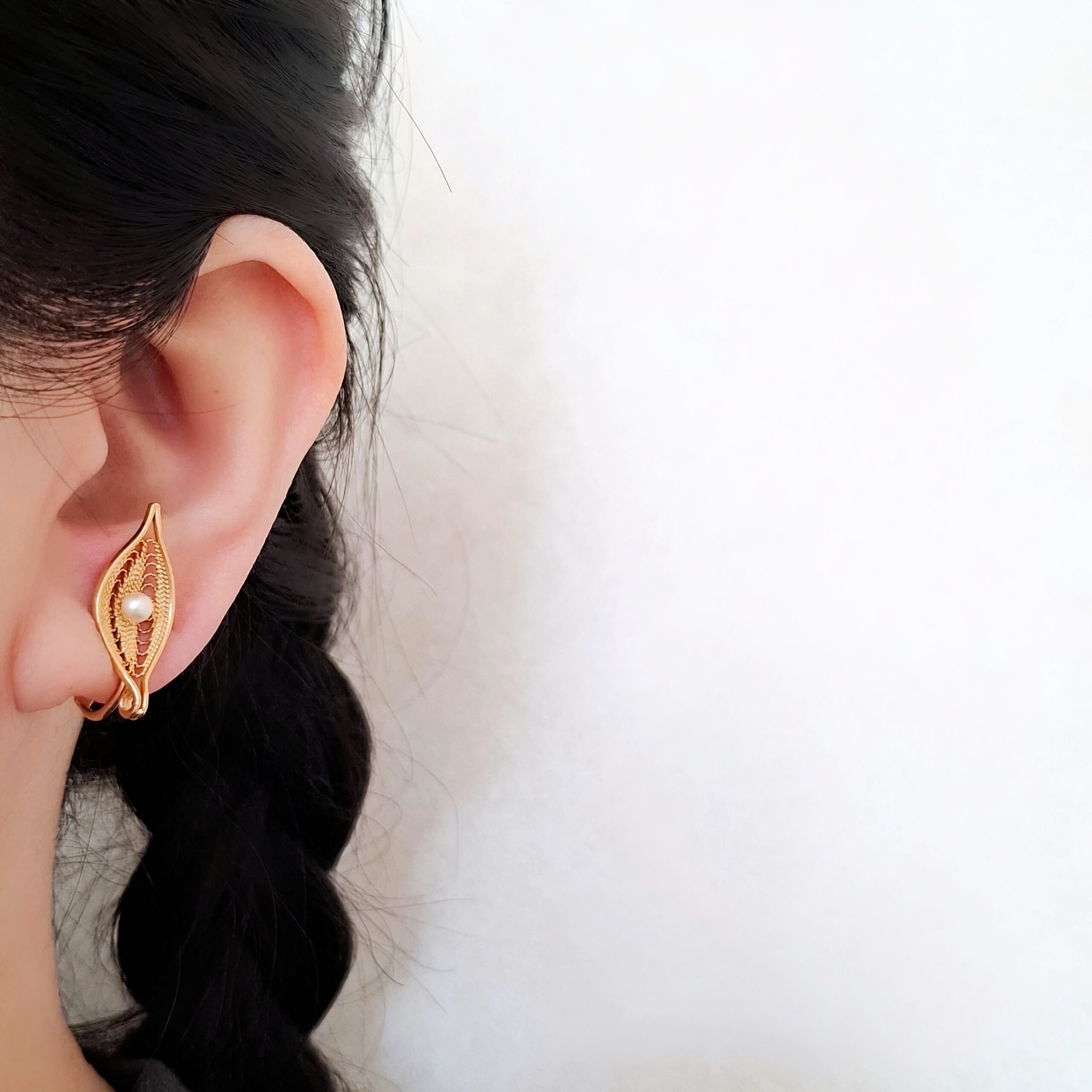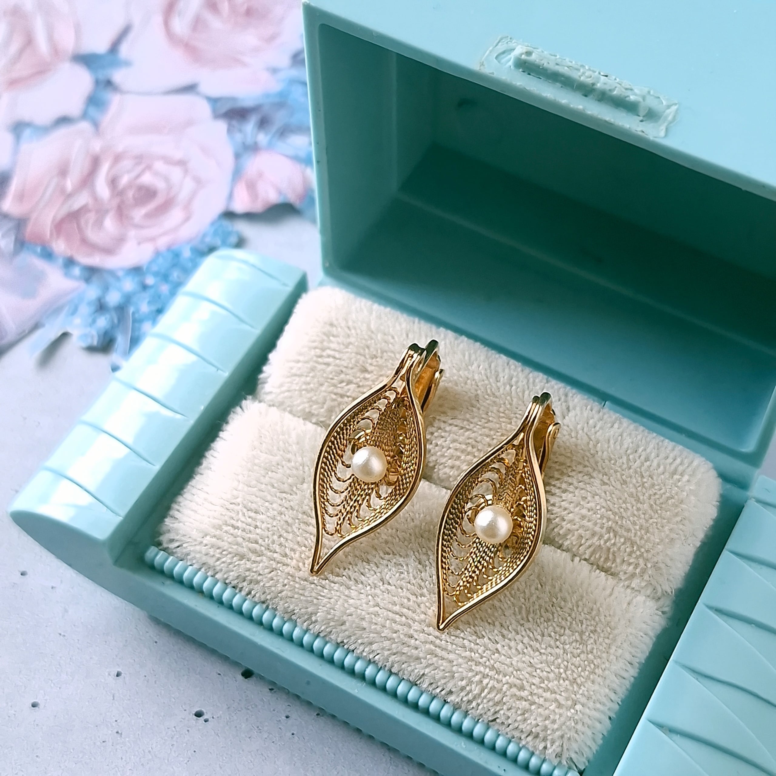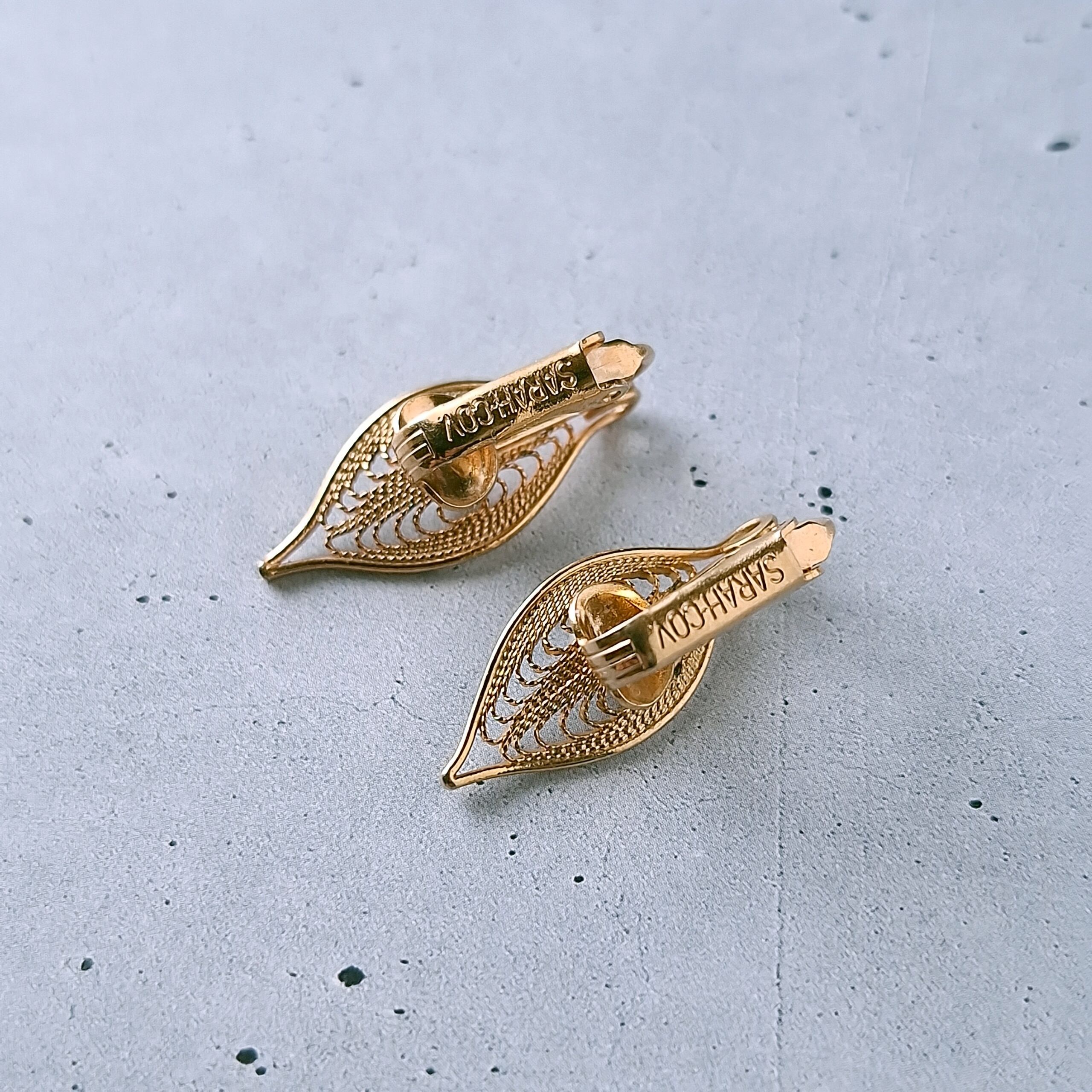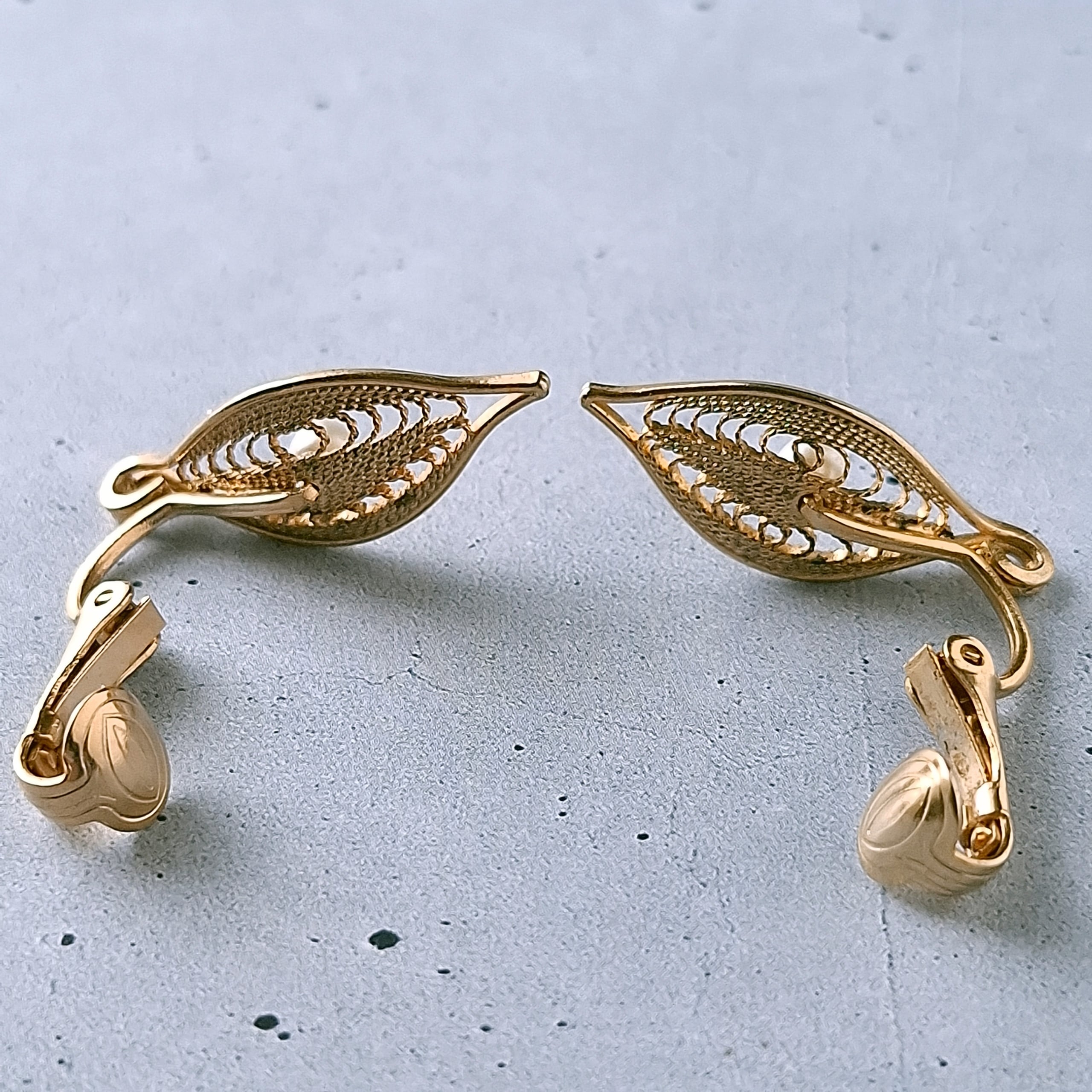 1949年にニューヨークで創業したSarah Coventry(サラコベントリー)の1966年に販売された”Serene“の中央にフェイクパールが1粒あしらわれたフィリグリーリーフのヴィンテージイヤリングです。