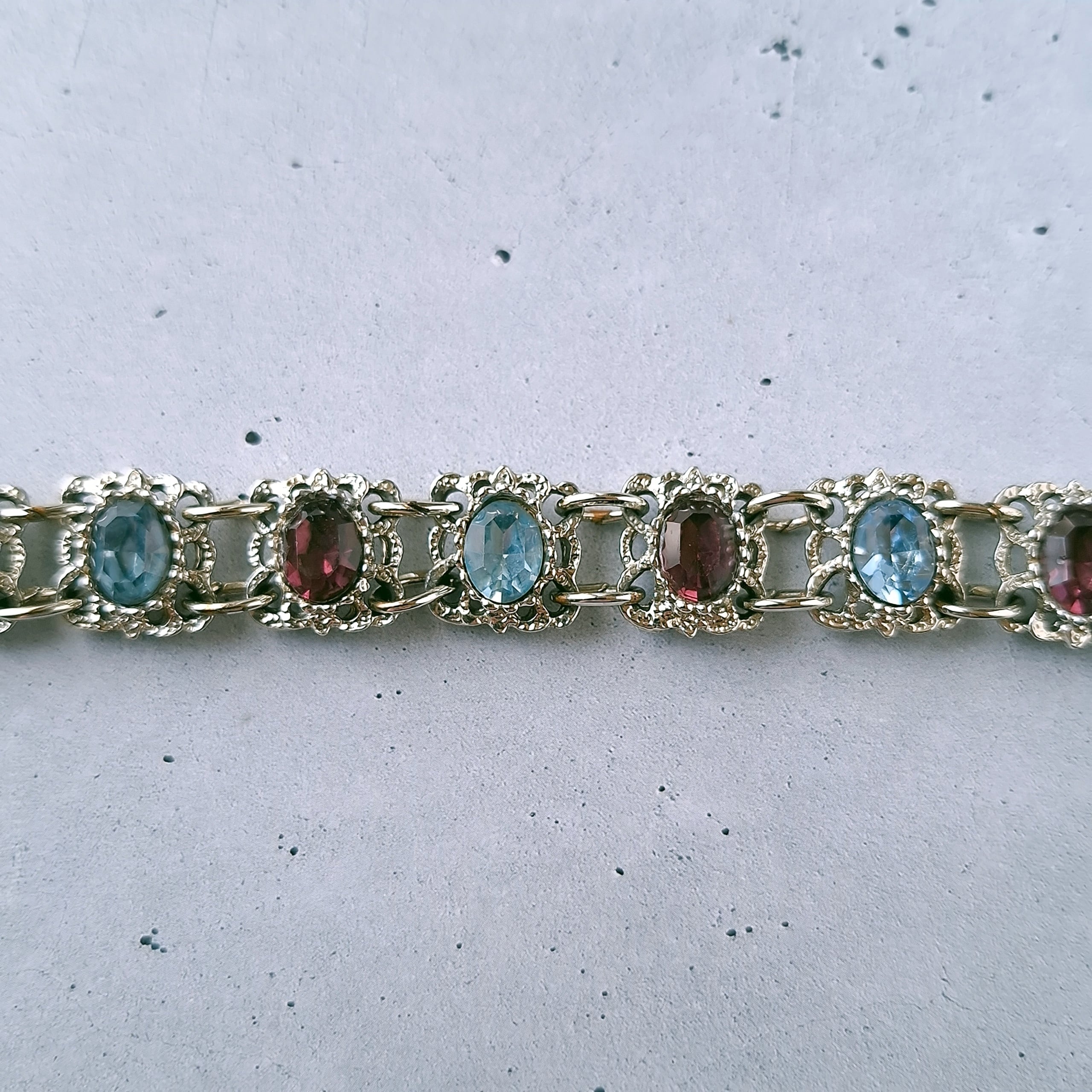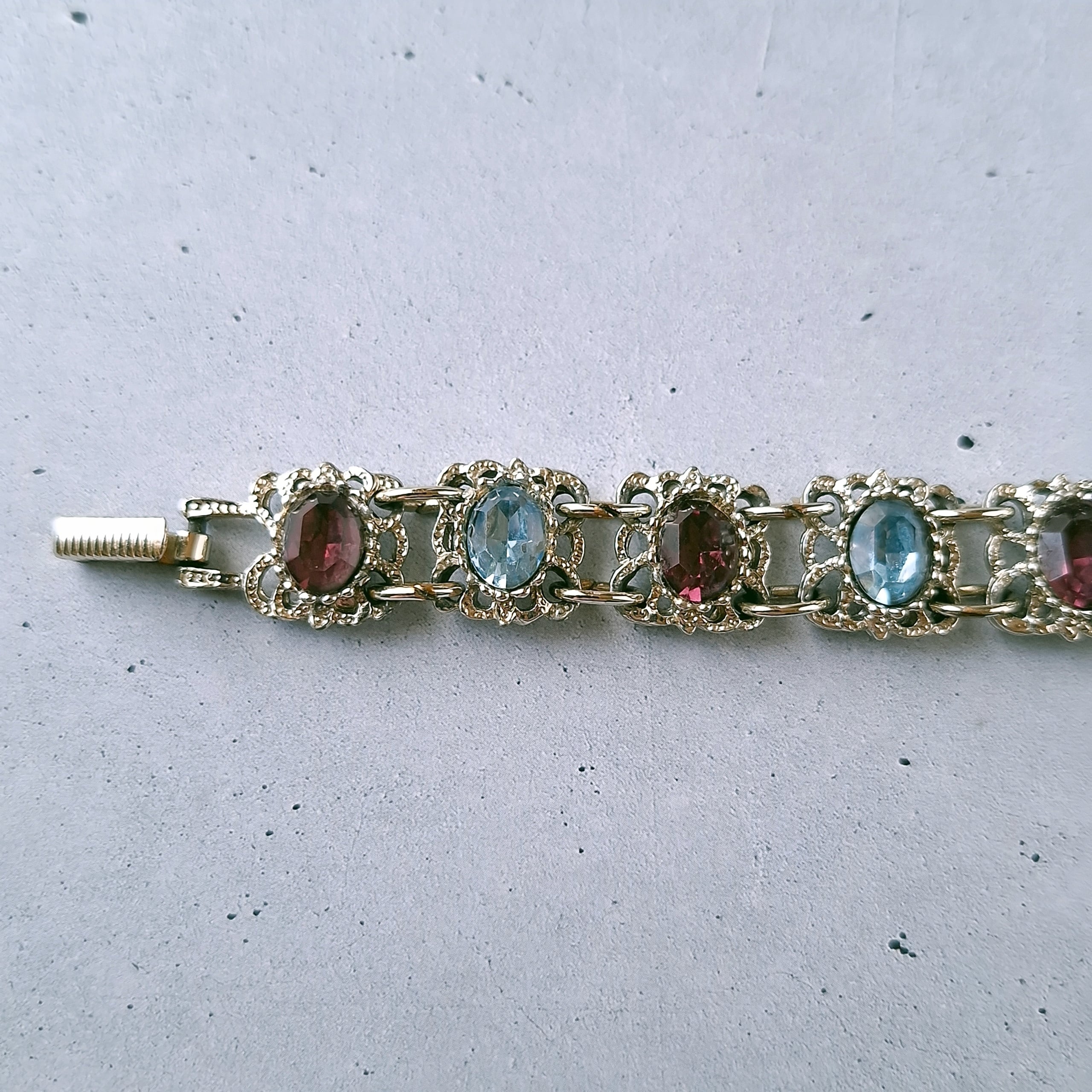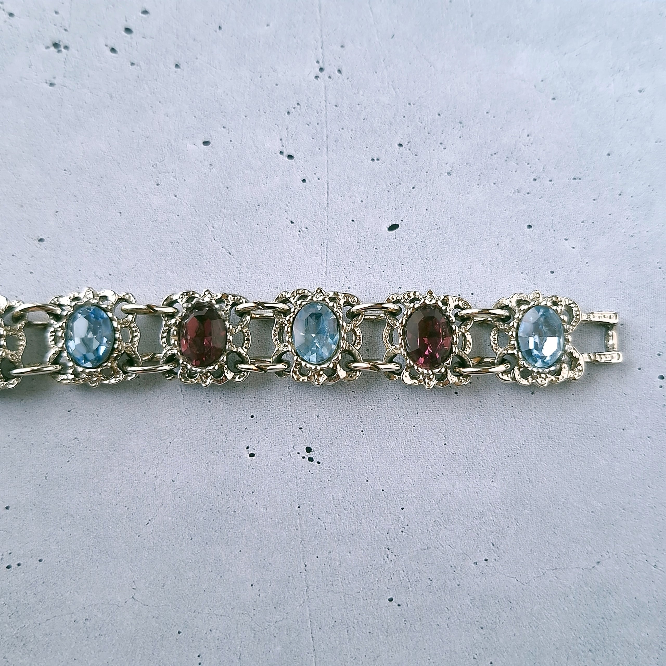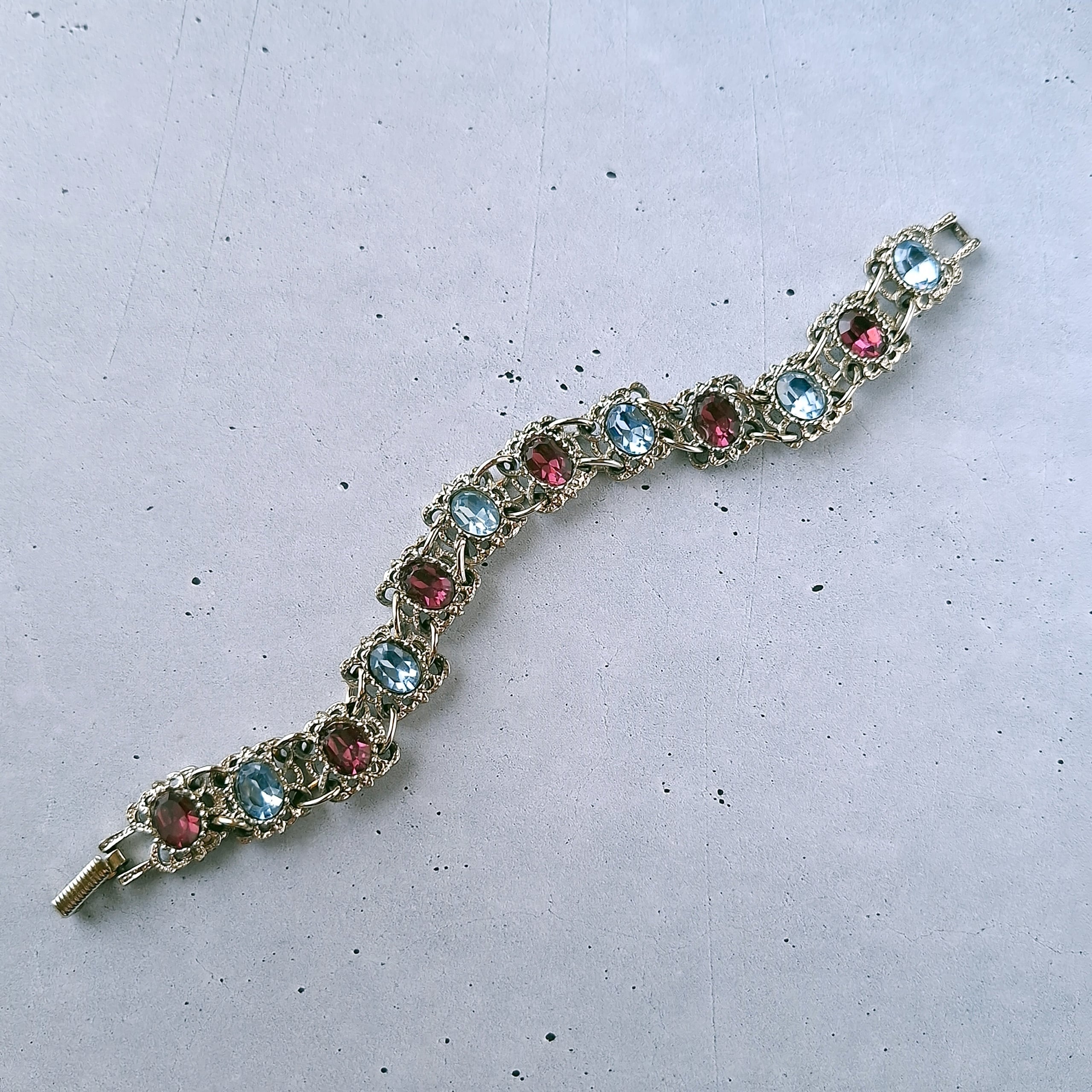 オープンワークのスクエア型のメタルにライトブルーとパープルのオーバルラインストーンが交互にあしらわれたヴィンテージブレスレットです。