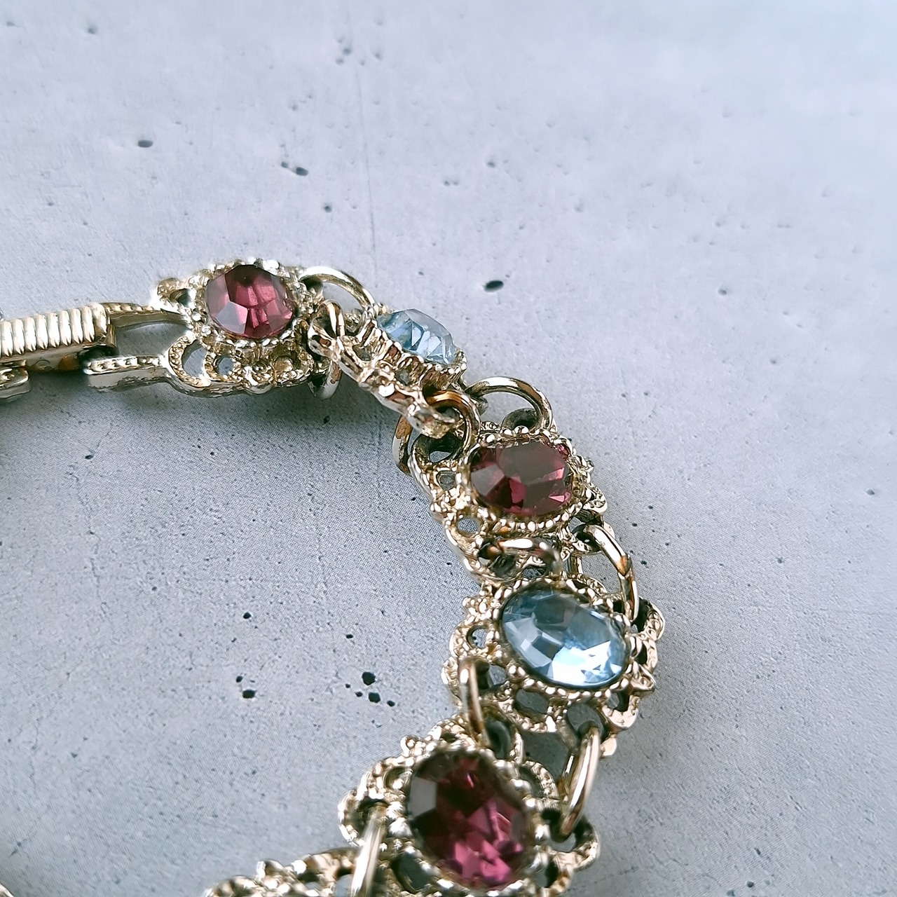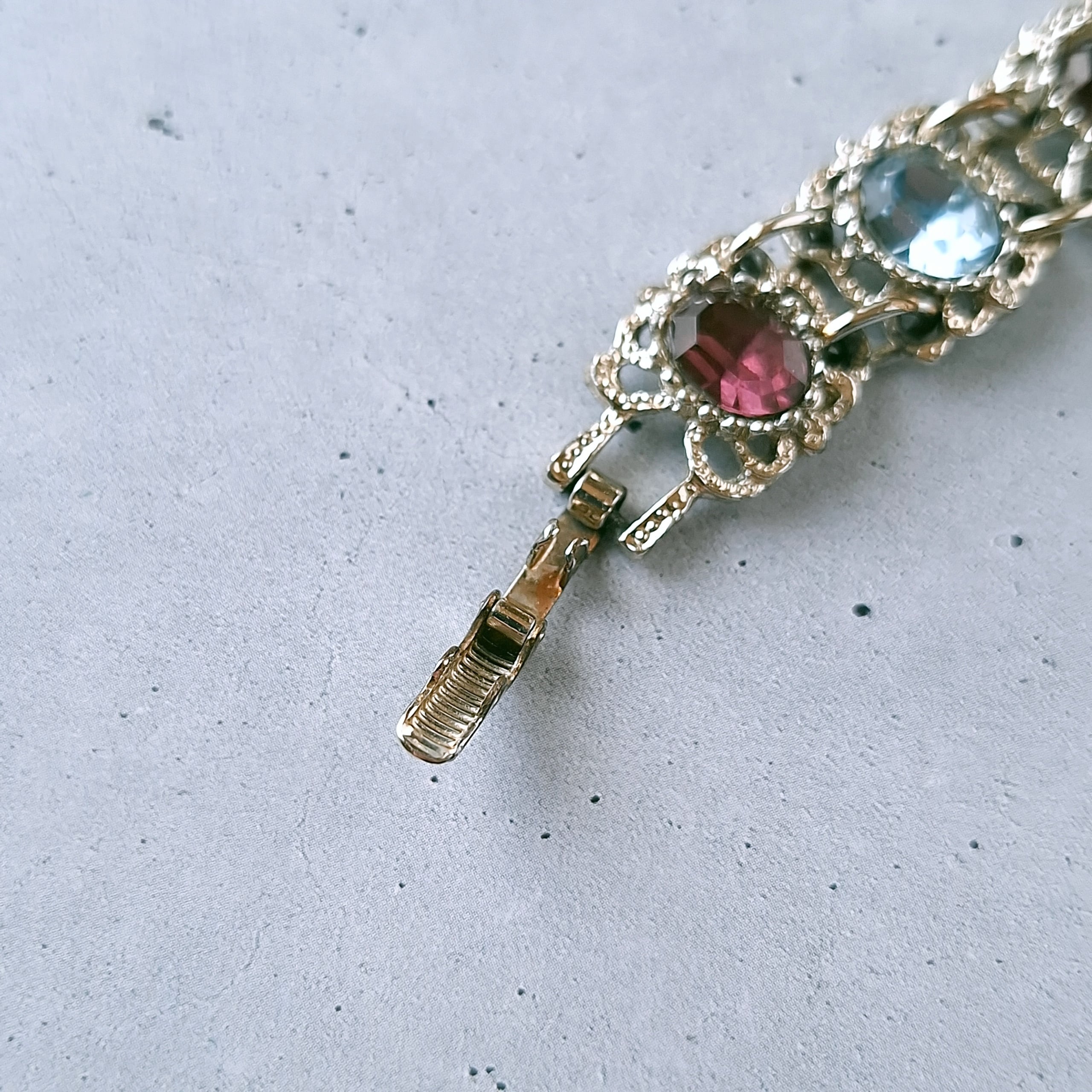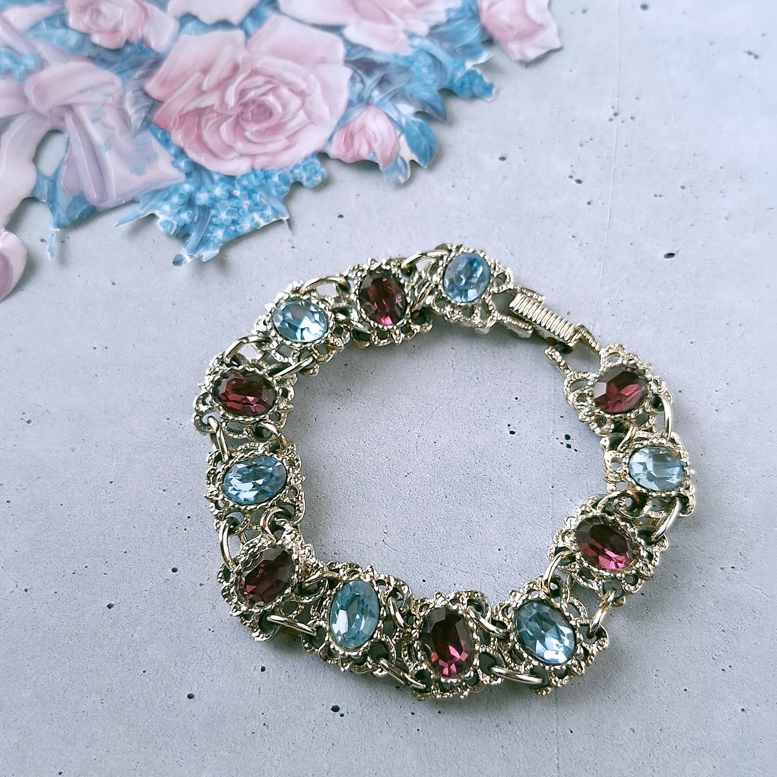 オープンワークのスクエア型のメタルにライトブルーとパープルのオーバルラインストーンが交互にあしらわれたヴィンテージブレスレットです。