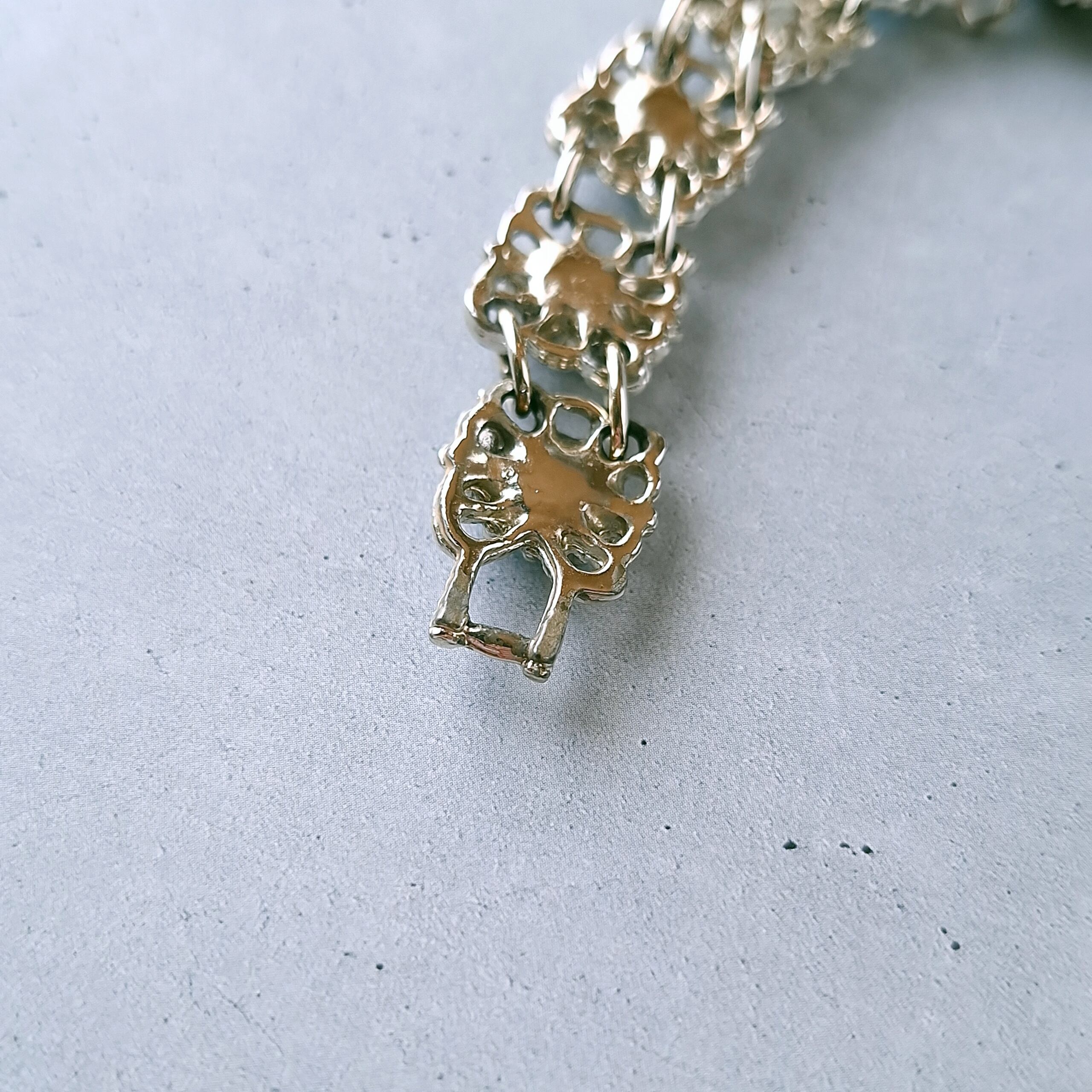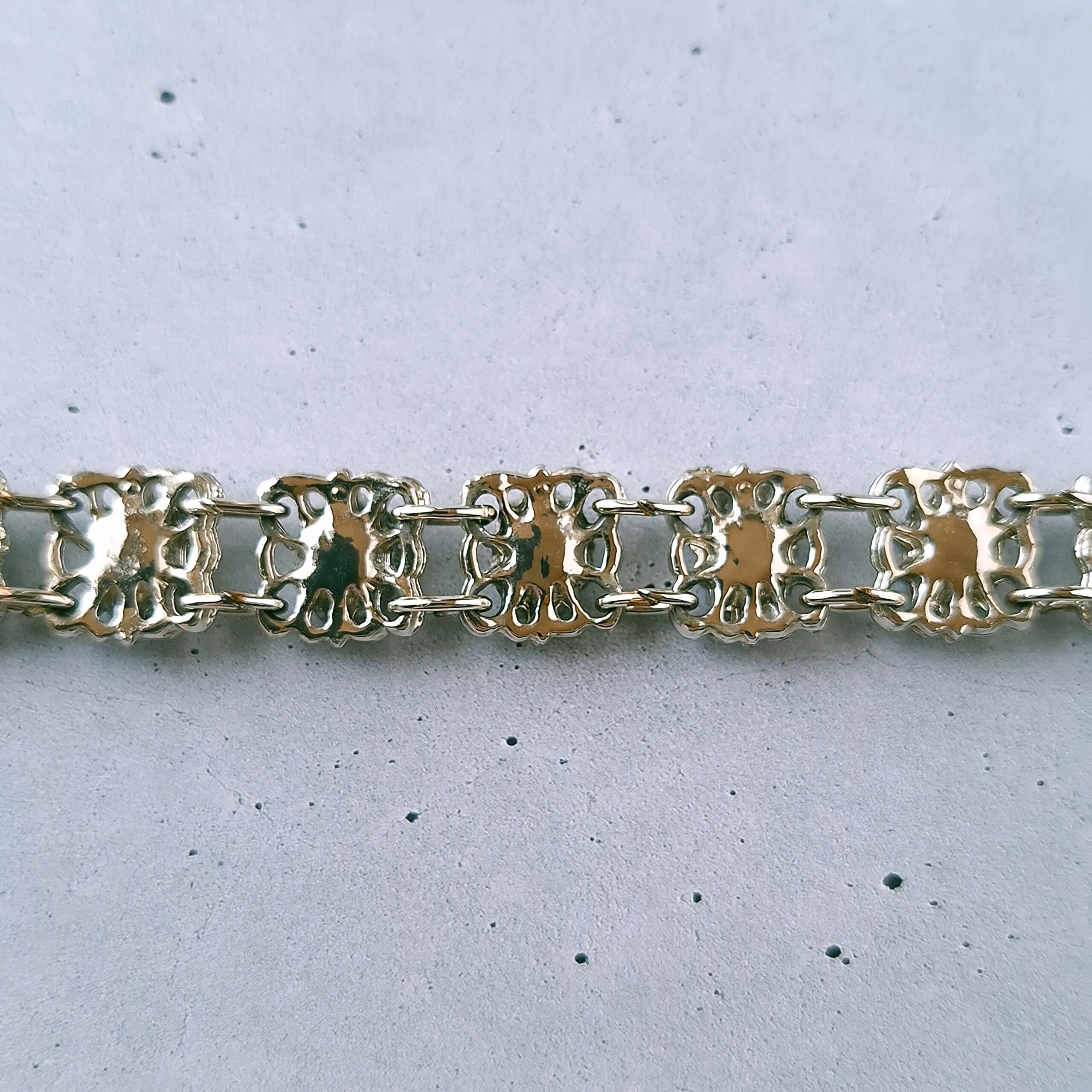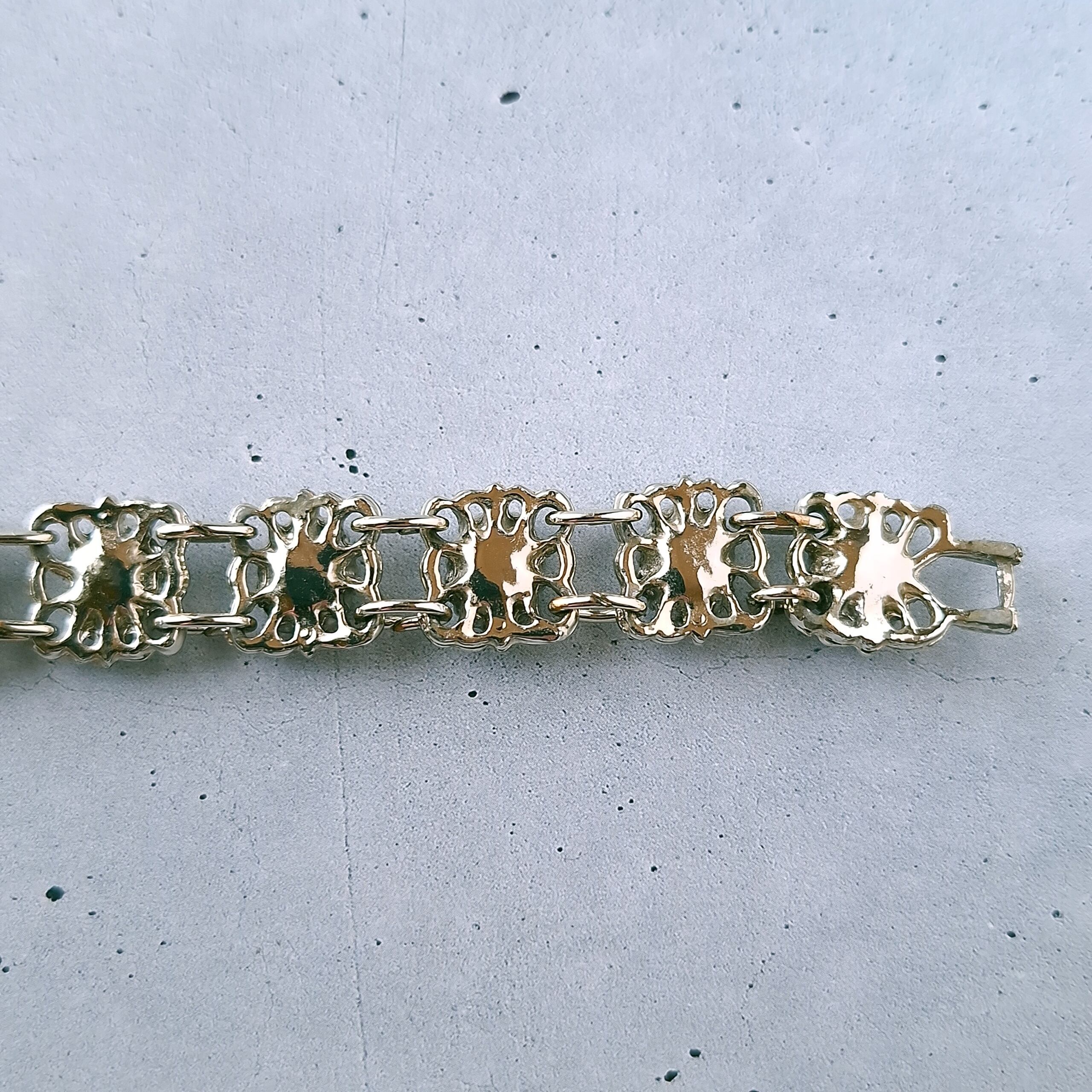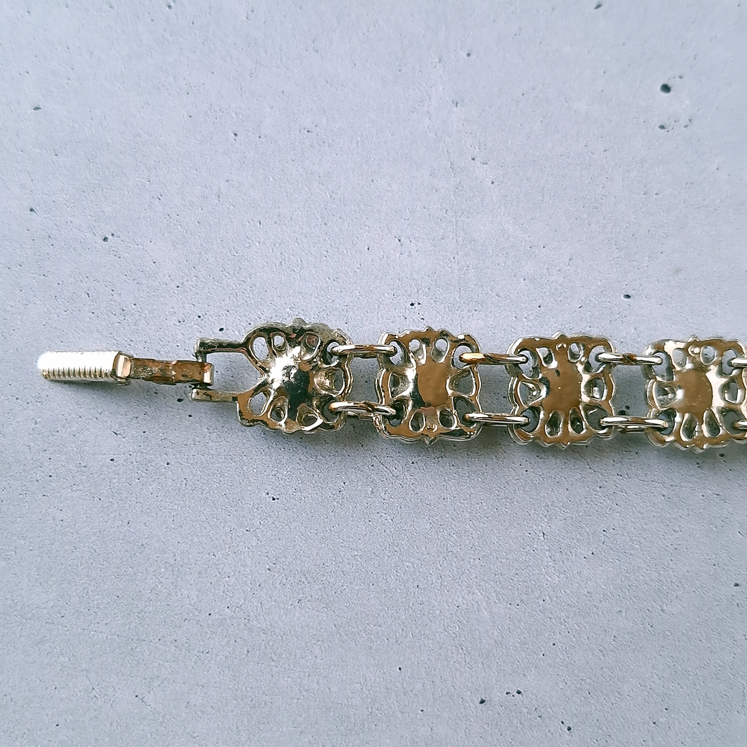 オープンワークのスクエア型のメタルにライトブルーとパープルのオーバルラインストーンが交互にあしらわれたヴィンテージブレスレットです。