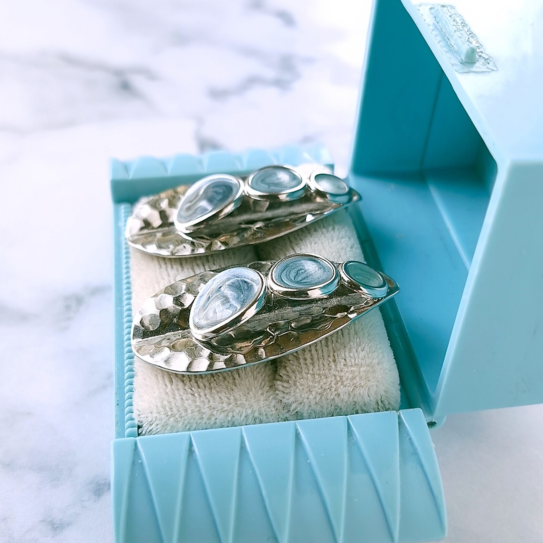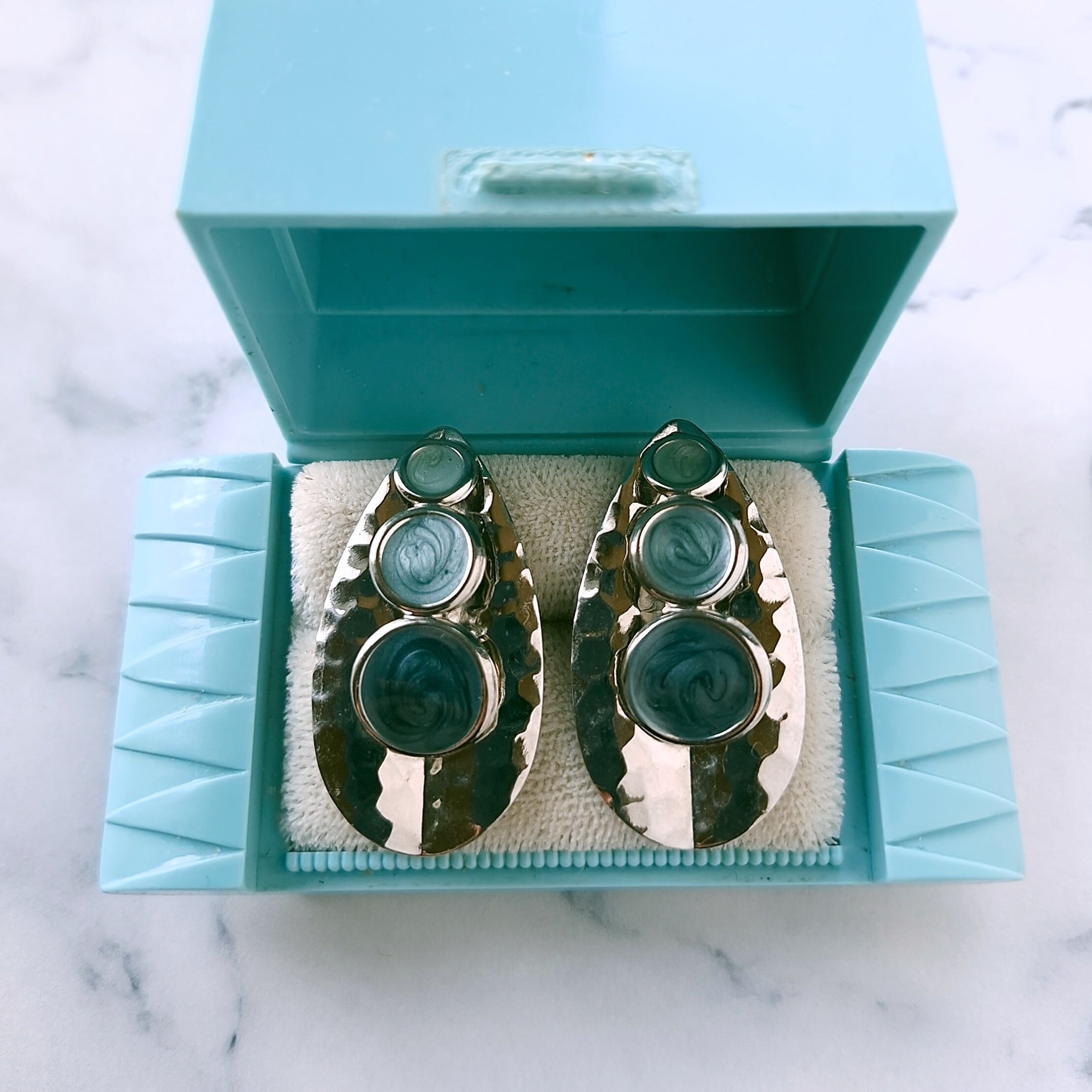 リーフ型のメタルの中央に色味の違うブルー系(1番上はグリーンっぽい色合いです)のエナメルで色付けされた大中小のラウンドがアーチ状にデザインされたヴィンテージピアスです。