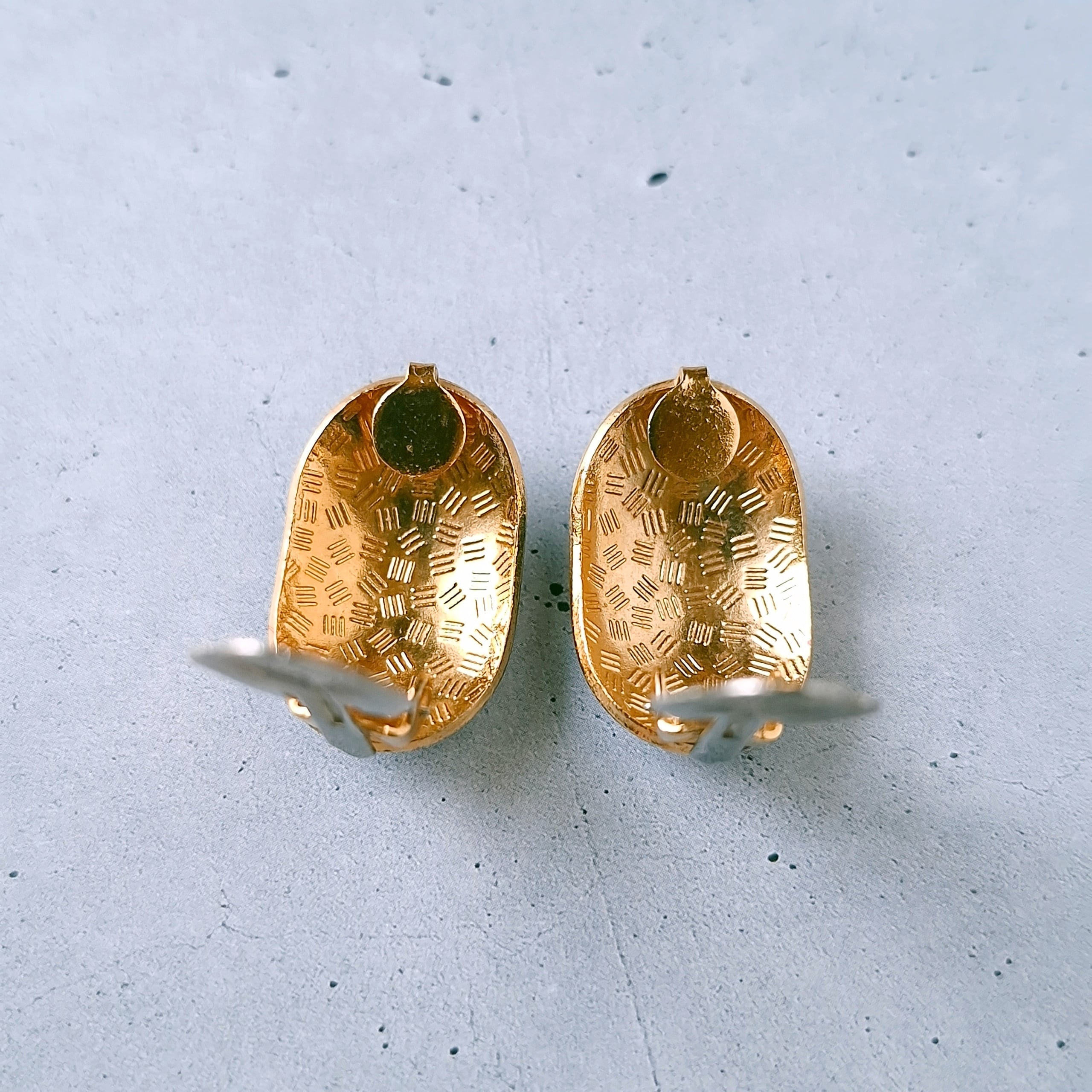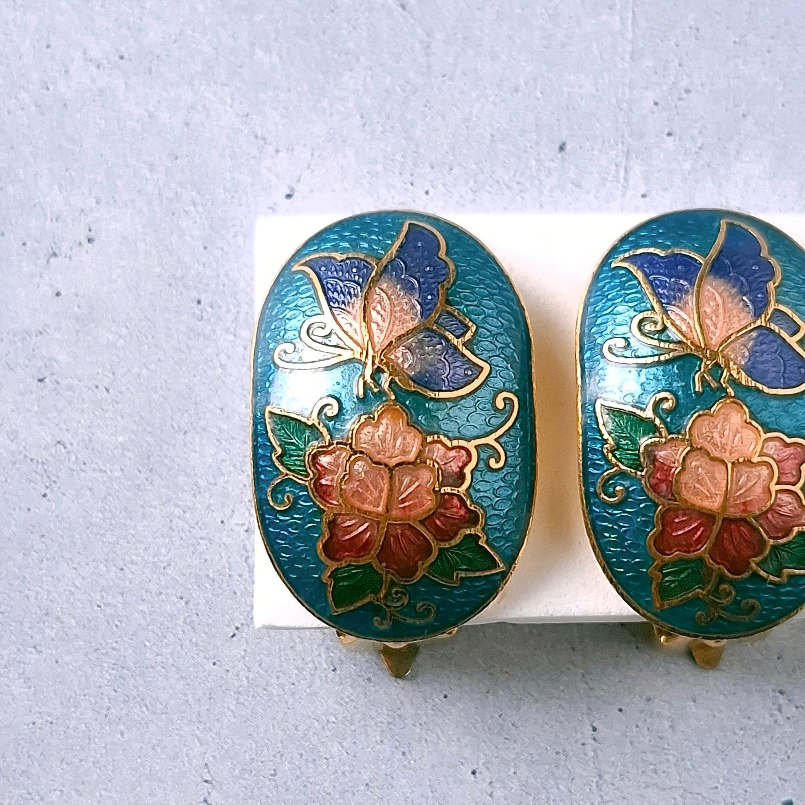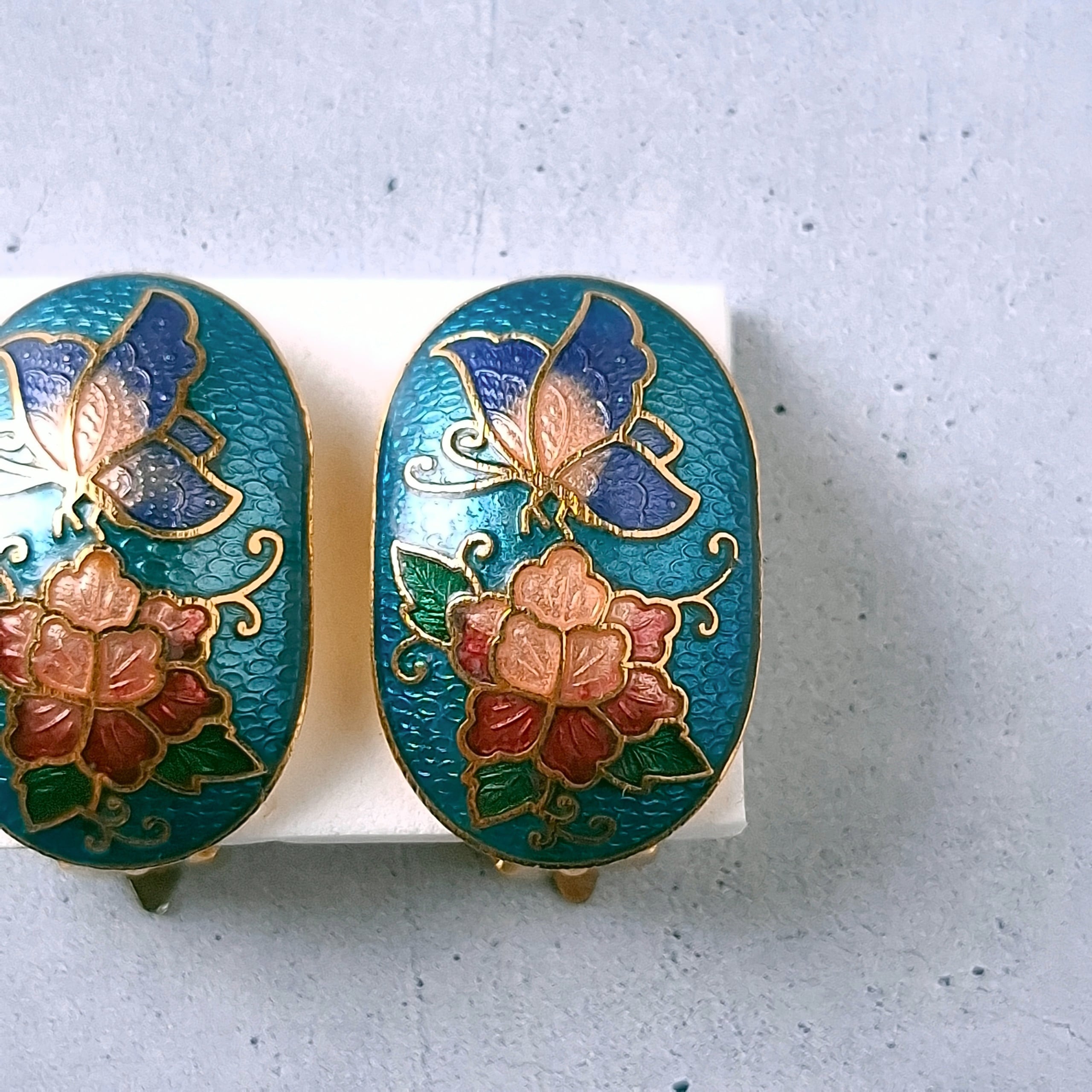 セルリアンブルーをベースにフラワーと蝶が描かれた七宝焼のヴィンテージイヤリングです。