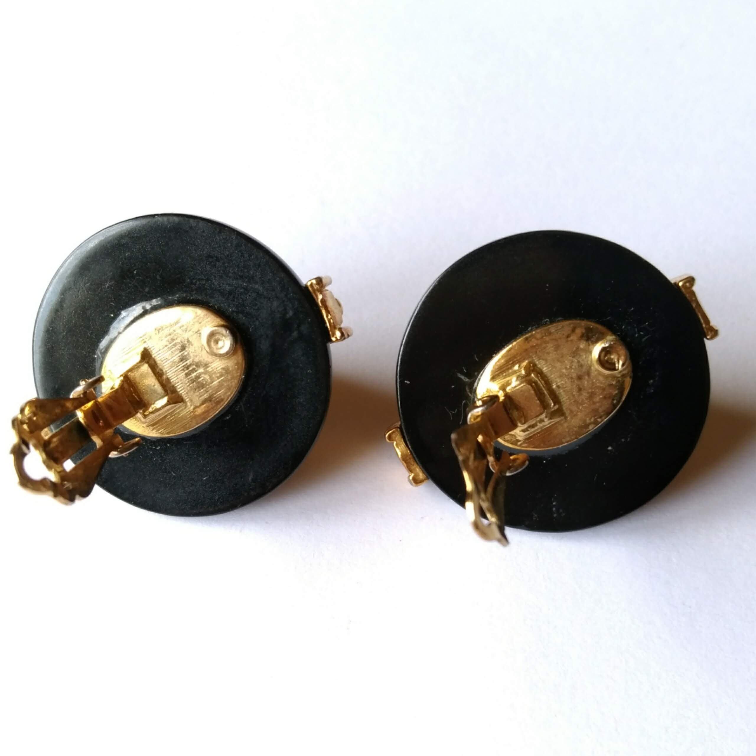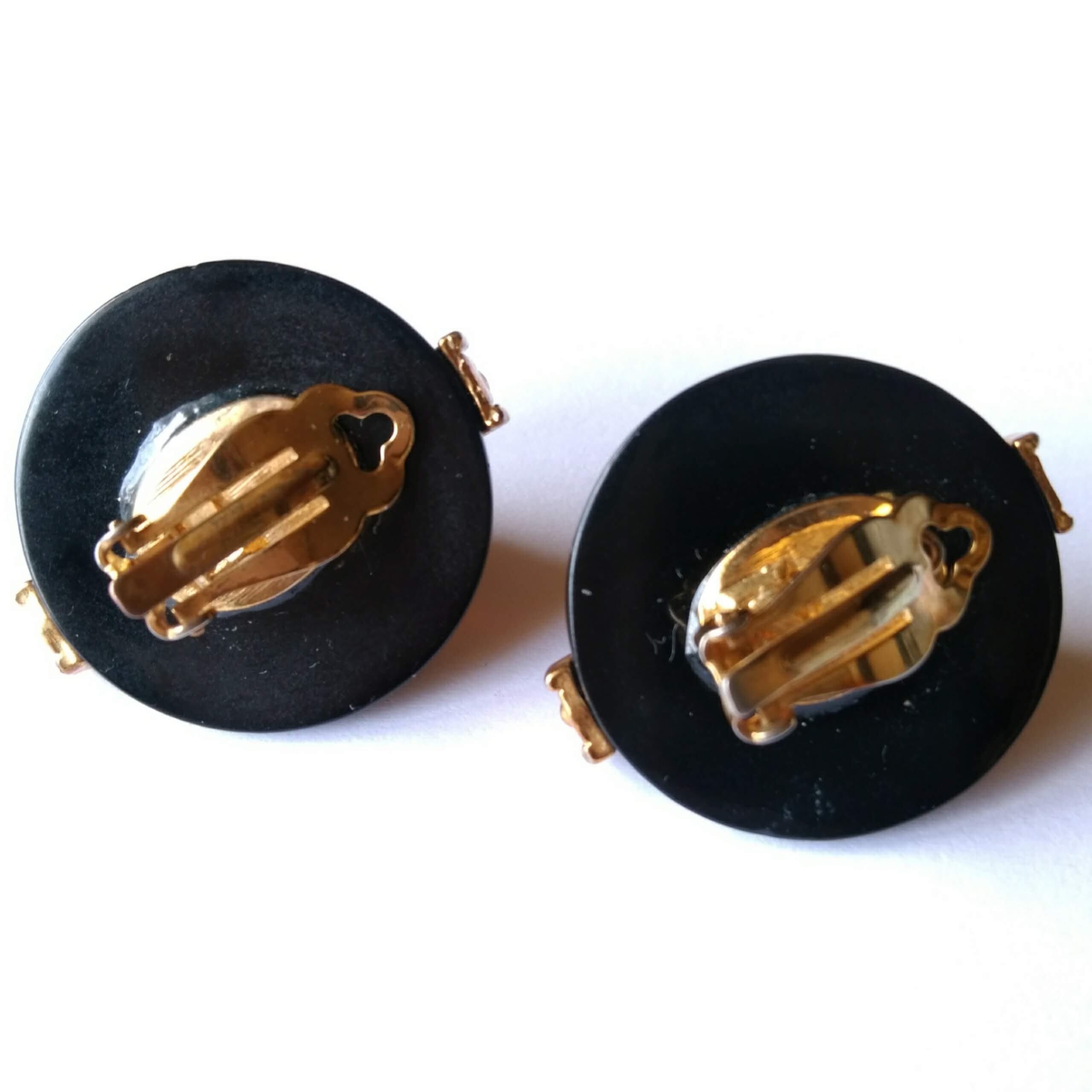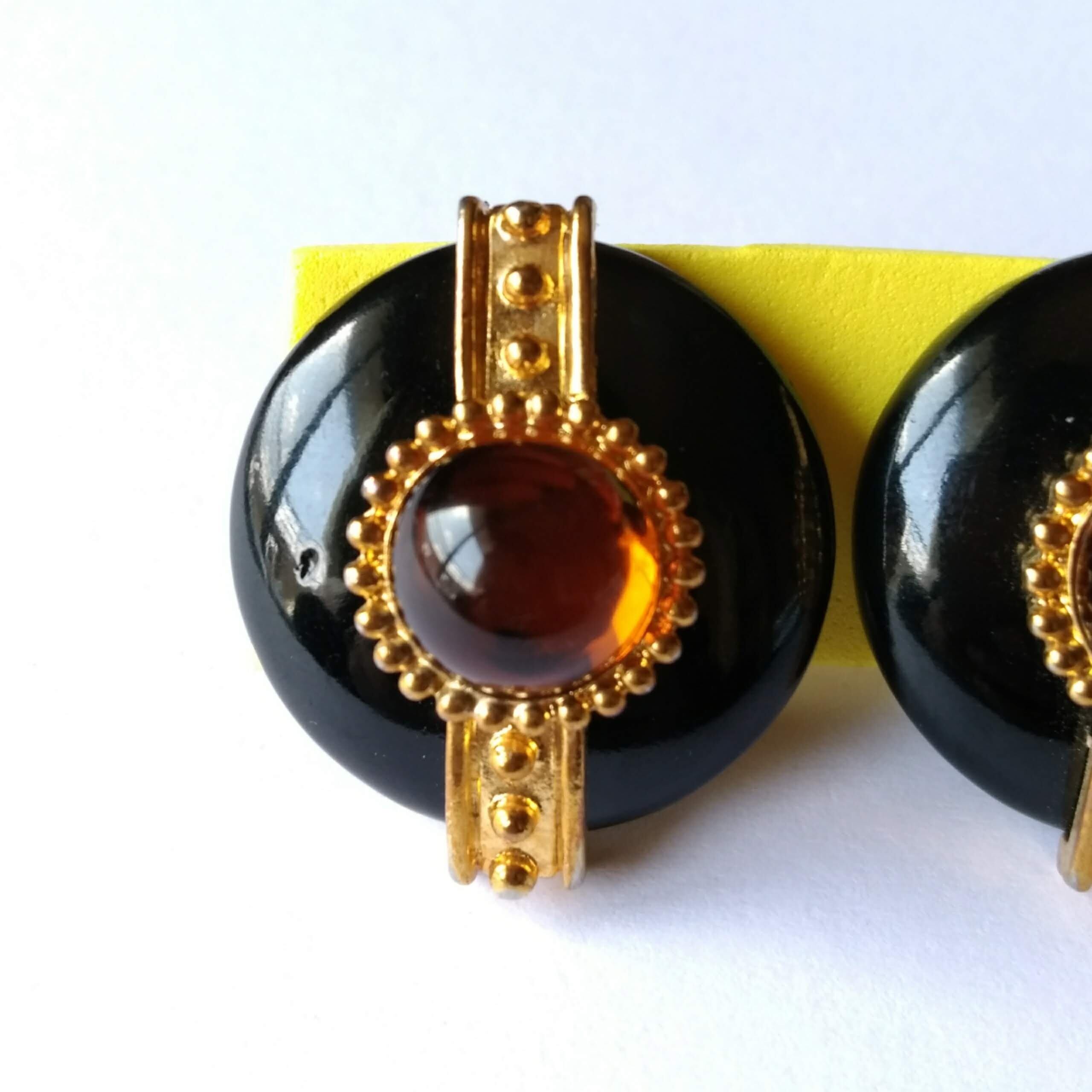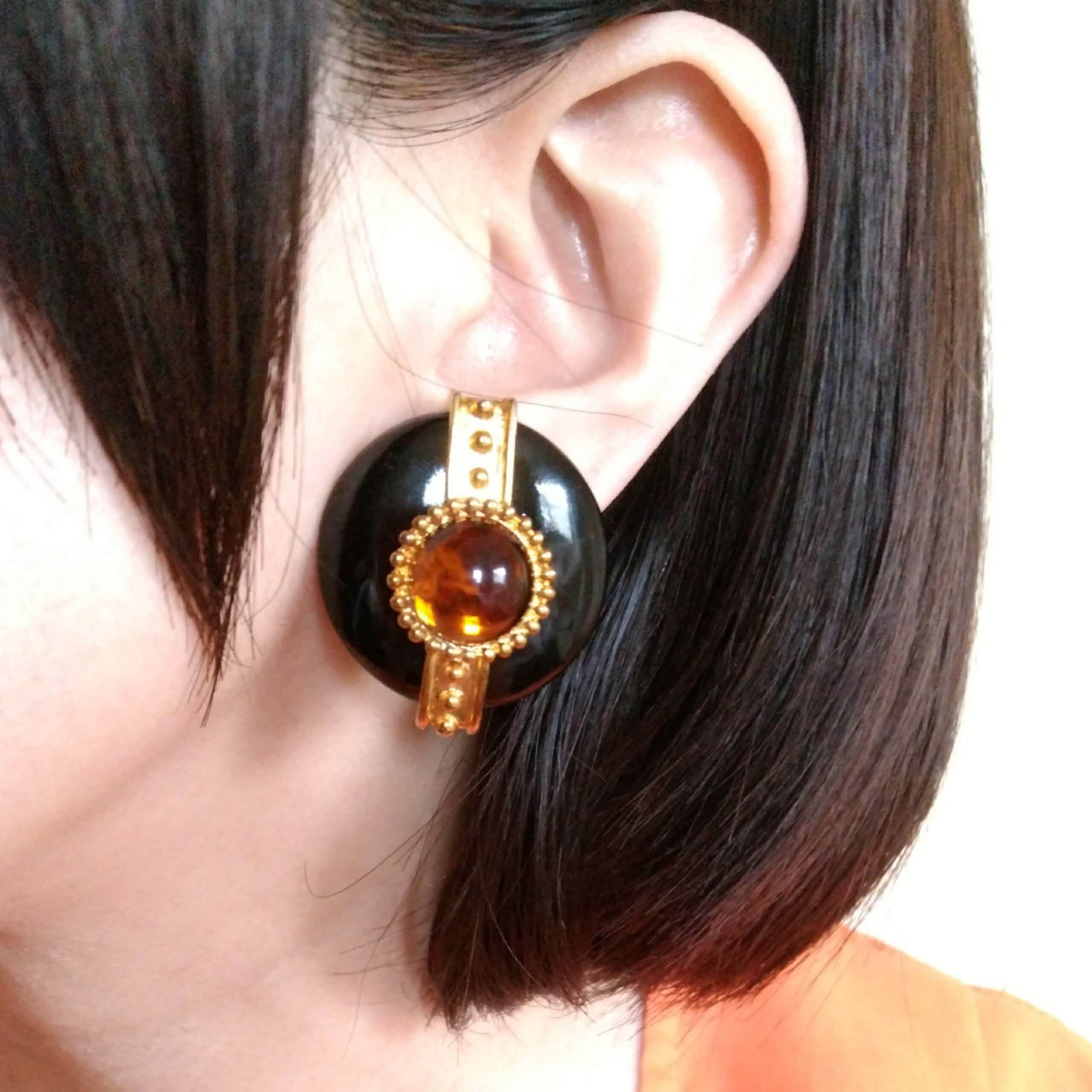 ブラックの丸みのあるプラスチックのラウンドにゴールドトーンの装飾、真ん中にはアンバートーンのガラスカボションが施されたヴィンテージイヤリングです。