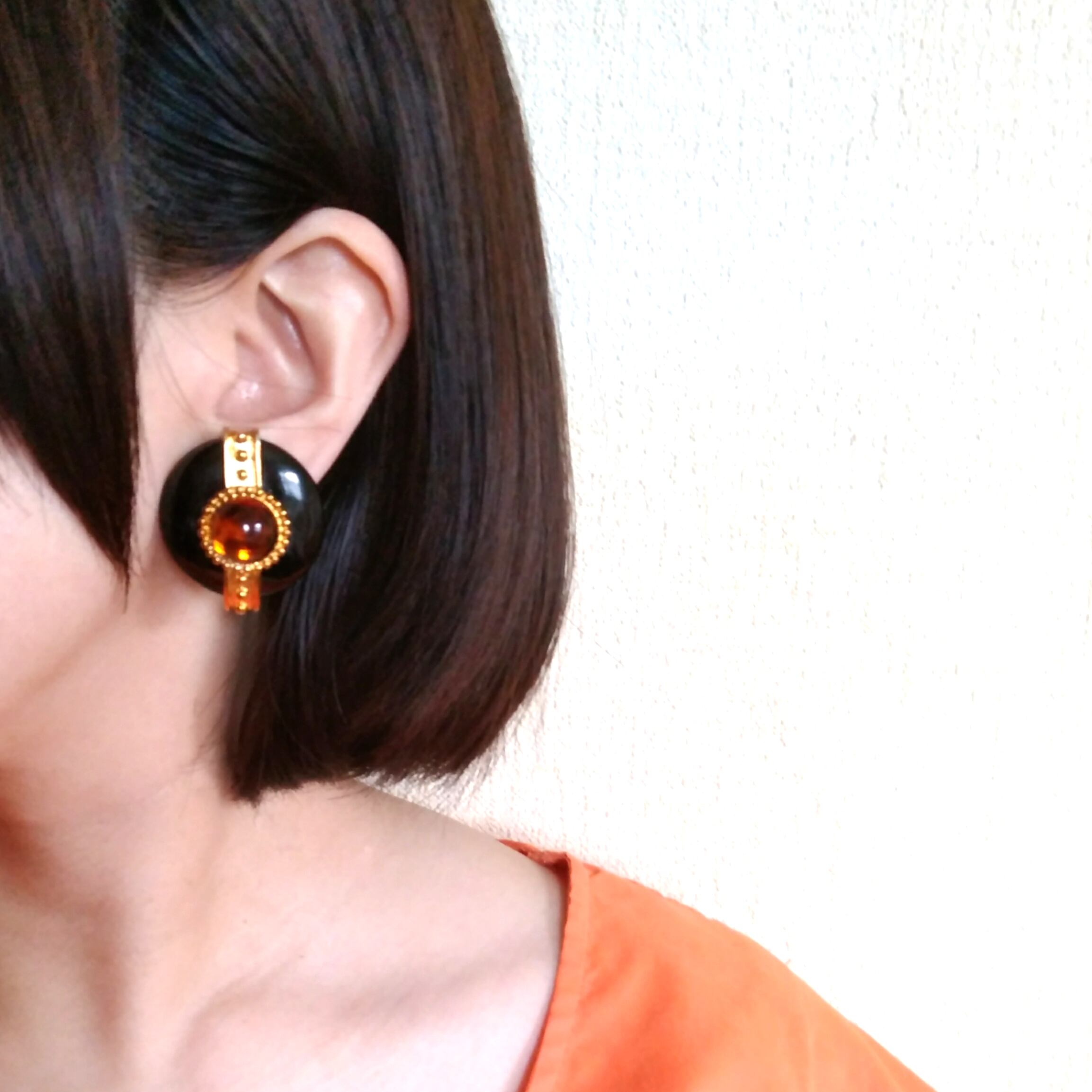 goldtone amber black round vintage earrings ヴィンテージイヤリング