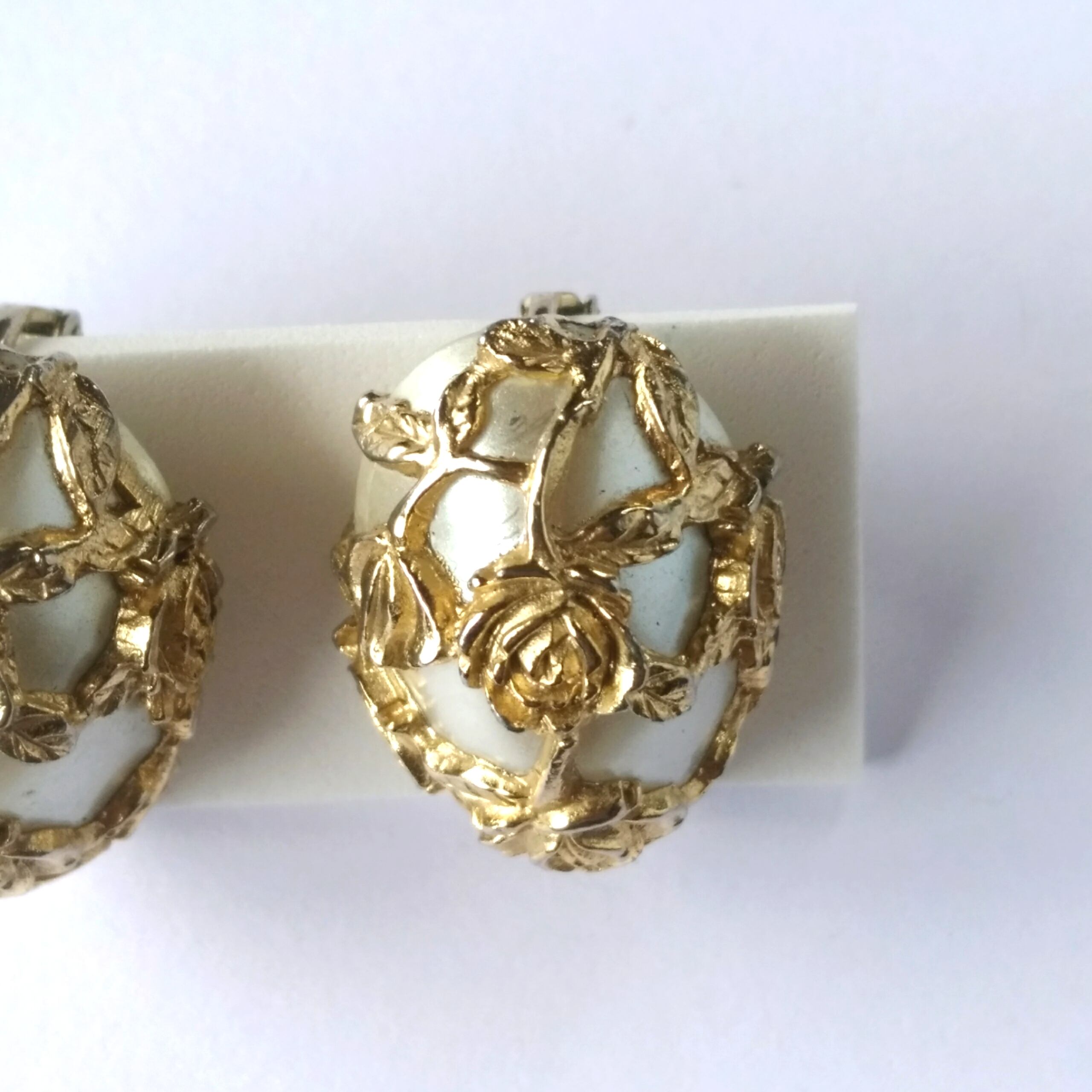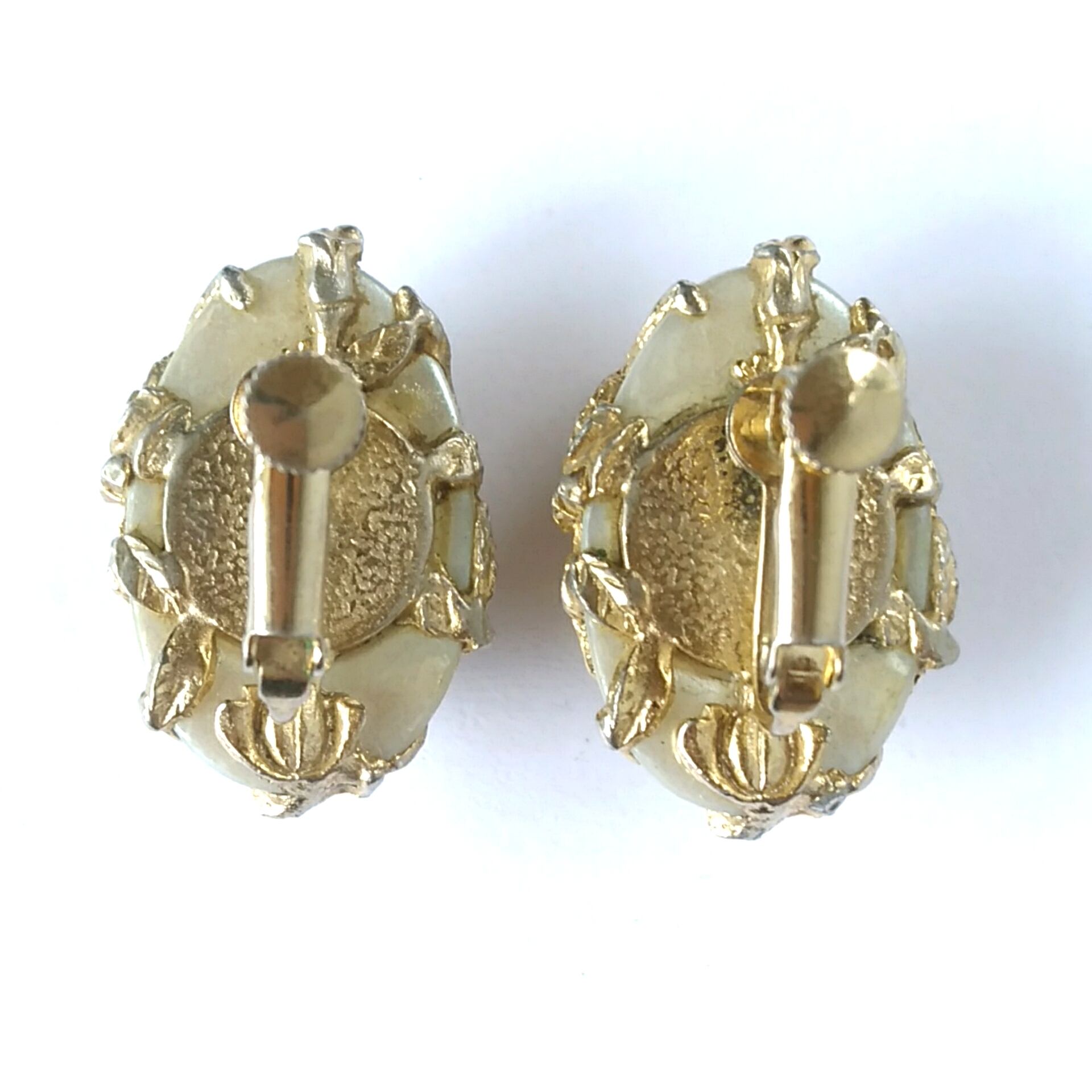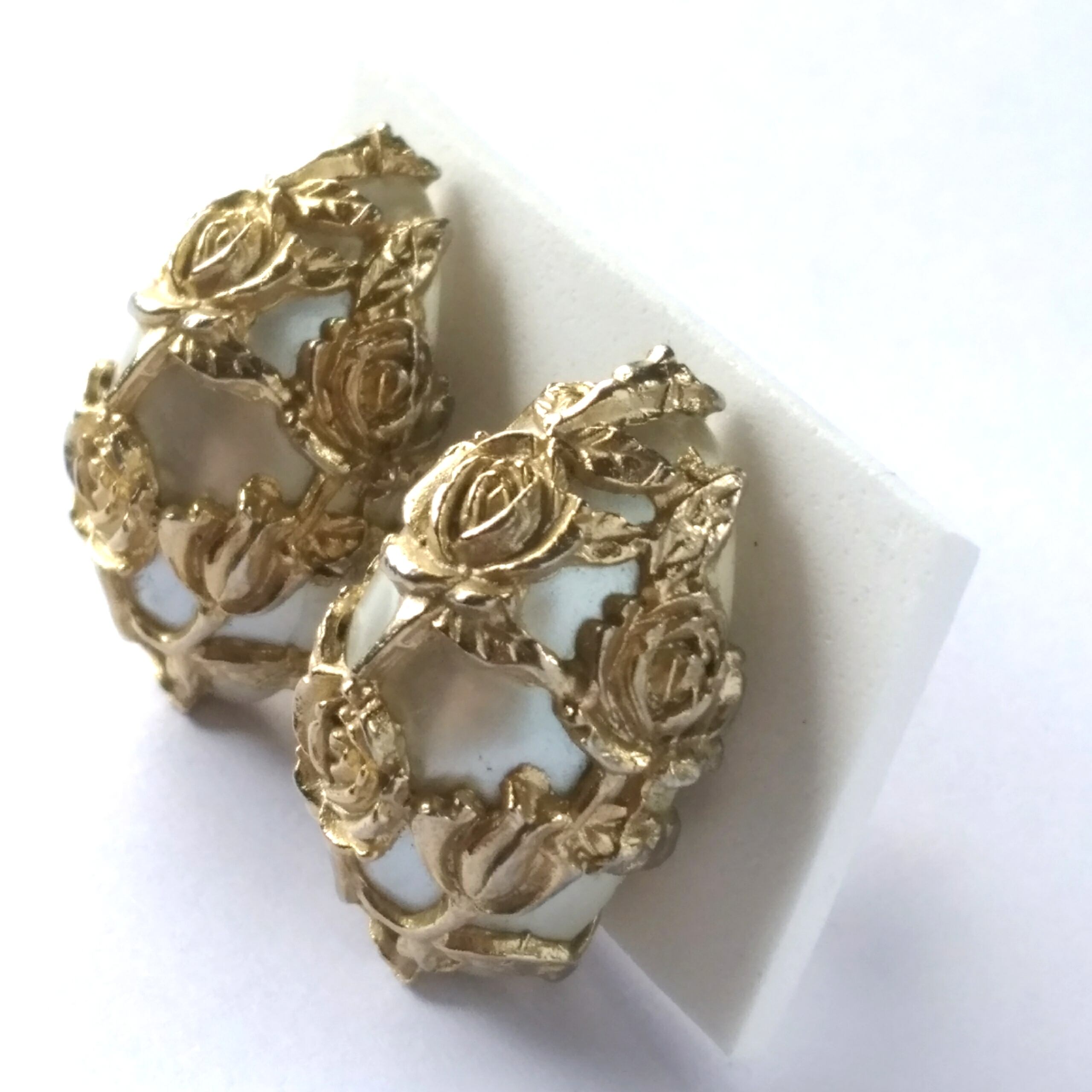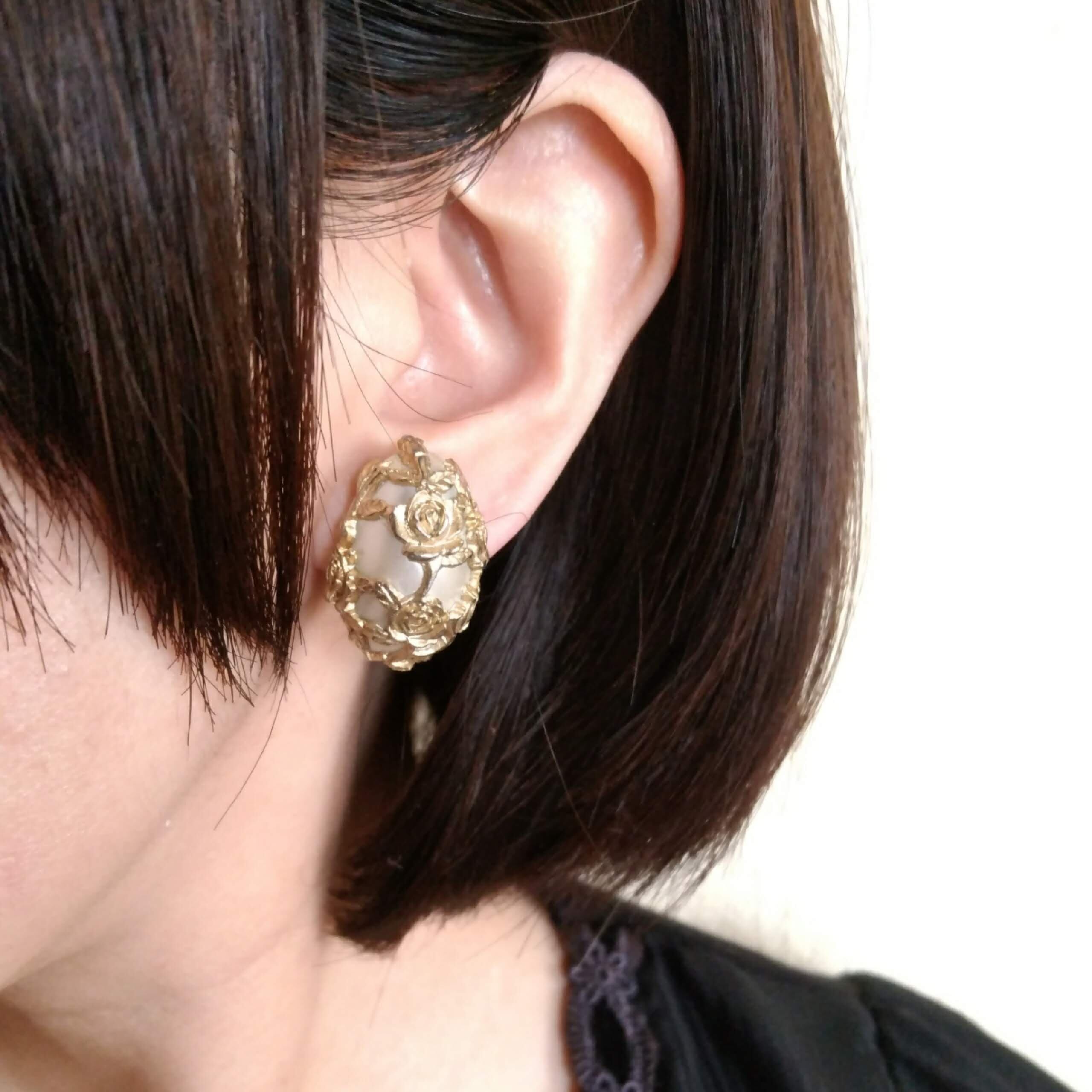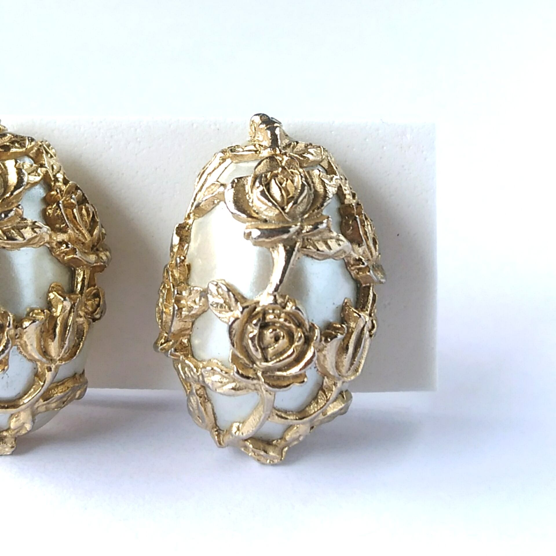 オーバルのフェイクパールをゴールドメタルのローズの装飾モチーフで囲んだデザインのヴィンテージイヤリングです。