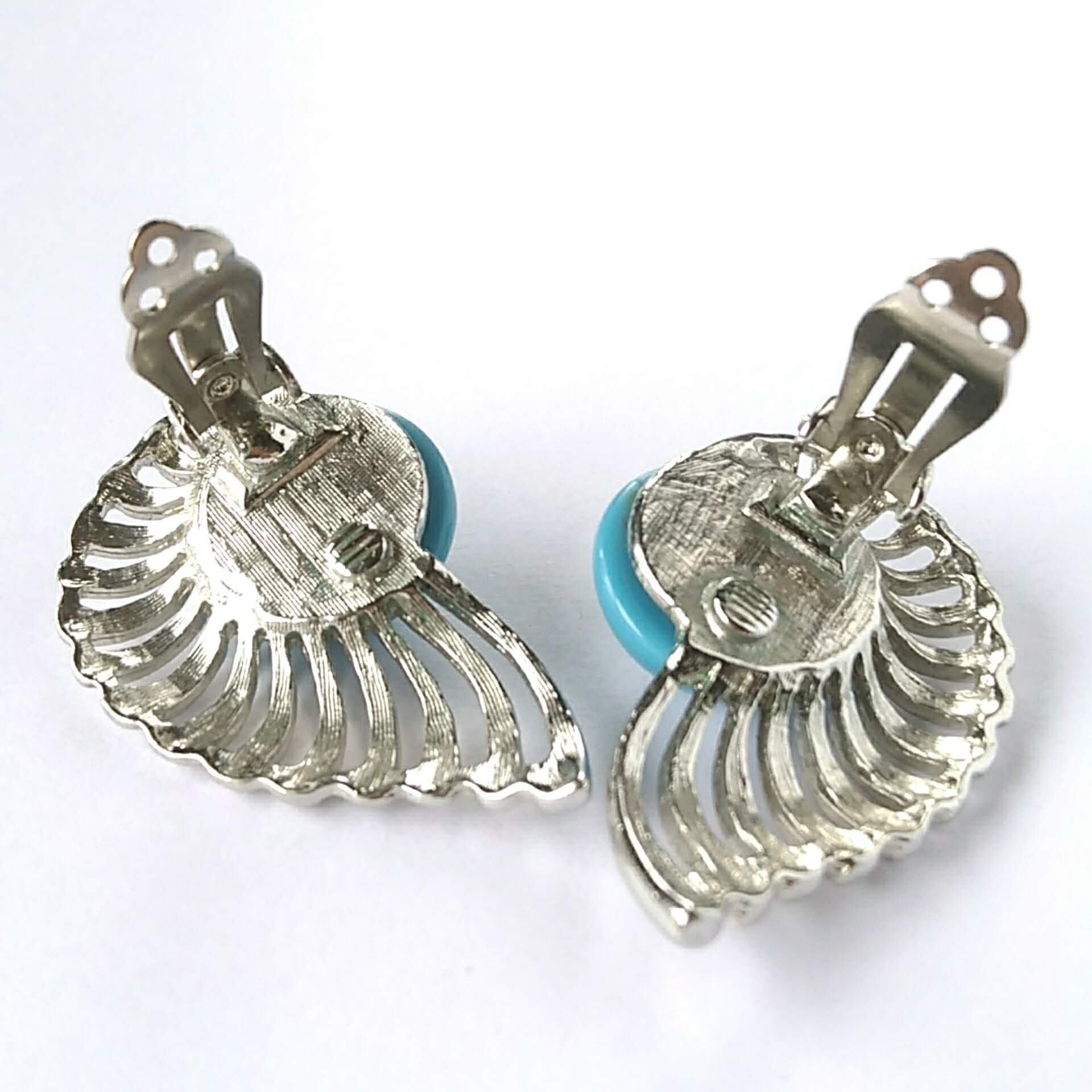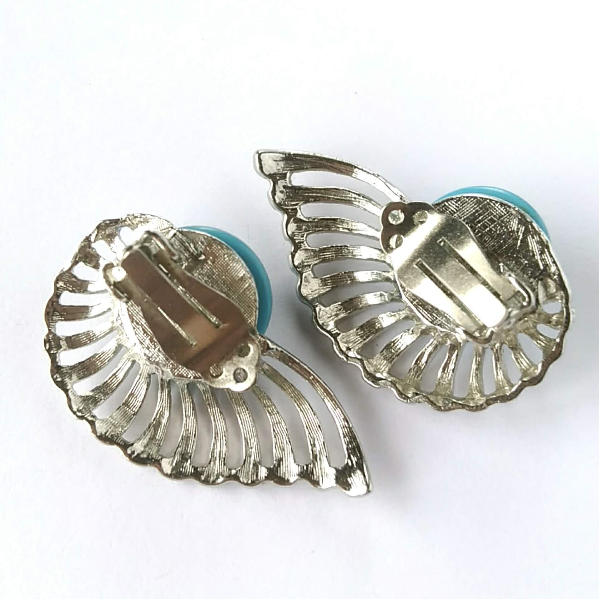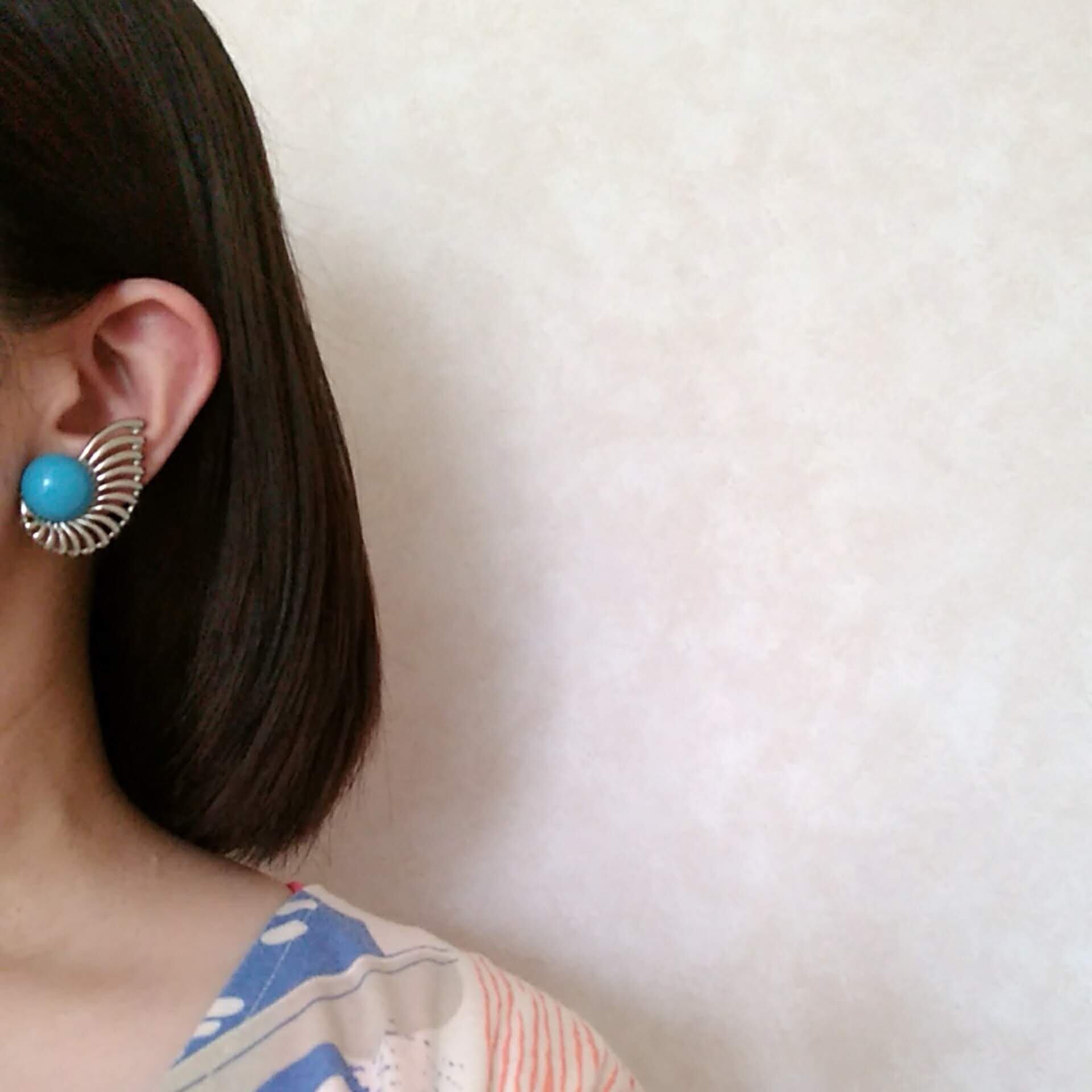 透かしの羽根の様なシルバーメタルにターコイズブルーの丸いぷっくりしたカボションが付いたヴィンテージイヤリングです。