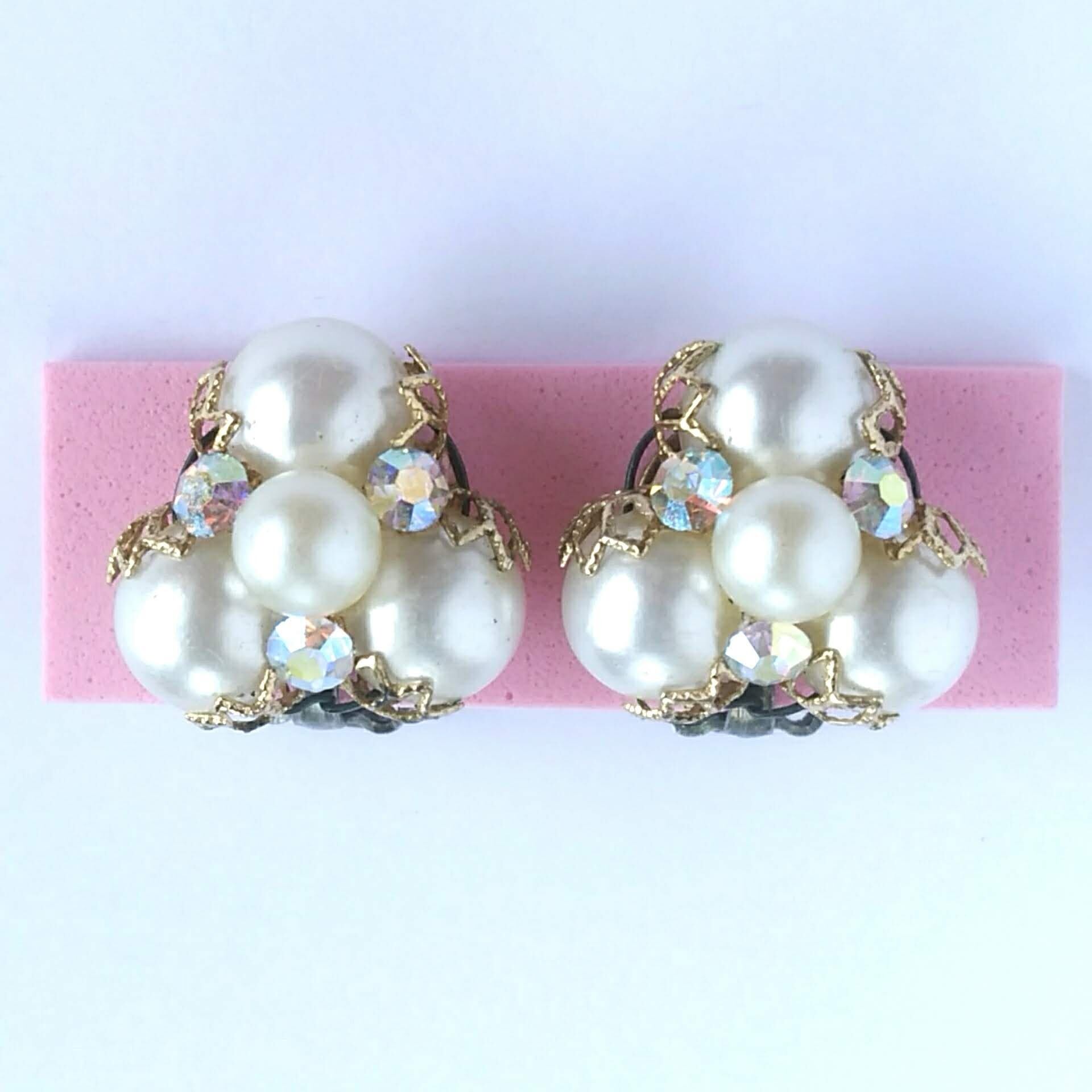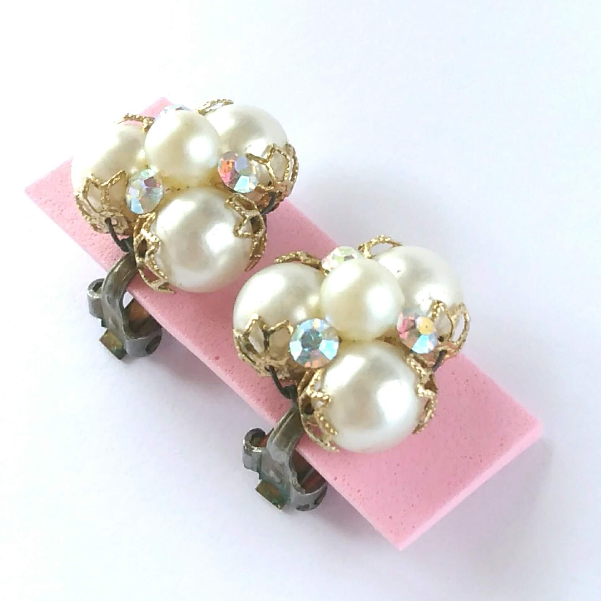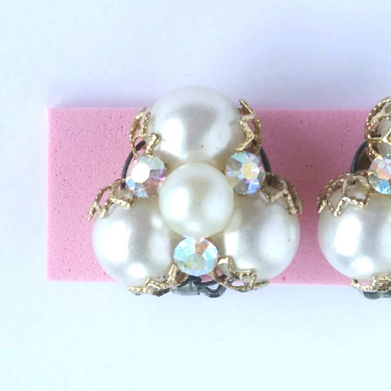 フェイクパールとオーロララインストーンのクラスターヴィンテージイヤリングです。