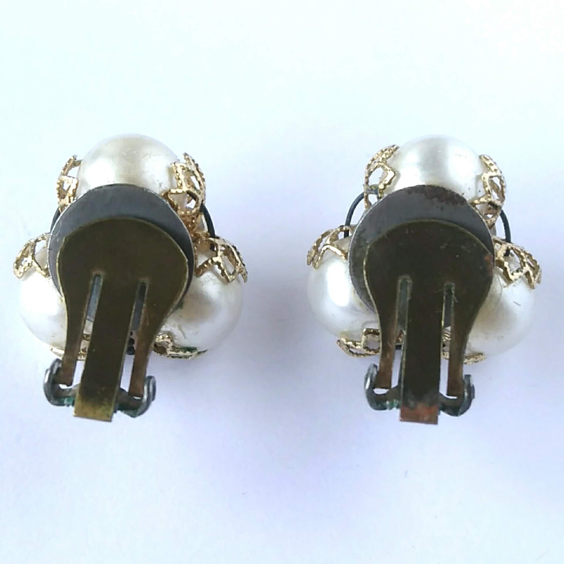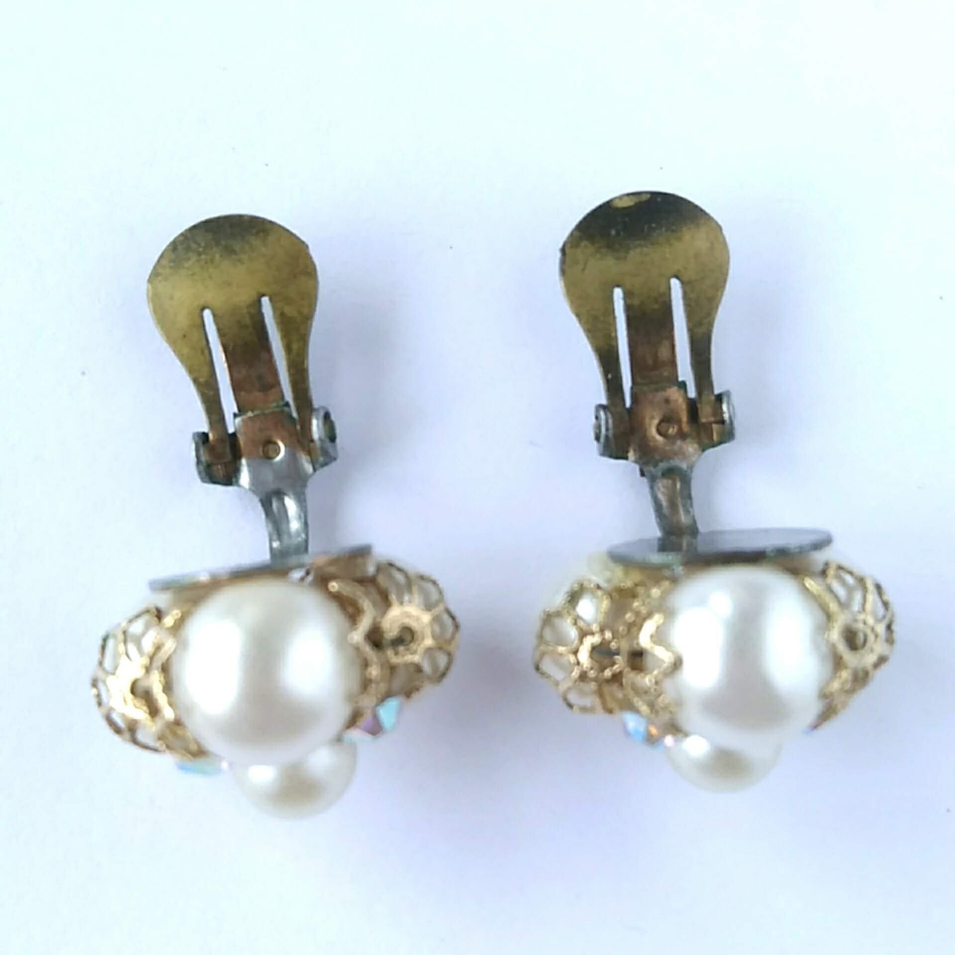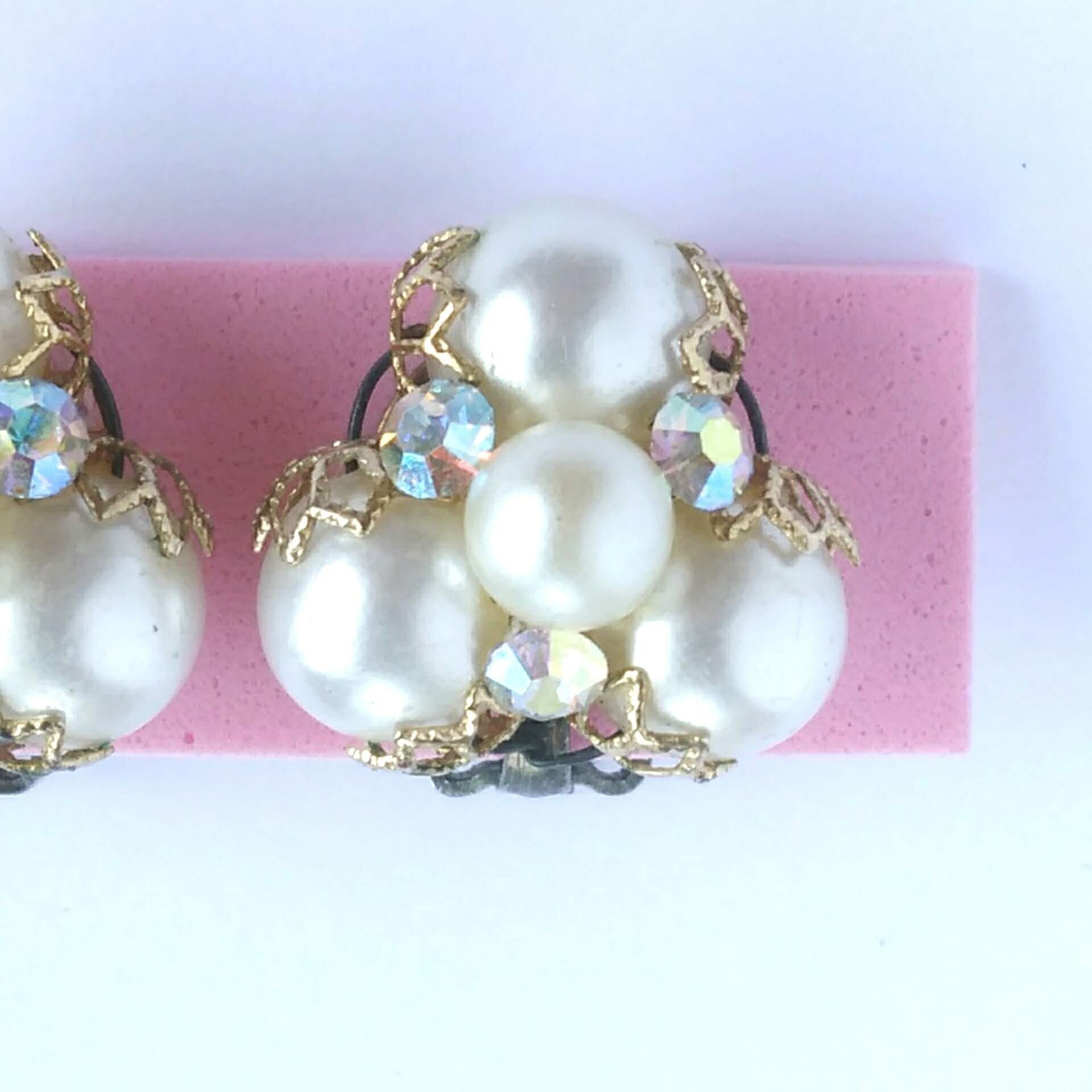 フェイクパールとオーロララインストーンのクラスターヴィンテージイヤリングです。