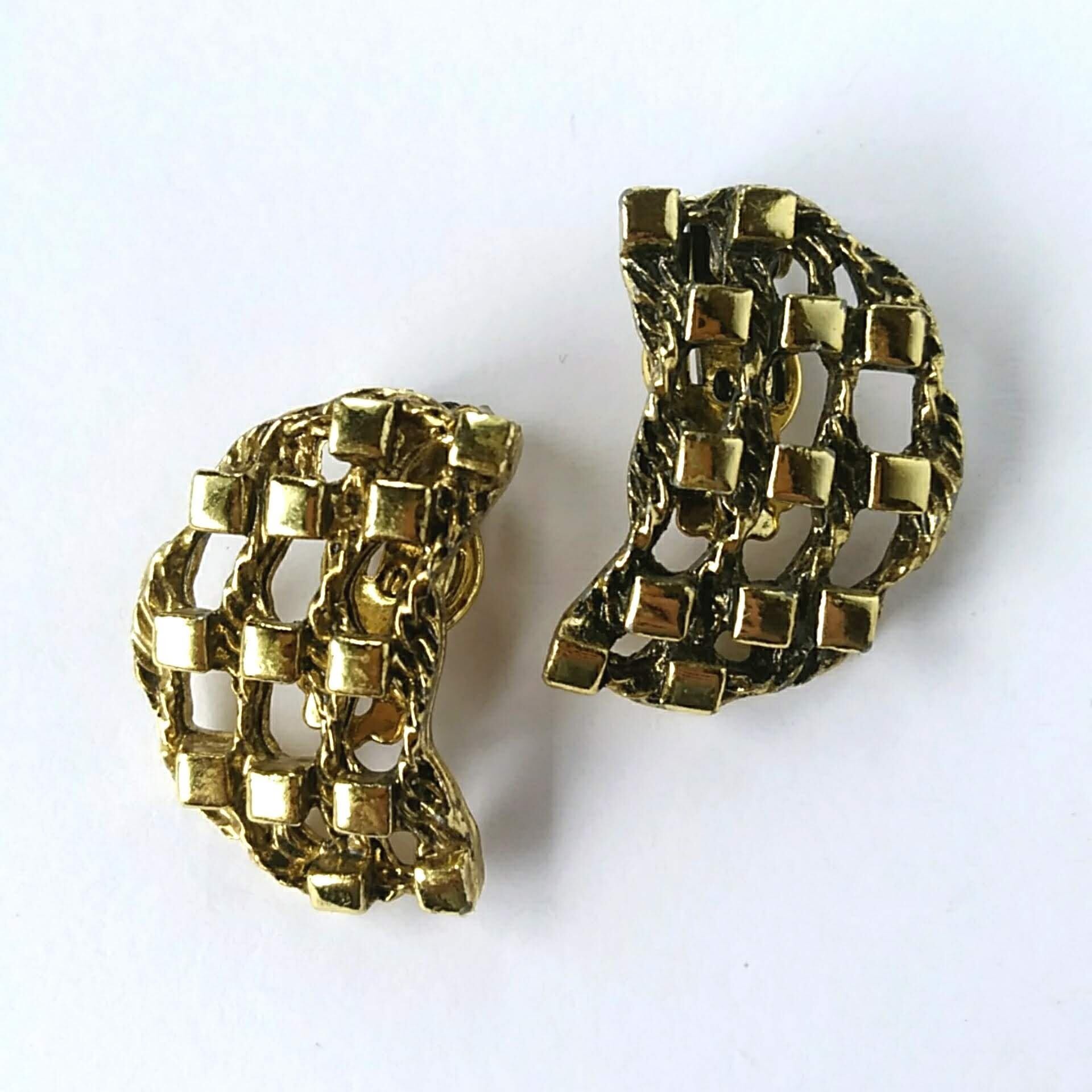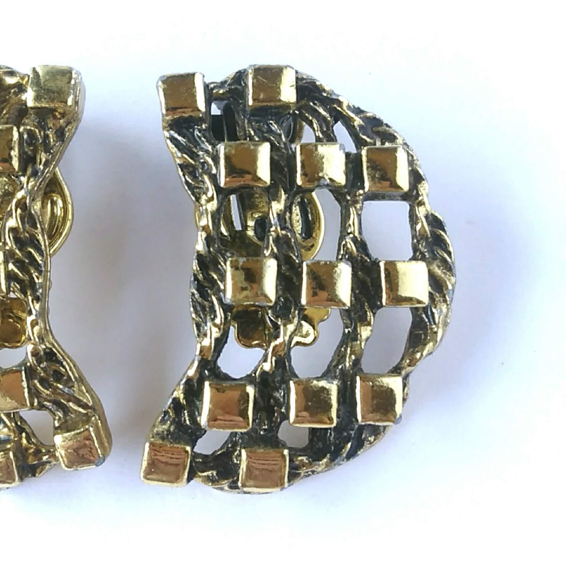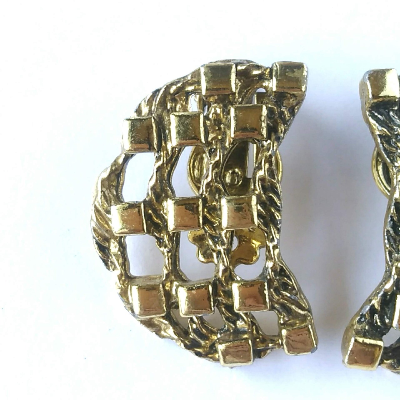 スクエアとロープデザインのゴールドメタルがオープンチェックになった三日月型のヴィンテージイヤリングです。