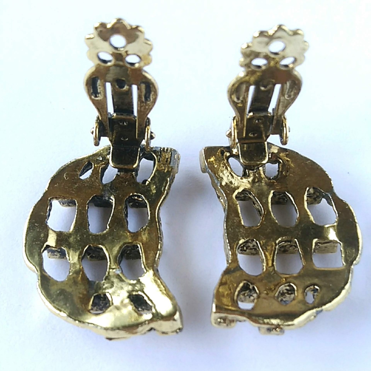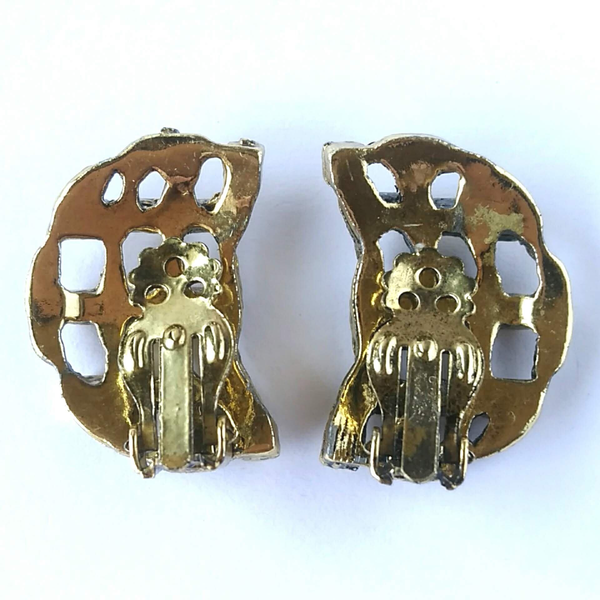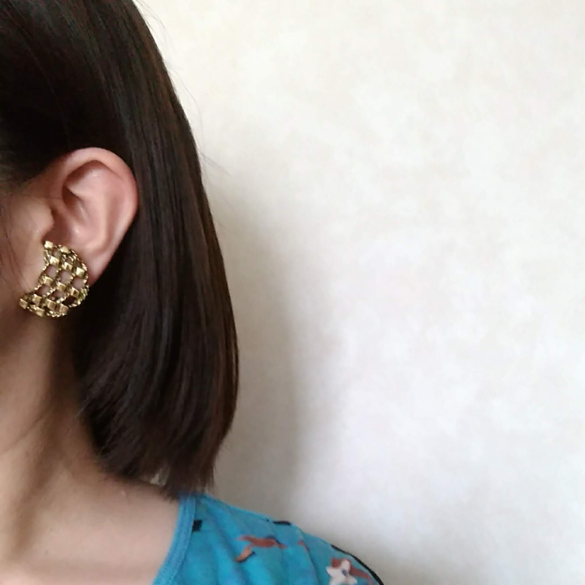 スクエアとロープデザインのゴールドメタルがオープンチェックになった三日月型のヴィンテージイヤリングです。