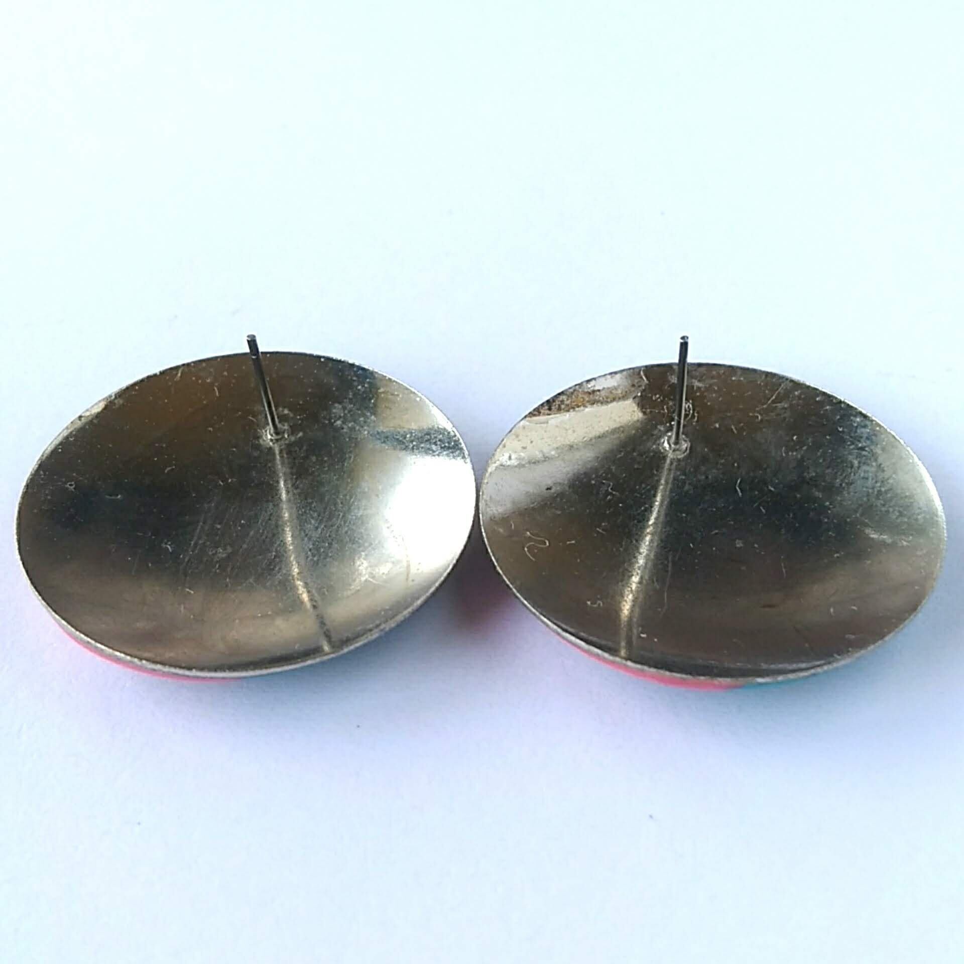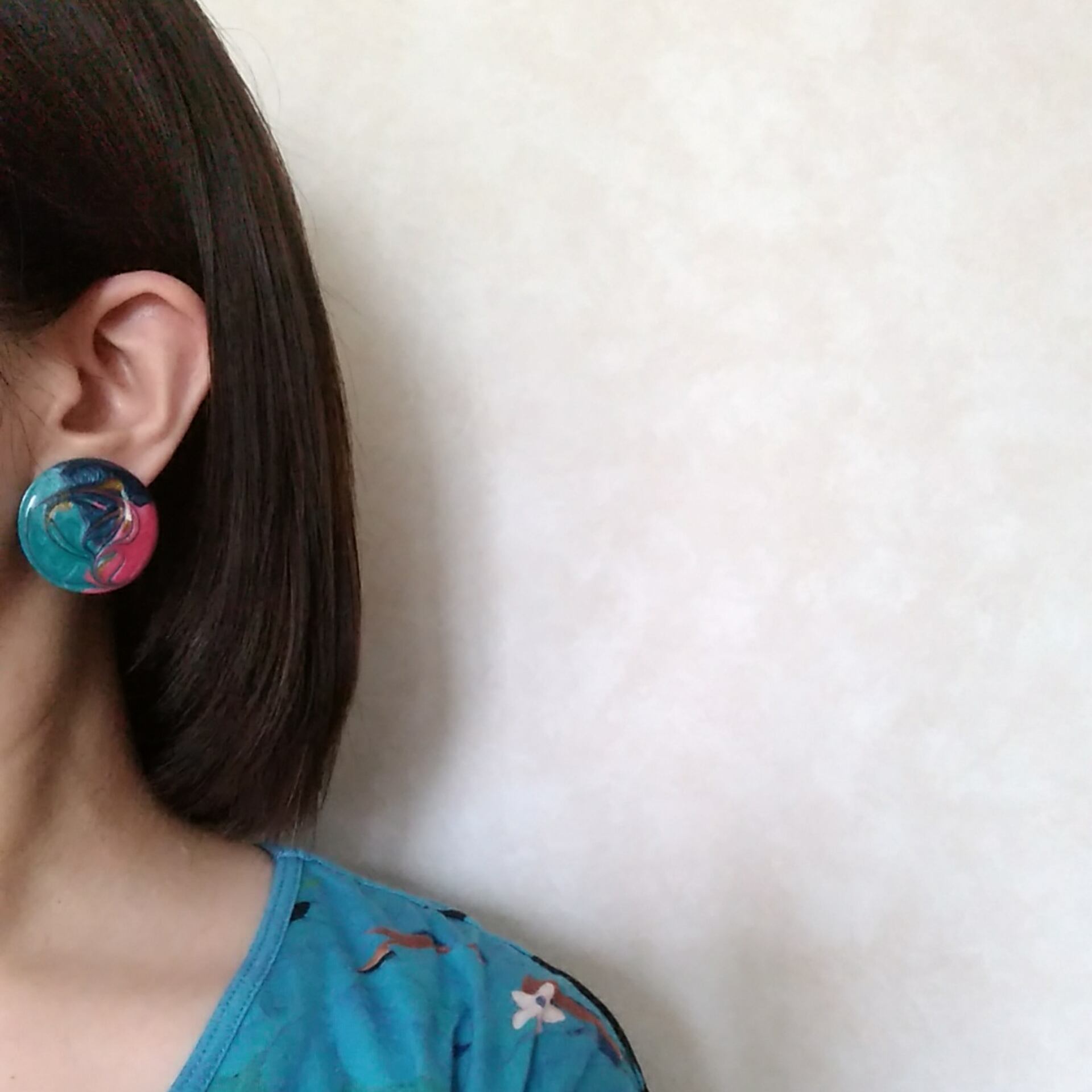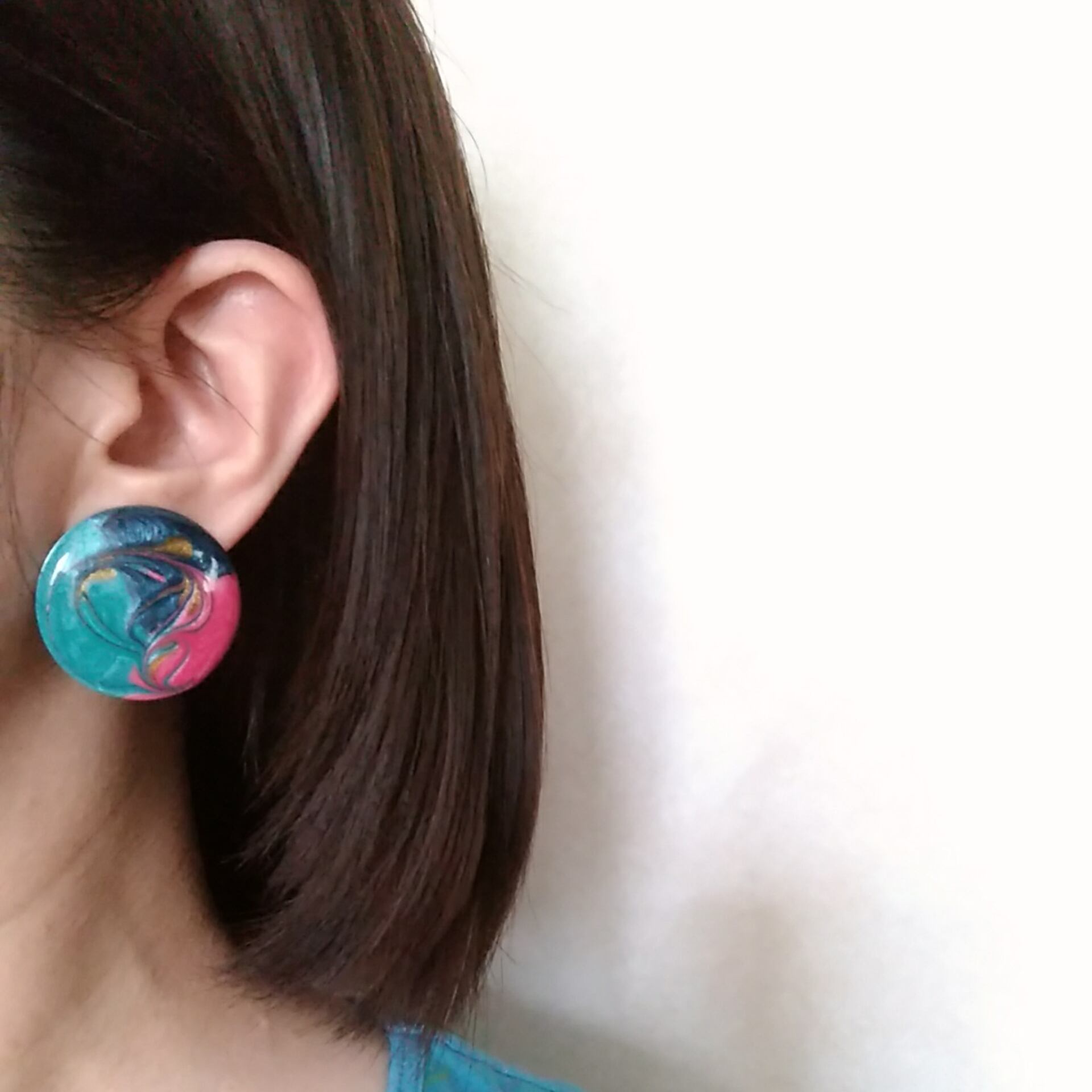 シルバーのラウンドメタルにネイビー、グリーン、ピンクの3色のエナメルを真ん中でスワール状のマーブルを描いたヴィンテージピアスです。