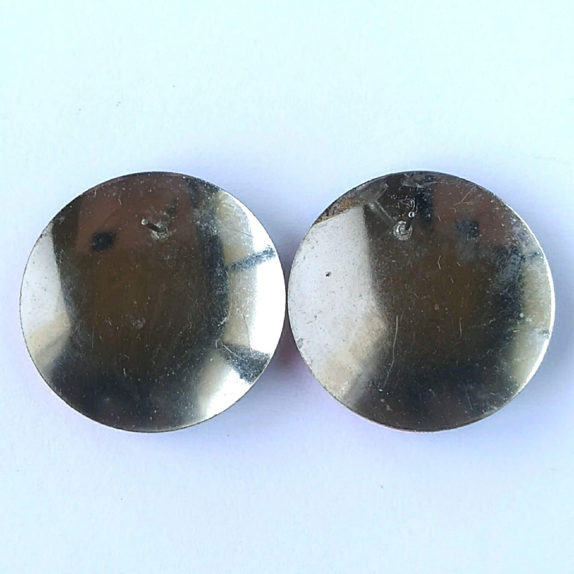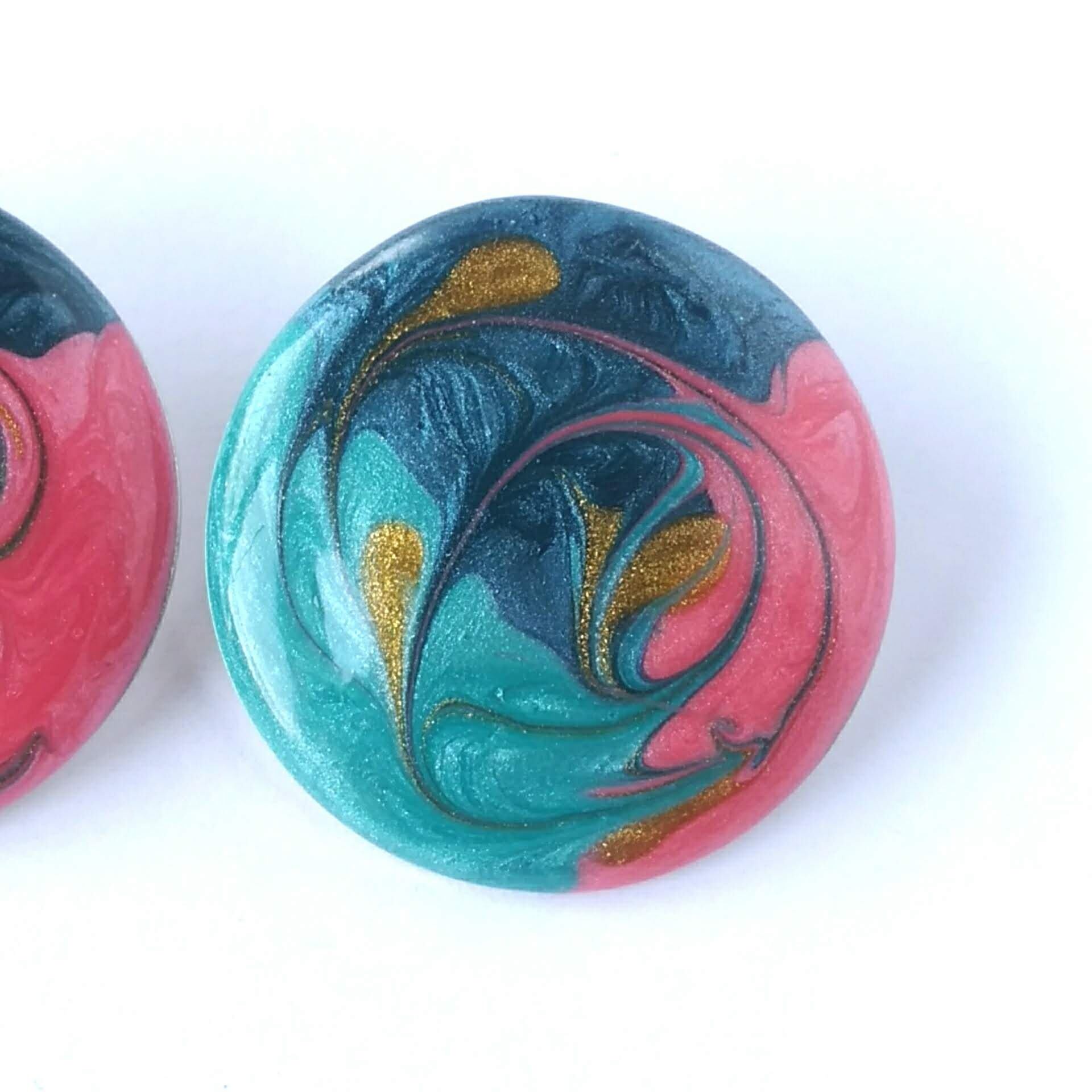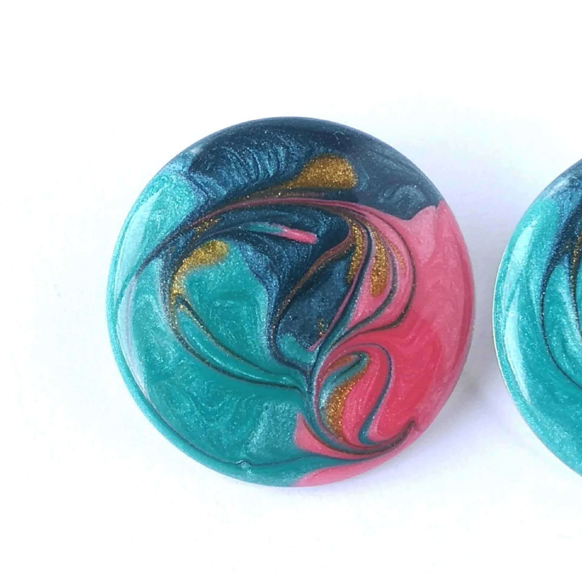 シルバーのラウンドメタルにネイビー、グリーン、ピンクの3色のエナメルを真ん中でスワール状のマーブルを描いたヴィンテージピアスです。