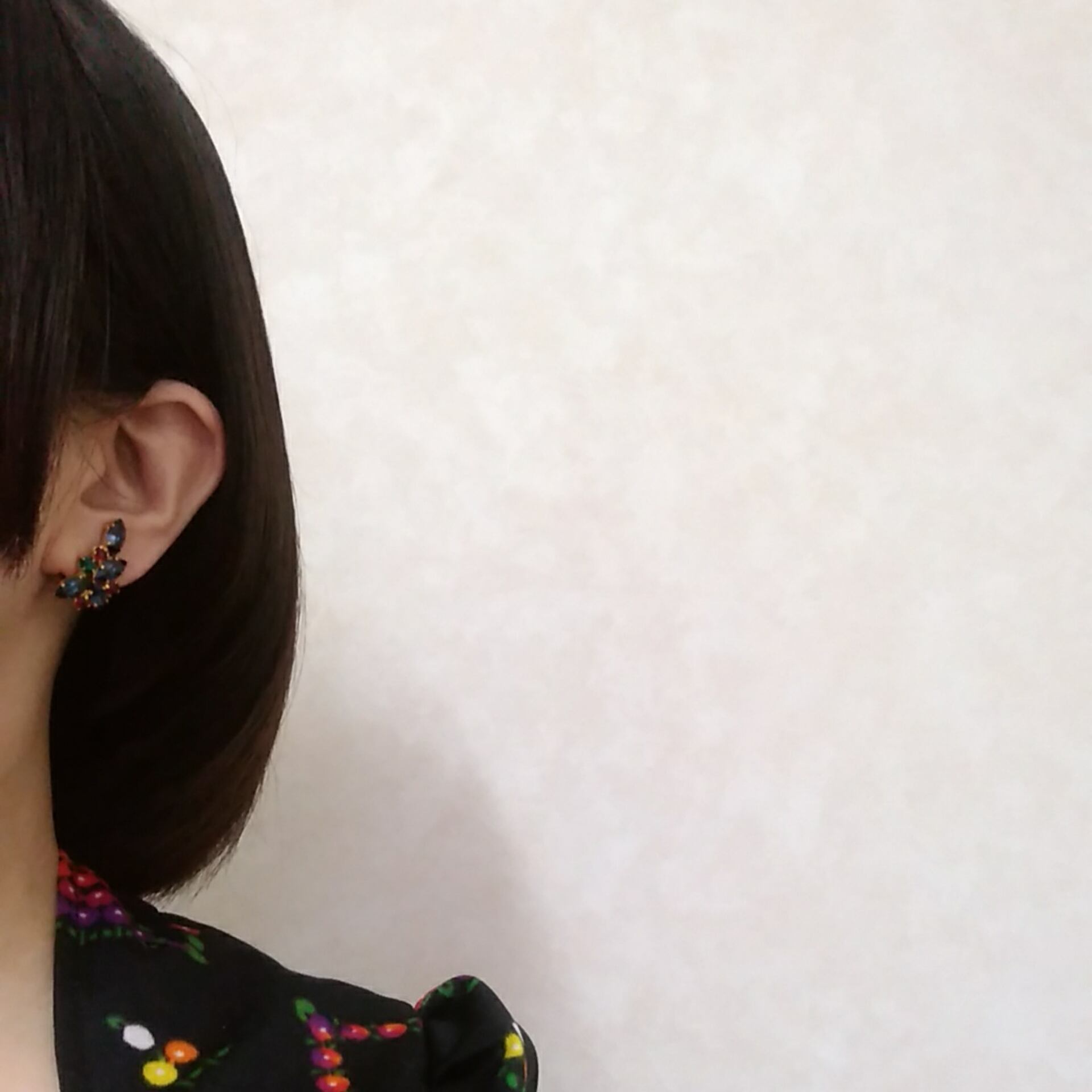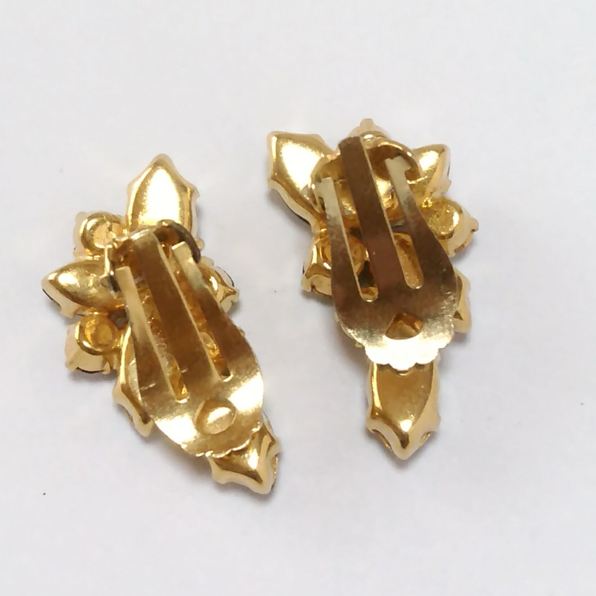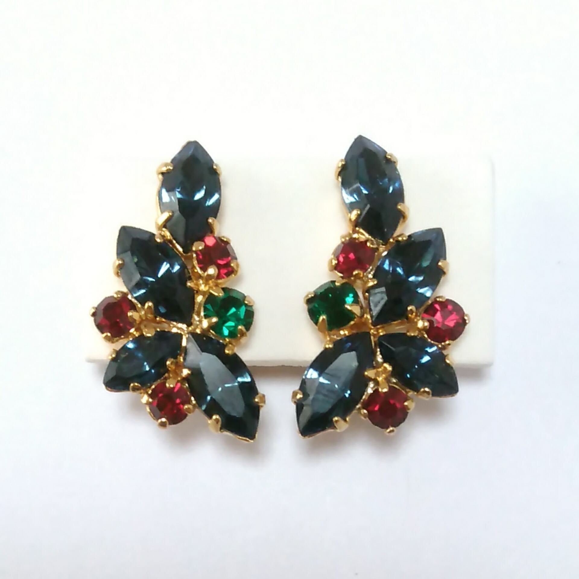 ゴールドのベースメタルにネイビーとレッドとグリーンのラインストーンがセットされたヴィンテージイヤリングです。