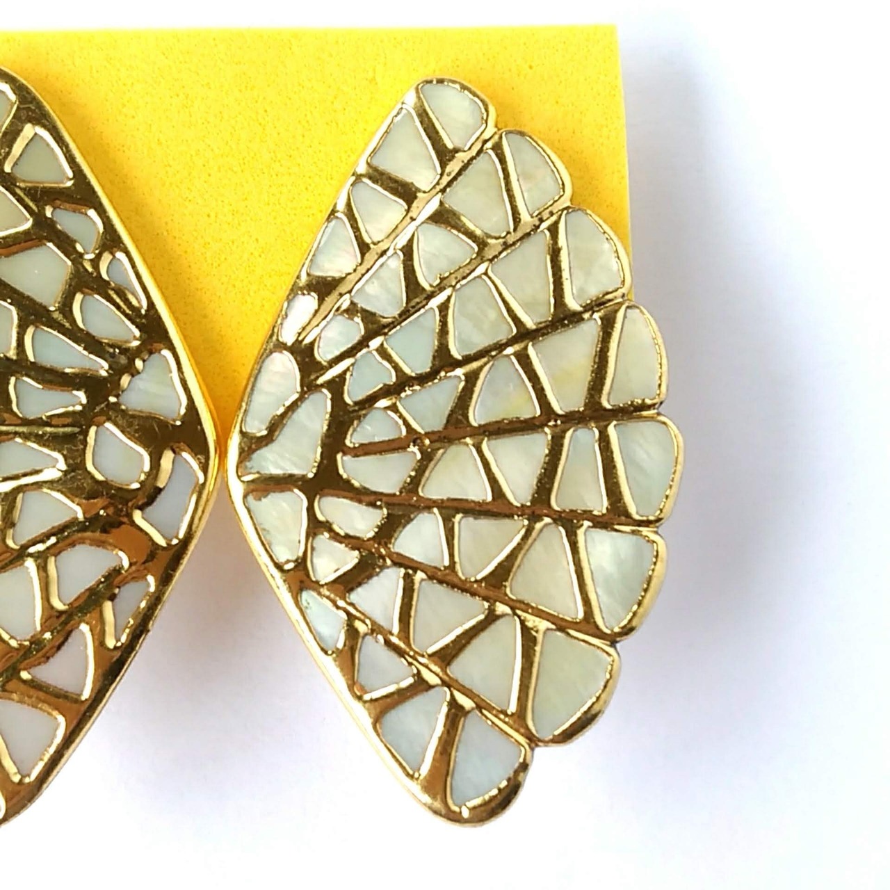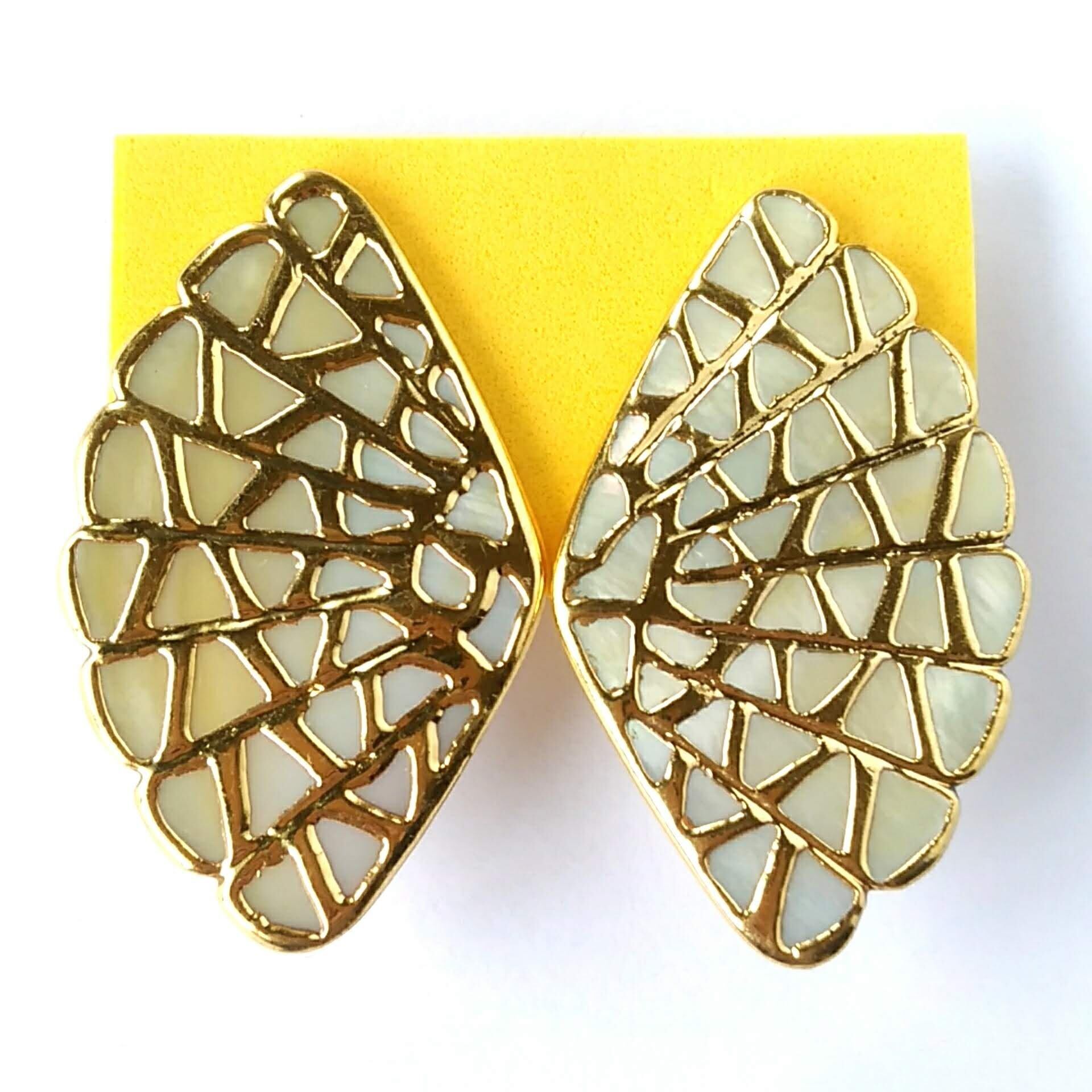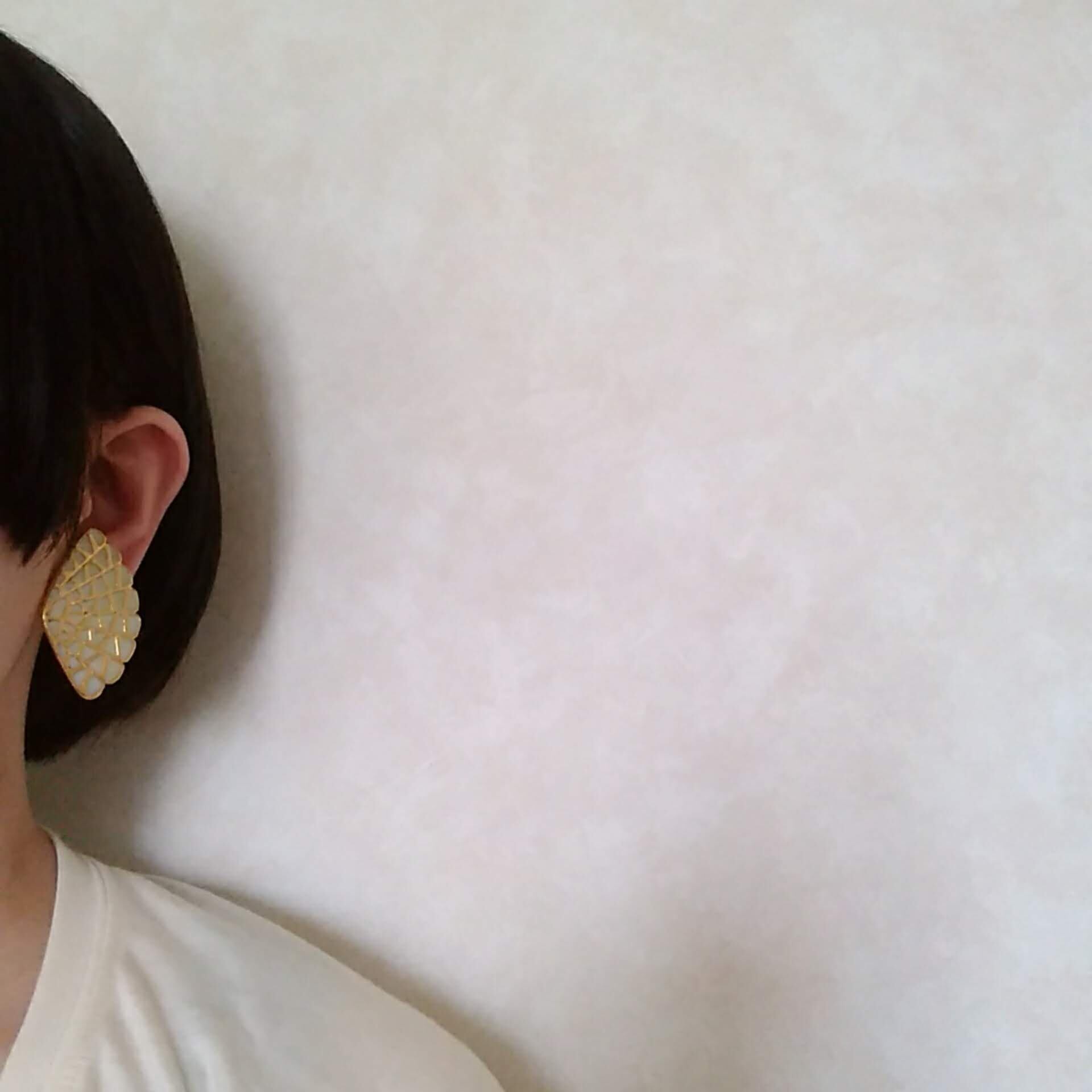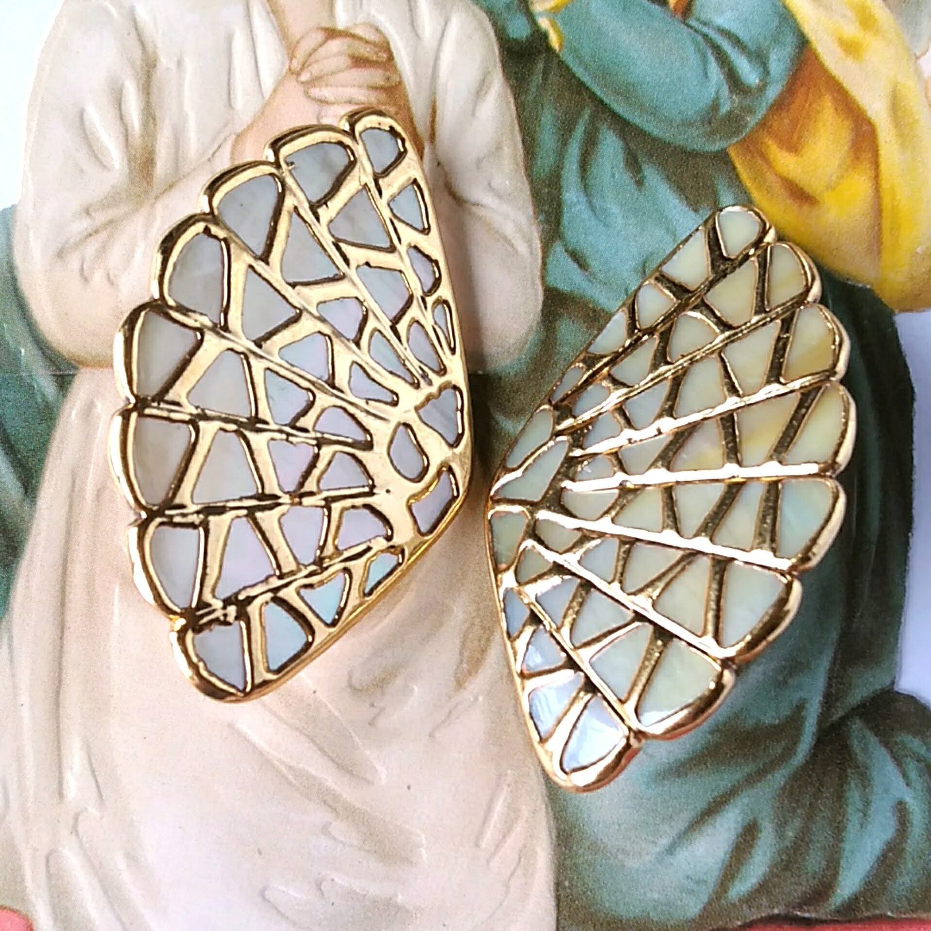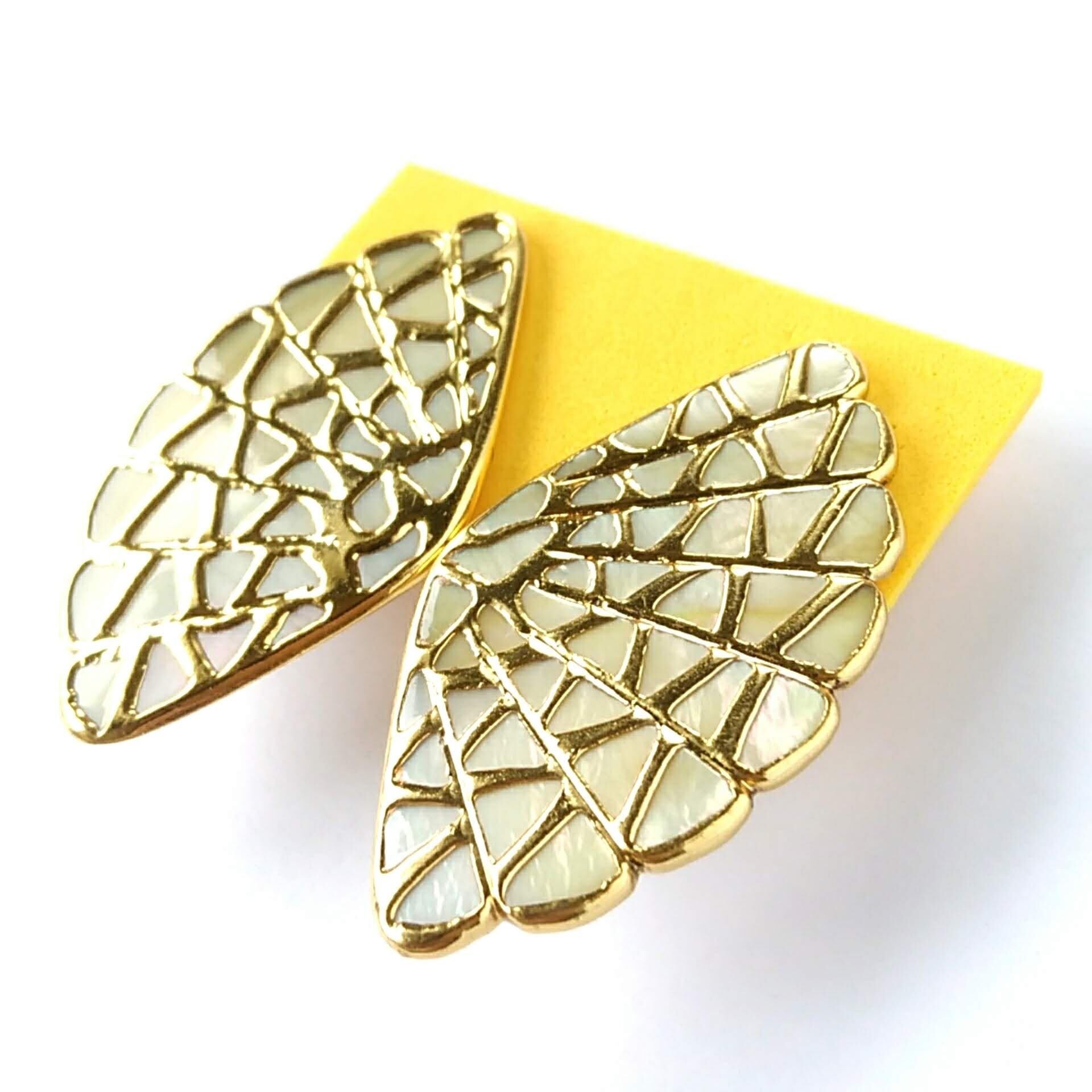 扇形のシェルを囲うゴールドメタルが蝶々の羽根の様にデザインされたヴィンテージイヤリングです。