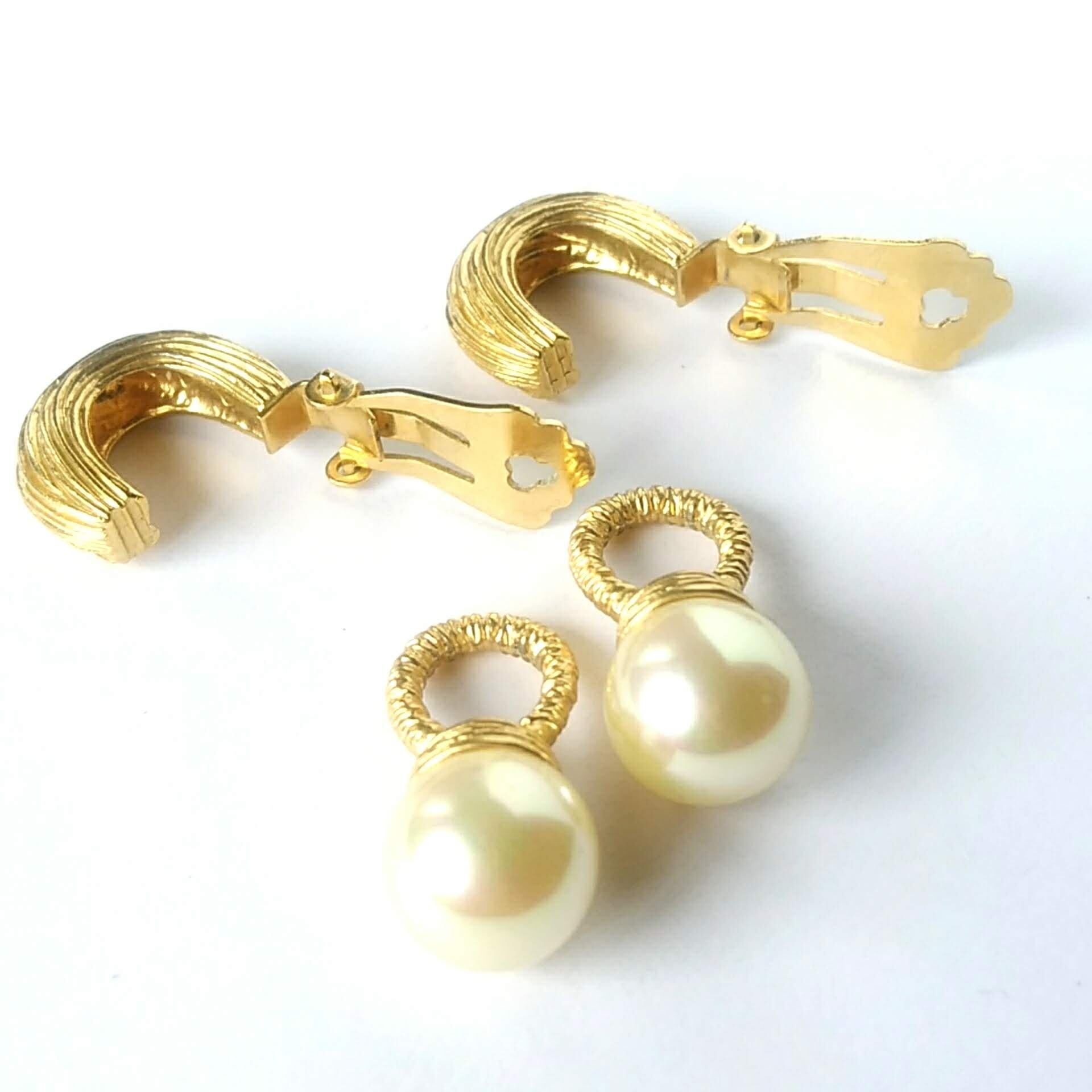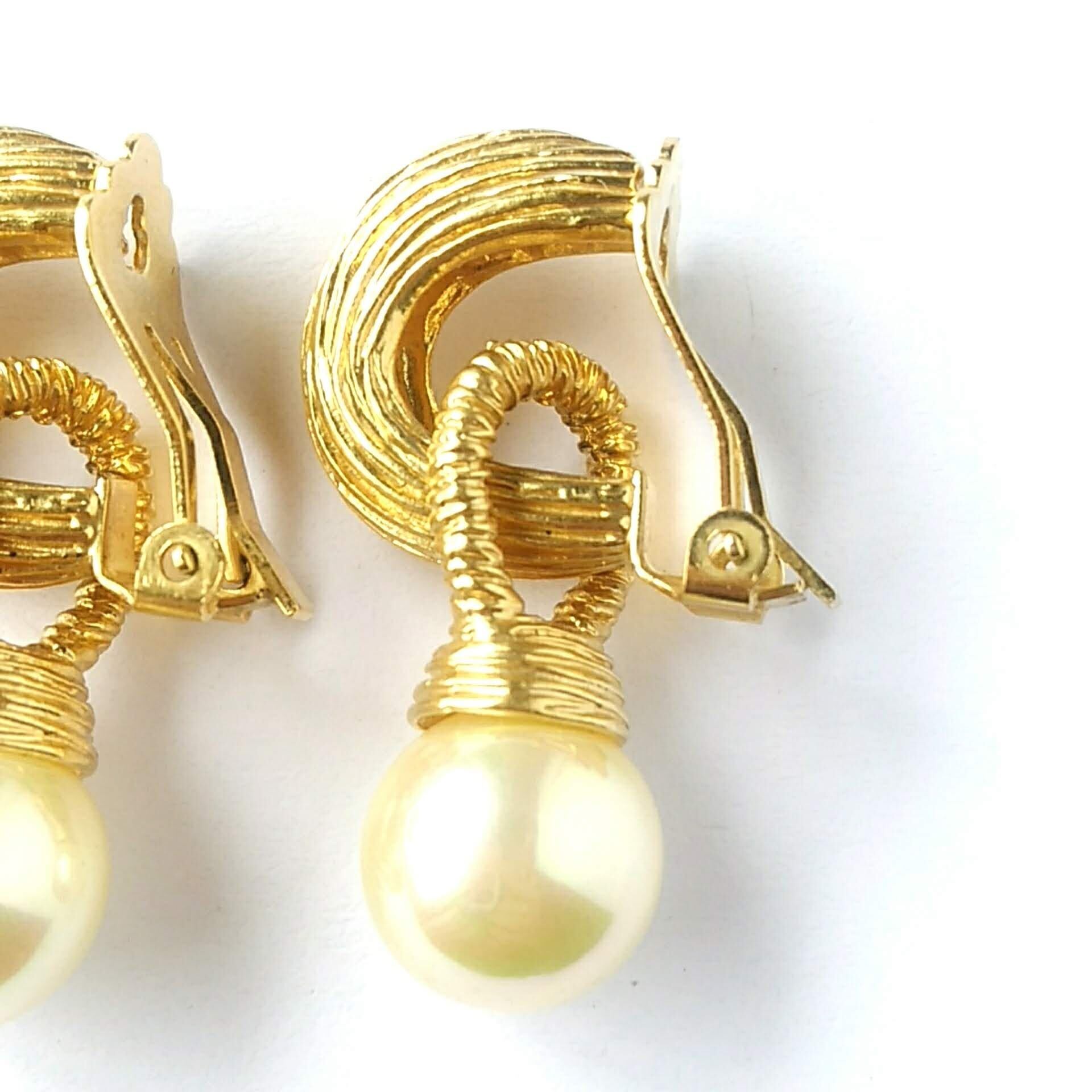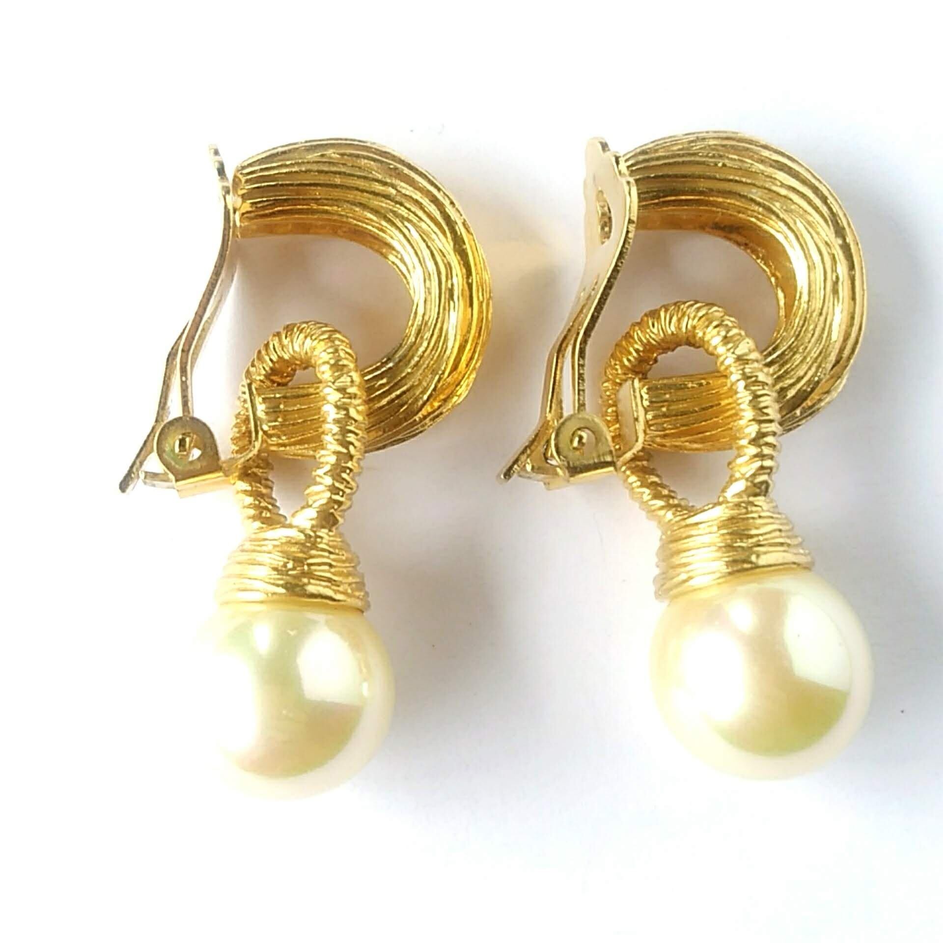 棒状のゴールドメタルを重ねたハーフフープに、フェイクパールが付いたぐるぐると棒状のゴールドメタルが巻かれたモチーフが揺れるデザインのヴィンテージイヤリングです。