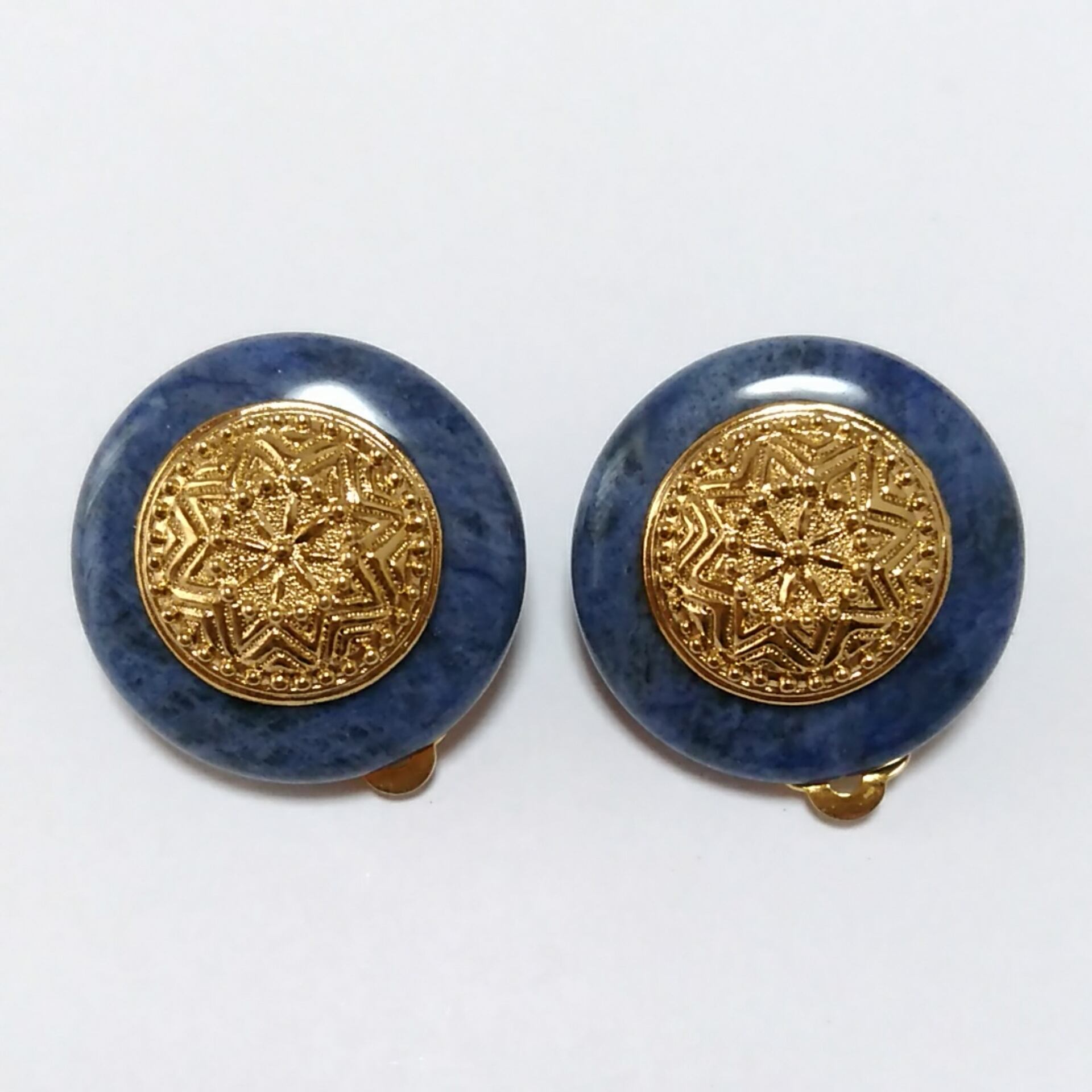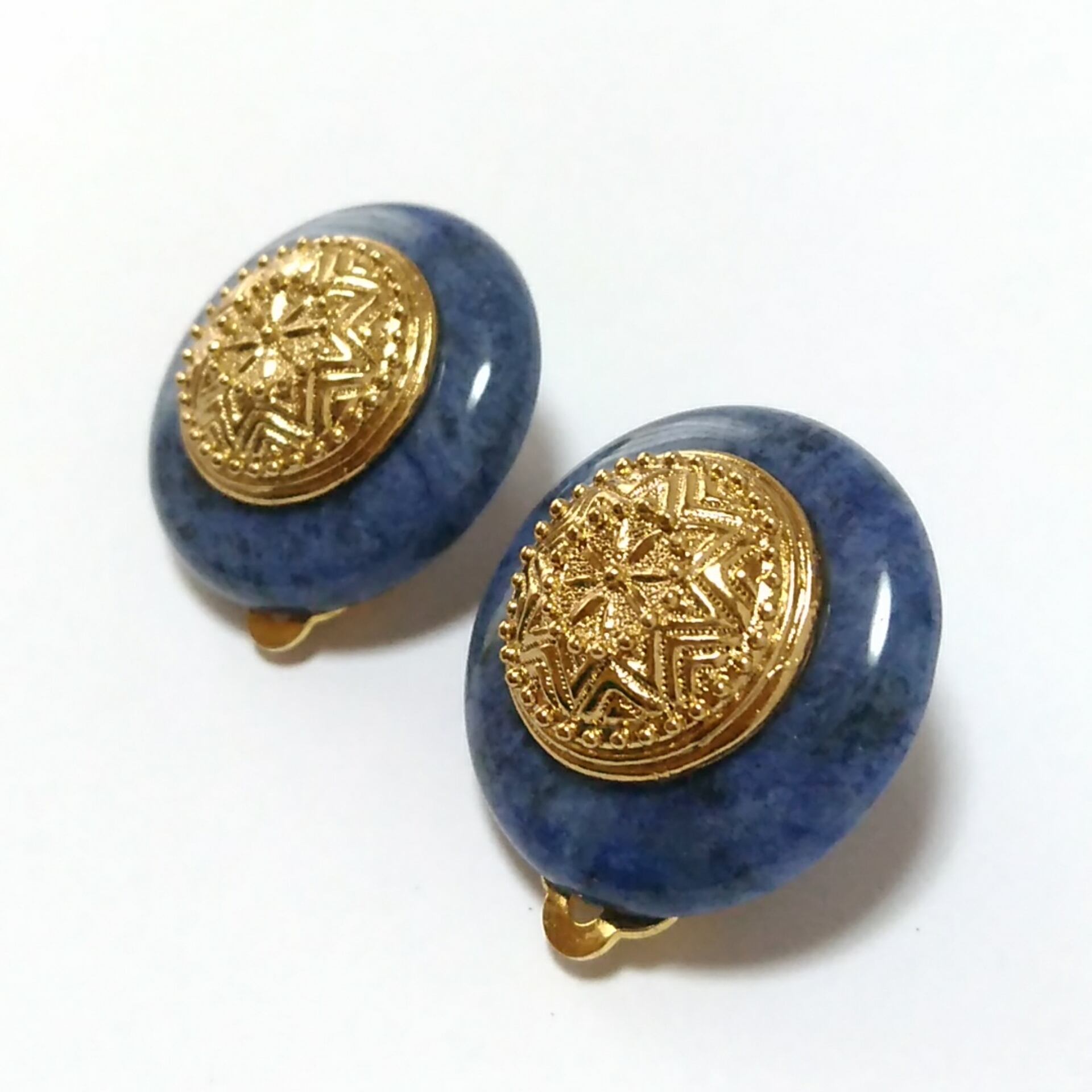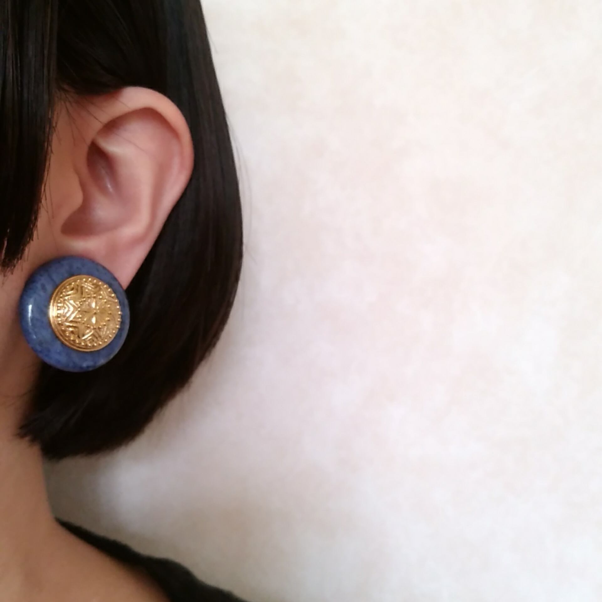 ブラックが混ざったネイビーのガラスのラウンドにオリエンタルな模様のゴールドメタルが付けられたヴィンテージイヤリングです。