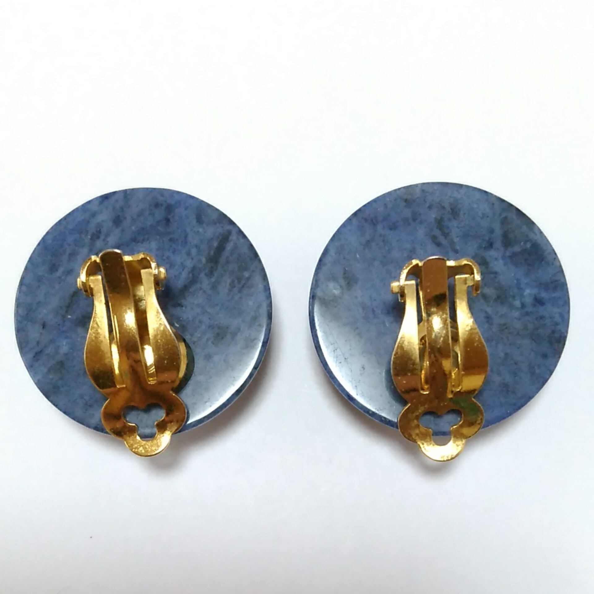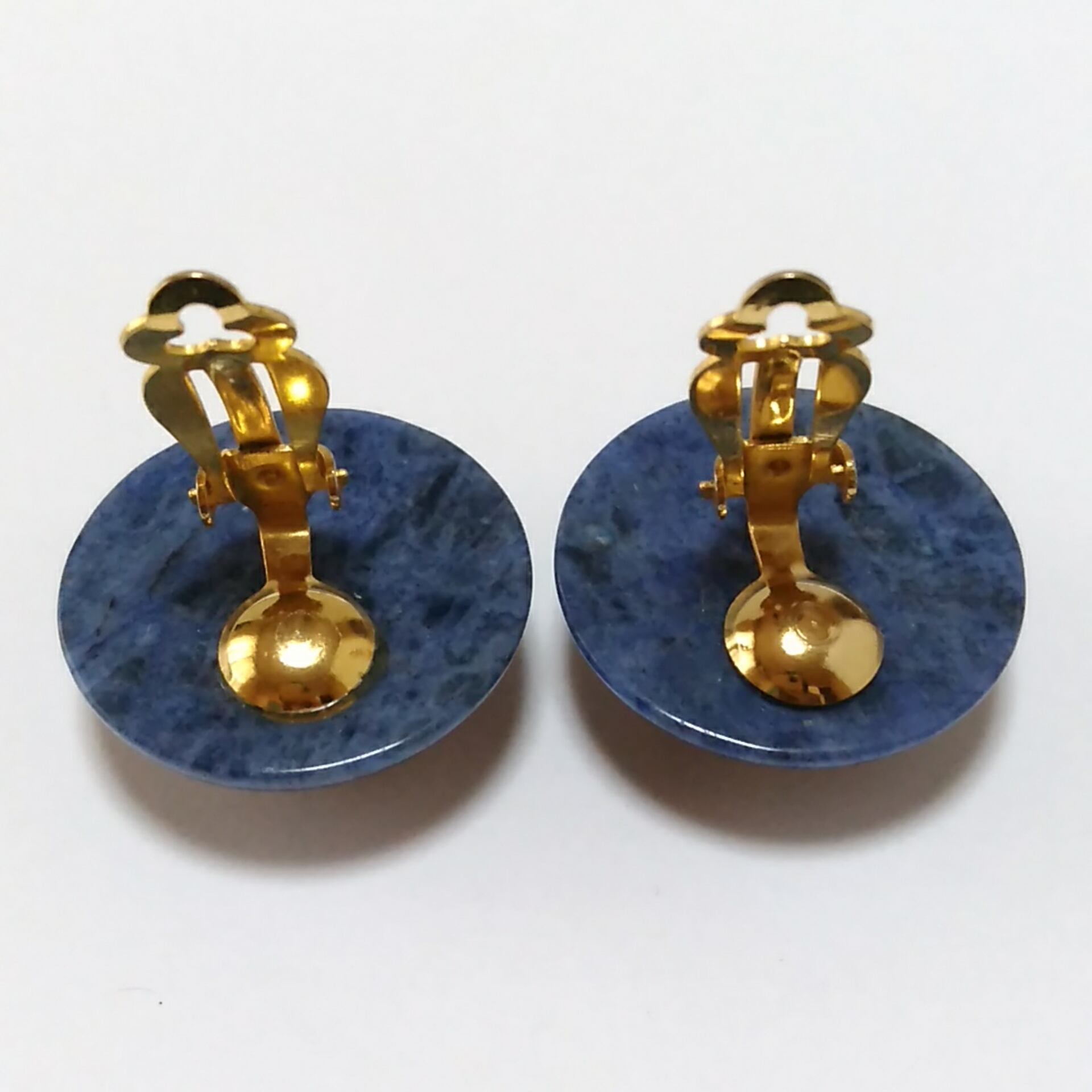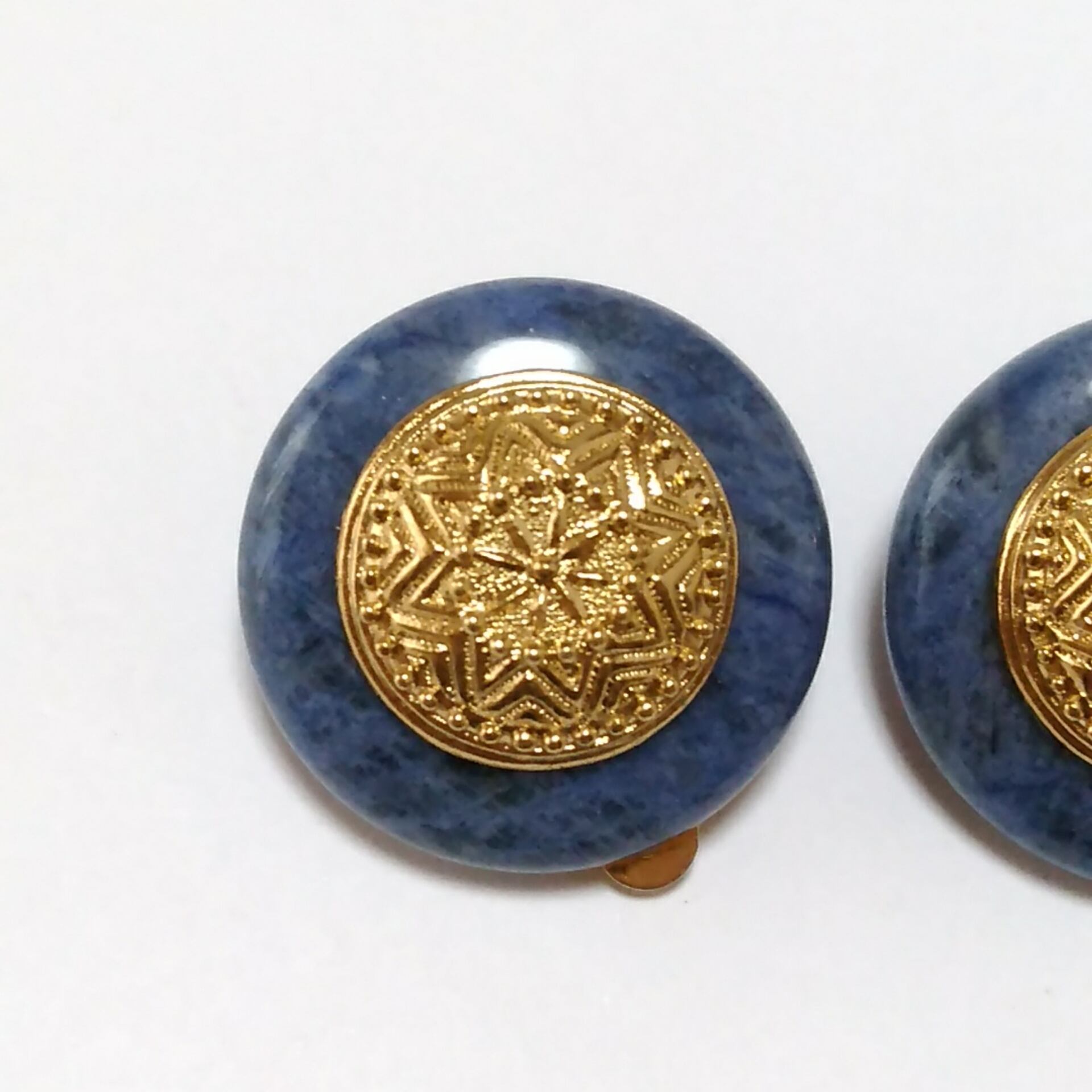 ブラックが混ざったネイビーのガラスのラウンドにオリエンタルな模様のゴールドメタルが付けられたヴィンテージイヤリングです。