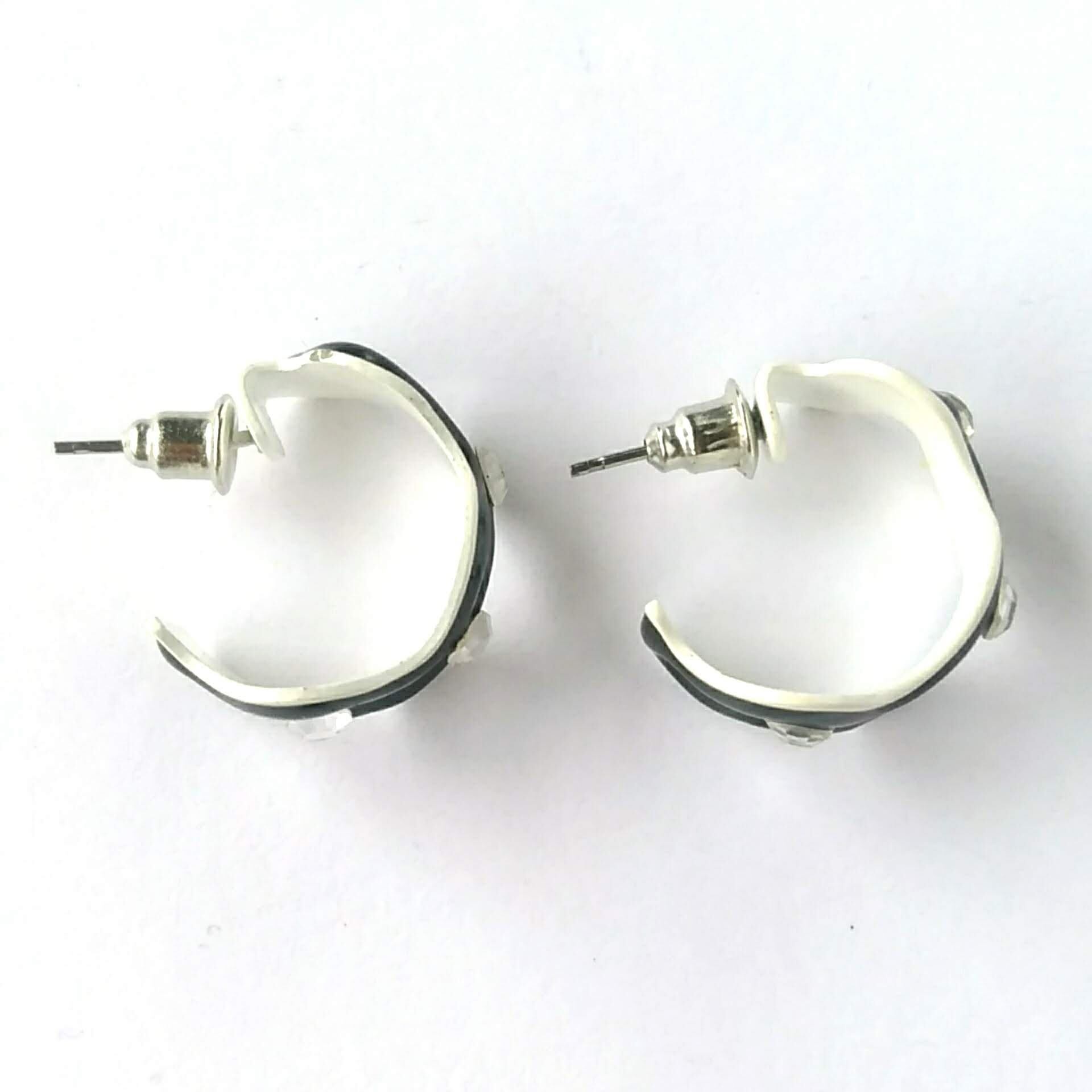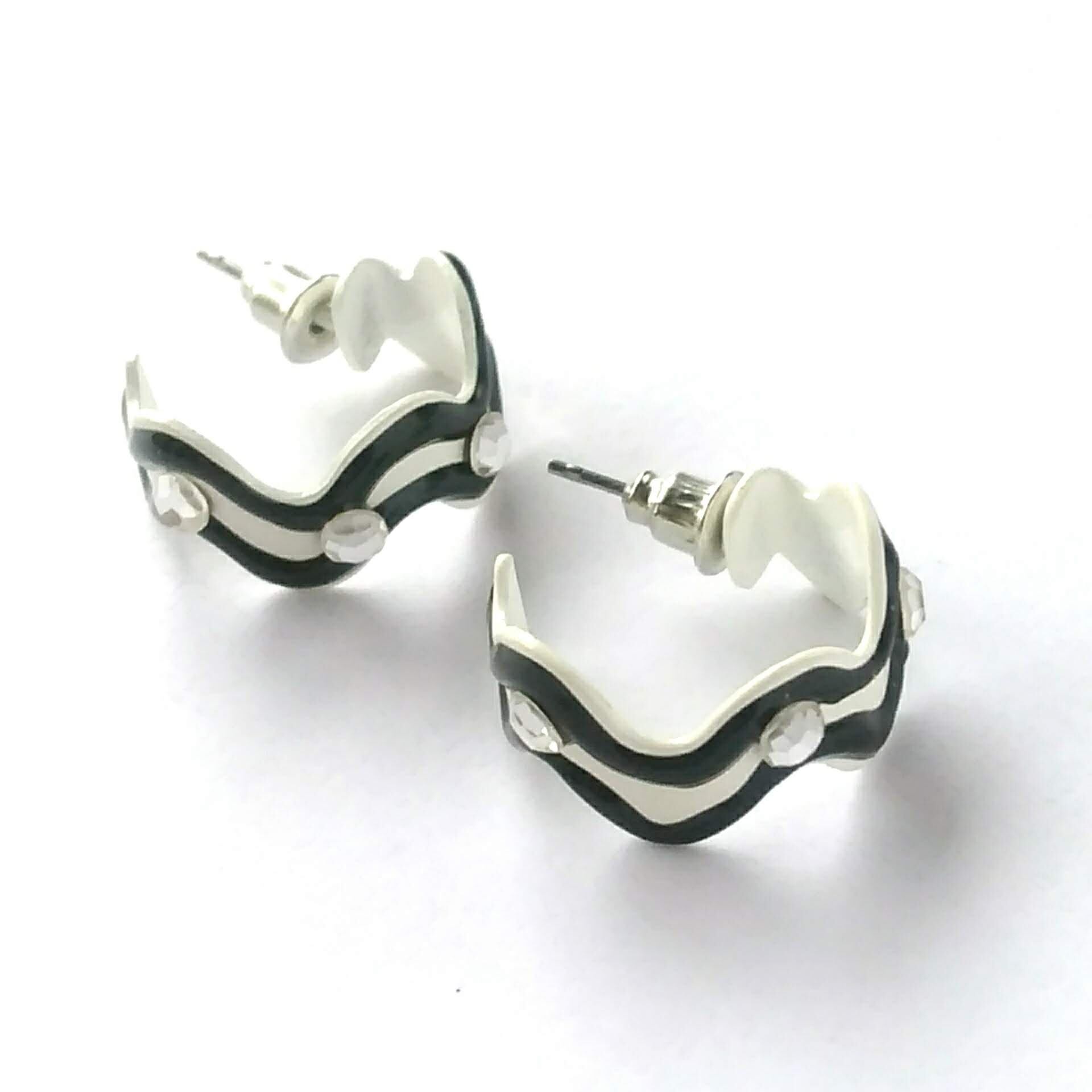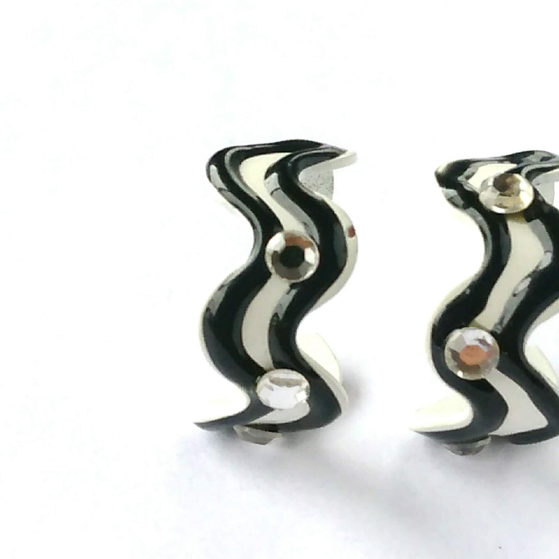 波状のシルバーメタルにホワイトとブラックのエナメルペイントとラインストーンのフープヴィンテージピアスです。