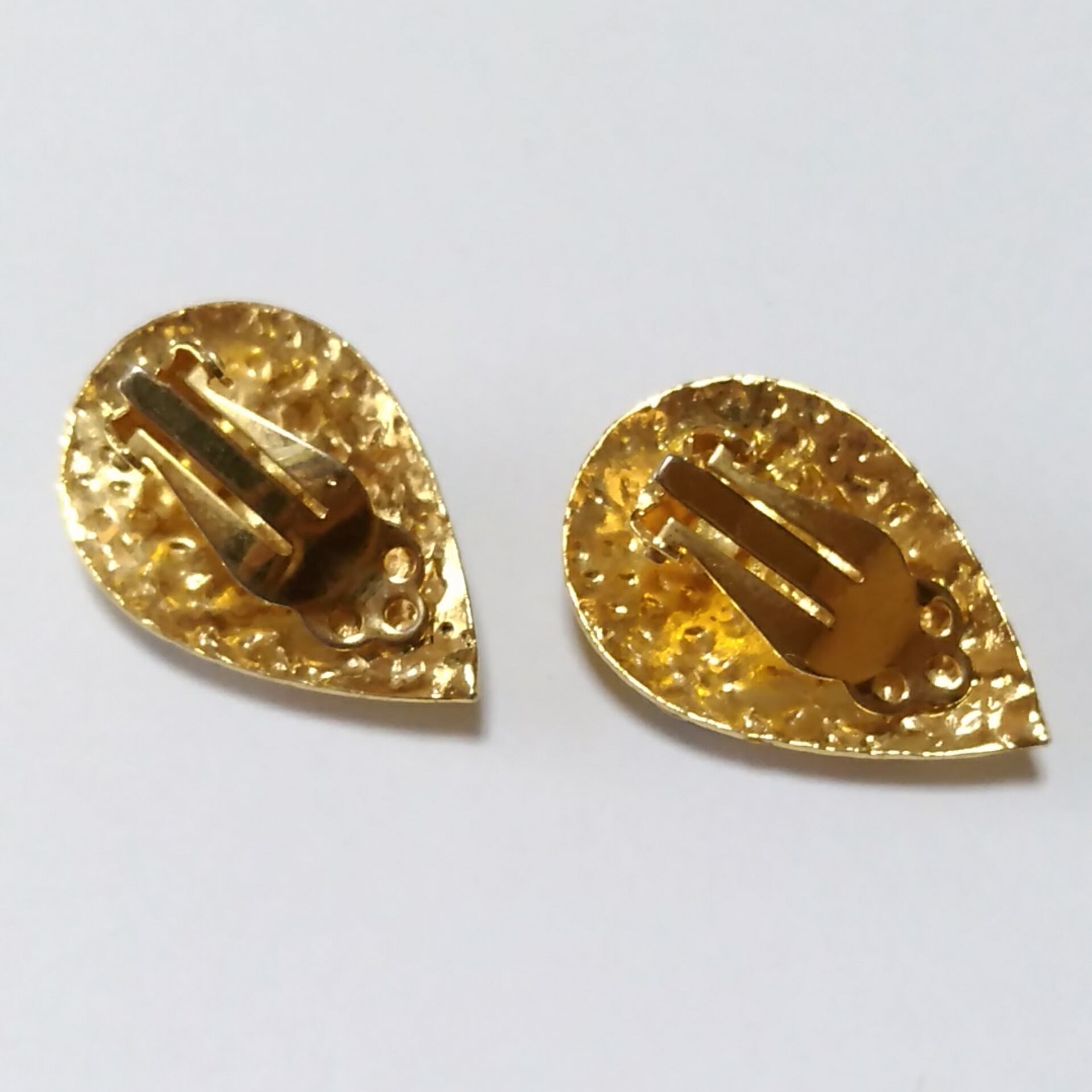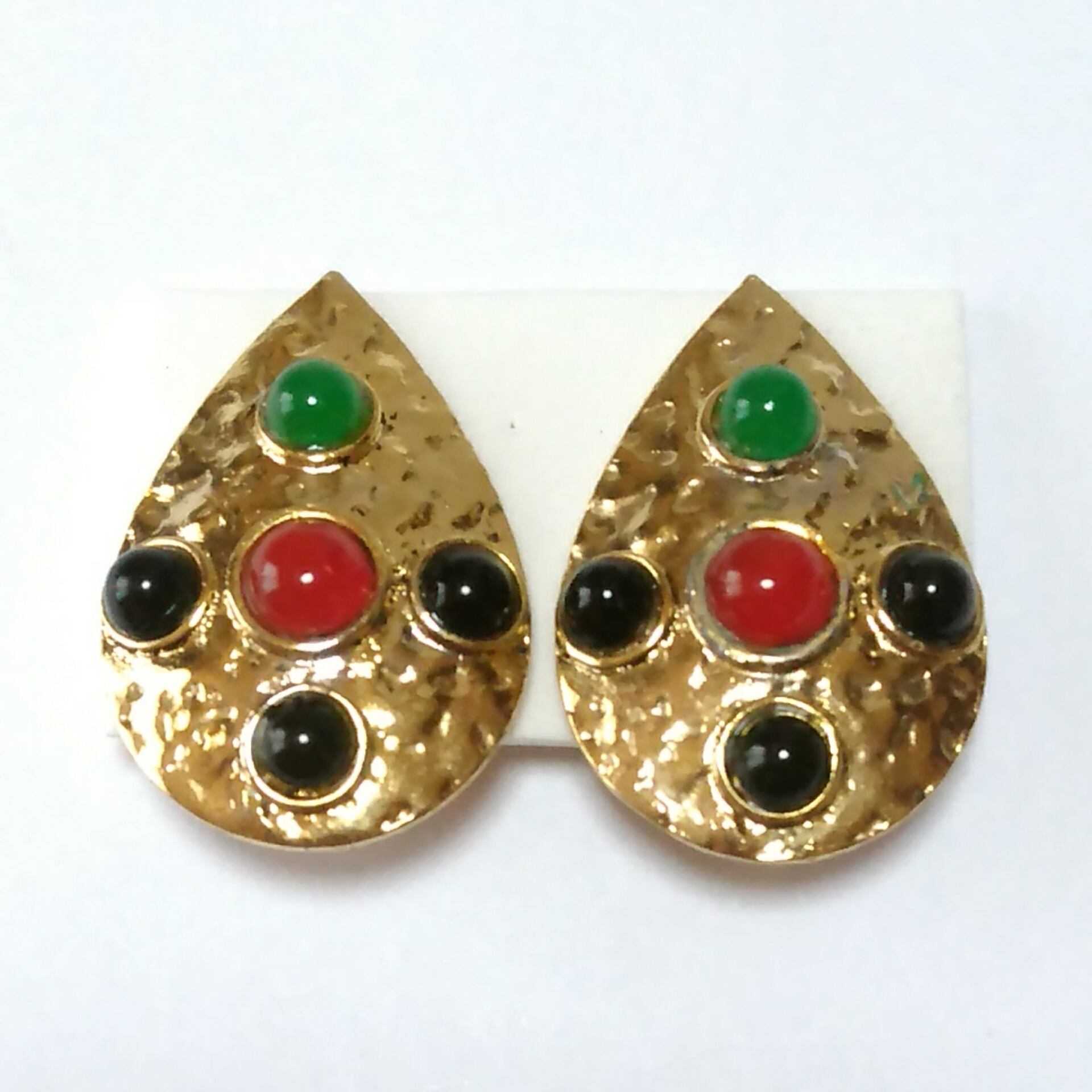 デコボコとした凹凸のあるドロップ型のゴールドメタルにレッド、グリーン、ブラックのカボションが付いたヴィンテージイヤリングです。
