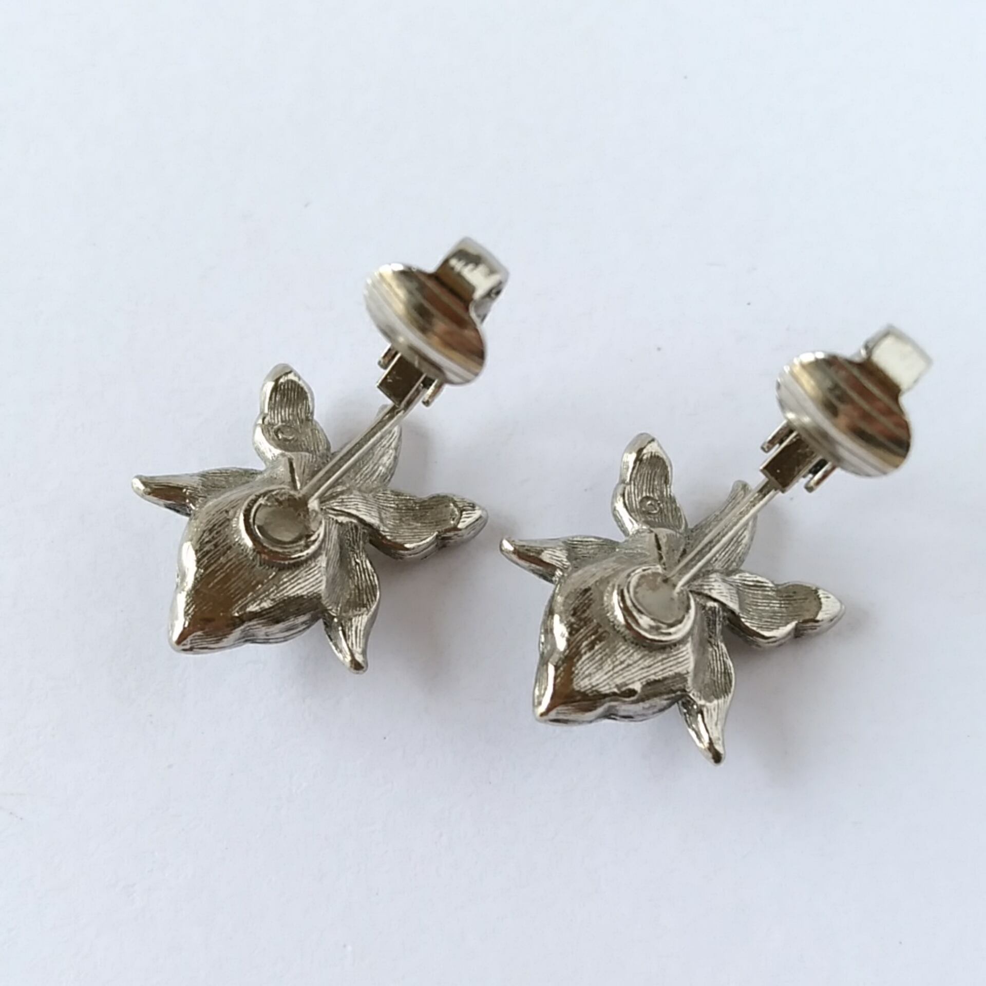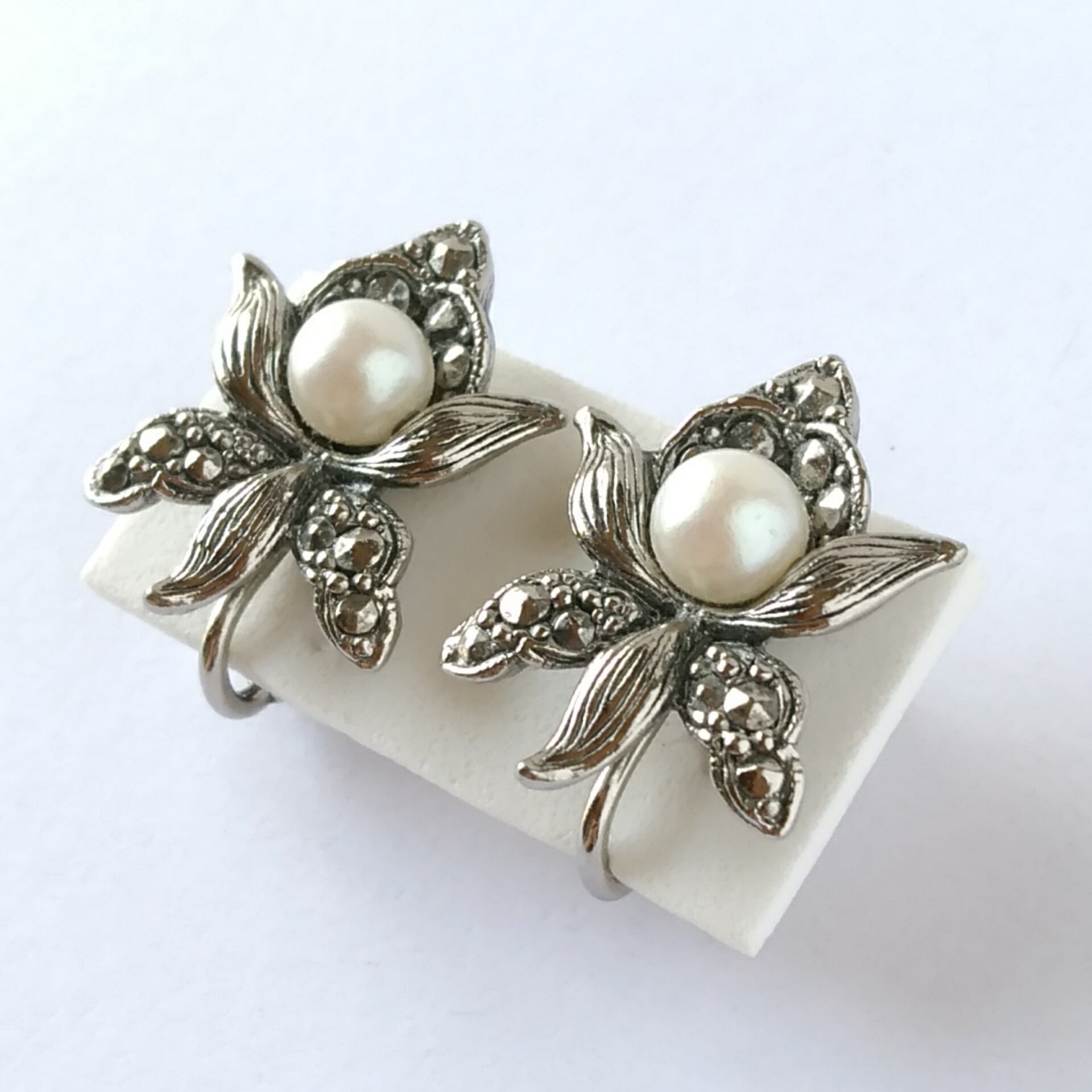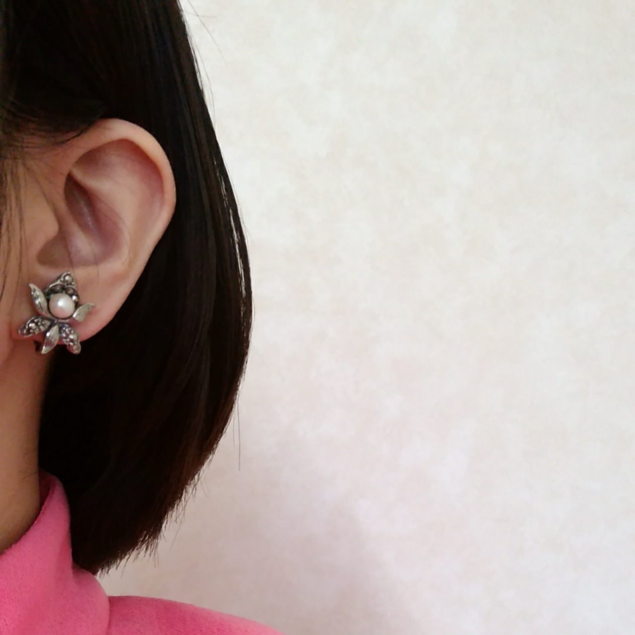 1886年アメリカのニューヨークにて小さな香水会社を創業、1971年に本格的にコスチュームジュエリーの製作を開始したAvon(エイボン)の1992年に販売された洋蘭をイメージしたシルバーメタルにマーカサイトを模したラインストーンとフェイクパールがあしらわれた「Romantic Blossom」のヴィンテージイヤリングです。