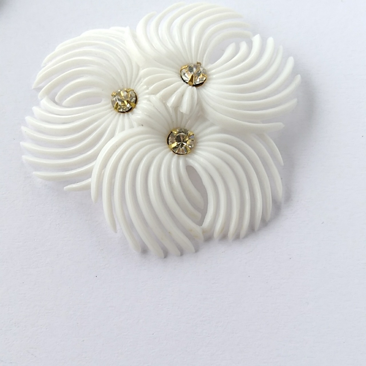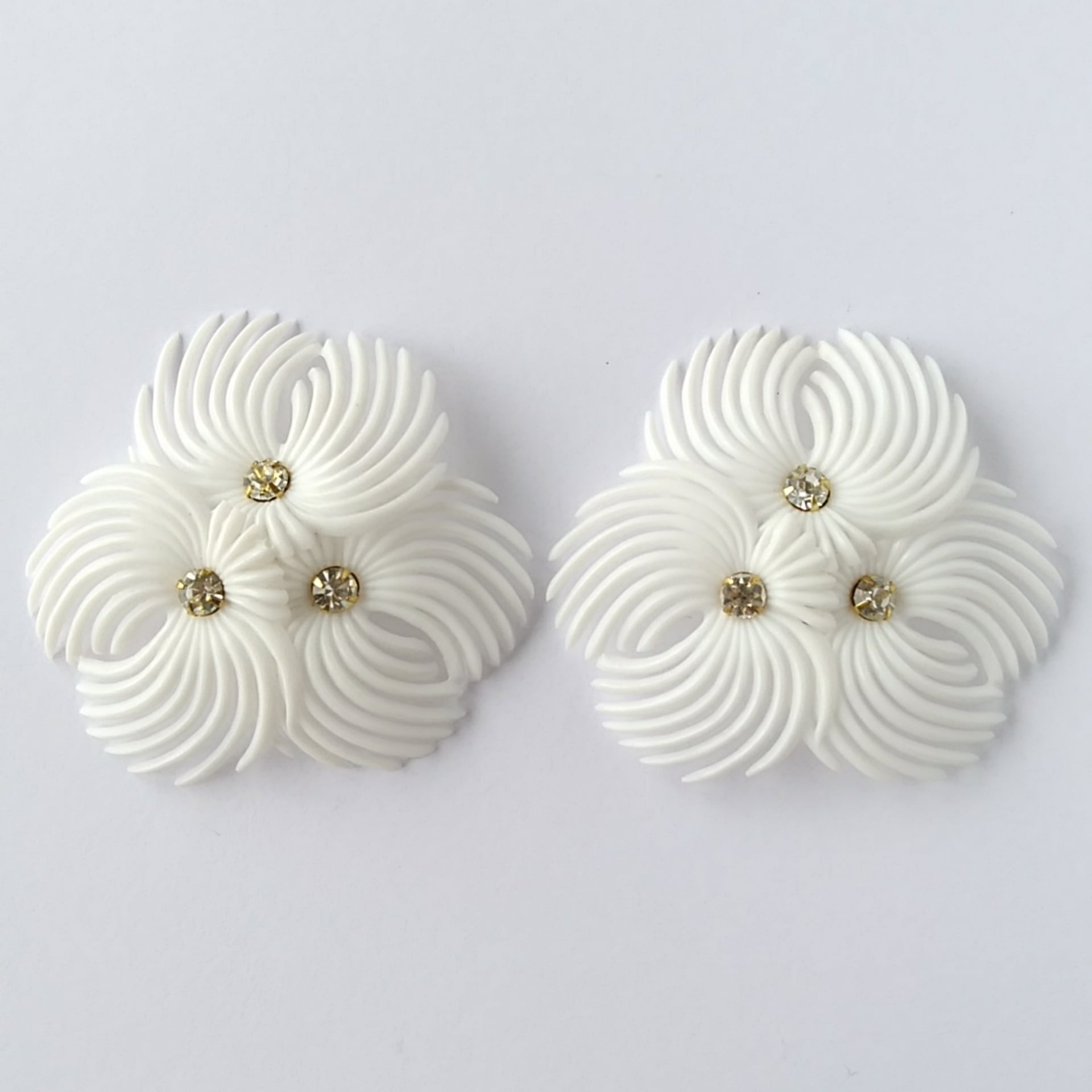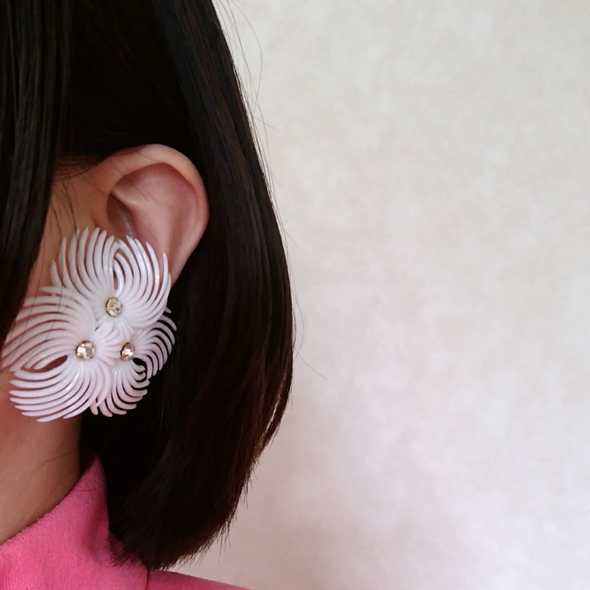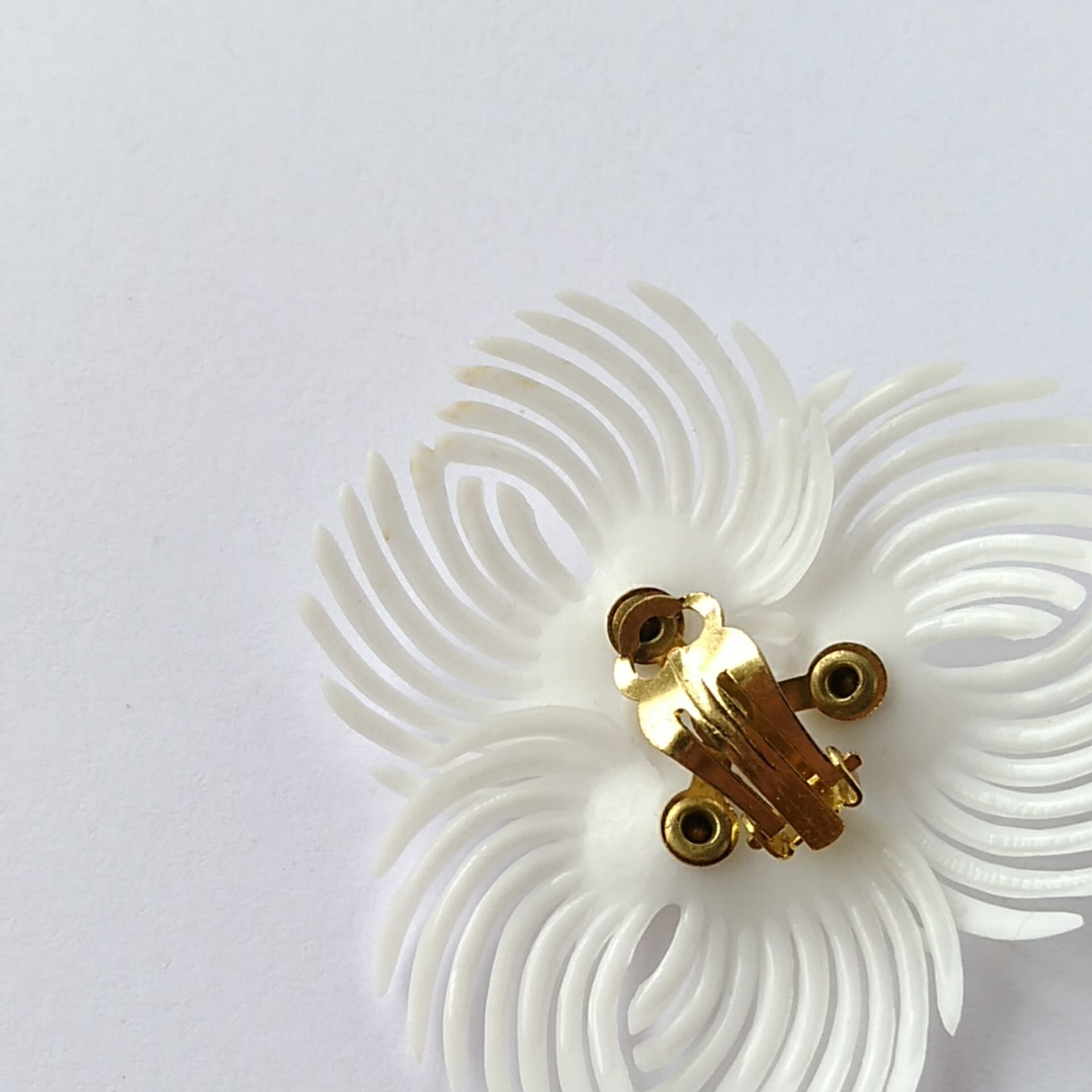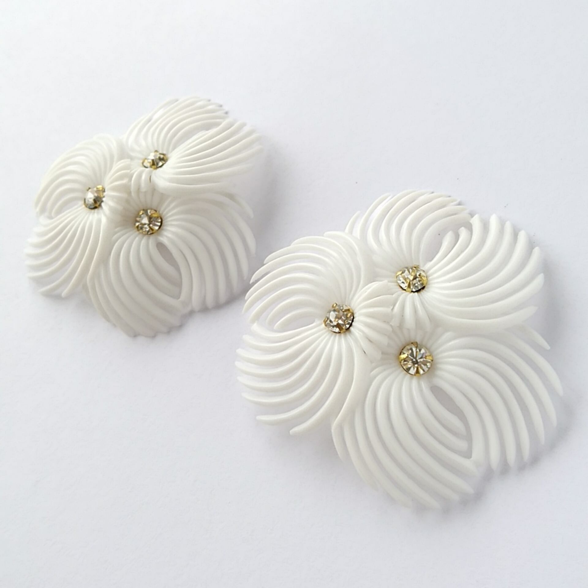 クリアラインストーンがセットされた3つの羽根が円状にデザインされたホワイトのソフトプラスチックのヴィンテージイヤリングです。