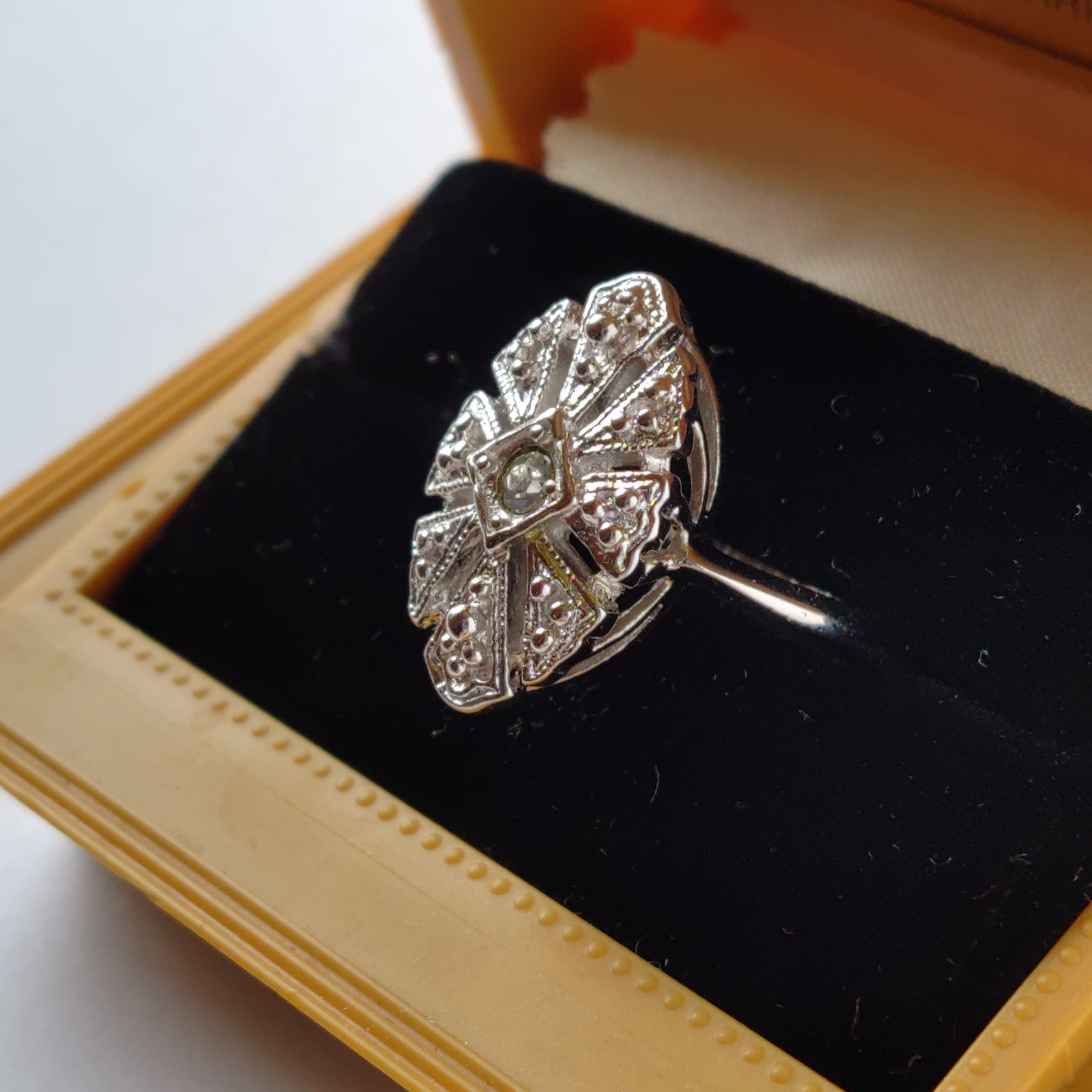 1886年アメリカのニューヨークにて小さな香水会社を創業、1971年に本格的にコスチュームジュエリーの製作を開始したAvon(エイボン)の1980年に販売されたマーカサイトの様なデザインのアーモンド型のシルバーメタルの中央にクリアラインストーンがあしらわれた“Chesterfield Collection”のヴィンテージリングです。