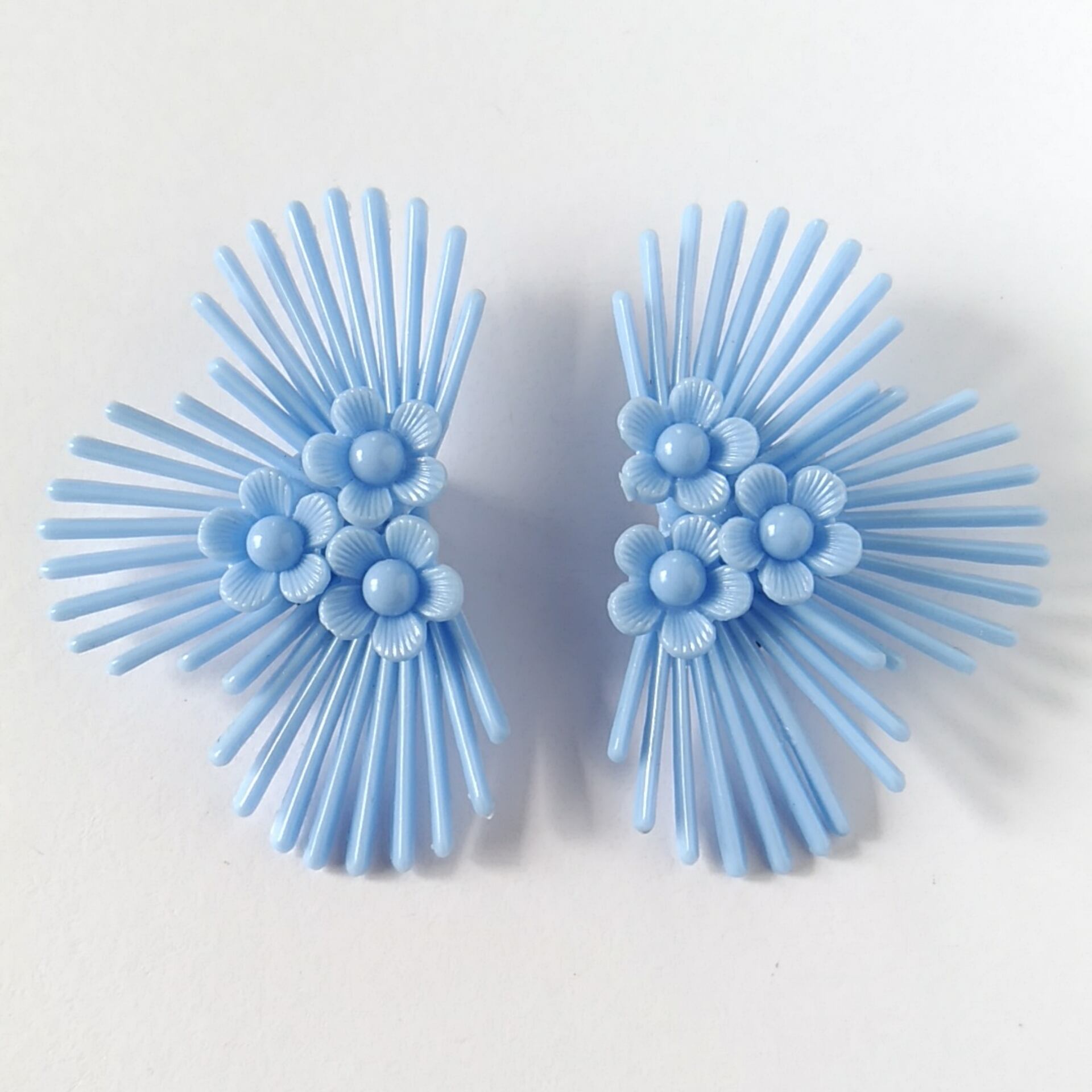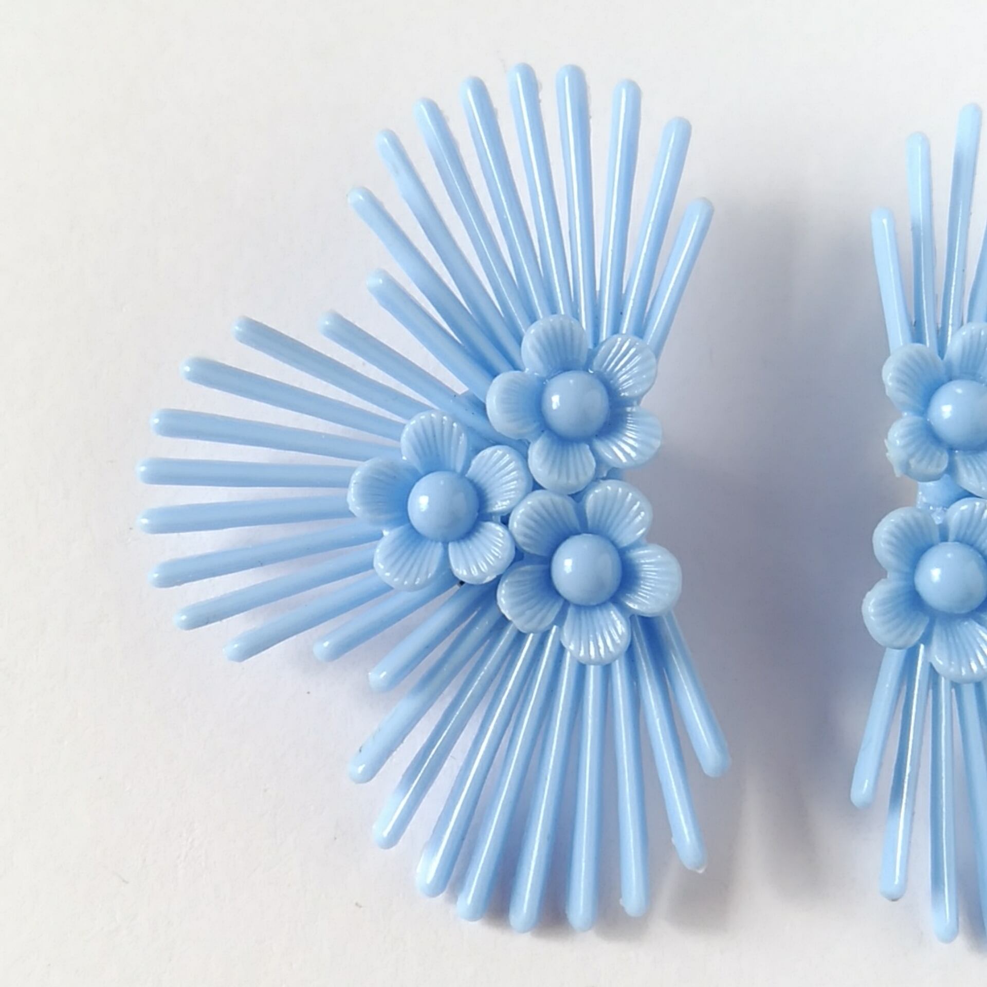 水色の小さな花と松の葉の様な形のモチーフが3つ扇状にデザインされたプラスチックのヴィンテージイヤリングです。