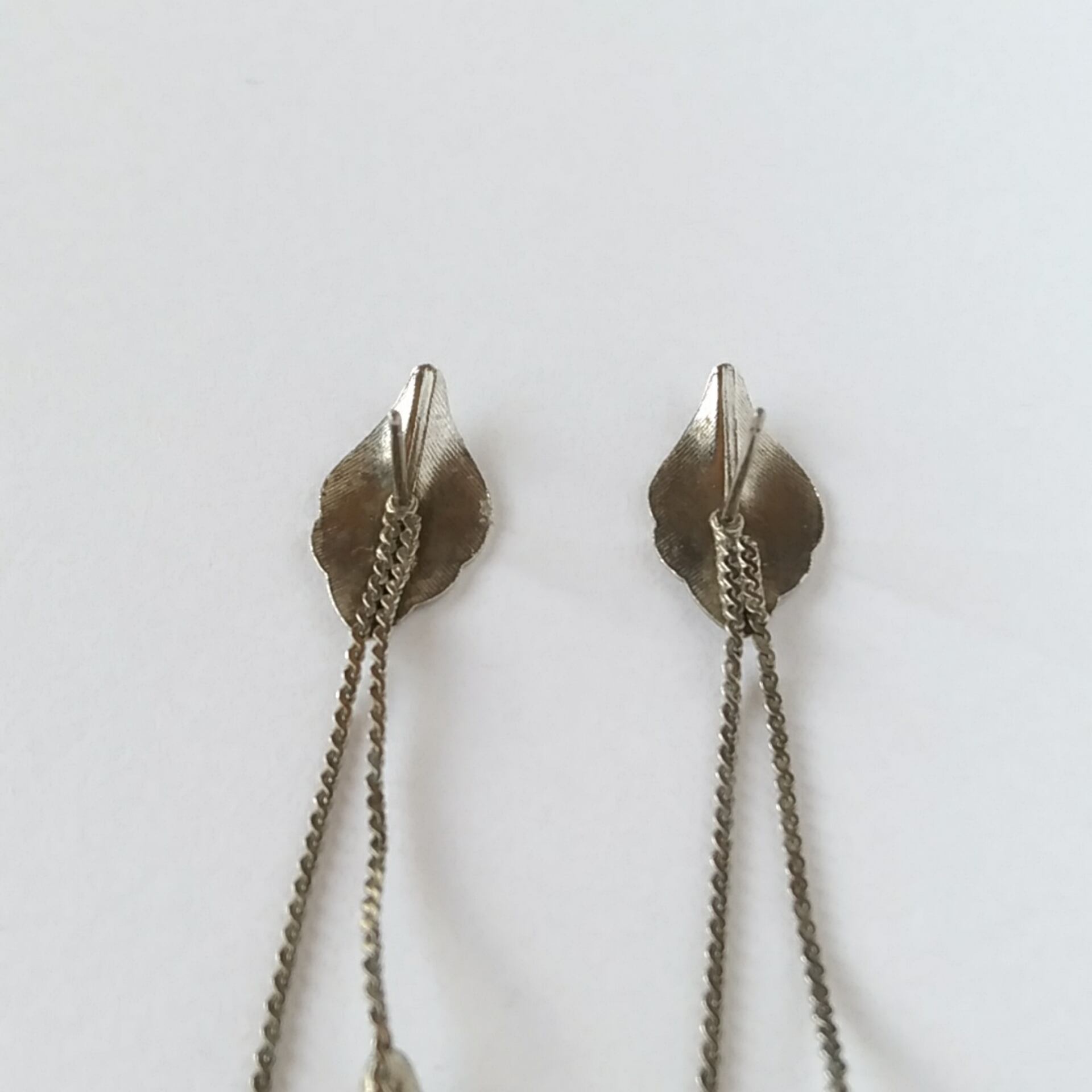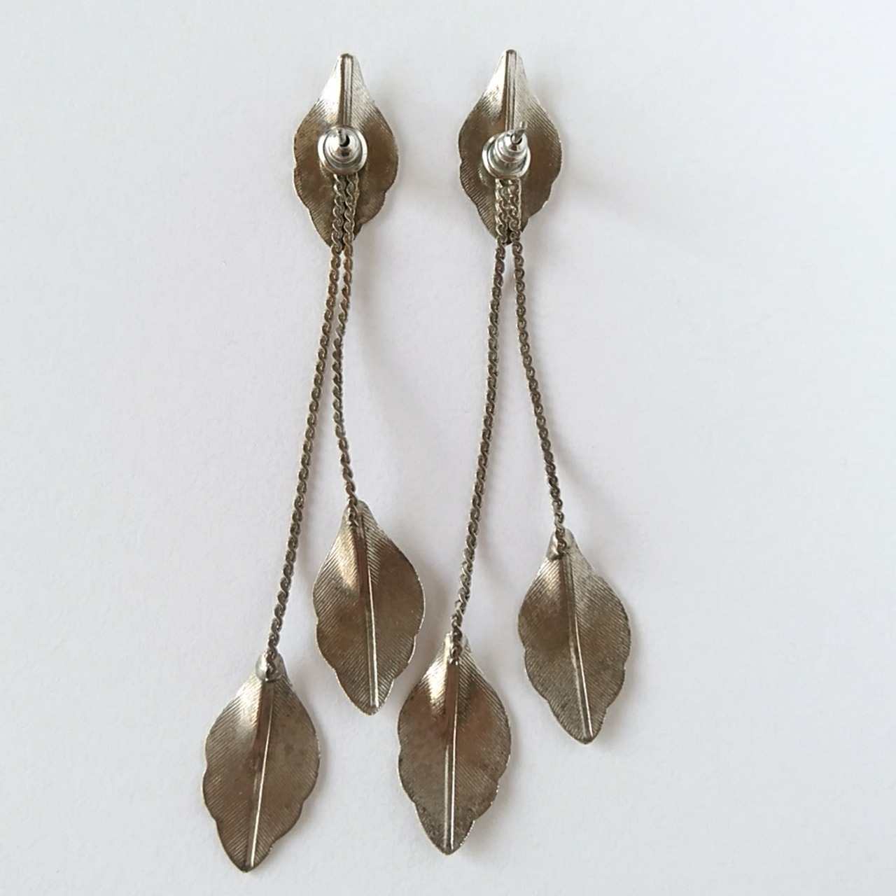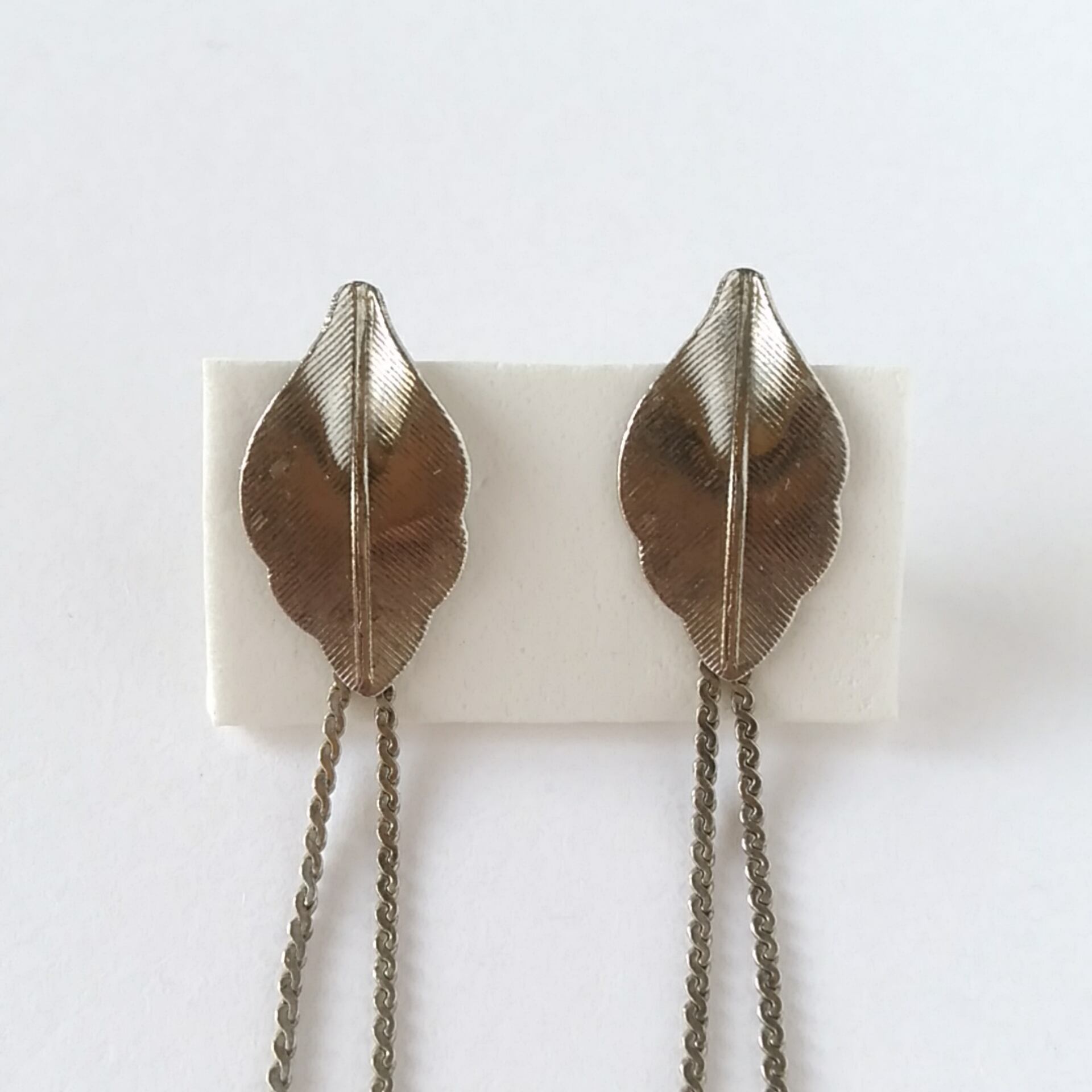 チェーンに繋がったシルバーメタルのリーフが揺れるデザインのヴィンテージピアスです。