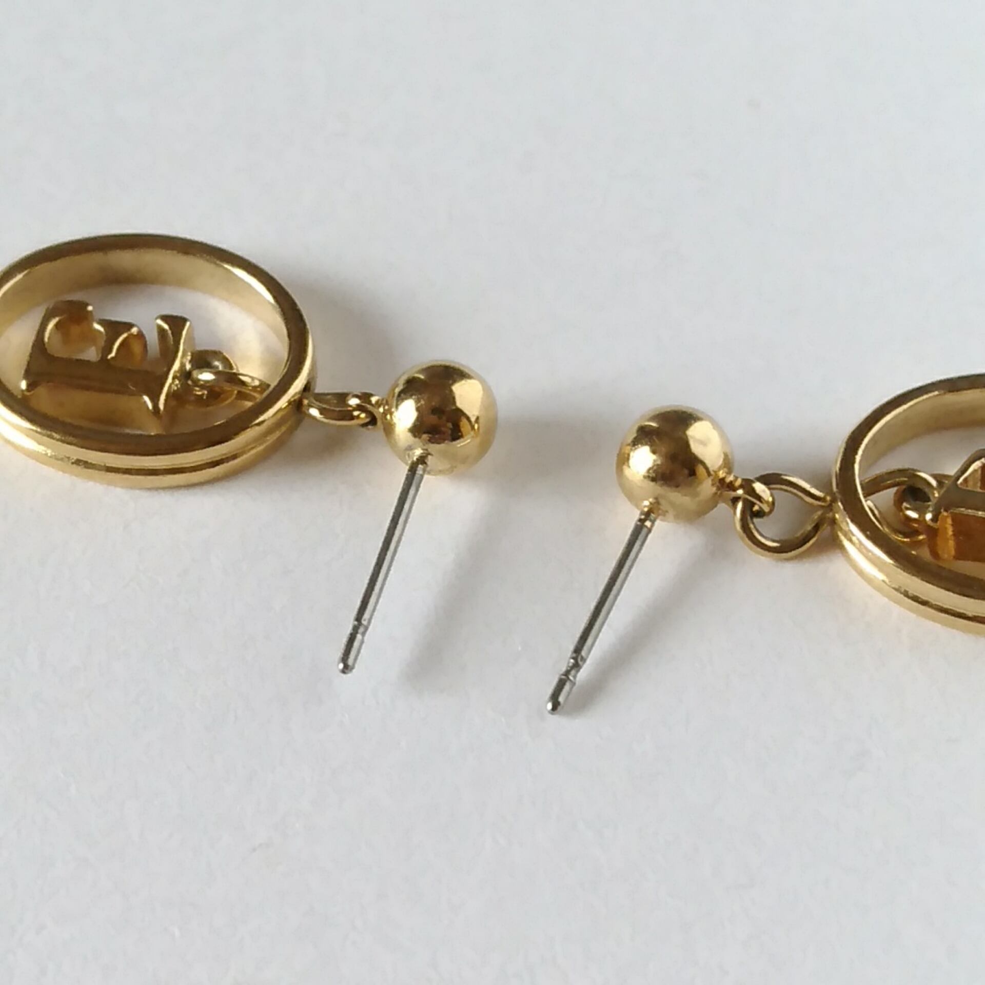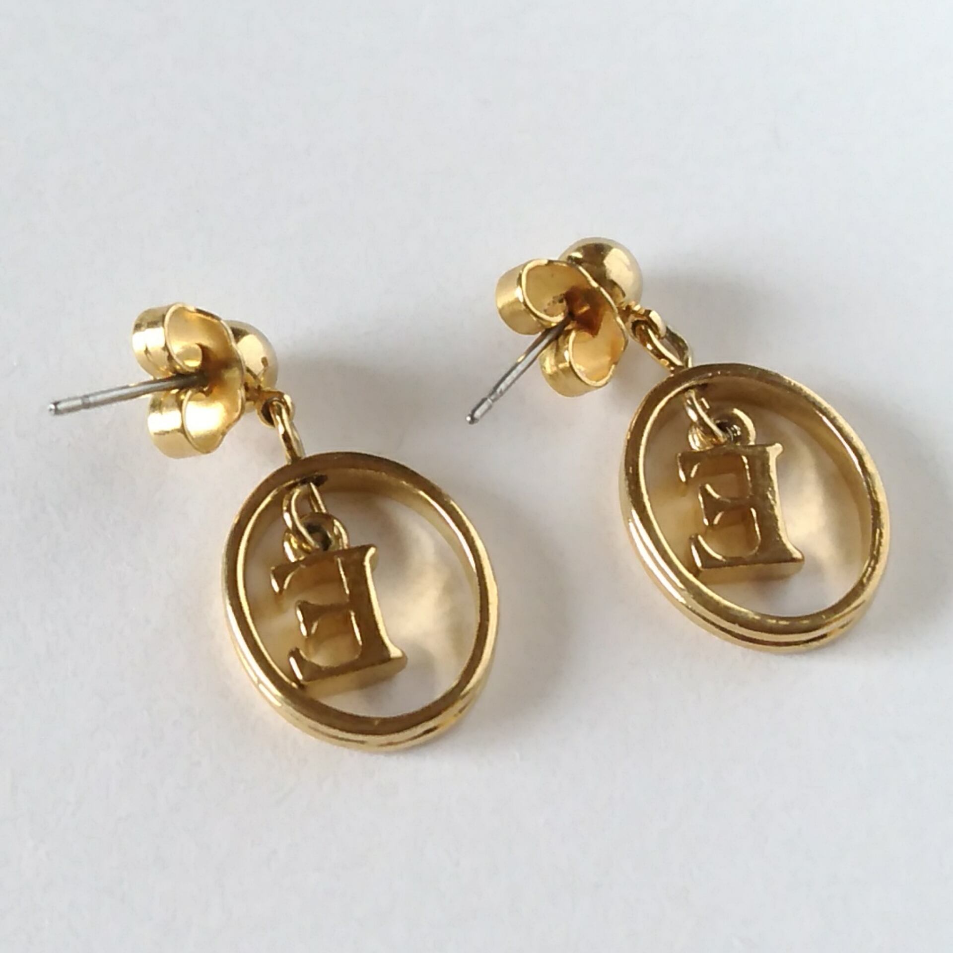 1886年アメリカのニューヨークにて小さな香水会社を創業、1971年に本格的にコスチュームジュエリーの製作を開始したAvon(エイボン)の1990年に販売されたゴールドメタルの輪の中央でアルファベットの「E」が揺れるデザインの“initial style”のヴィンテージピアスです。