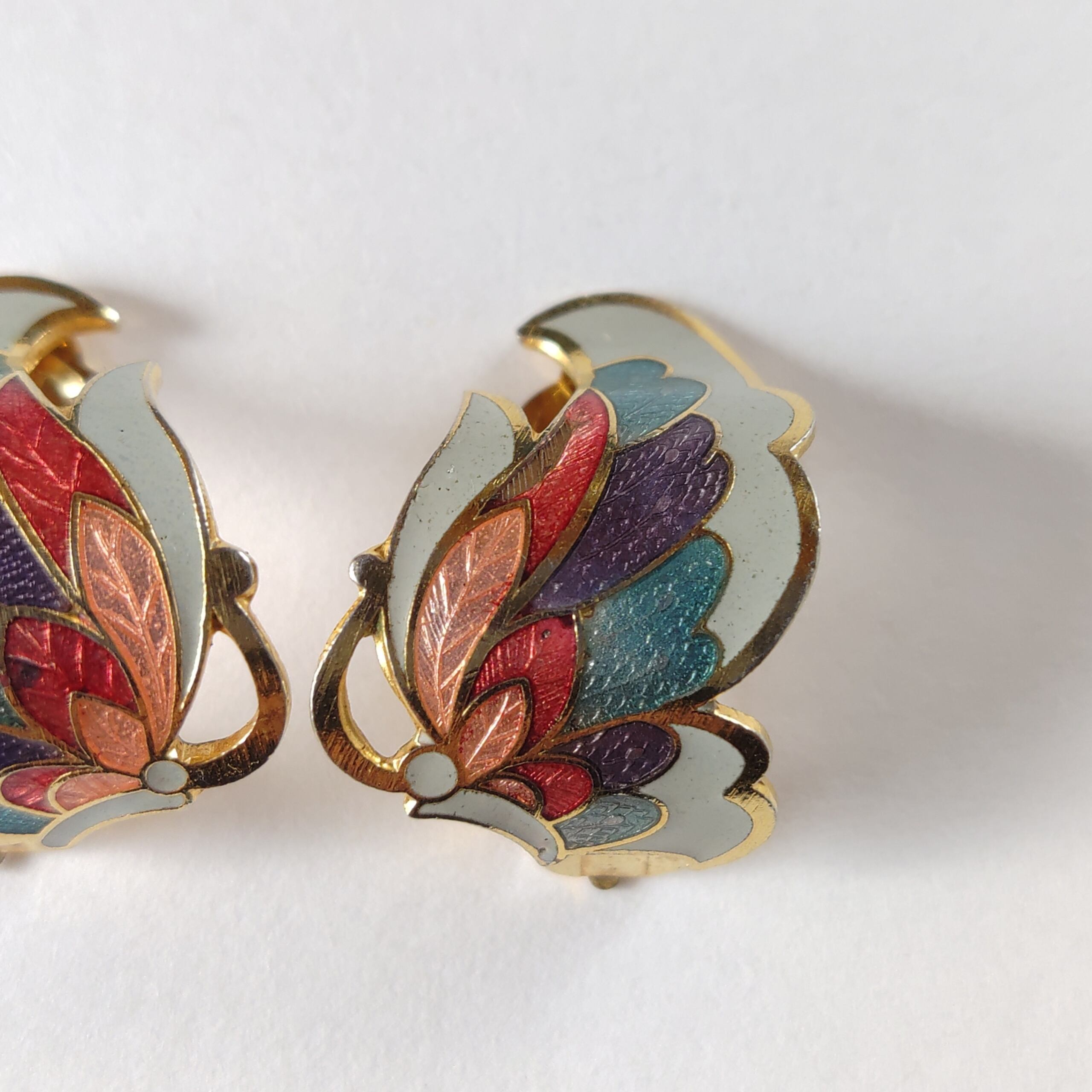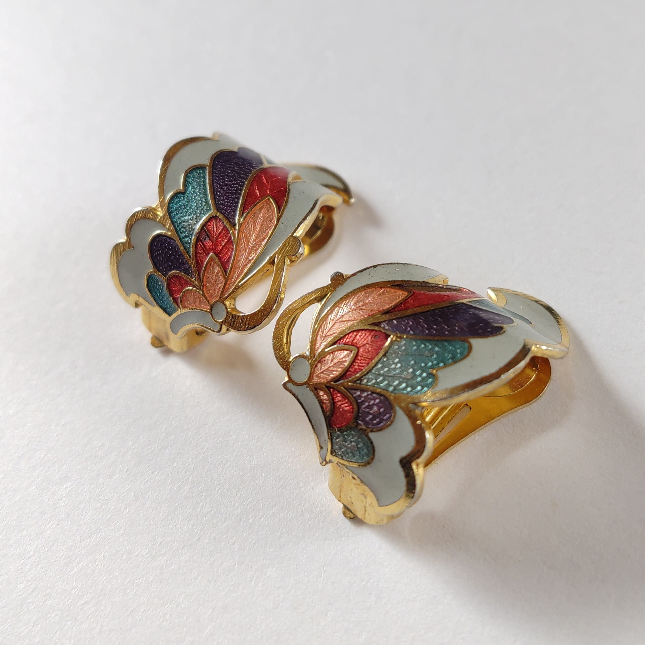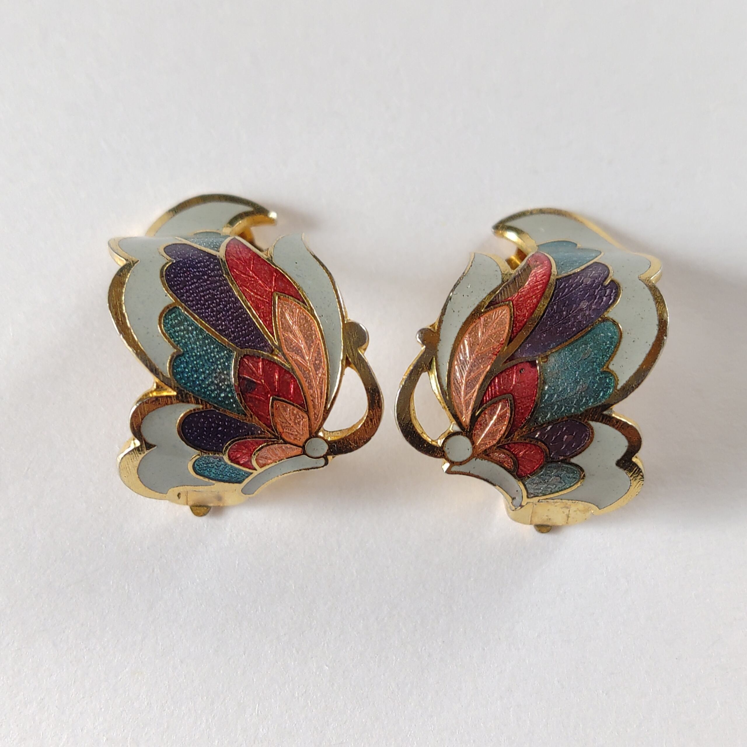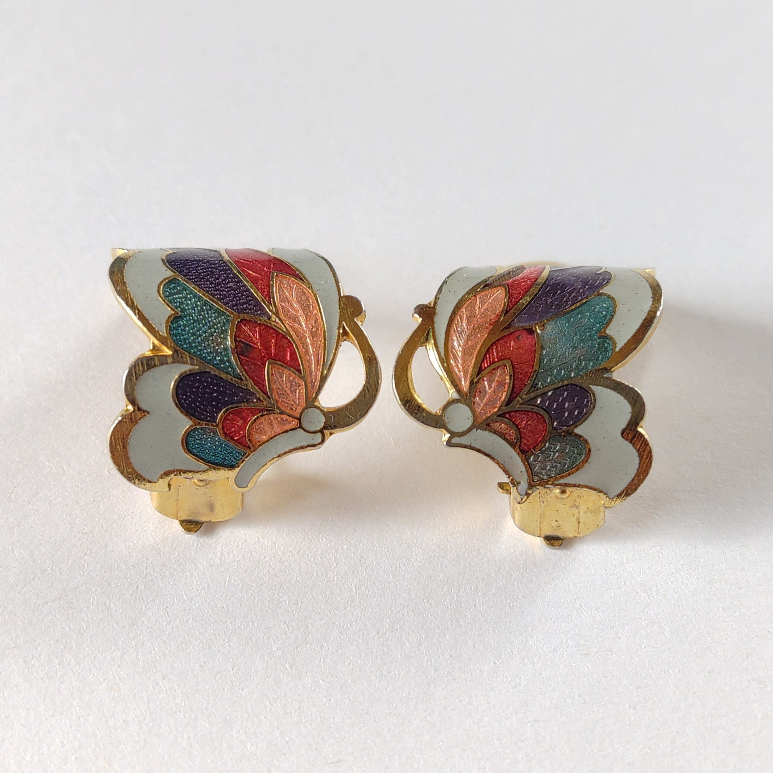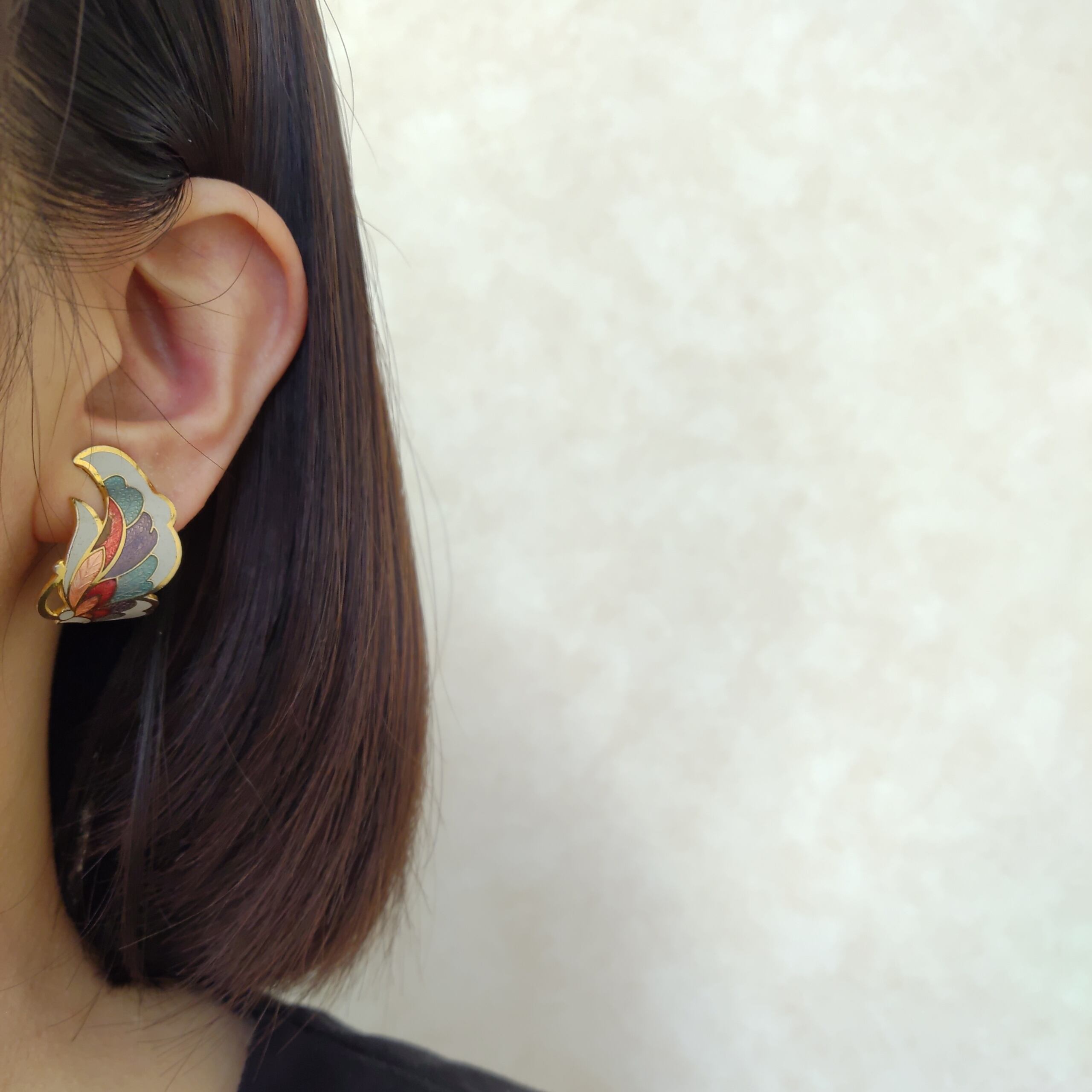 白っぽい薄いグレーをベースにパープル、水色、レッド、ピンクで色付けされた蝶々の形をした七宝焼のヴィンテージイヤリングです。
