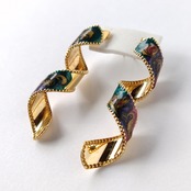 螺旋状のゴールドメタルにグリーン、パープル、赤紫、ゴールドのエナメルでマーブル模様に色付けされたヴィンテージピアスです。