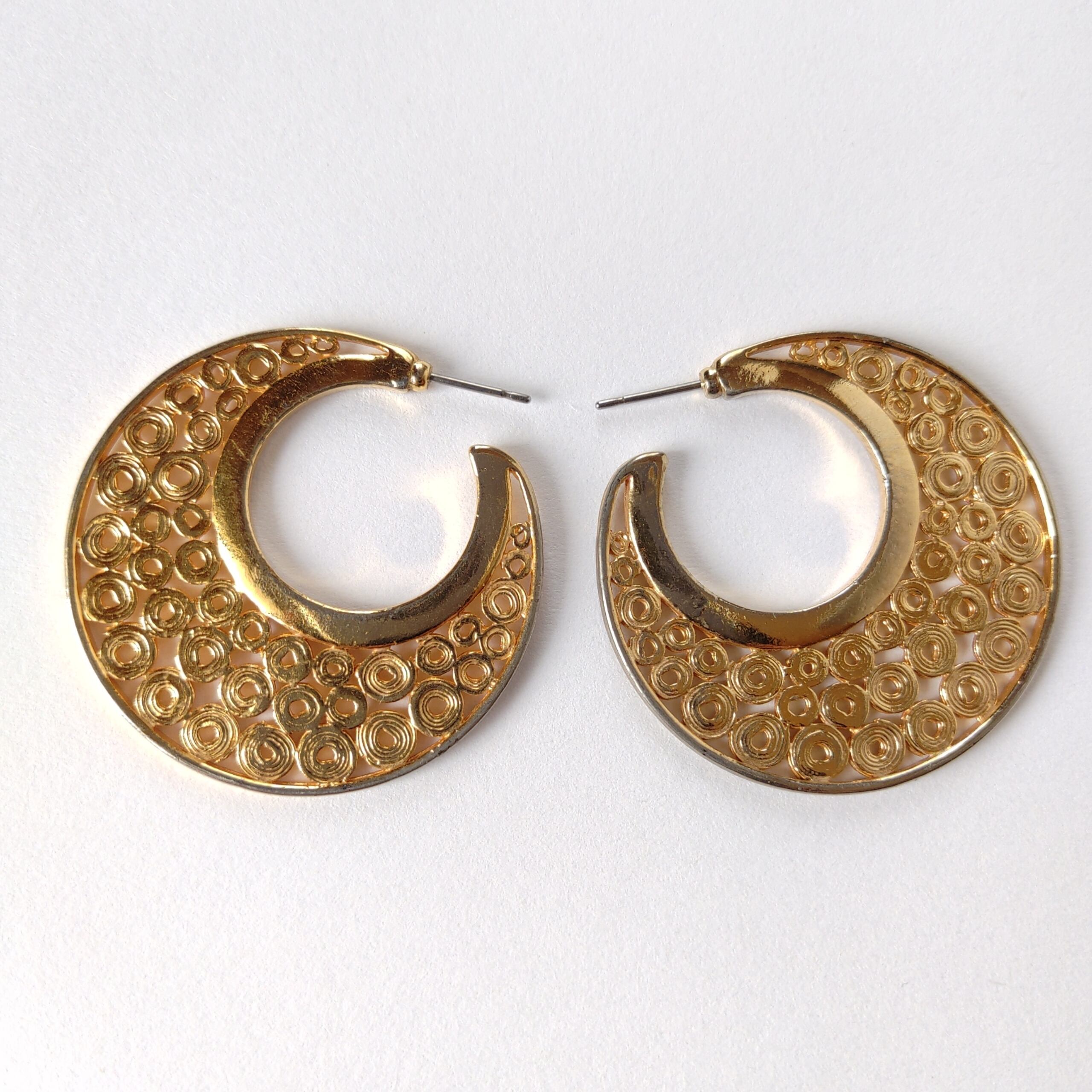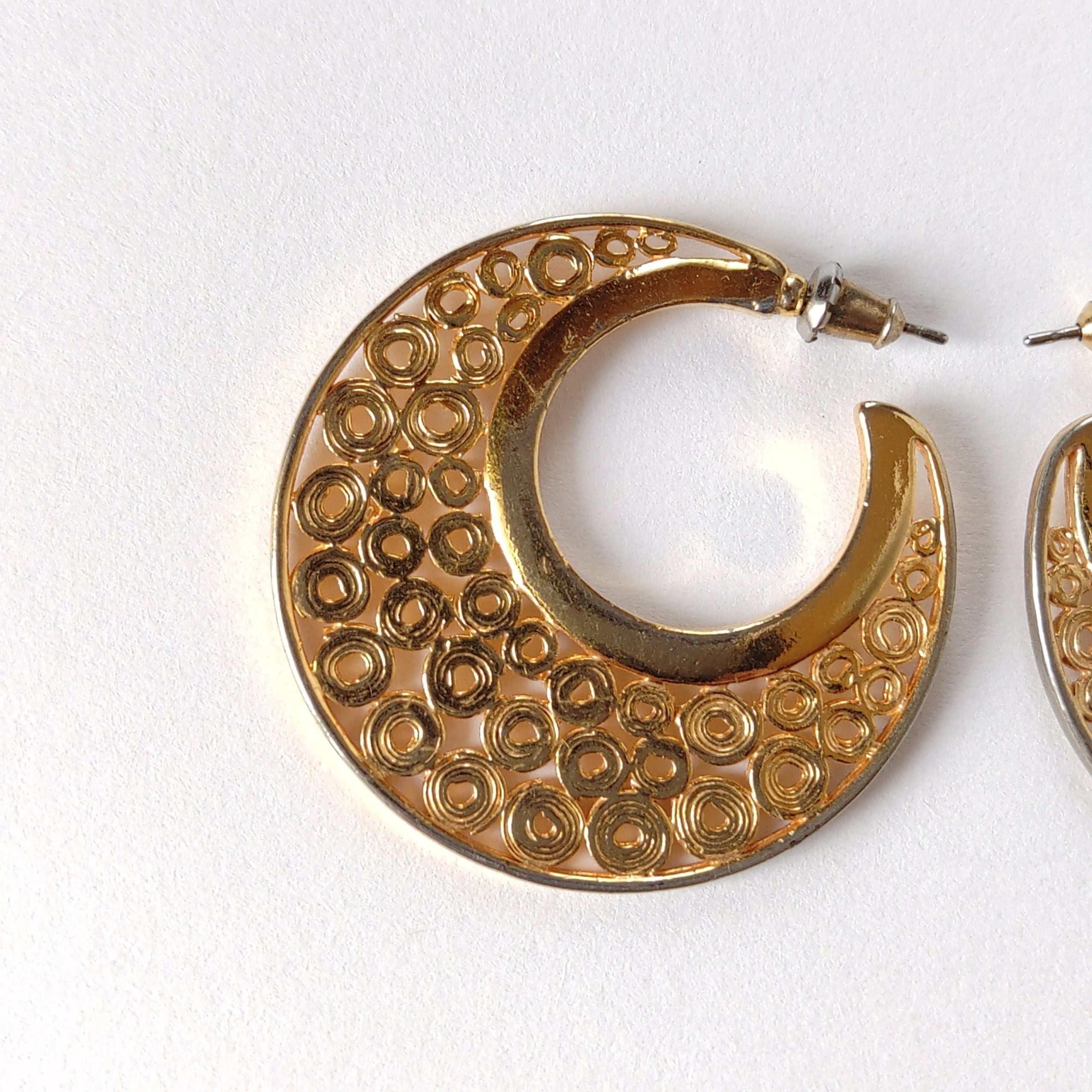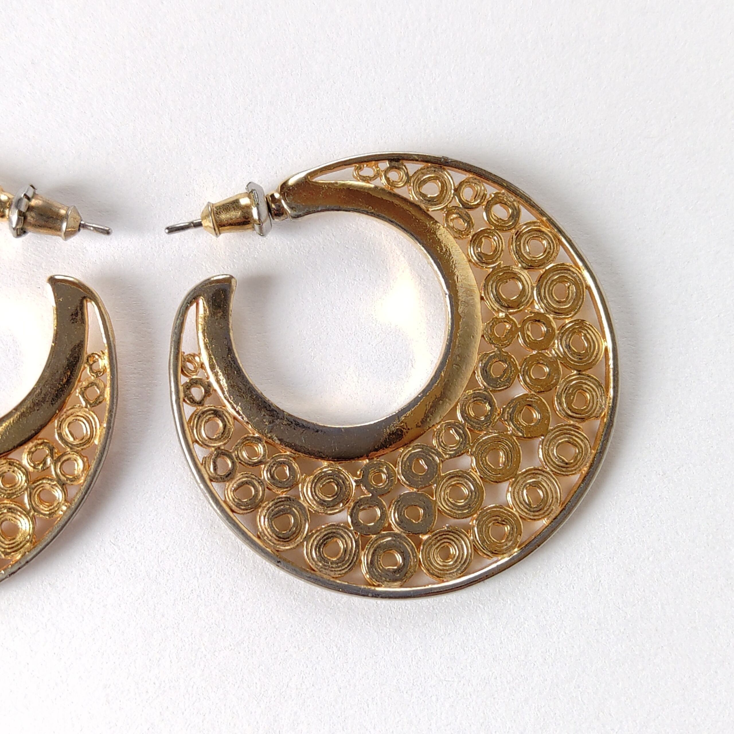渦巻き状の透かし模様がデザインされたゴールドメタルの平らな幅の広いフープのヴィンテージピアスです。