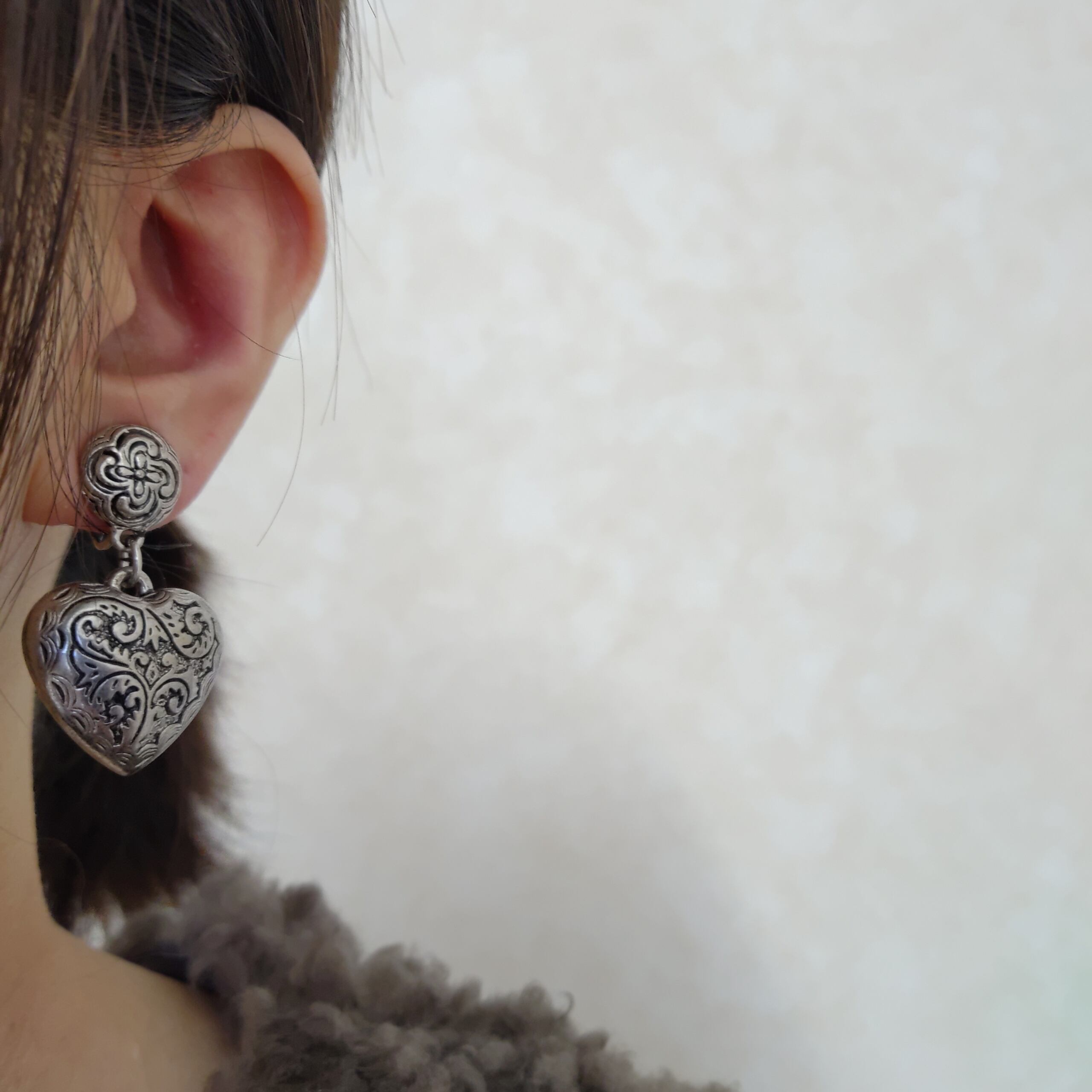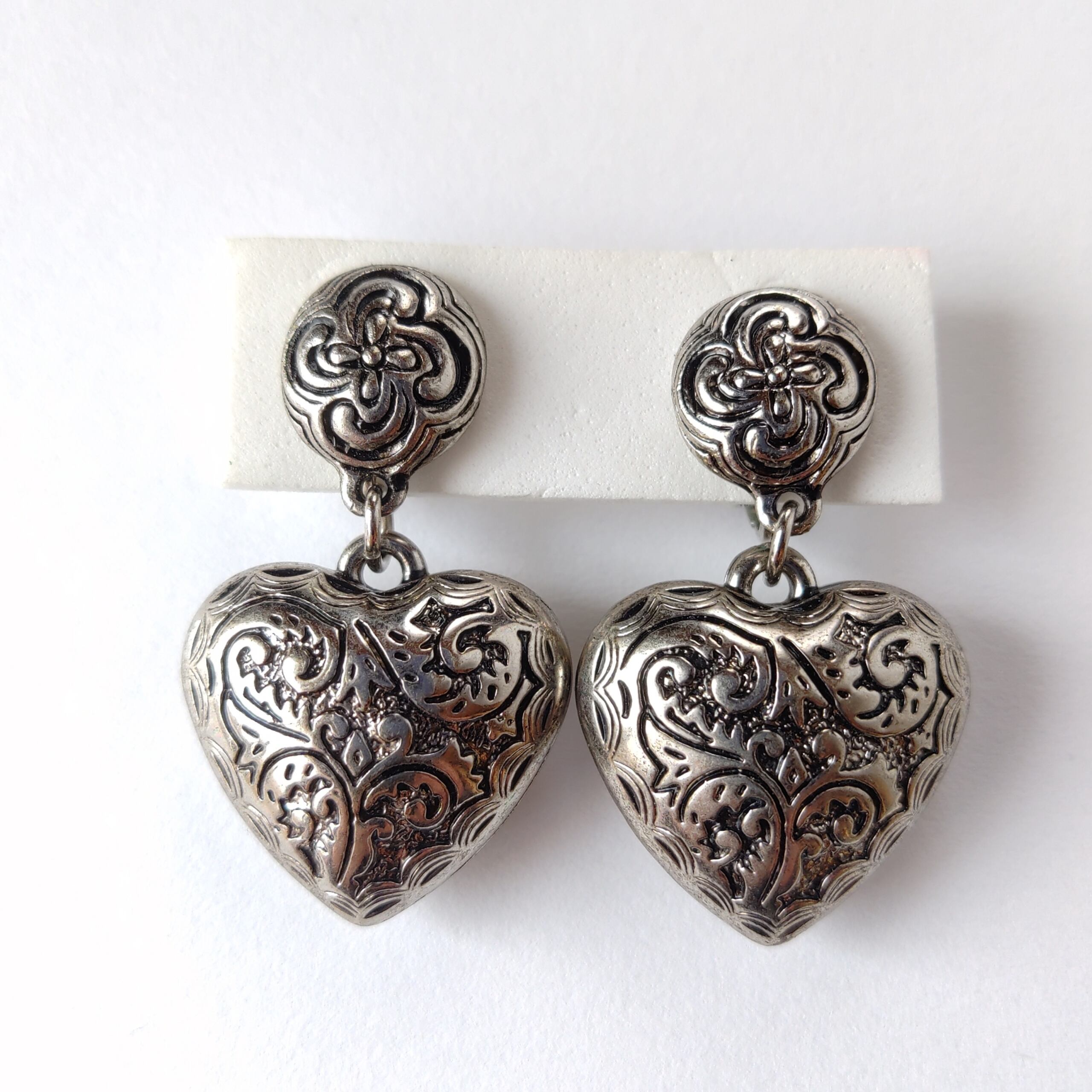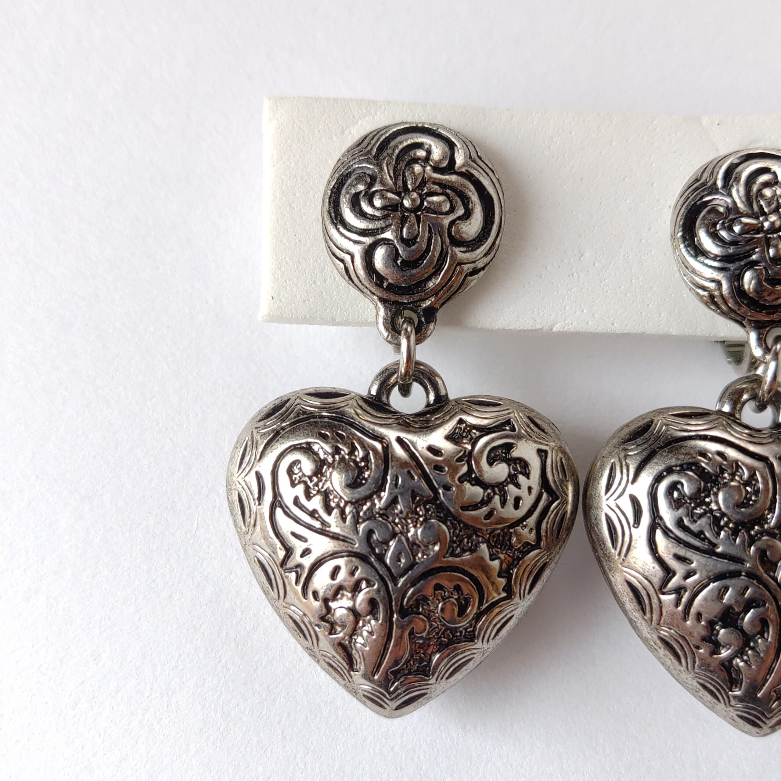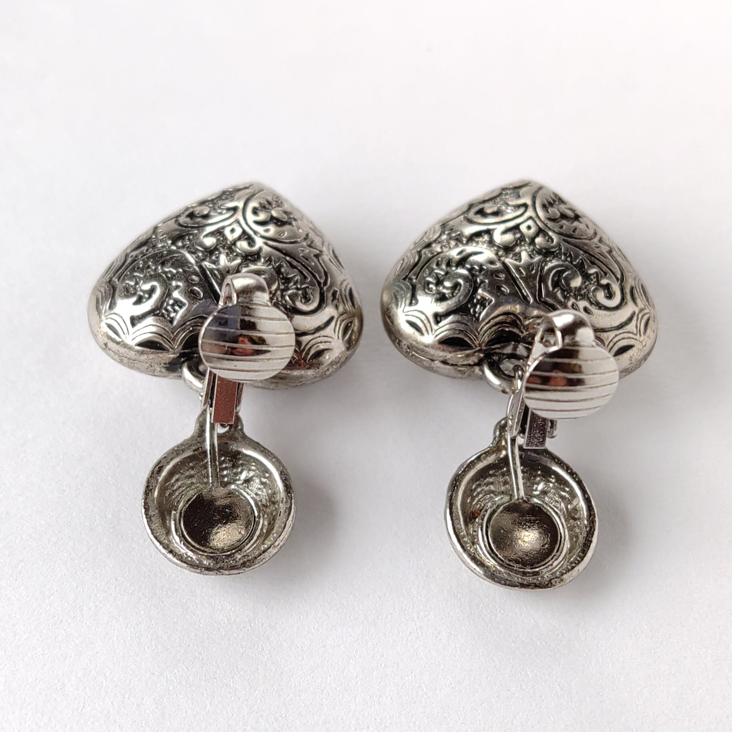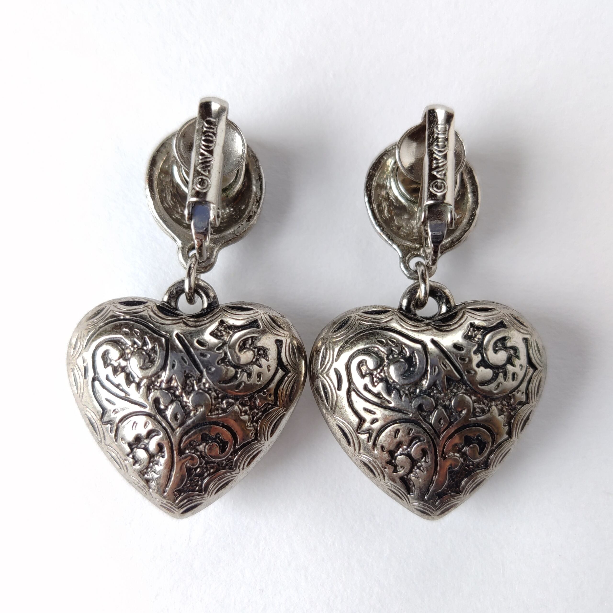 1886年アメリカのニューヨークにて小さな香水会社を創業、1971年に本格的にコスチュームジュエリーの製作を開始したAvon(エイボン)の1993年に販売されたシルバーメタルのラウンドとぷっくりとした立体的なハートにフラワーやリーフの模様が彫られた揺れるタイプの「Etched hearts」のヴィンテージイヤリングです。