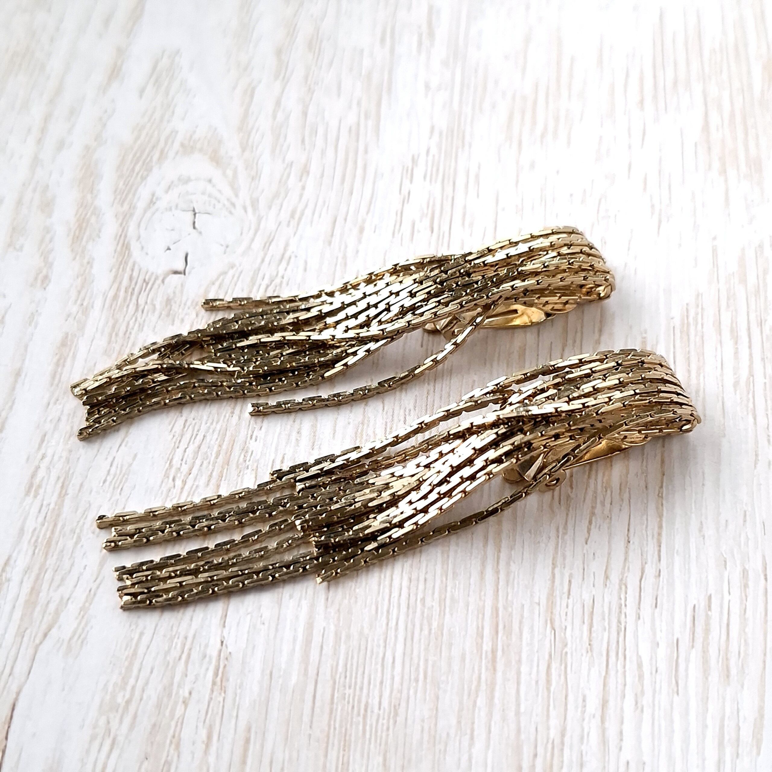 上から覆い被さる様に段々に垂れ下がった束になったゴールドメタルのチェーンが揺れるデザインのヴィンテージイヤリングです。