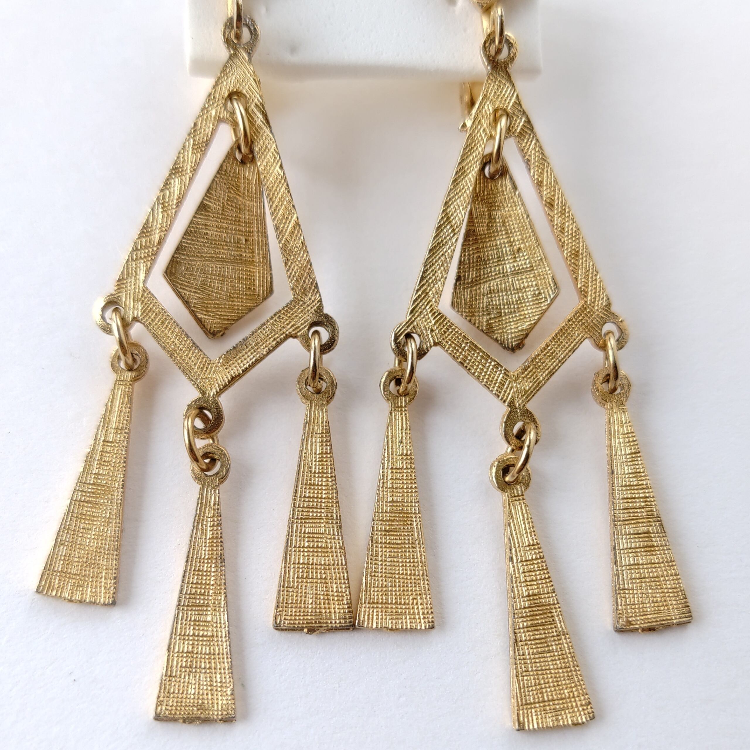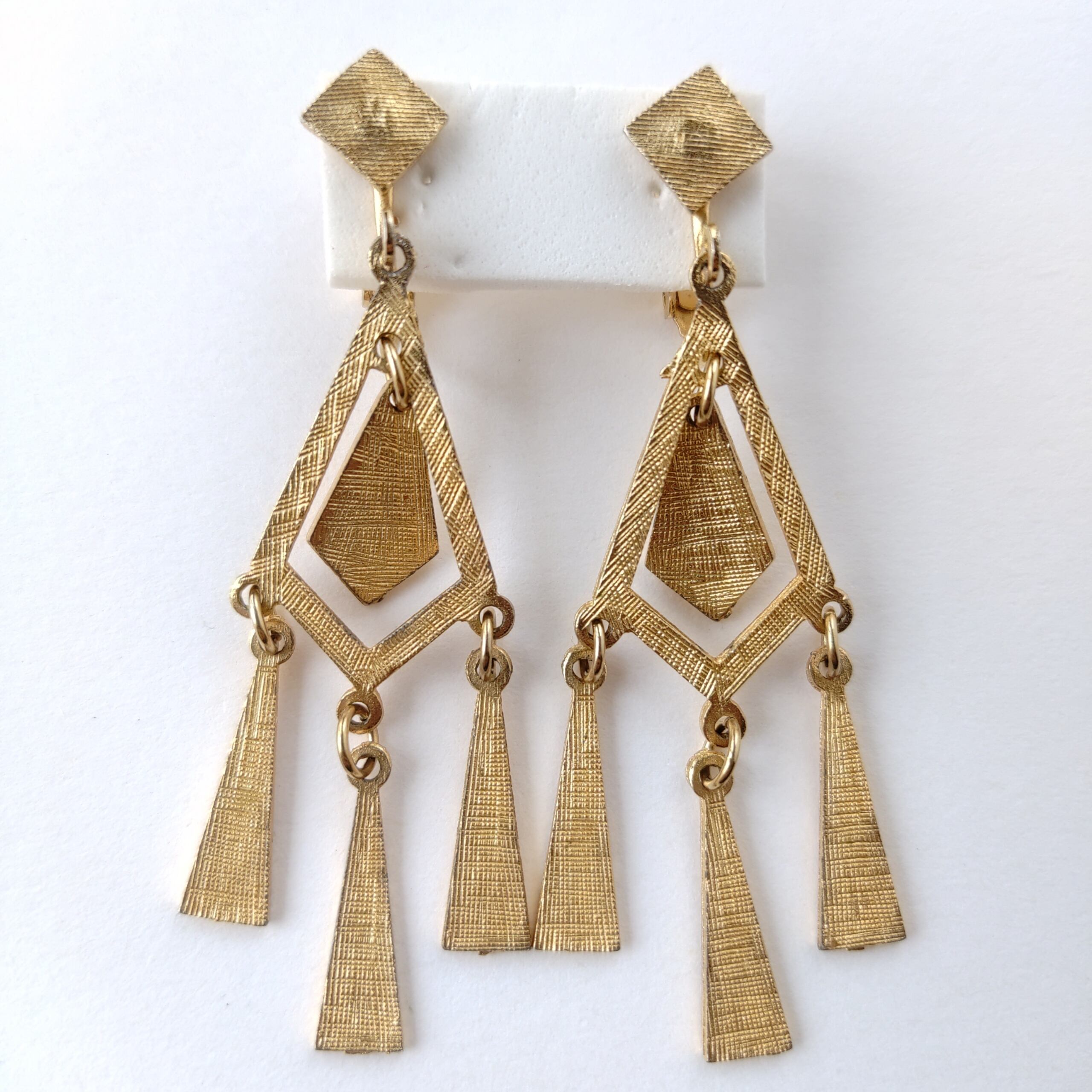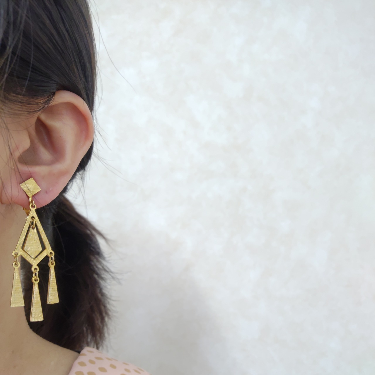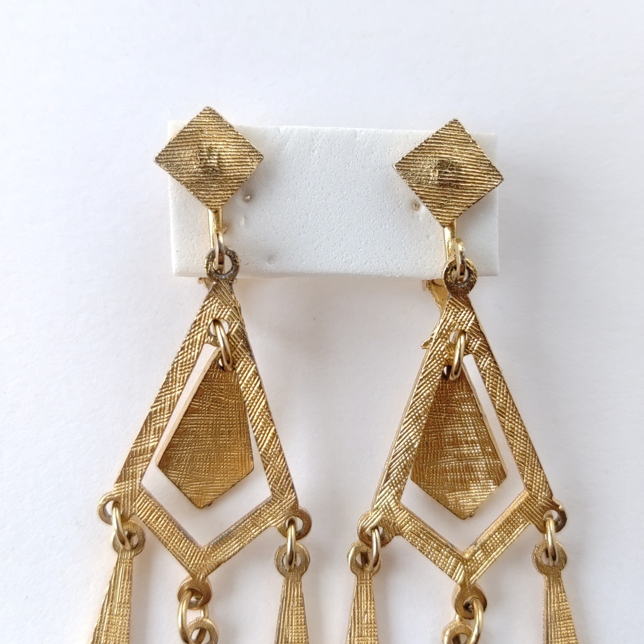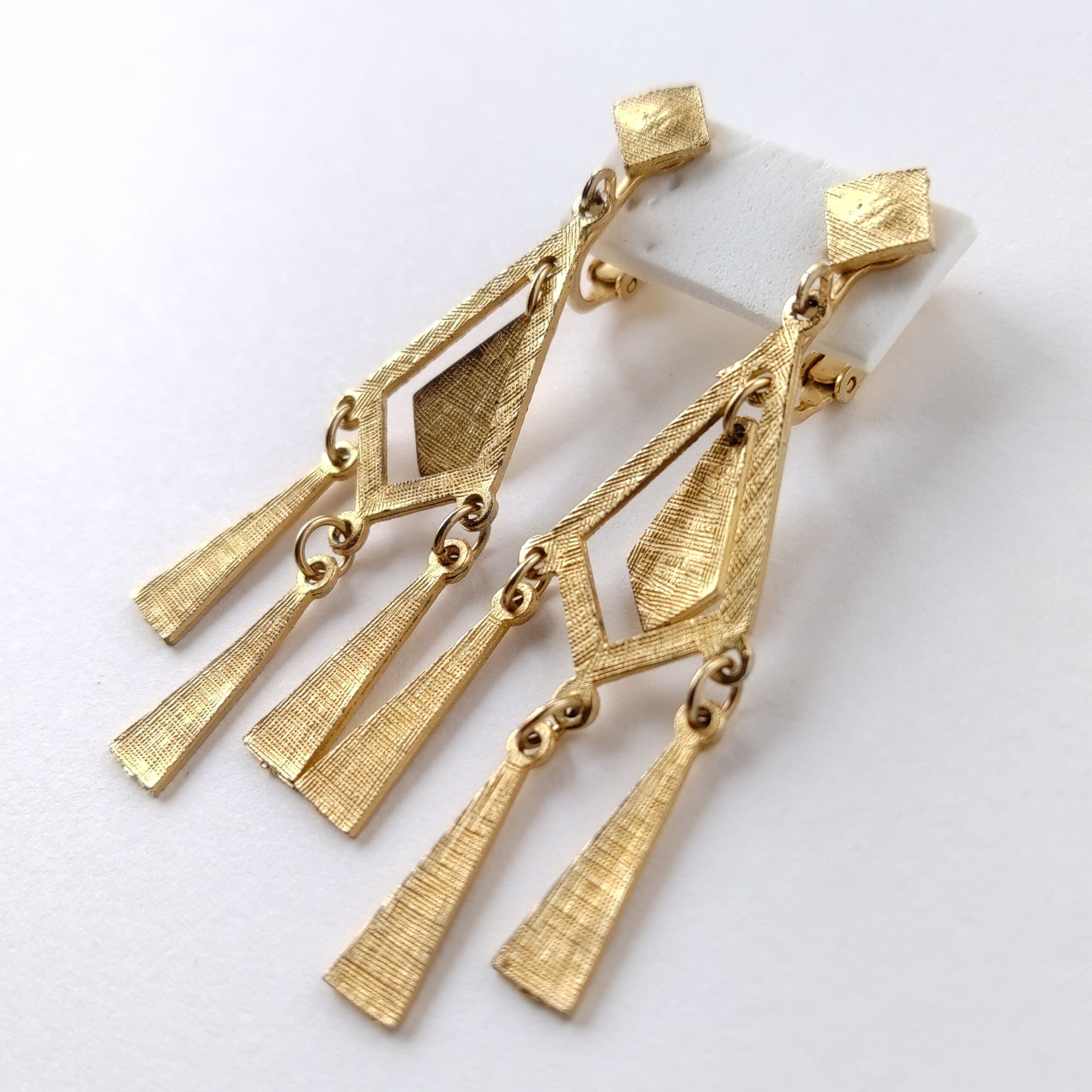 ツヤ消し加工がされたひし形、凧型、三角のゴールドメタルが揺れるデザインのヴィンテージイヤリングです。