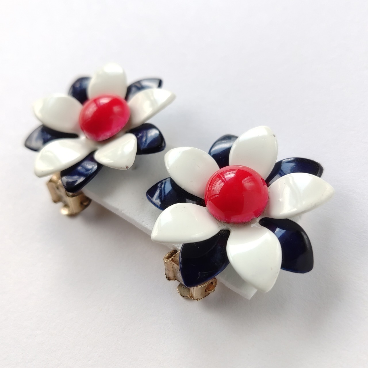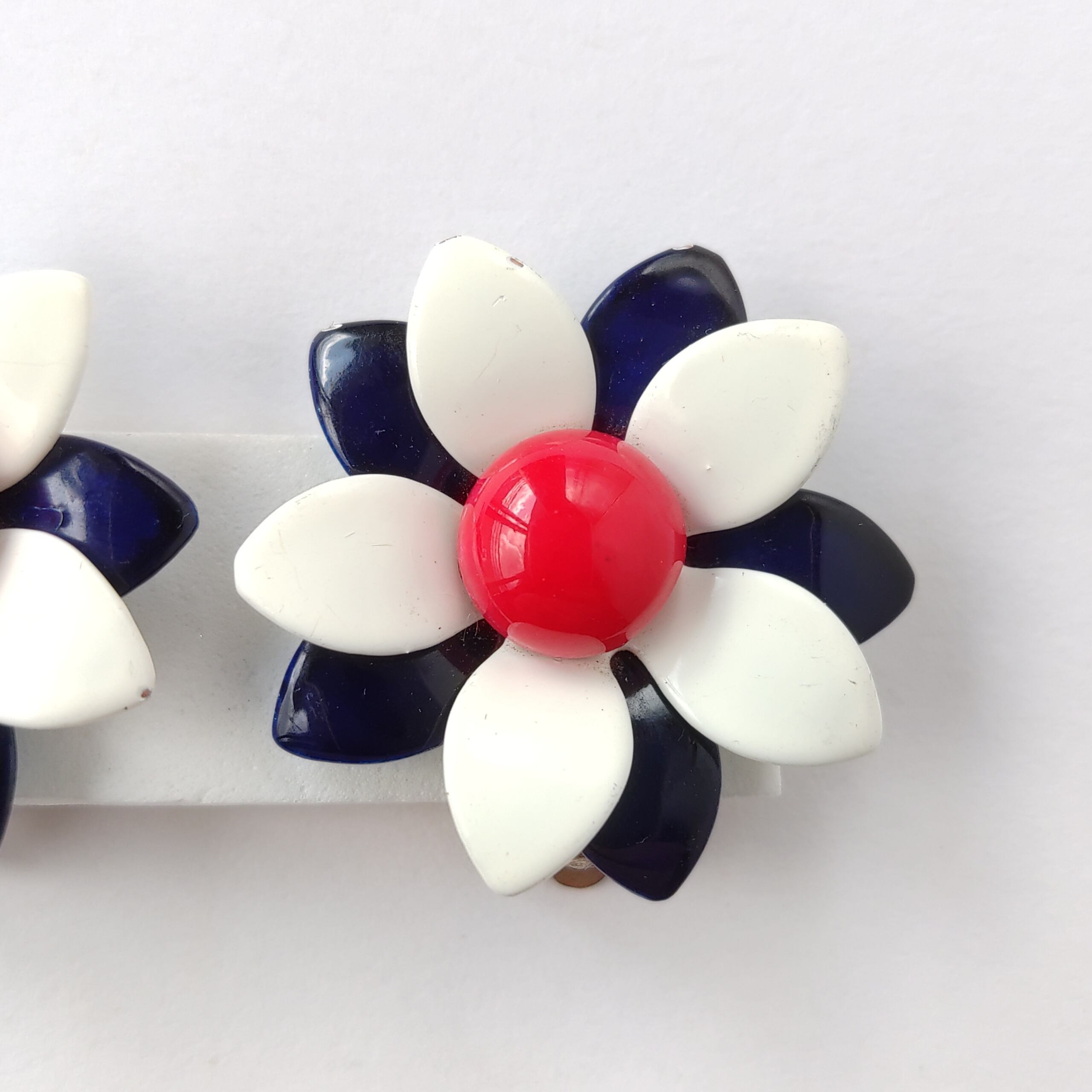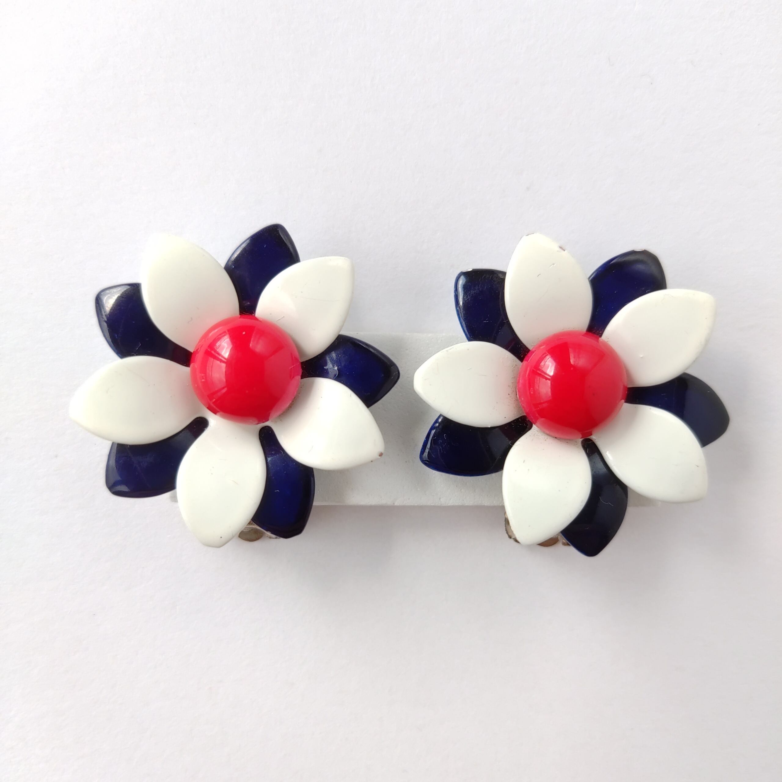 ネイビー、ホワイト、レッドのトリコロールカラーのエナメルで色付けされたメタルフラワーのヴィンテージイヤリングです。