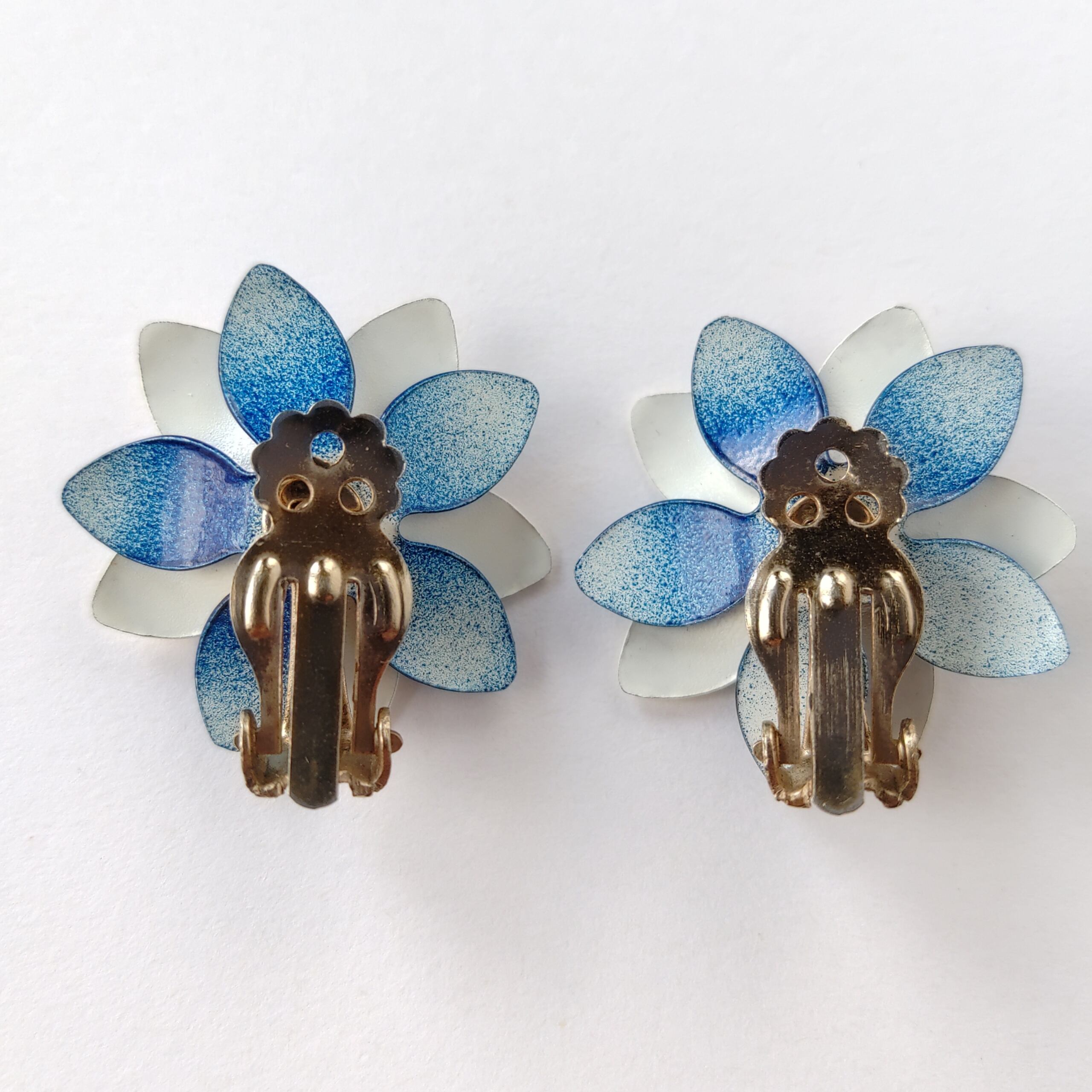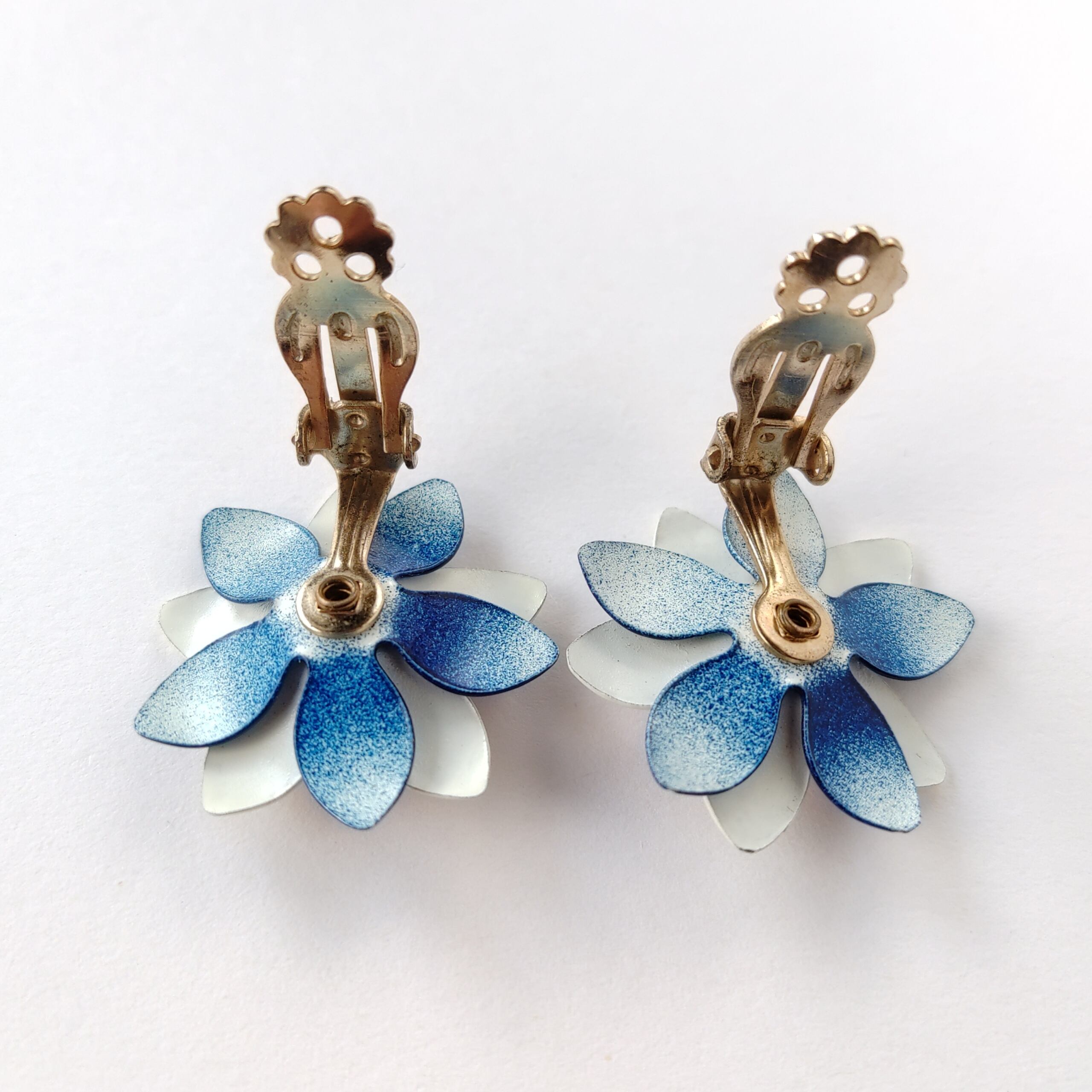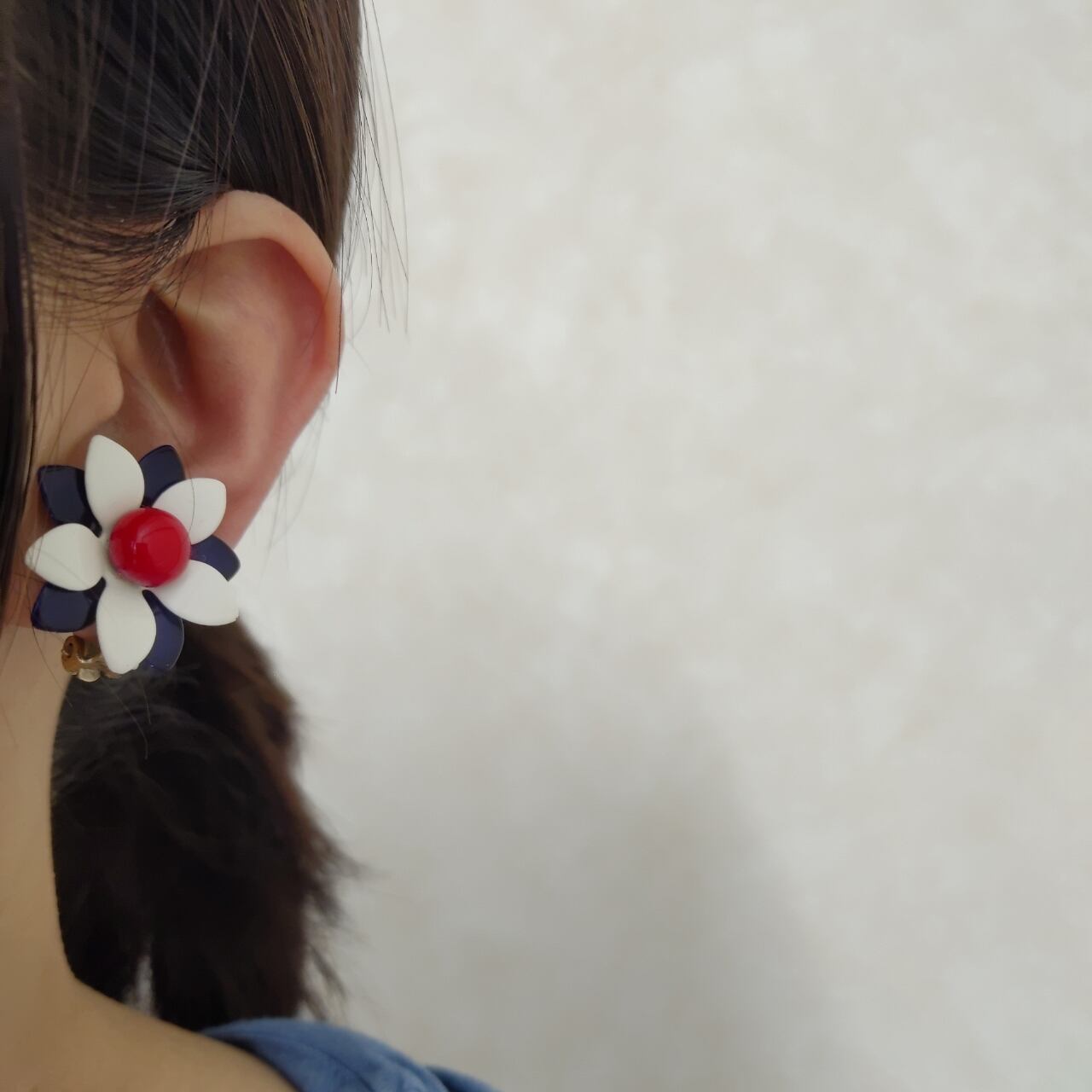 ネイビー、ホワイト、レッドのトリコロールカラーのエナメルで色付けされたメタルフラワーのヴィンテージイヤリングです。
