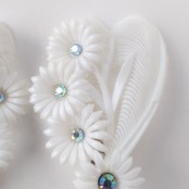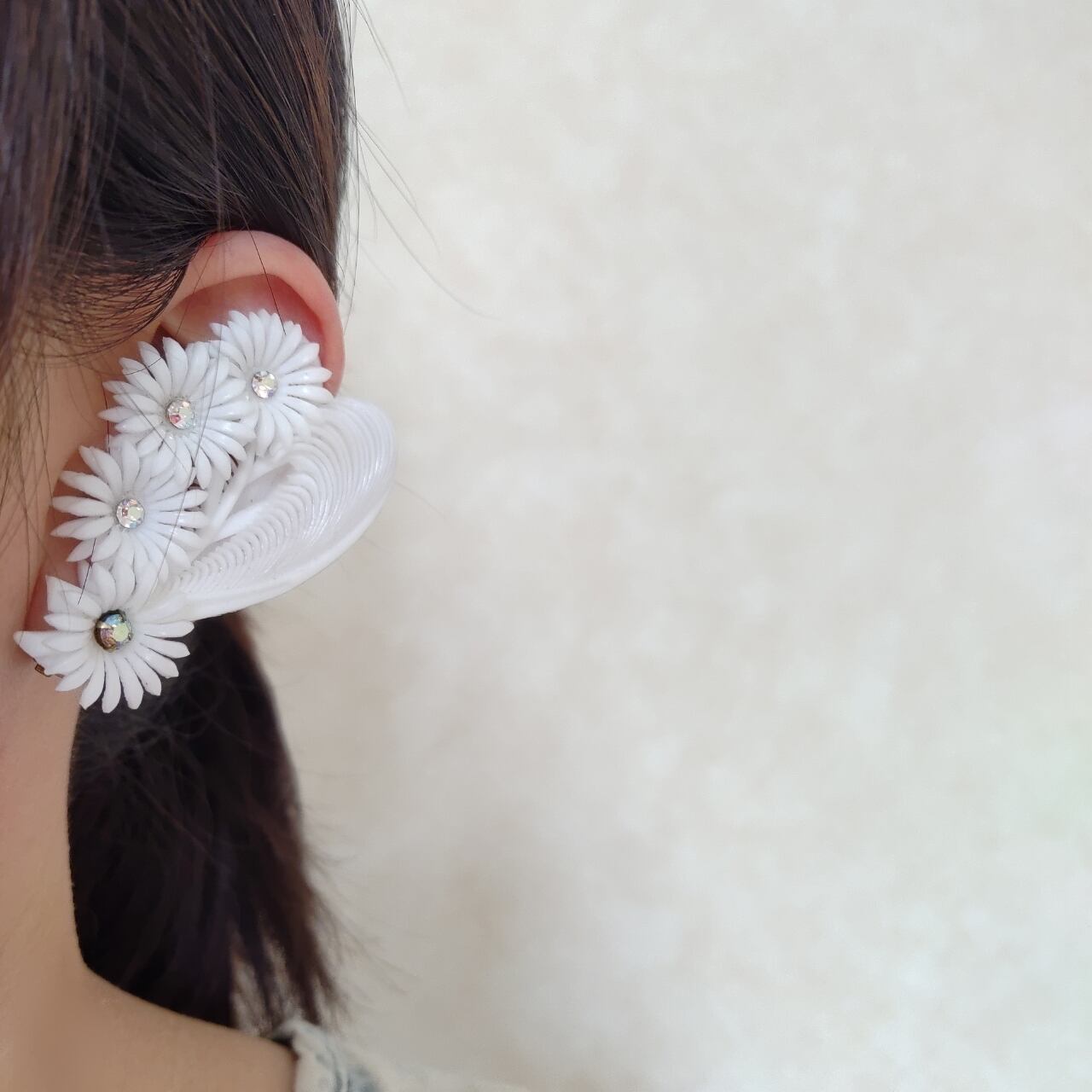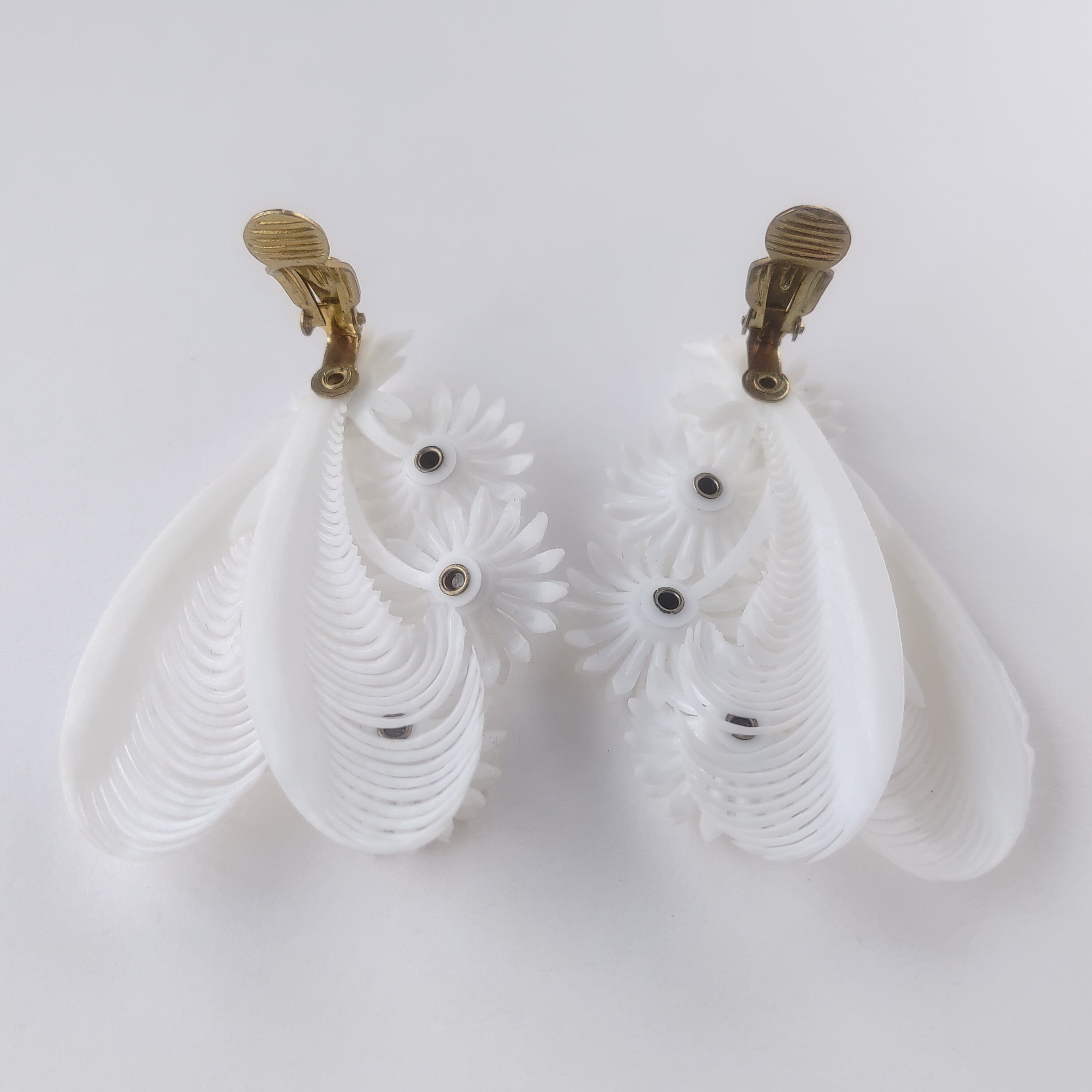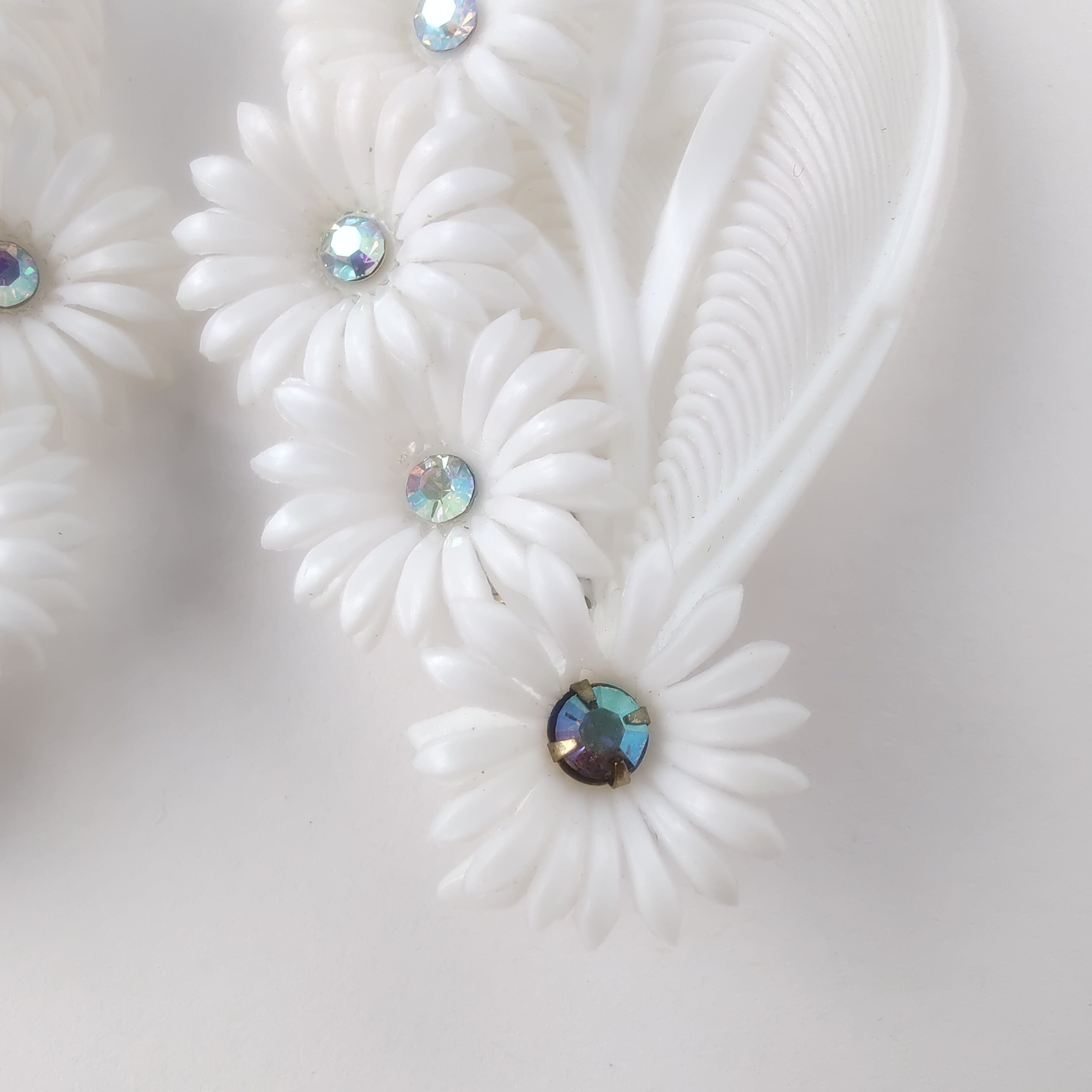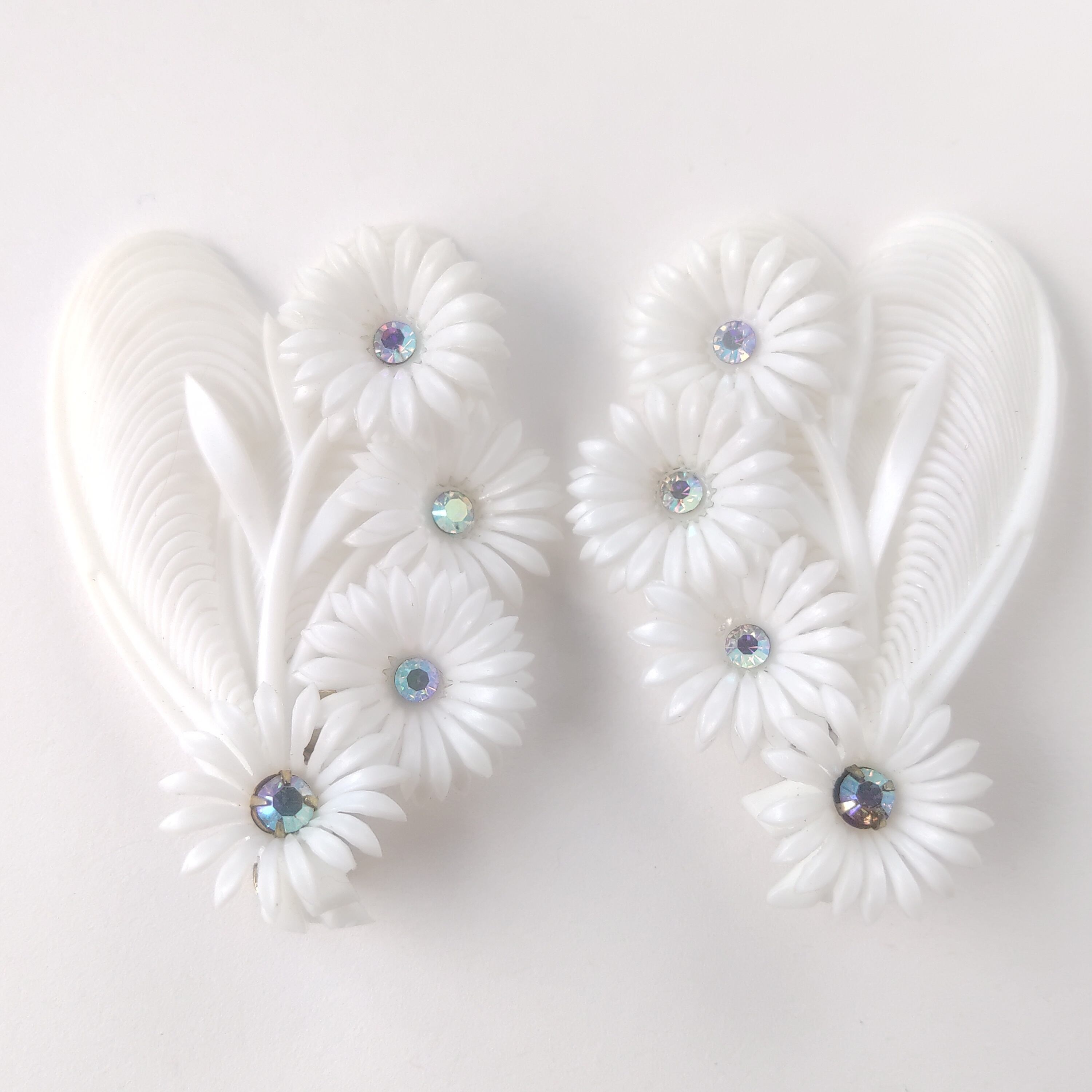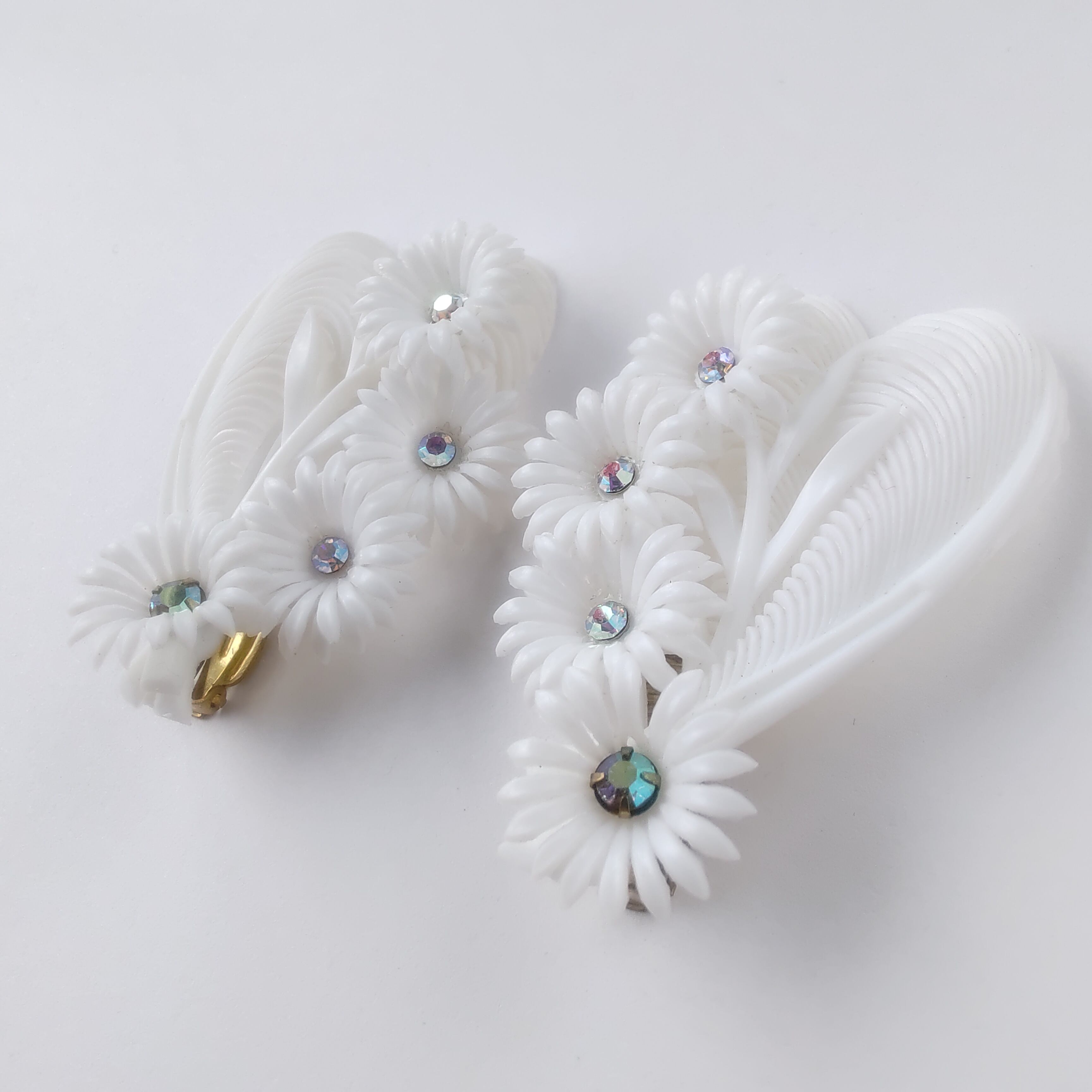 2枚の羽根とオーロララインストーンがあしらわれた4輪のフラワーがホワイトのソフトプラスチックで造られたヴィンテージイヤリングです。