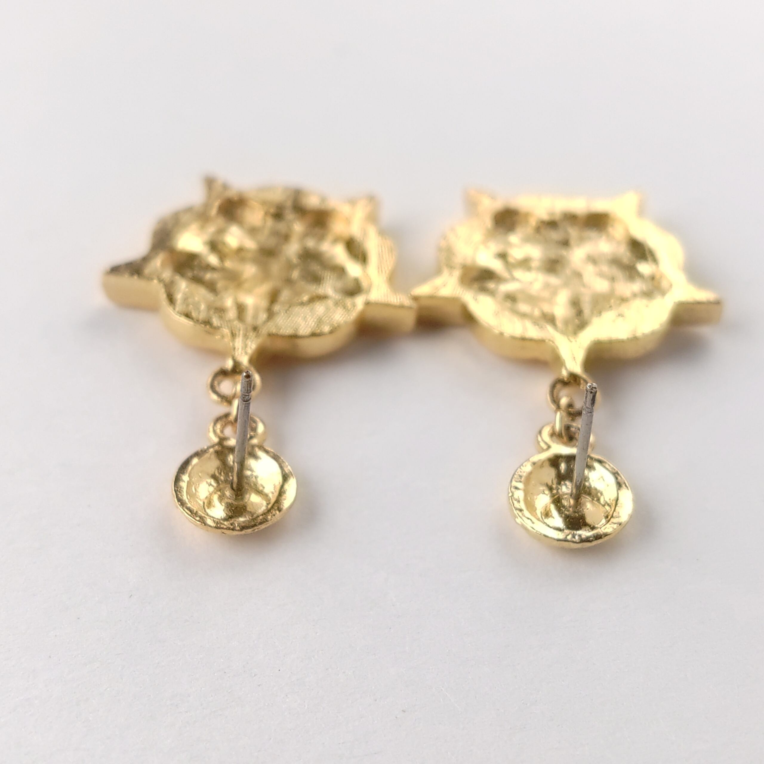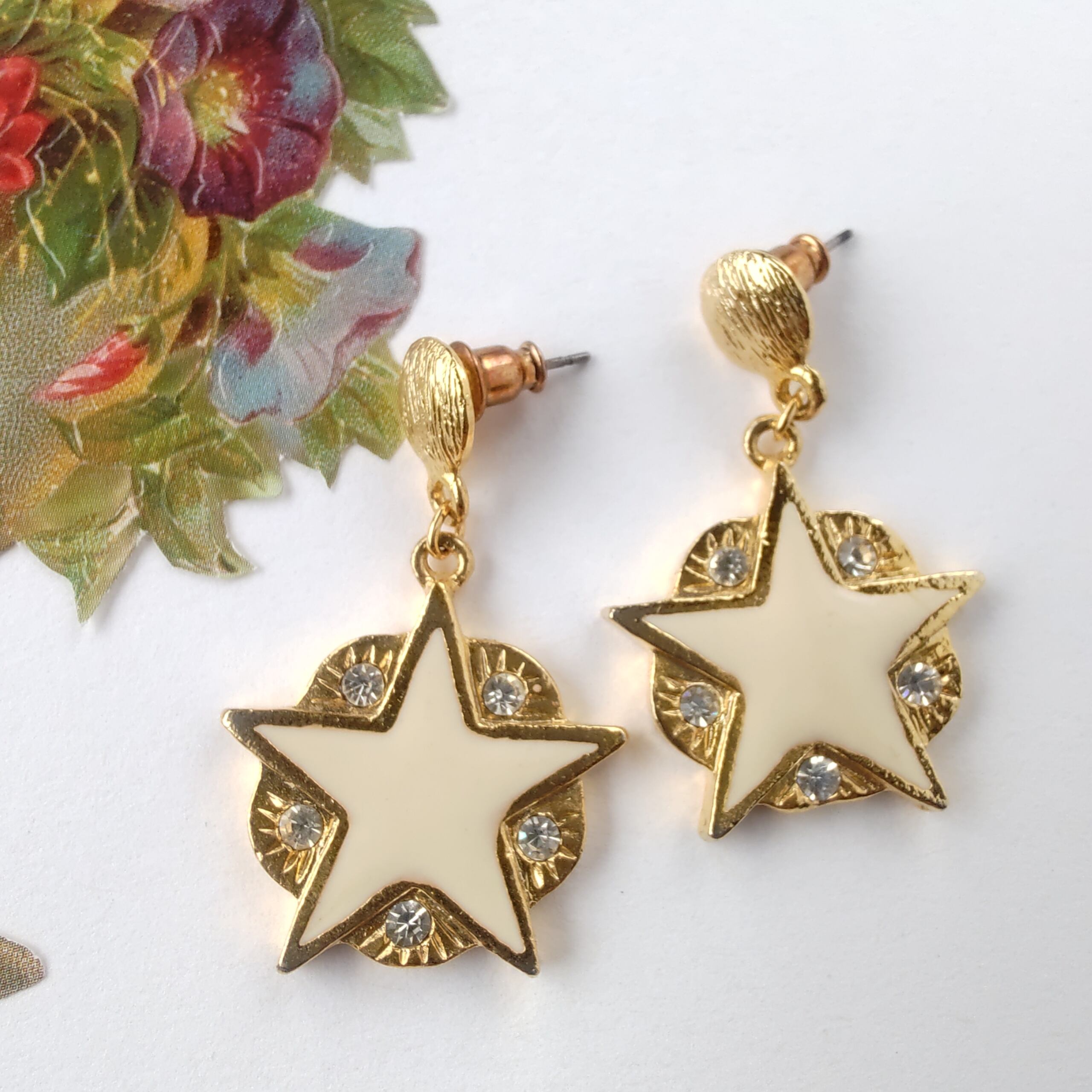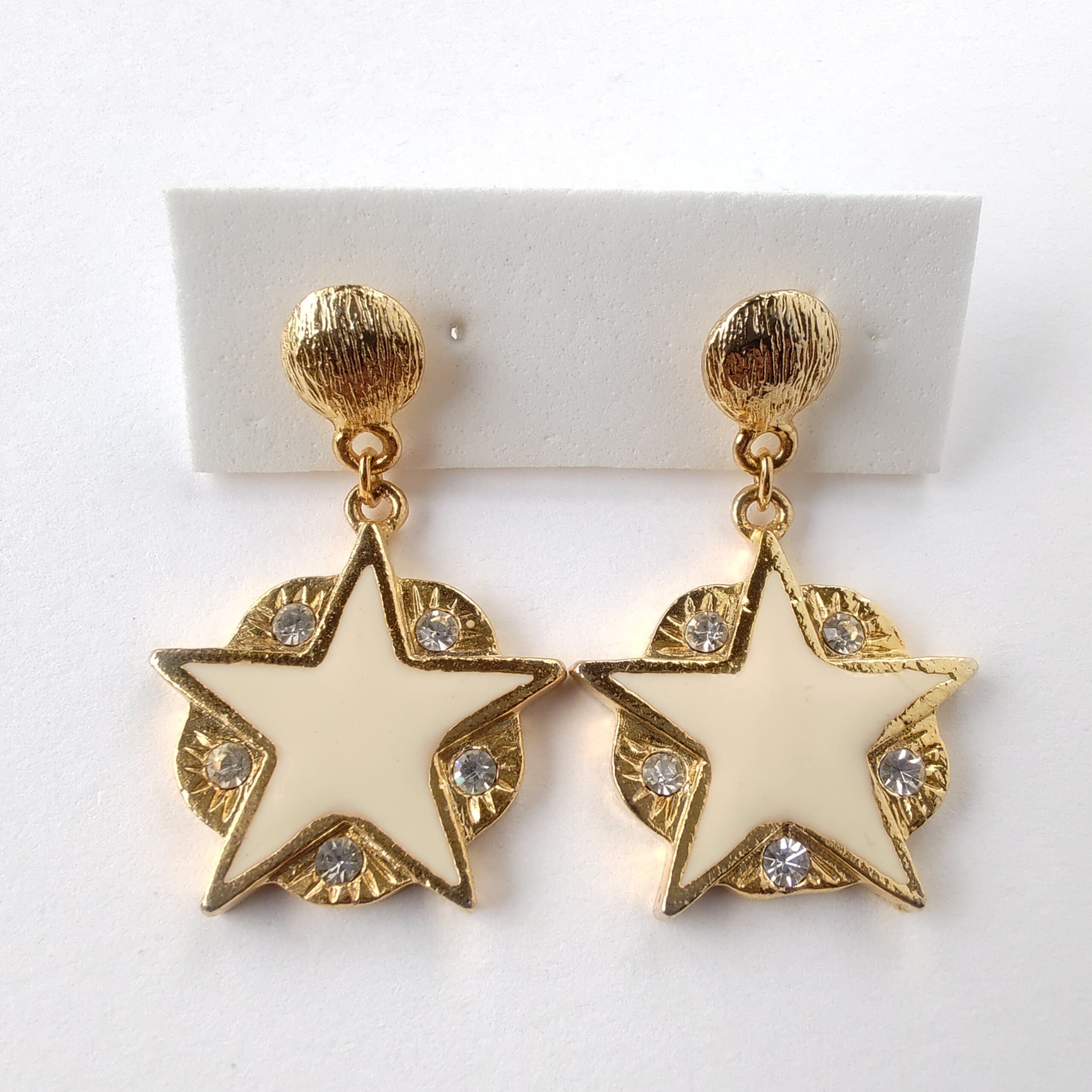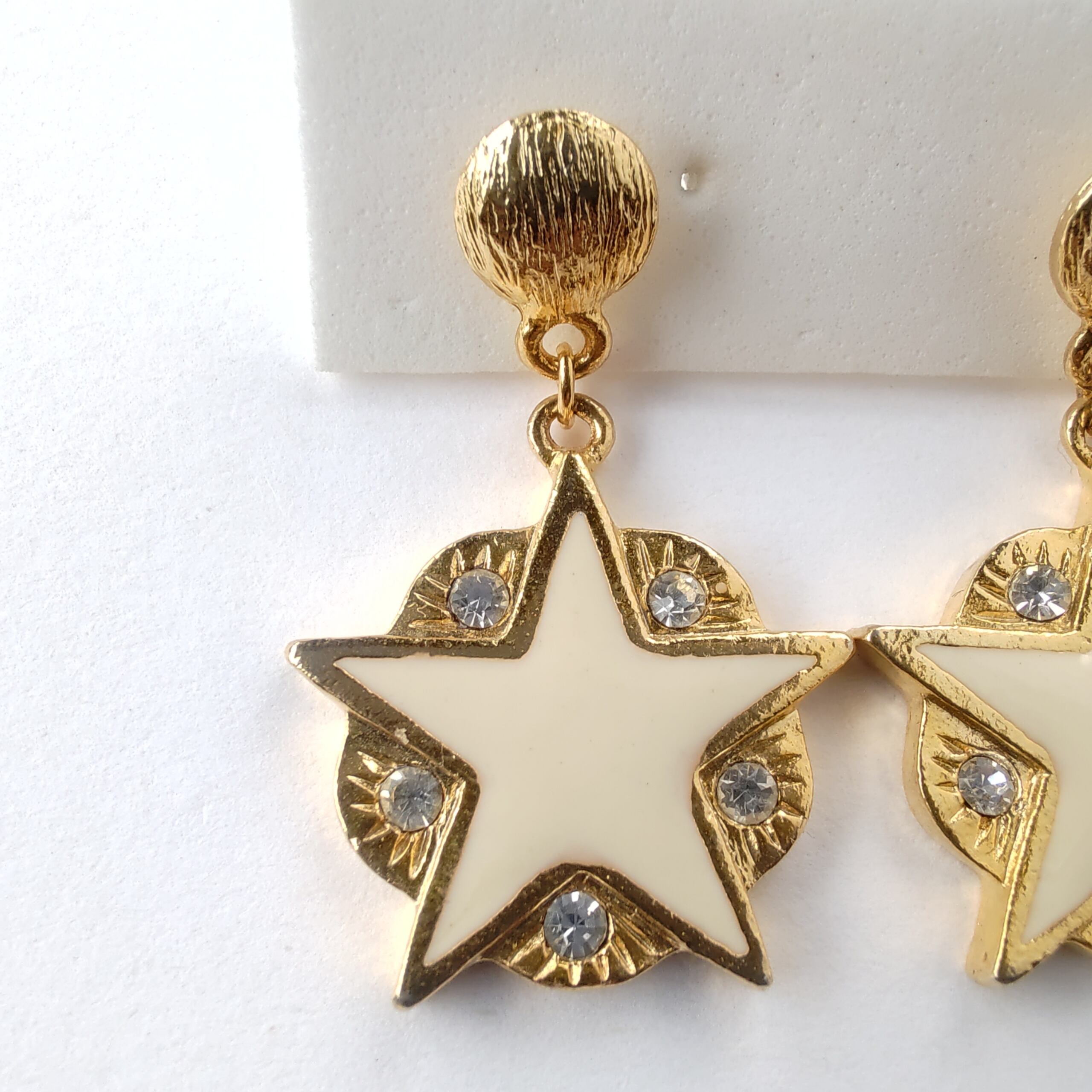 クリアなラインストーンが散りばめられた中央にオフホワイトのエナメルで色付けされたスターが揺れるデザインのゴールドメタルのヴィンテージピアスです。