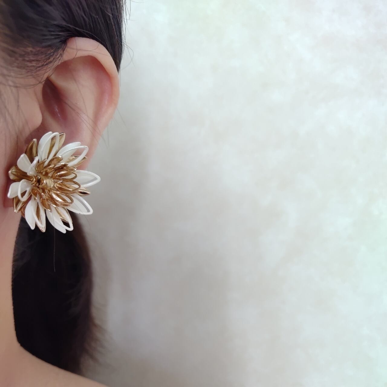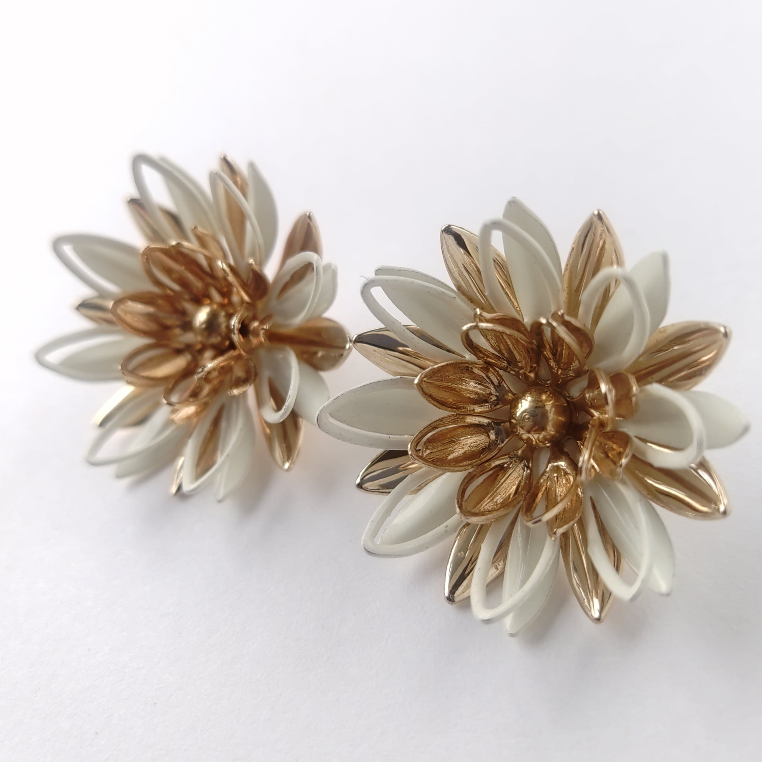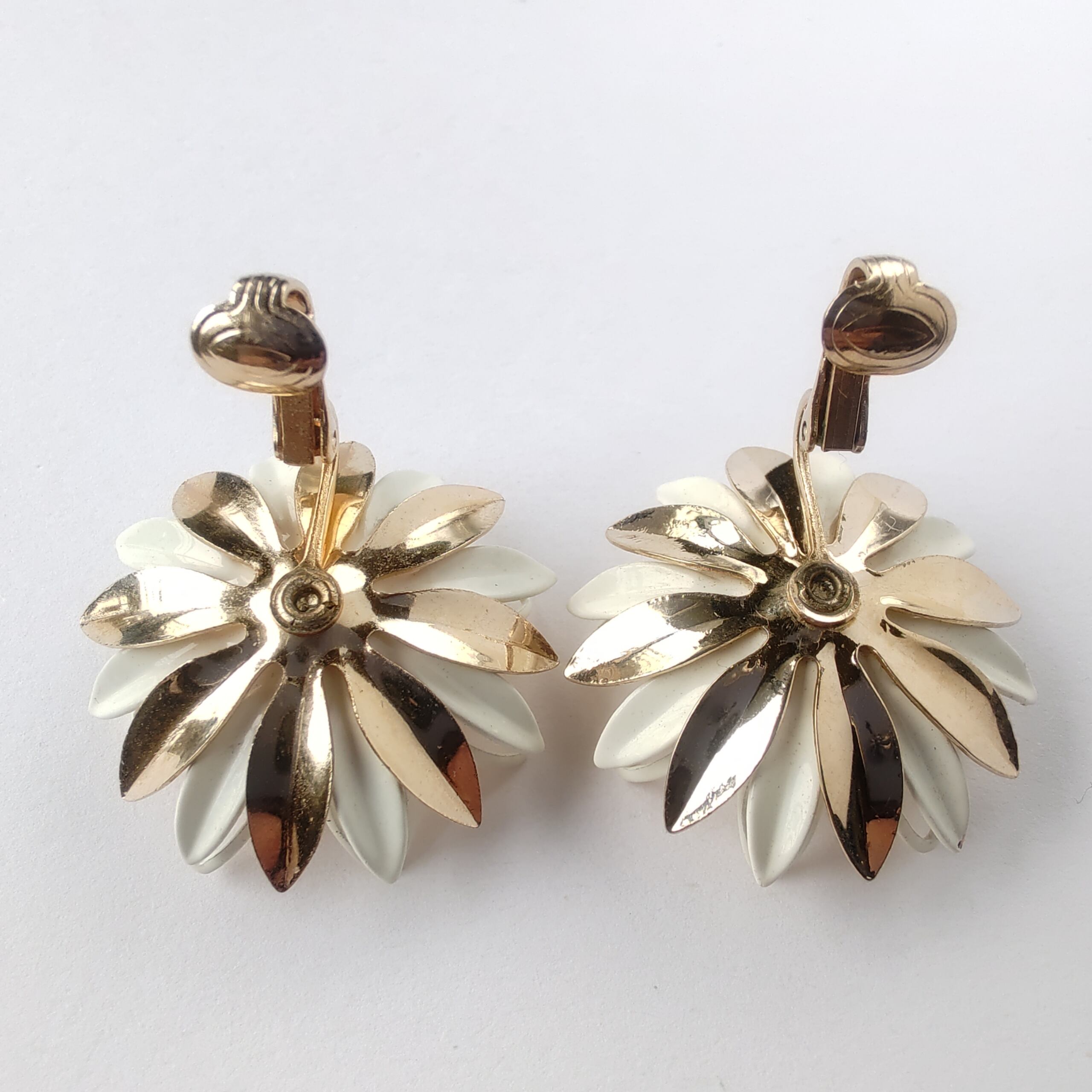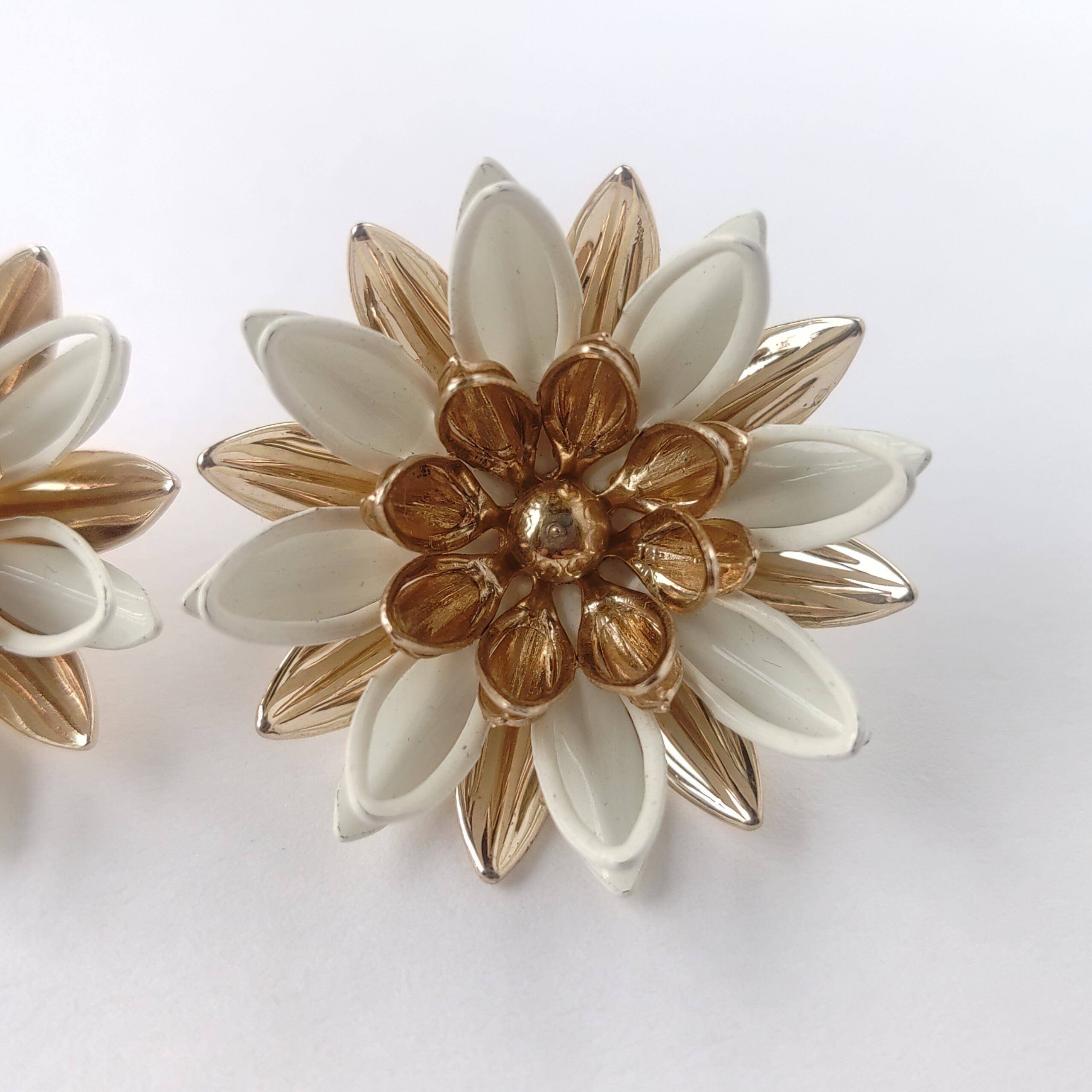 1949年にニューヨークで創業したSarah Coventry(サラコベントリー)の1966年に販売されたゴールドメタルとホワイトのエナメルで色付けされた花びらで睡蓮をデザインした“Water Lily”のヴィンテージイヤリングです。