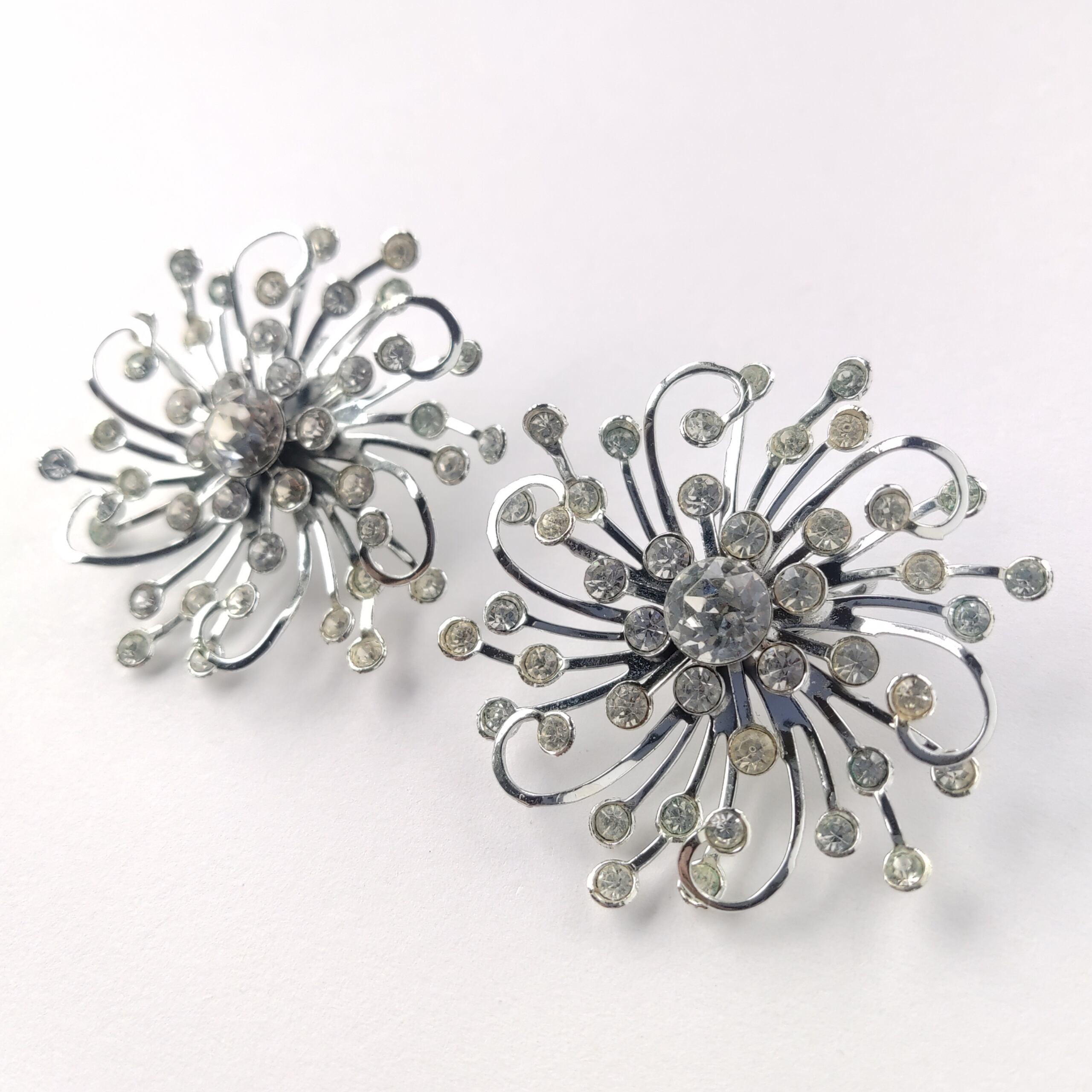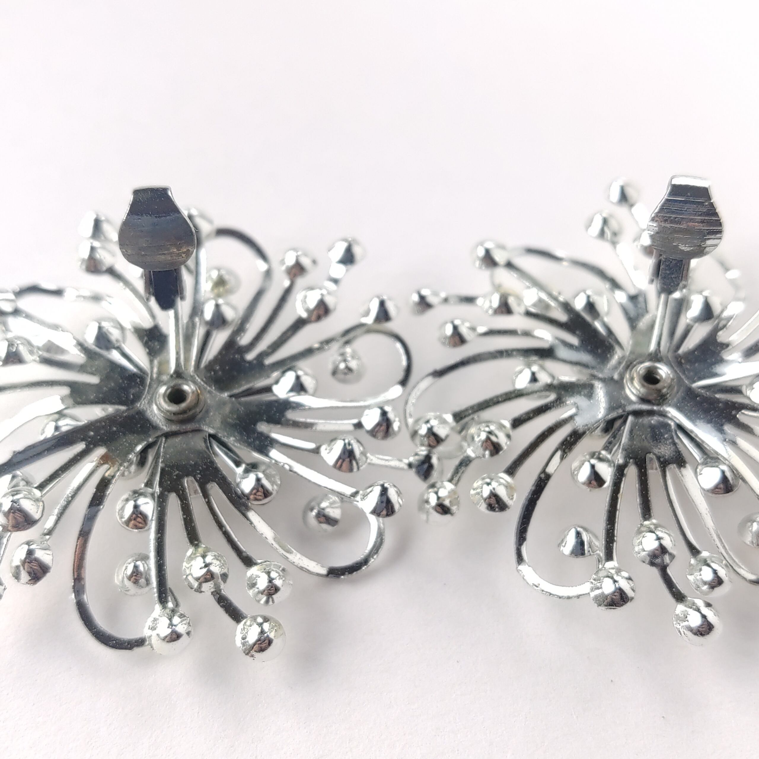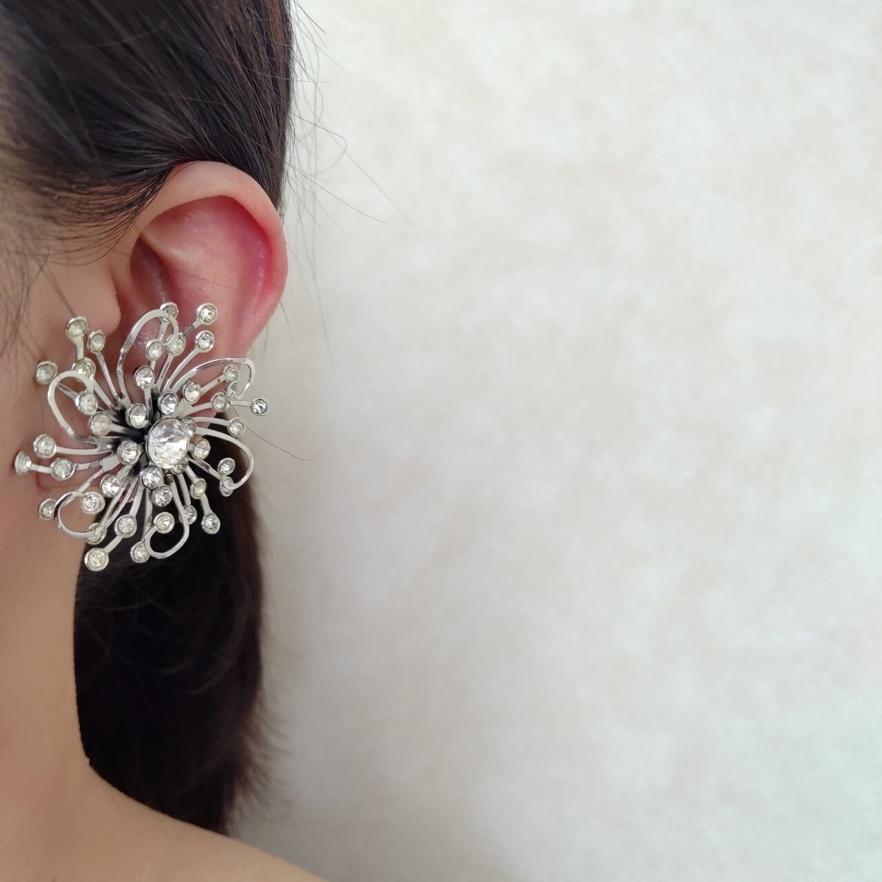 1949年にニューヨークで創業したSarah Coventry(サラコベントリー)の1958年に販売されたクリアラインストーンがふんだんに使用されたシルバーメタルのフラワーの中央にブリリアントカットのクリアラインストーンがあしらわれた大ぶりなデザインの“Star Dust”のヴィンテージイヤリングです。