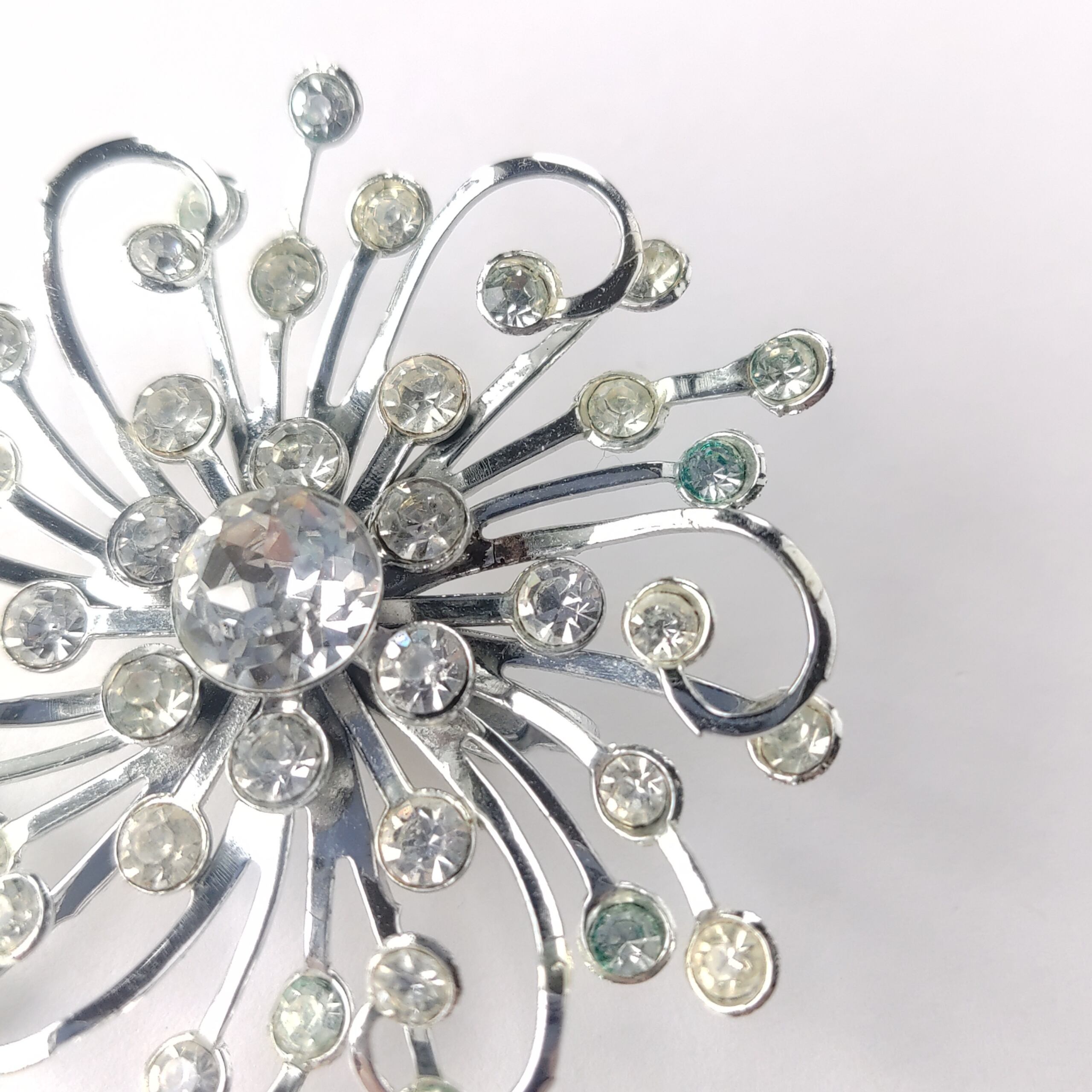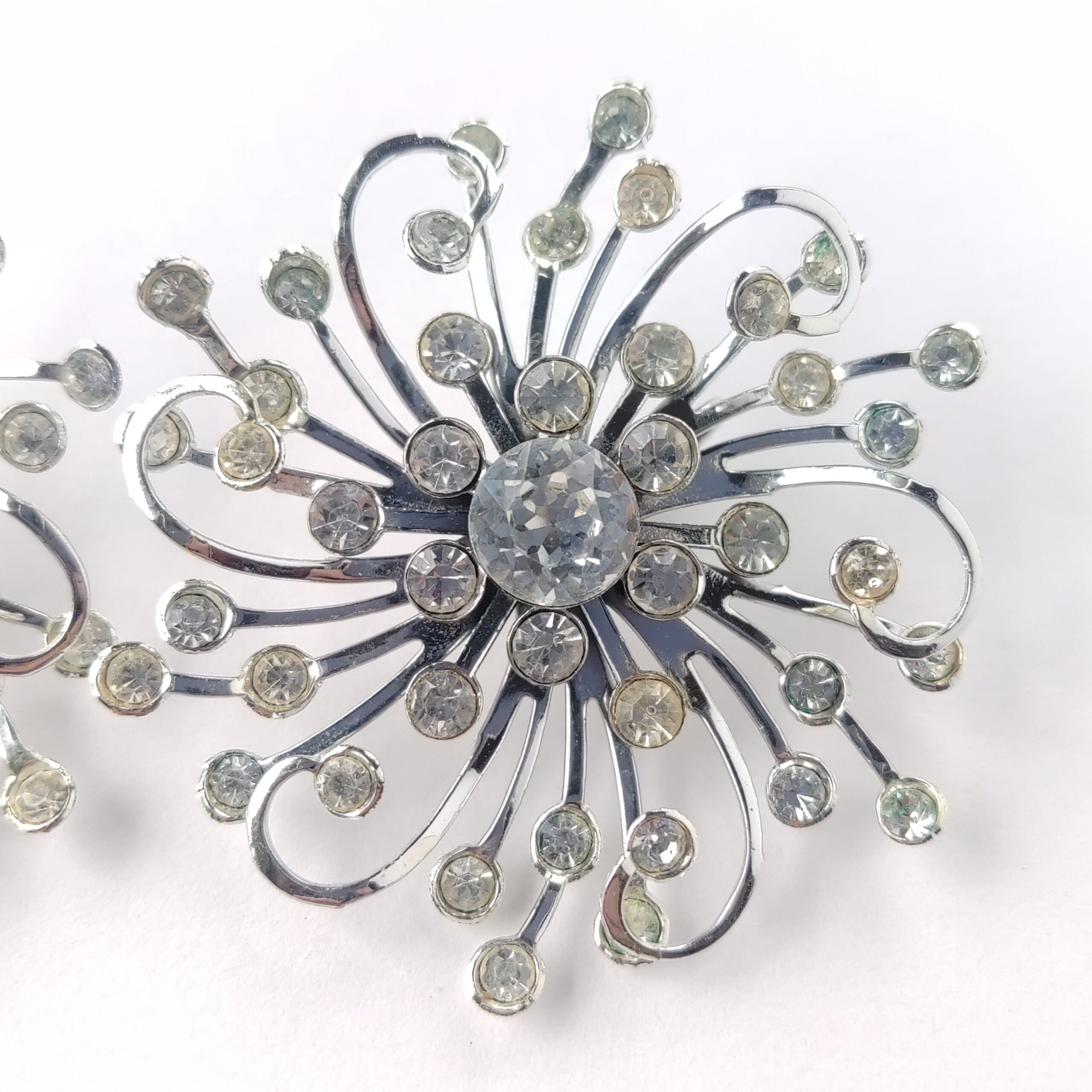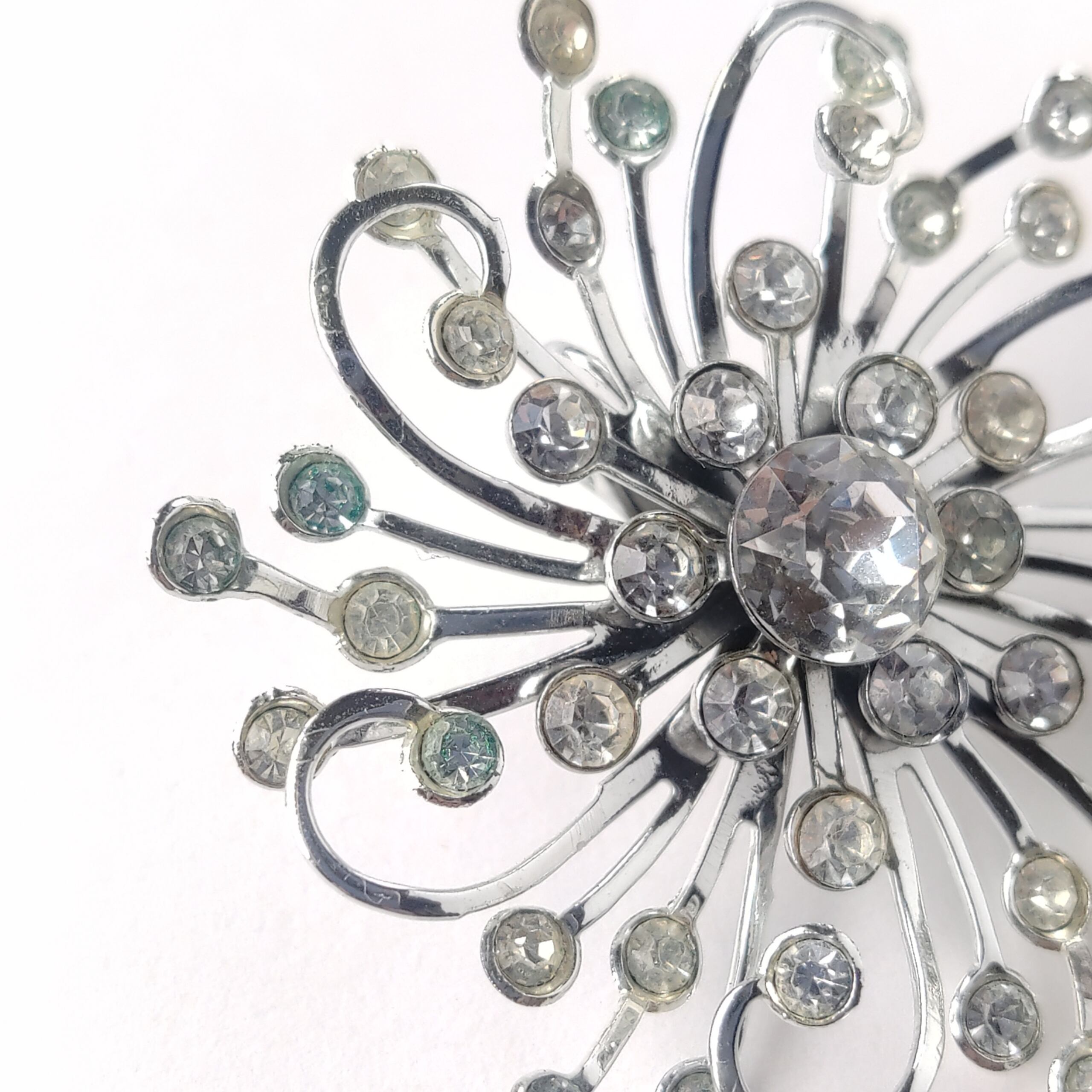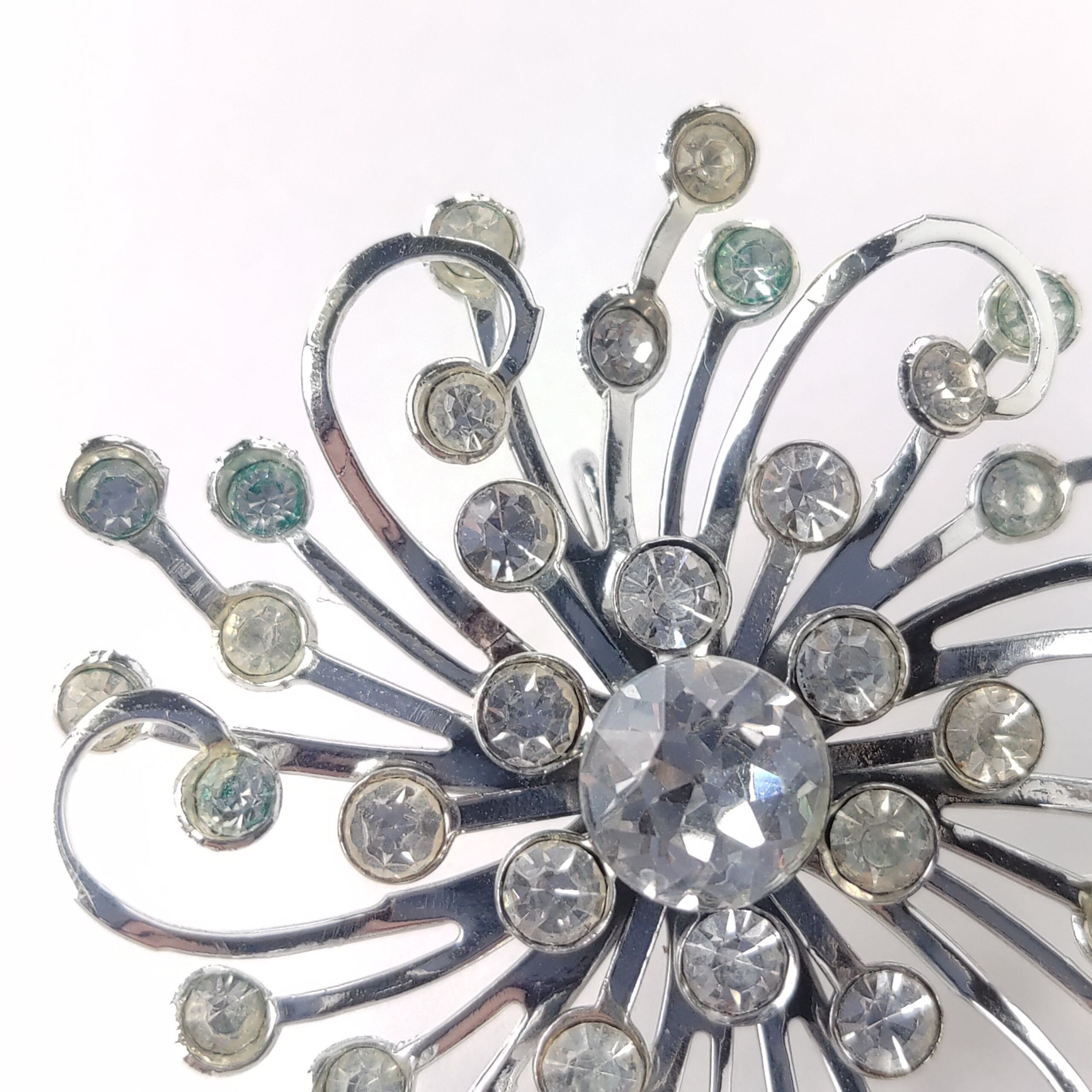 〔状態〕 スワール状に作られた花びらの根元近くと裏側にメッキが剥がれ、茶色っぽくなっている所がございます。ラインストーンに真下とシルバーメタルの隙間に入り込んだ落としきれない緑青(サビ)により緑っぽく見える箇所、くすみ、接着剤の変色により黄色っぽく見える箇所がございます。経年による多少のくすみ、細かな傷、裏側に接着剤の付着、多少のサビが見られます。クリップにメッキ剥がれが見られます。ヴィンテージ品となりますので、風合いとしてお楽しみ下さい。