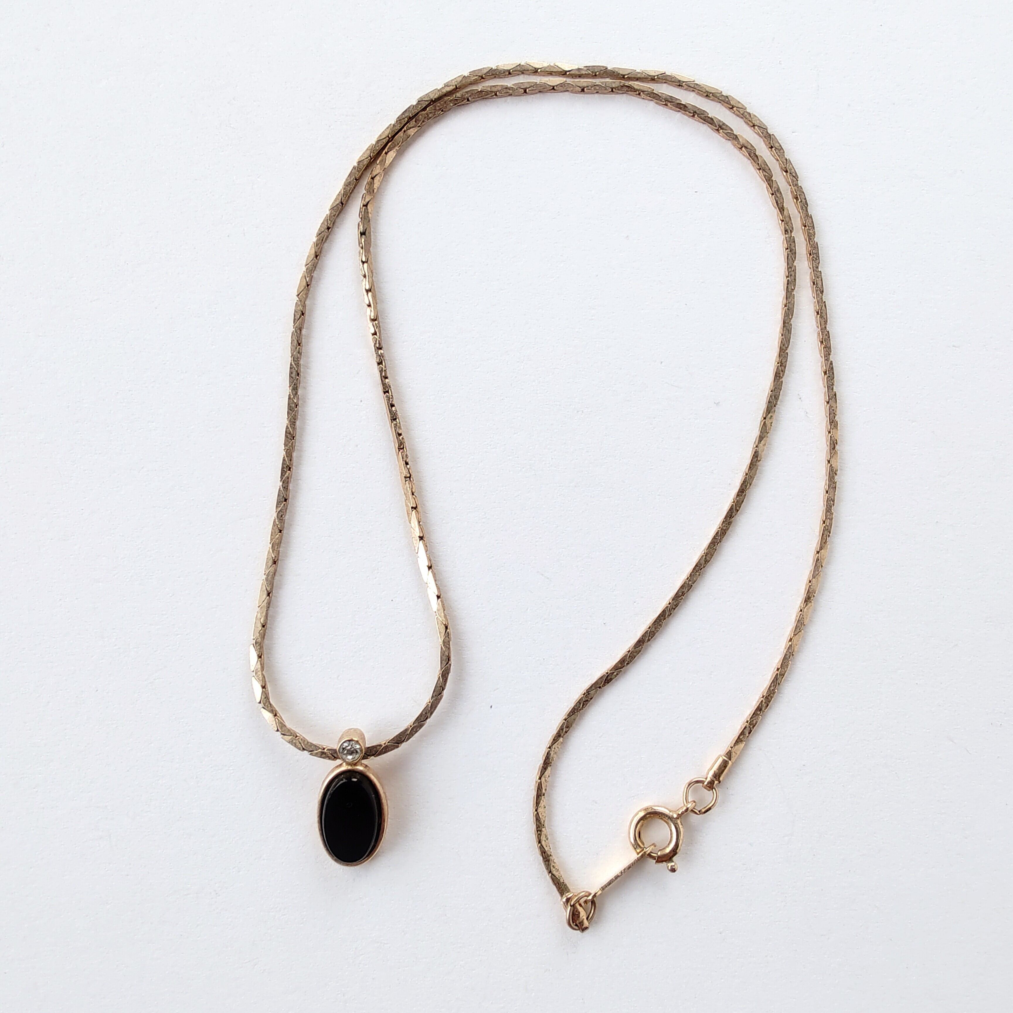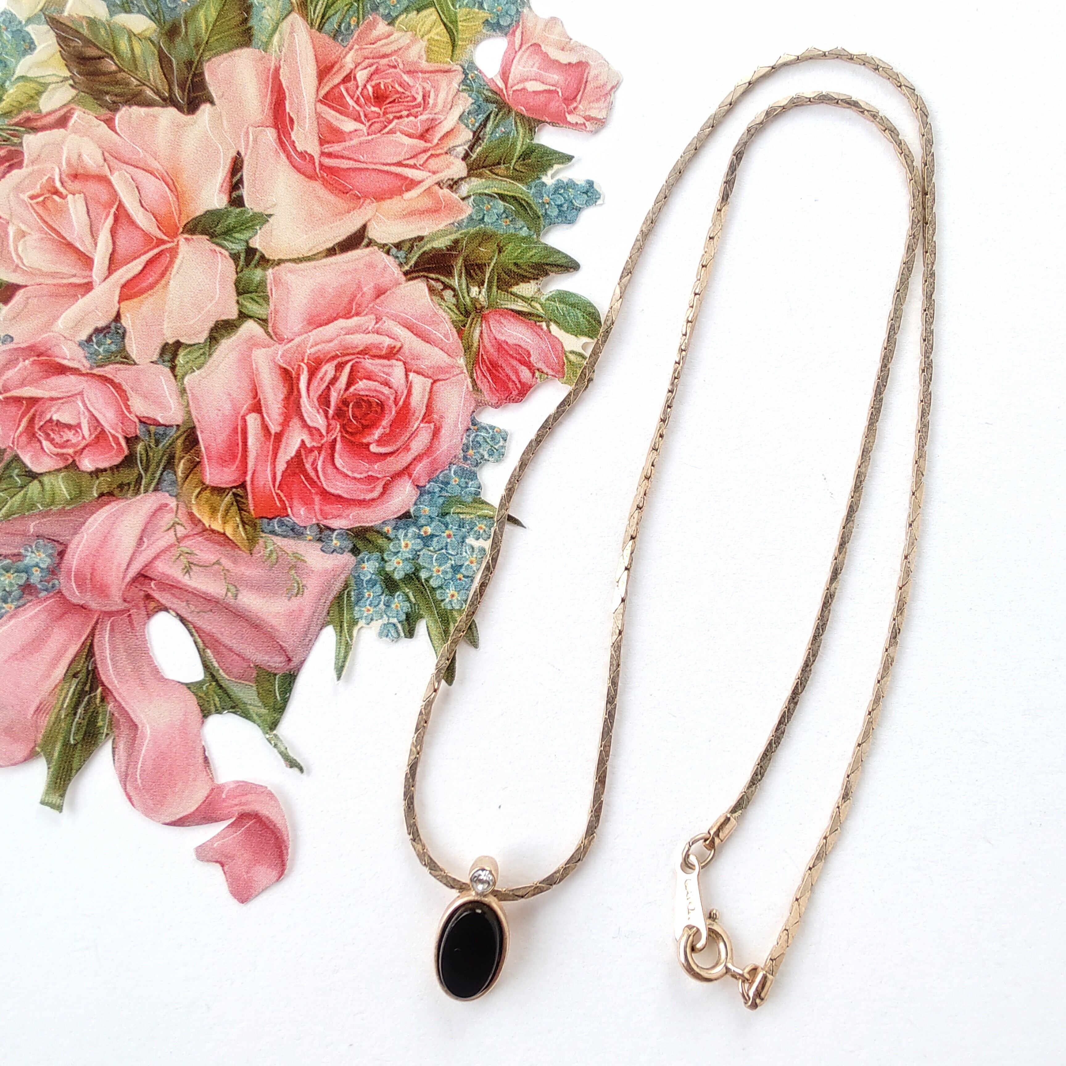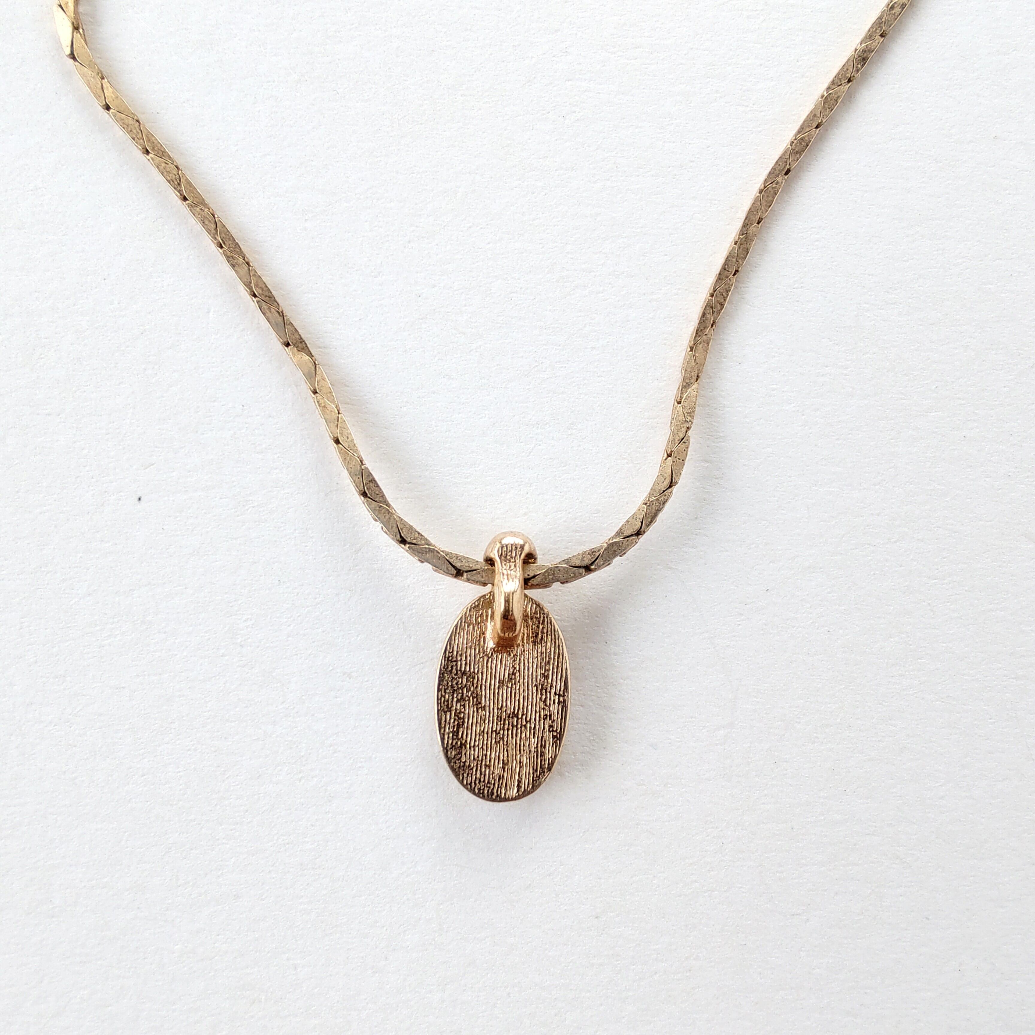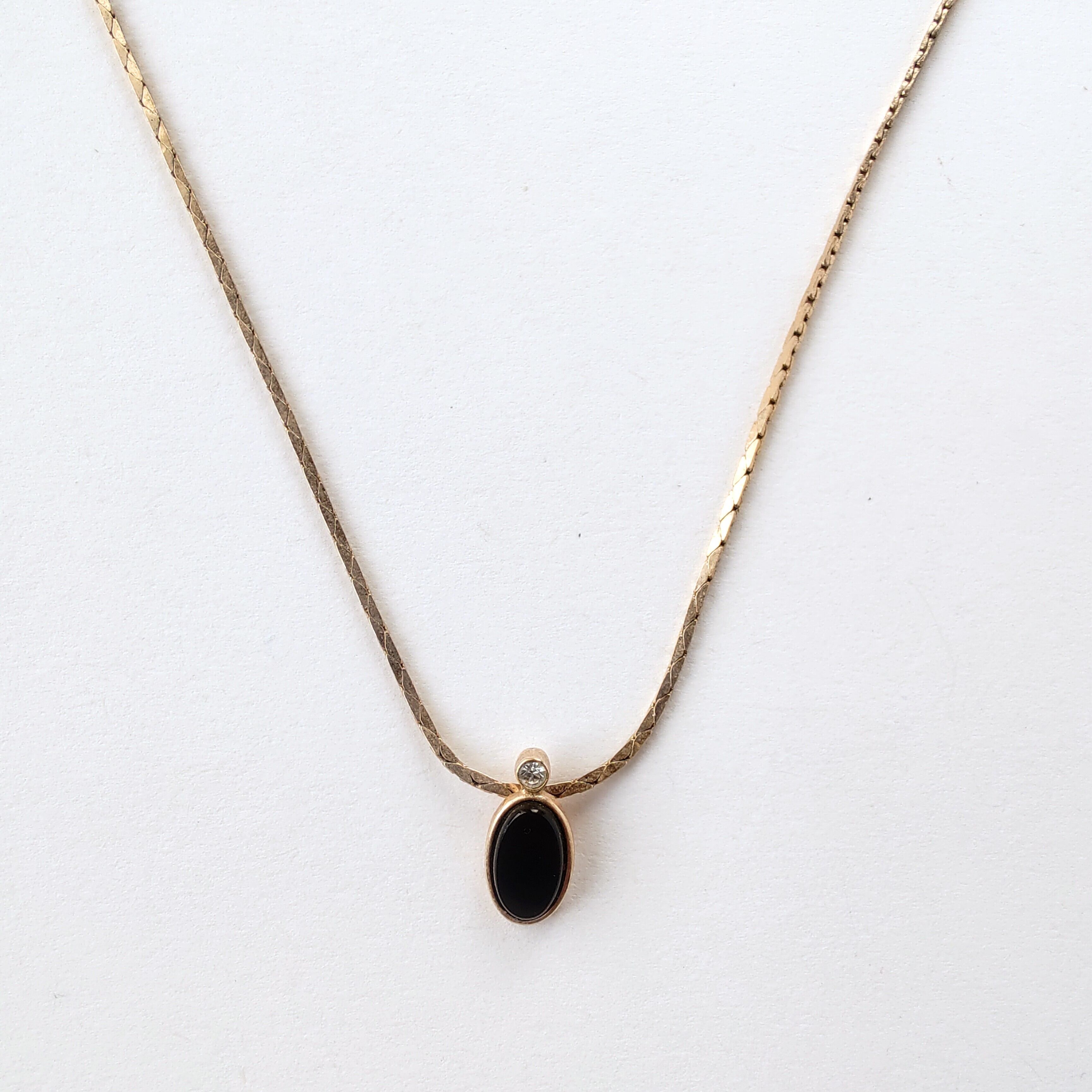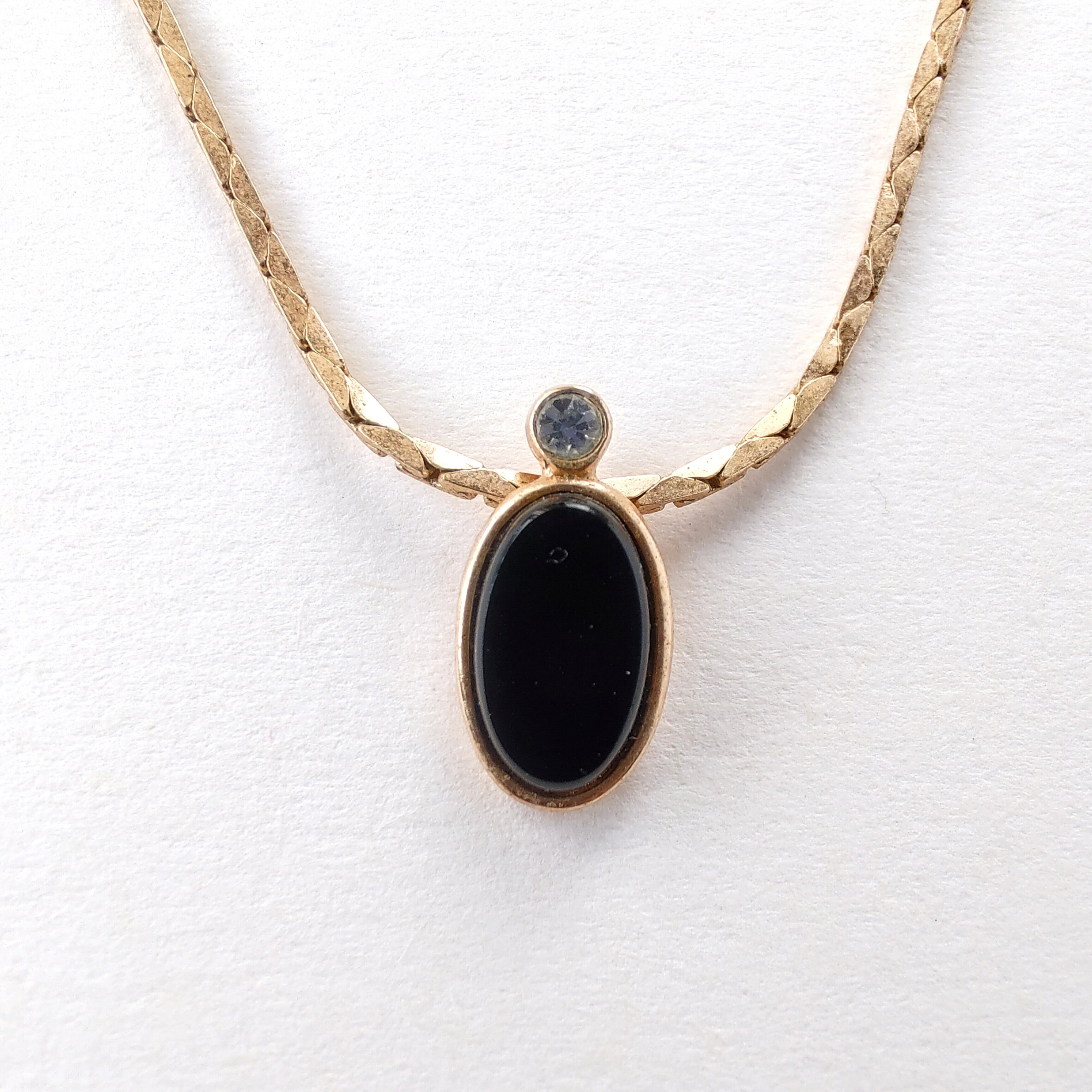 1886年アメリカのニューヨークにて小さな香水会社を創業、1971年に本格的にコスチュームジュエリーの製作を開始したAvon(エイボン)の1982年に販売された“MIDNIGHT TOUCH”のゴールドのベースメタルにオーバル型のブラックのプラスチックカボションと1粒のクリアラインストーンがあしらわれたペンダントトップのヴィンテージネックレスです。