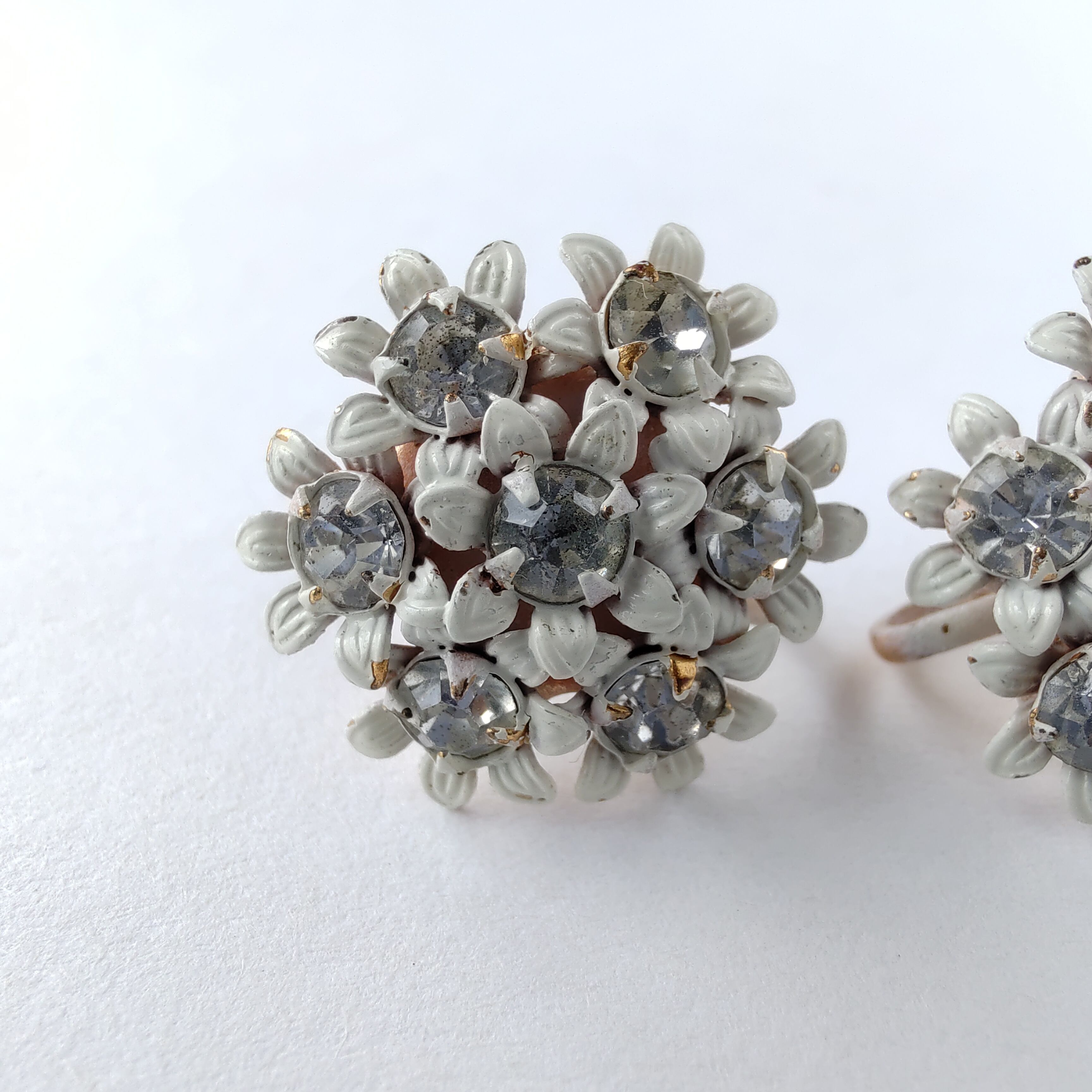 white enamel flower rhinestone vintage earrings ヴィンテージイヤリング