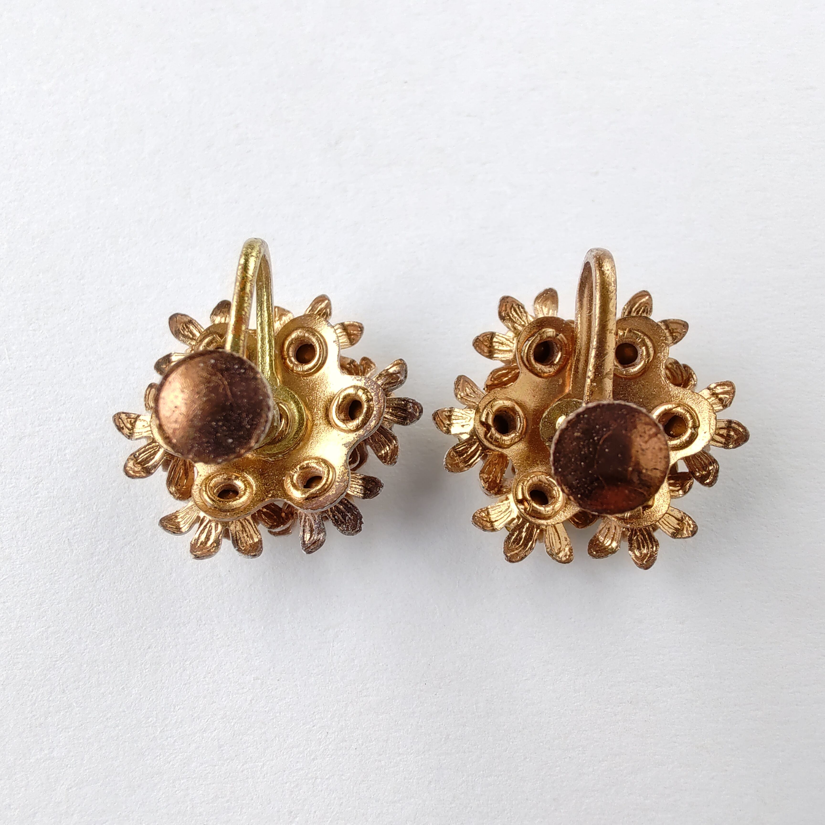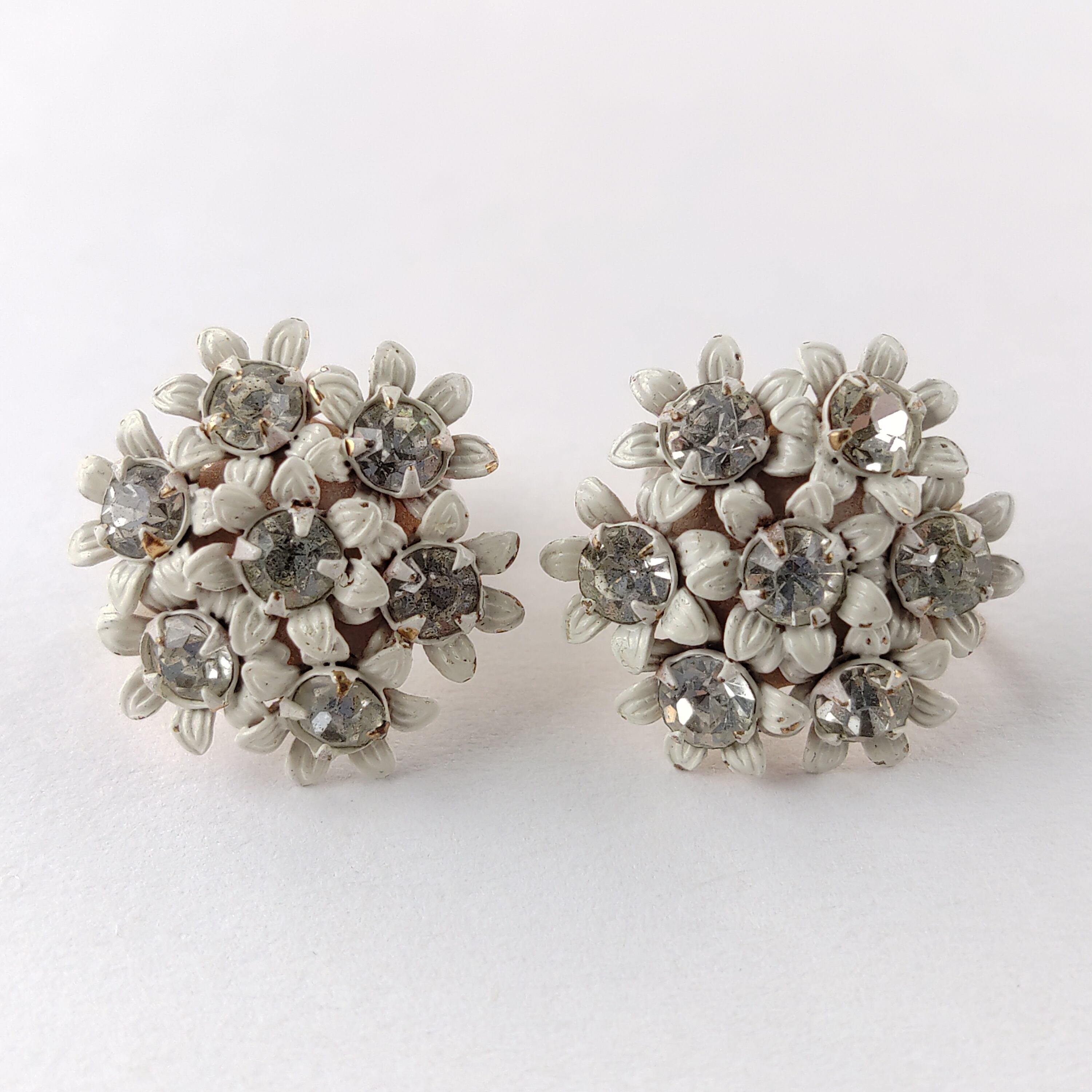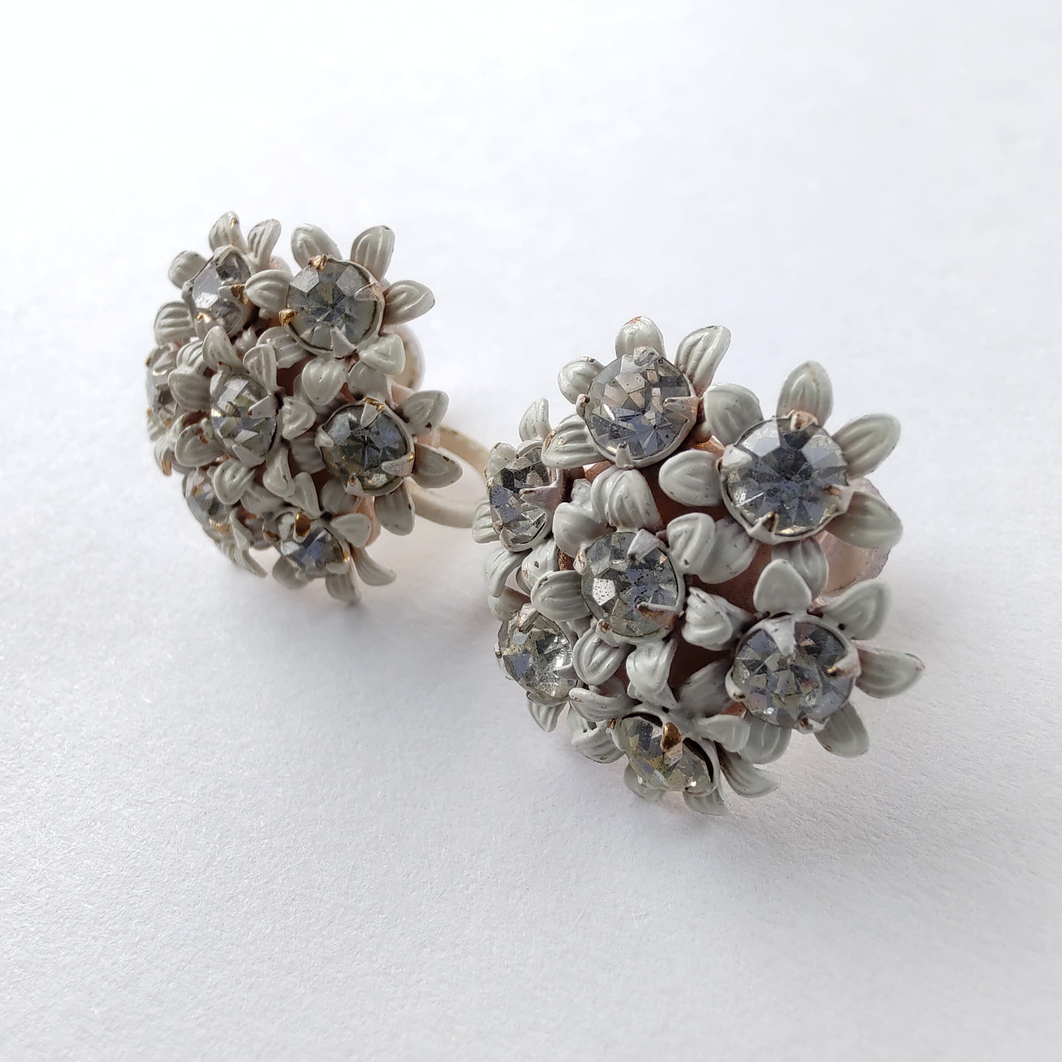 ゴールドメタルのクリアラインストーンがセットされたホワイトのエナメルで色付けされた小さなフラワーのブーケの様なデザインのヴィンテージイヤリングです。