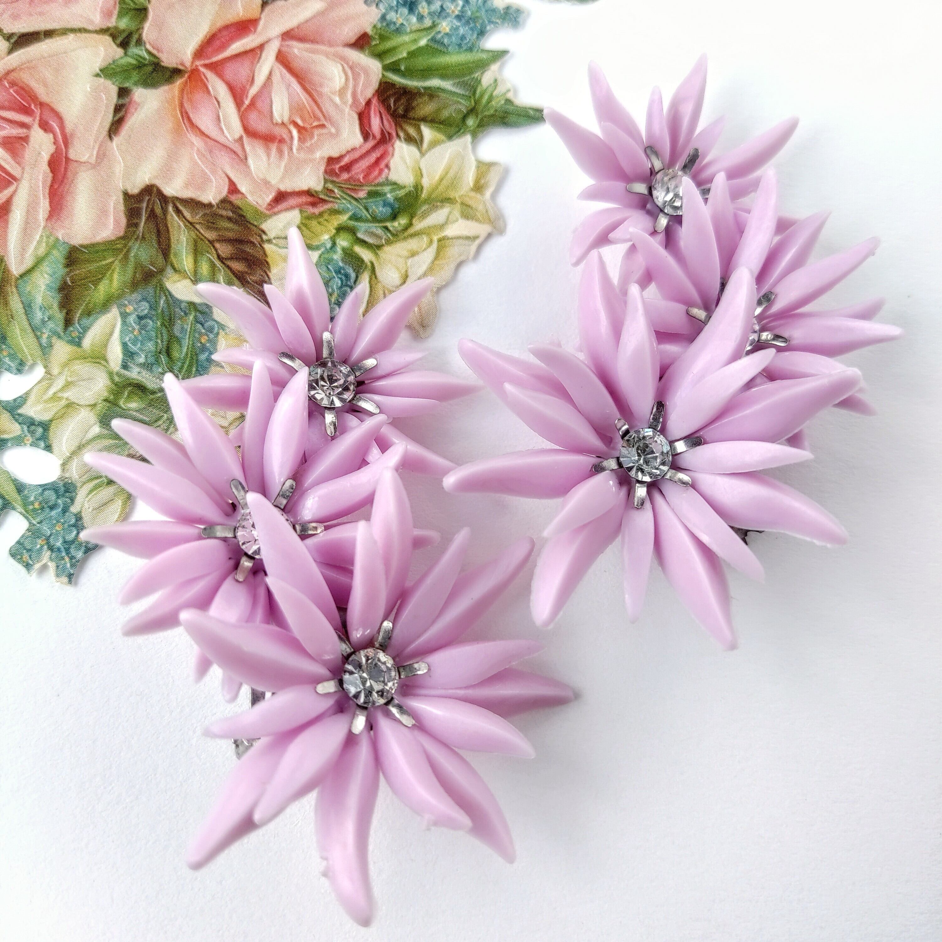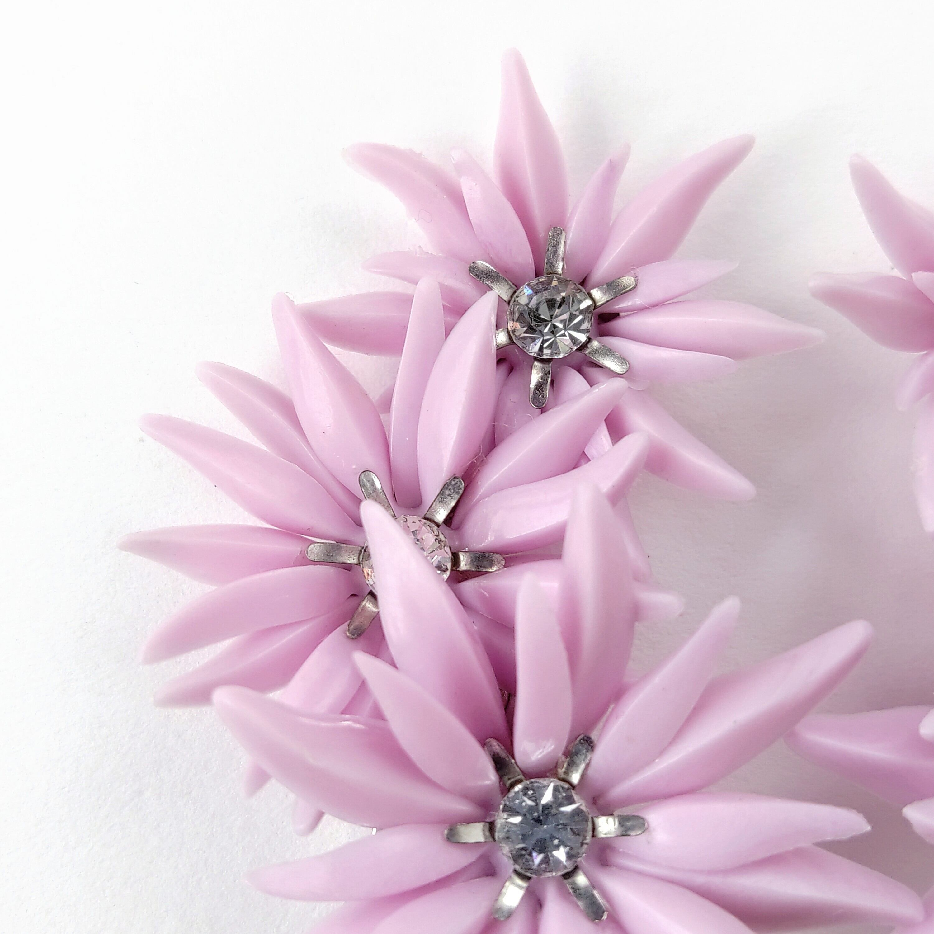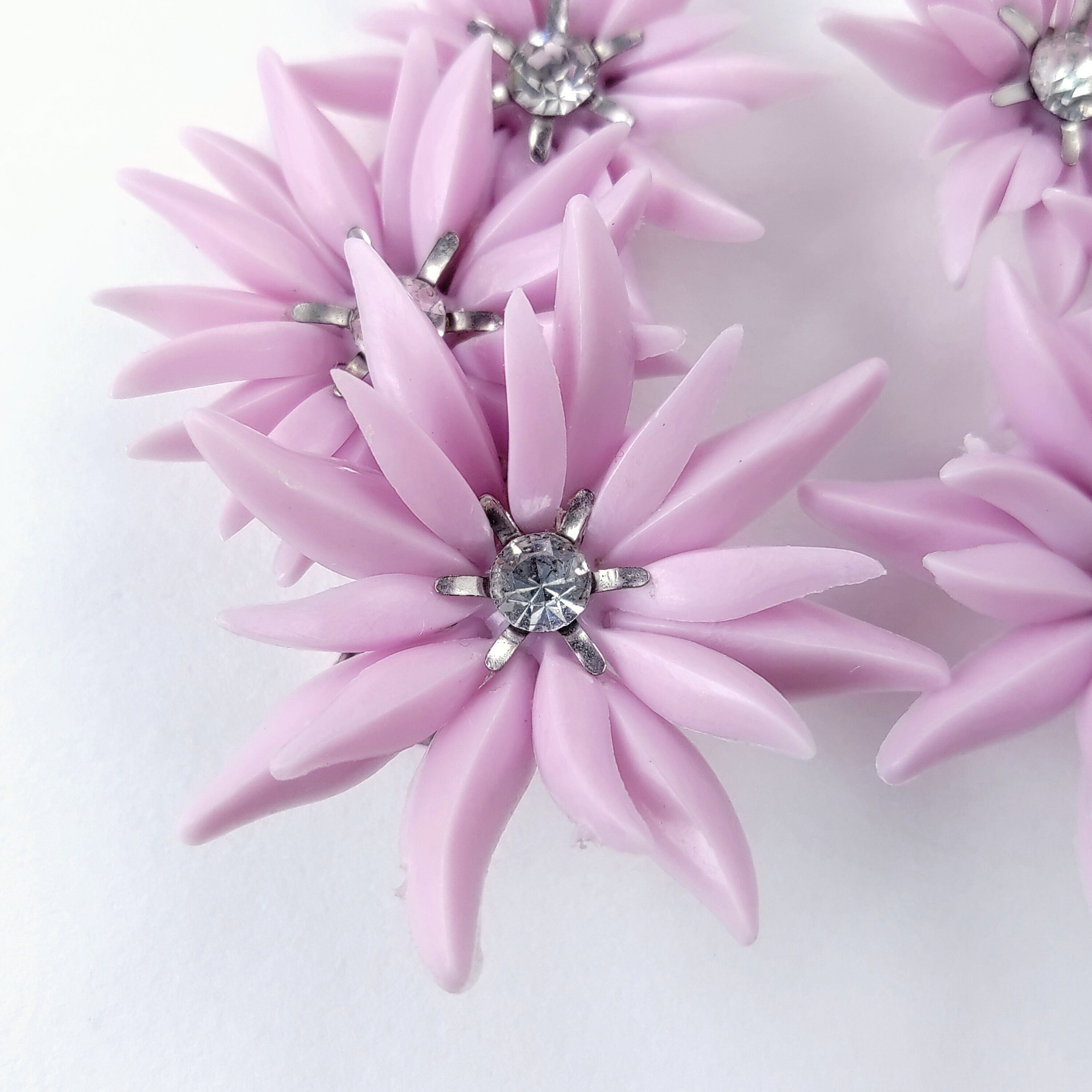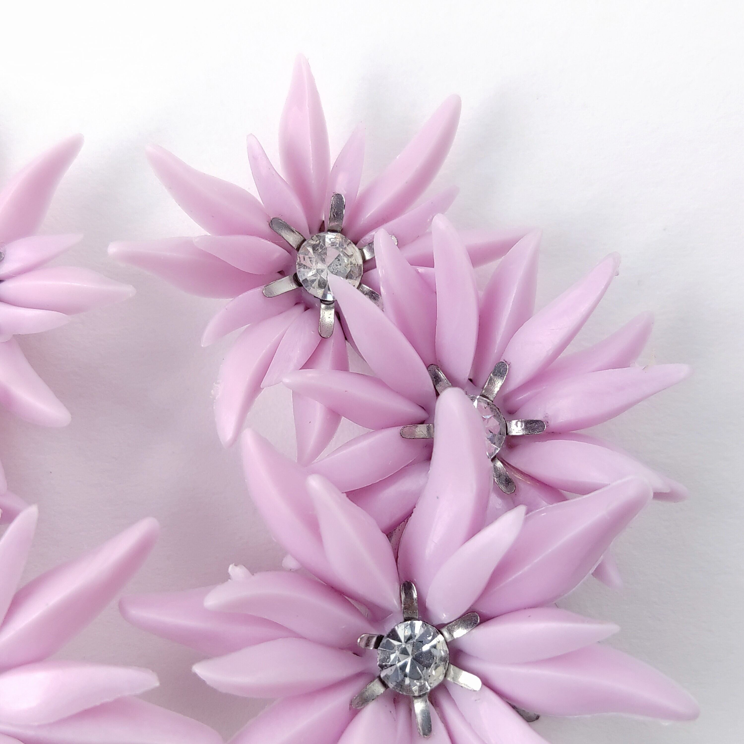ラベンダーカラーのソフトプラスチックの花びらにクリアラインストーンがあしらわれたフラワーが縦に3つカーブ状に並んだデザインのヴィンテージイヤリングです。