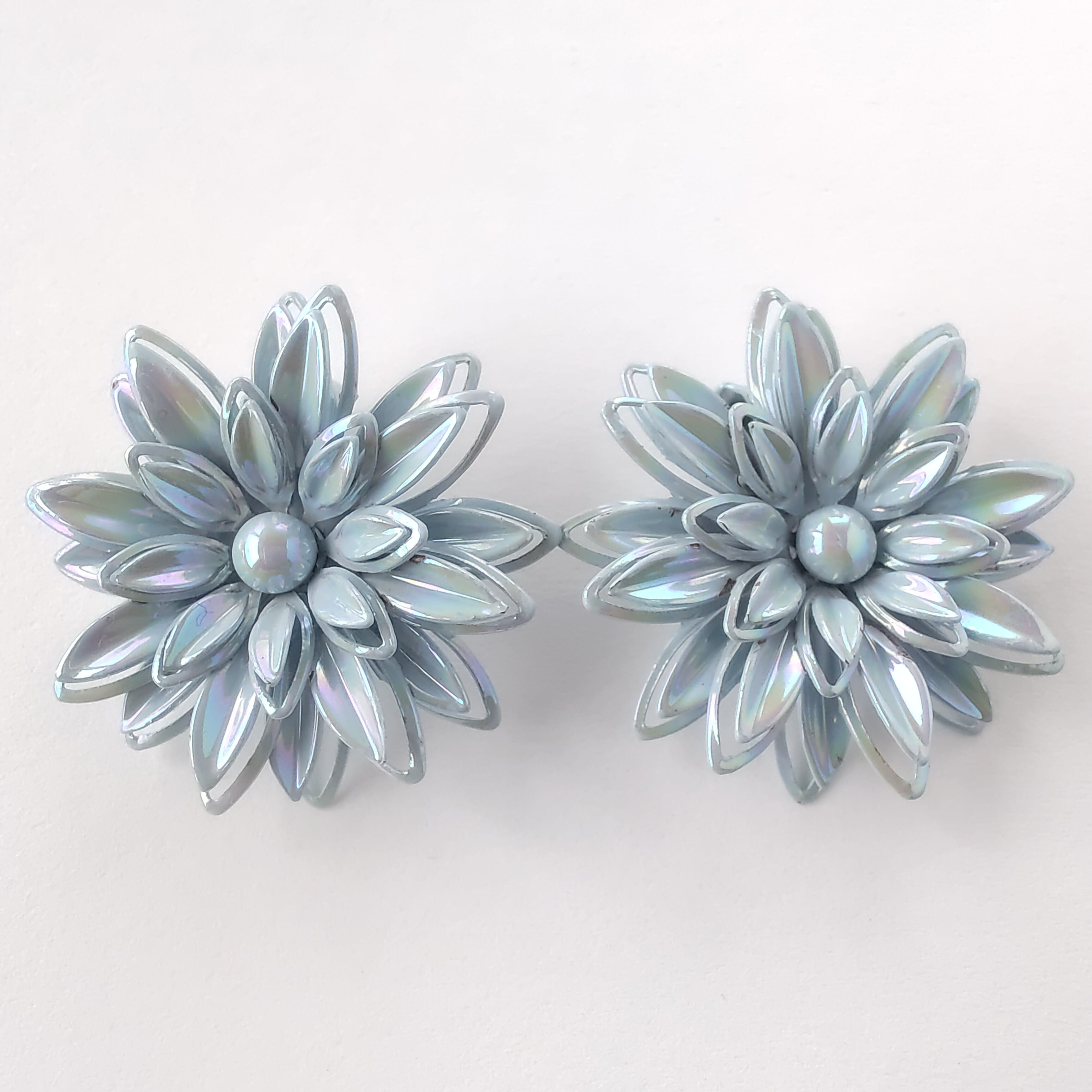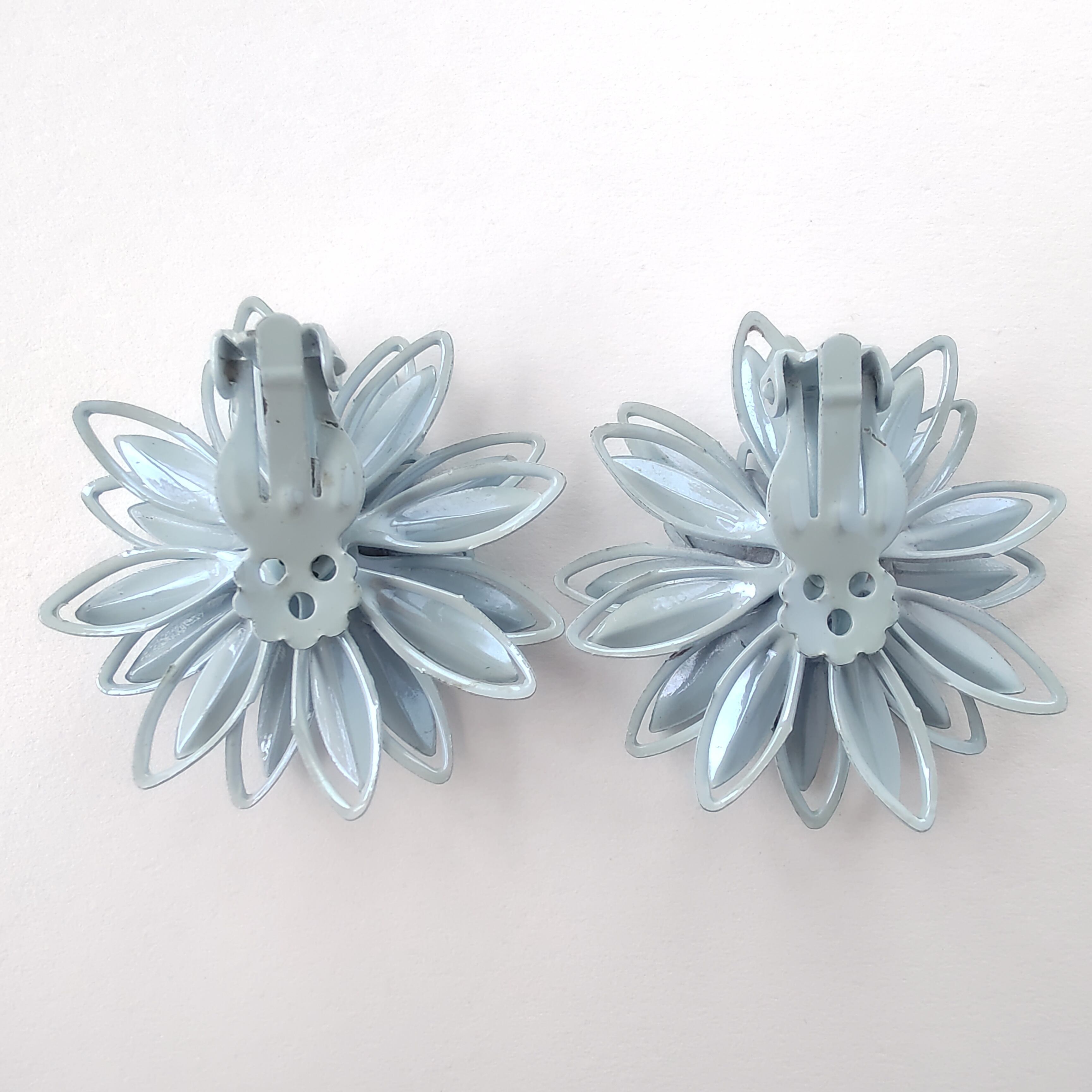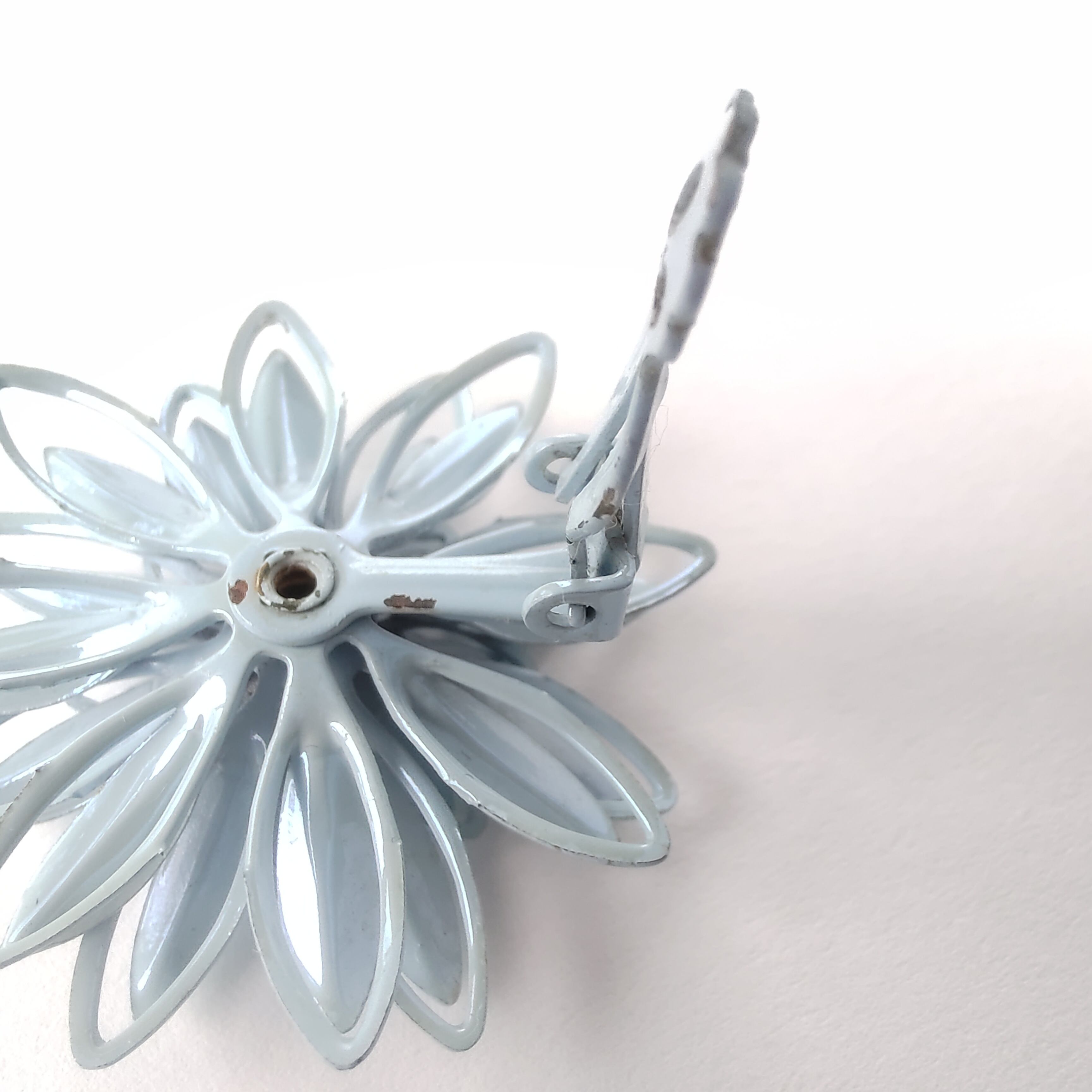ベースメタルにパールがかった淡いブルーのエナメルで色付けされたフラワーのヴィンテージイヤリングです。